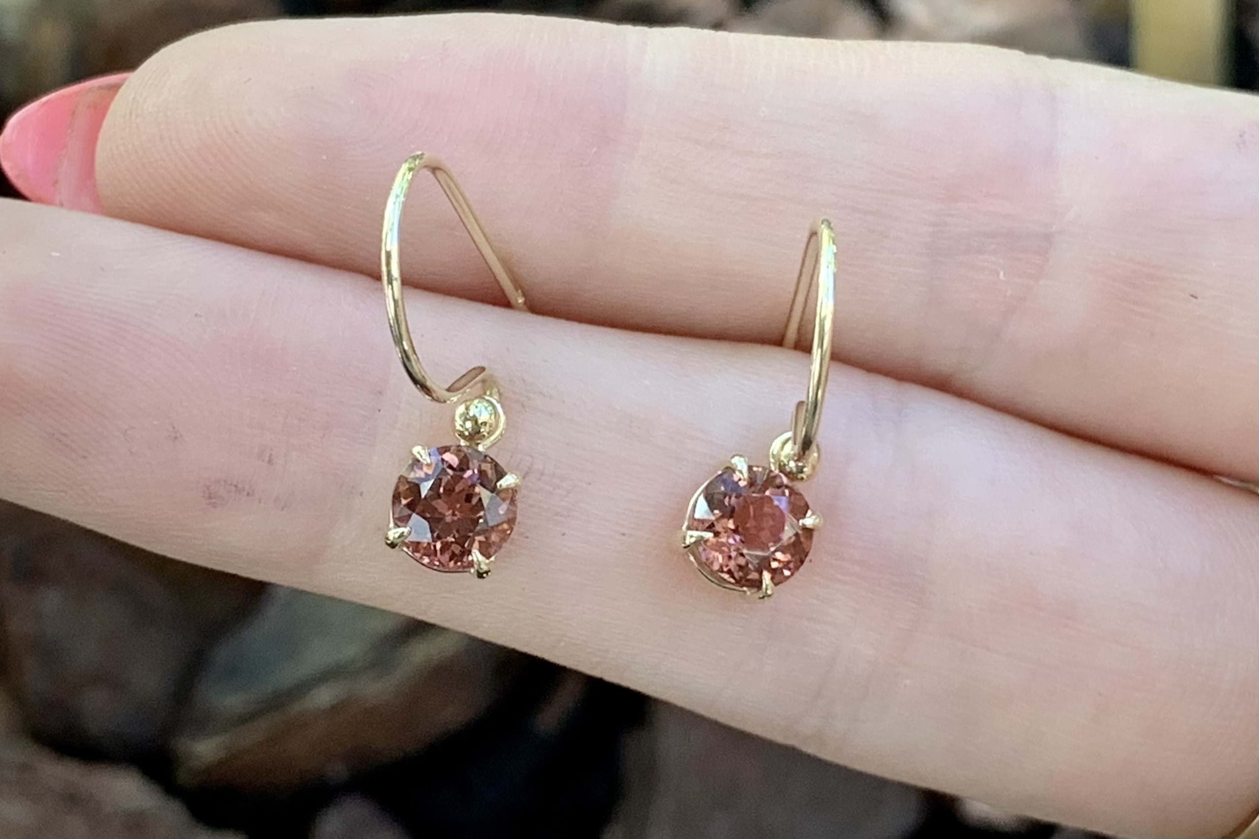 These beautiful bright pink tourmaline drops are four claw set in handmade 9ct yellow gold settings. Measuring 5mm round and completed with shepherd hook fittings.