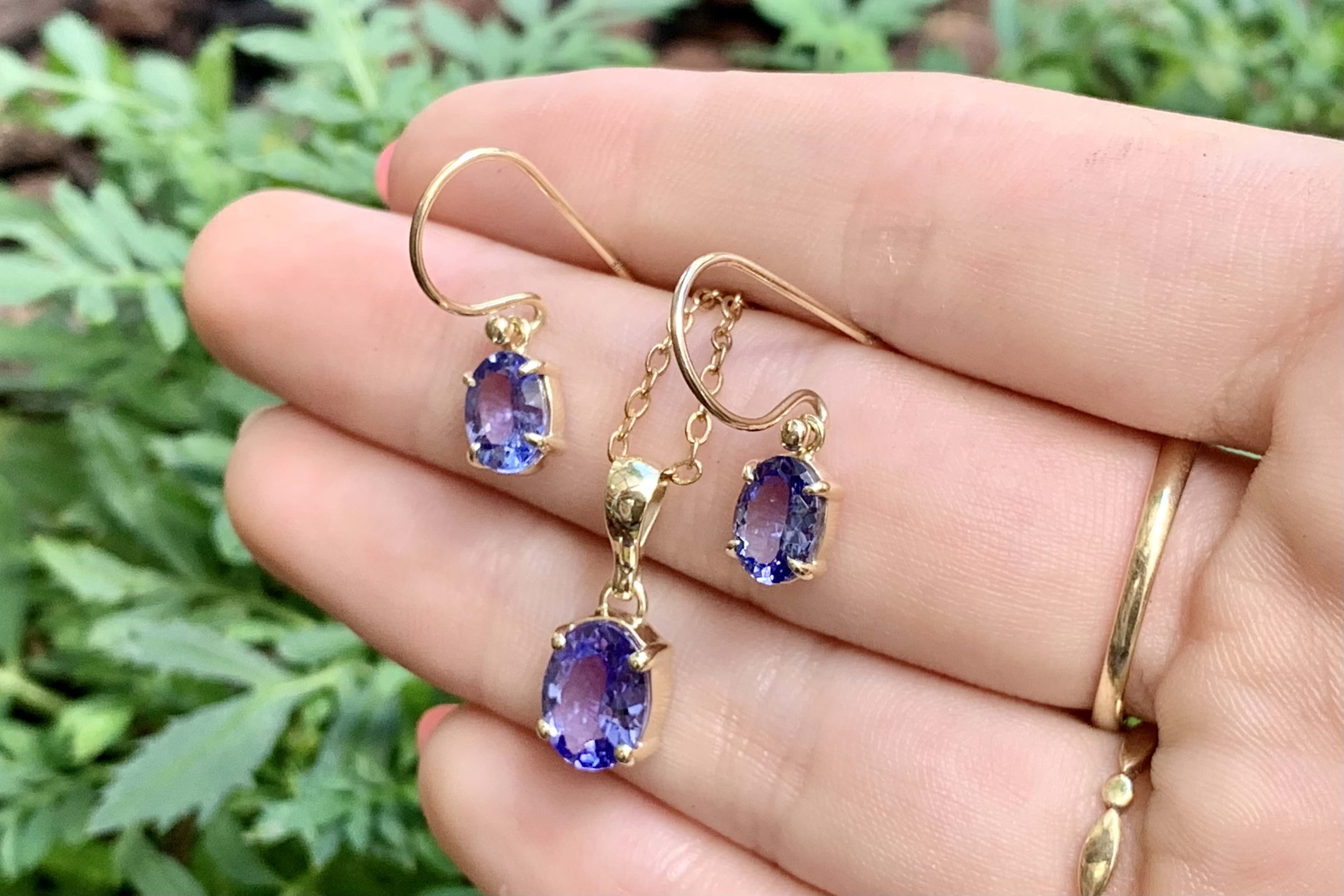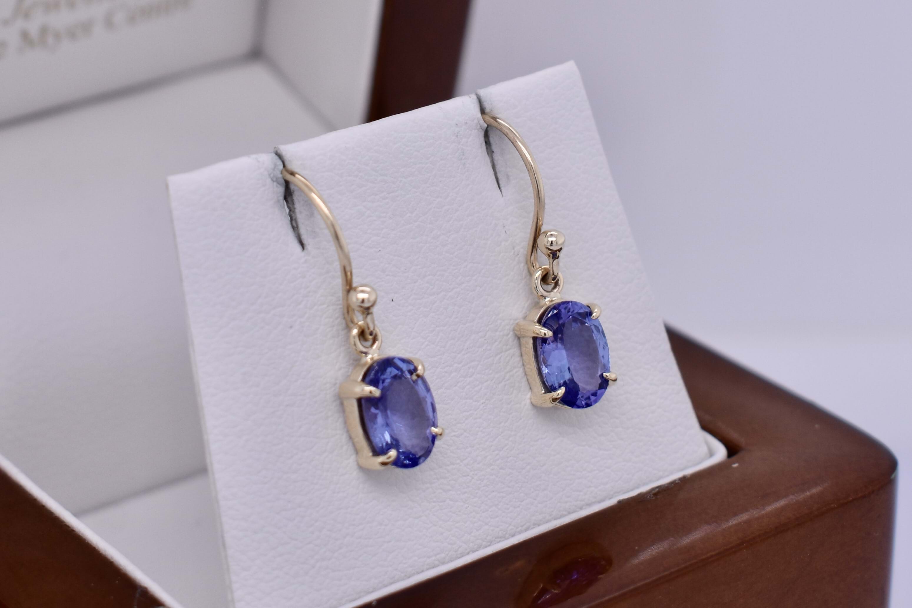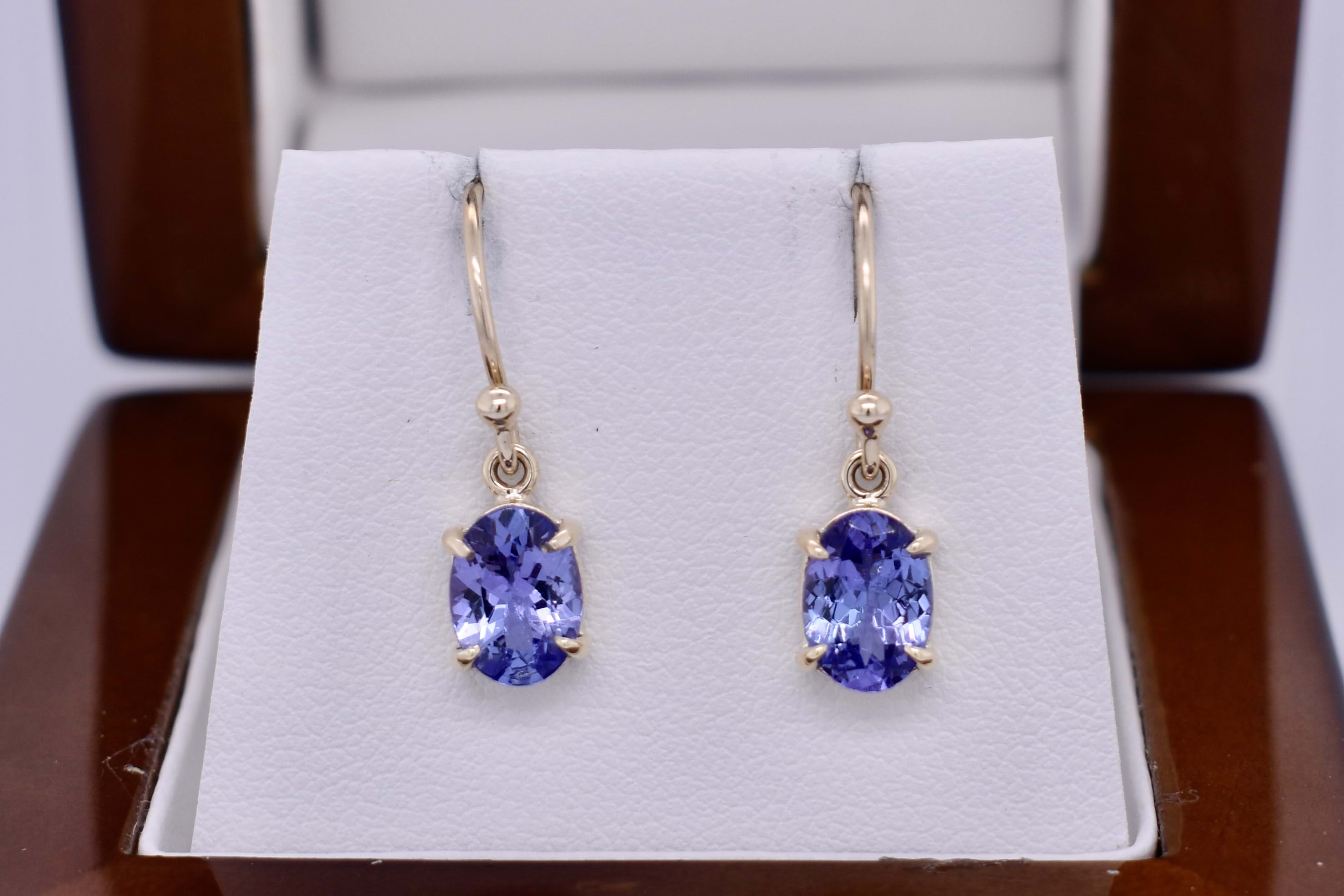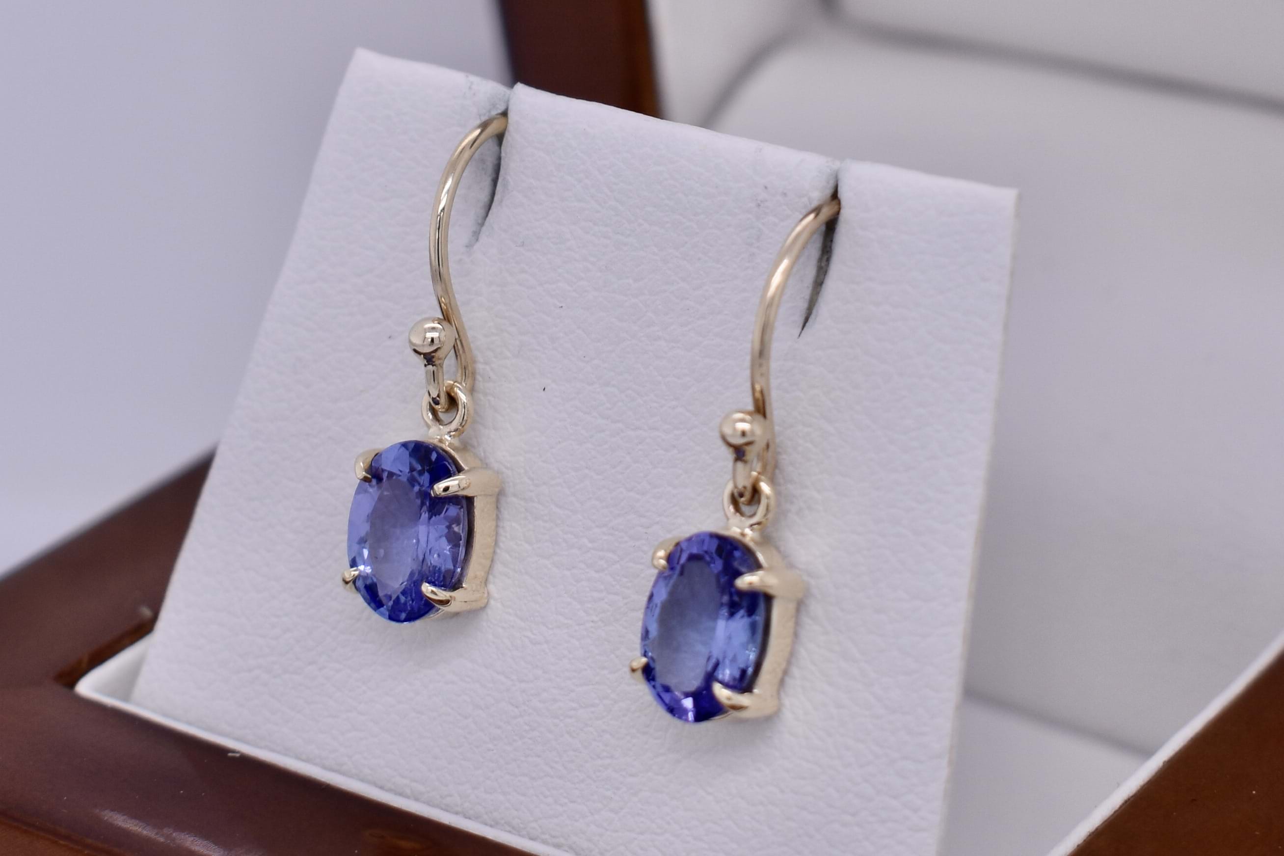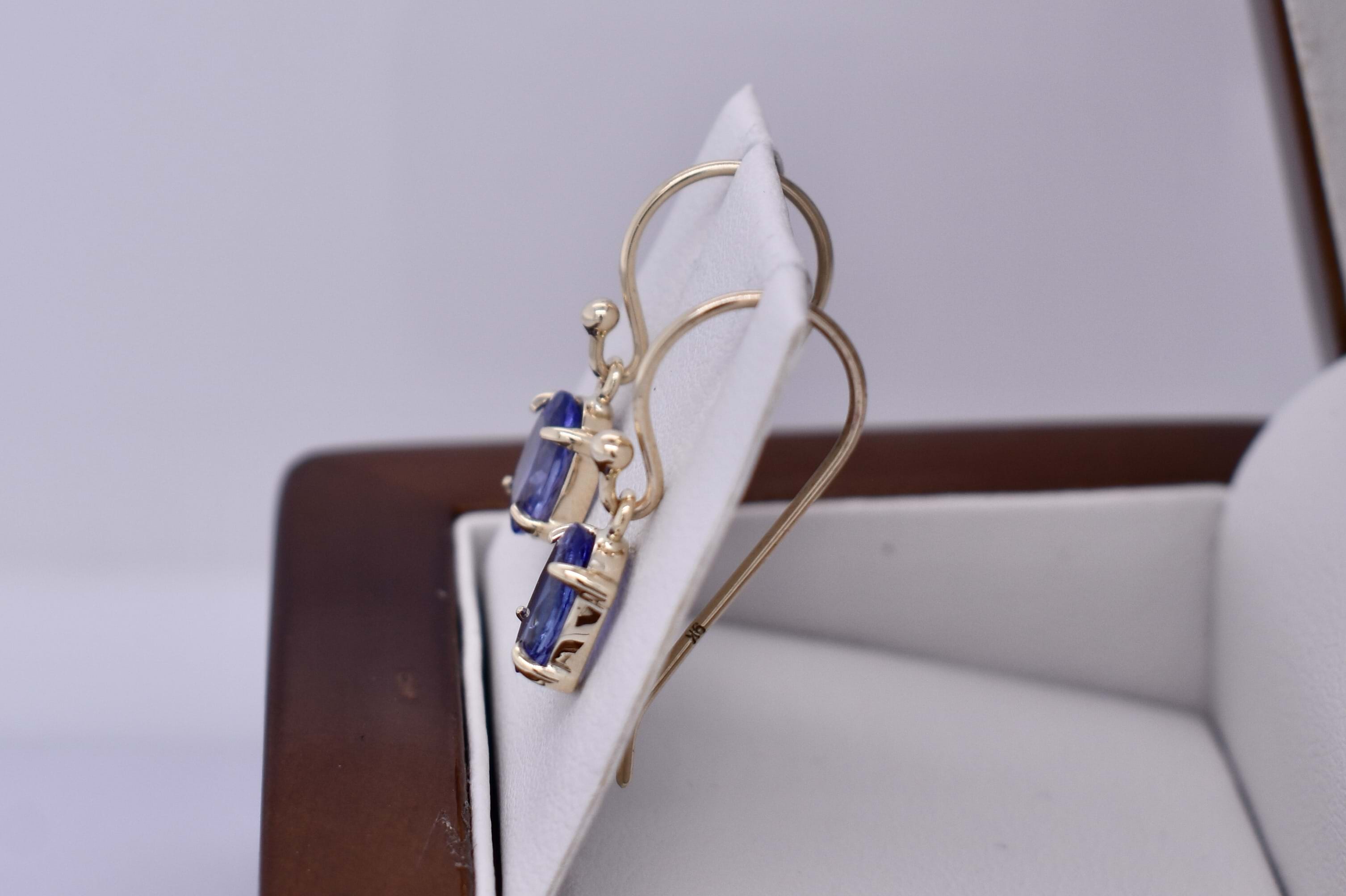 Hand made 9ct yellow gold stunning pair of oval tanzanites, measuring 5.6x2.5mm, four claw set with shepherd hook fittings.