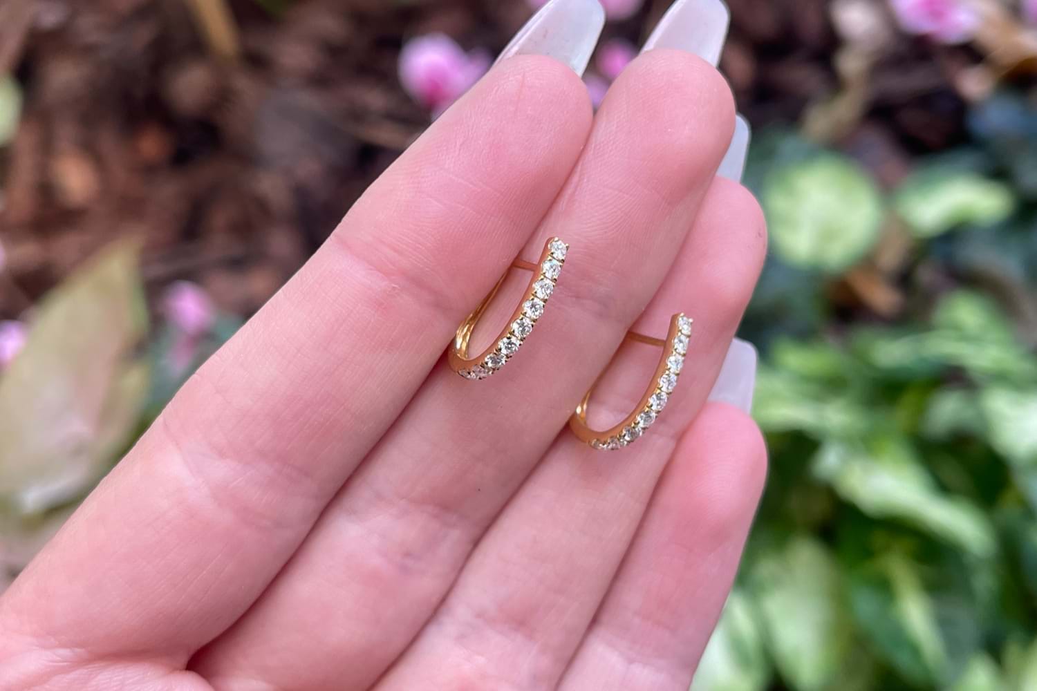 Our signature diamond huggies crafted in 18ct yellow gold in a flattering and elegant U shape design with each earring containing nine round brilliant cut diamonds cut down claw set and a combined total of 0.43cts (FG/VS). These earrings are stunning on their own or paired with our pearl or gem set earring enhancers. Independent Valuation Supplied. Huggies are displayed with pearls available for separate purchase.