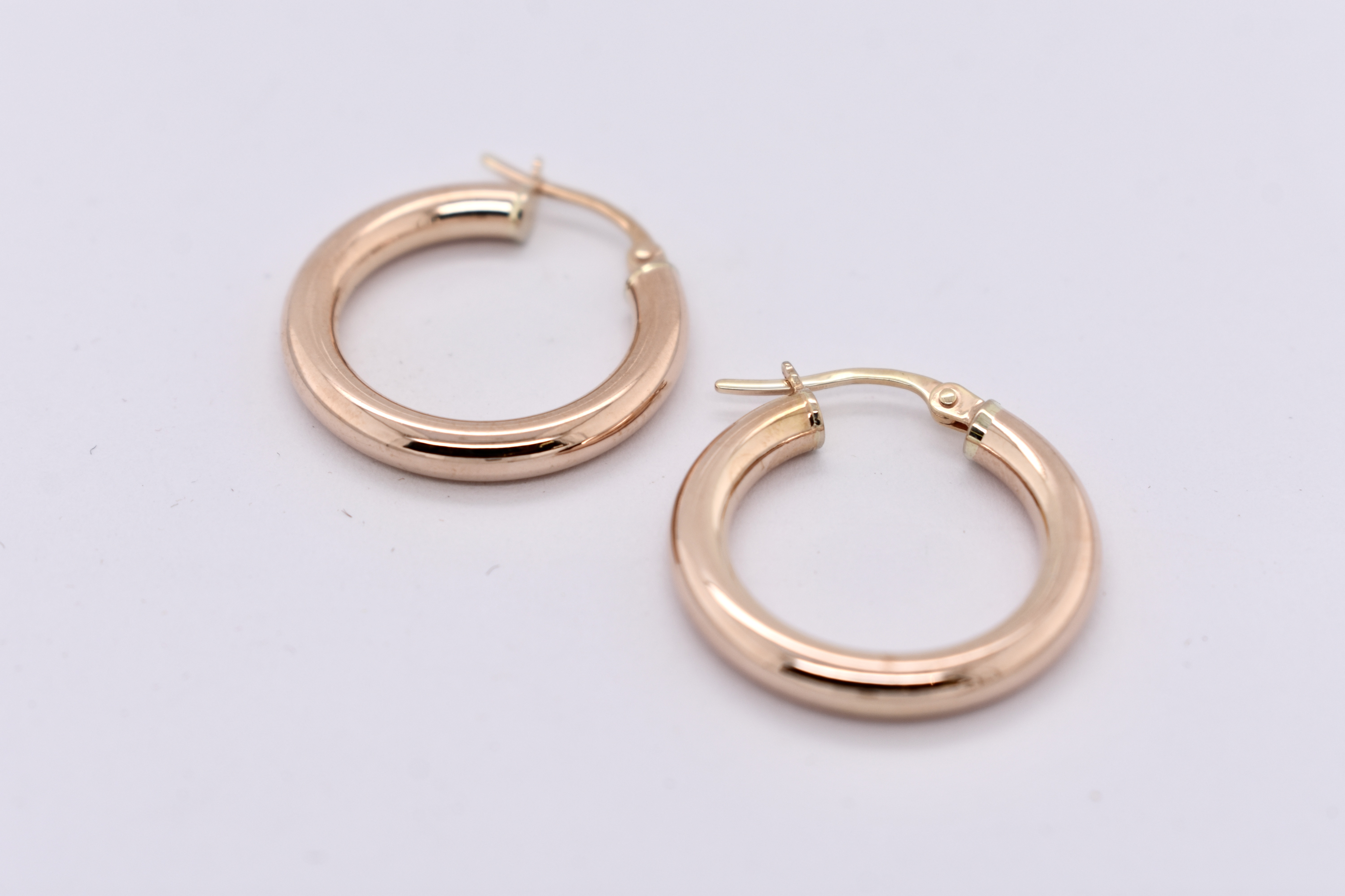 Simple and elegant, these vintage hollow hoops are crafted in 9ct rose gold, measuring 20mm in length and weighing 1.84 grams.