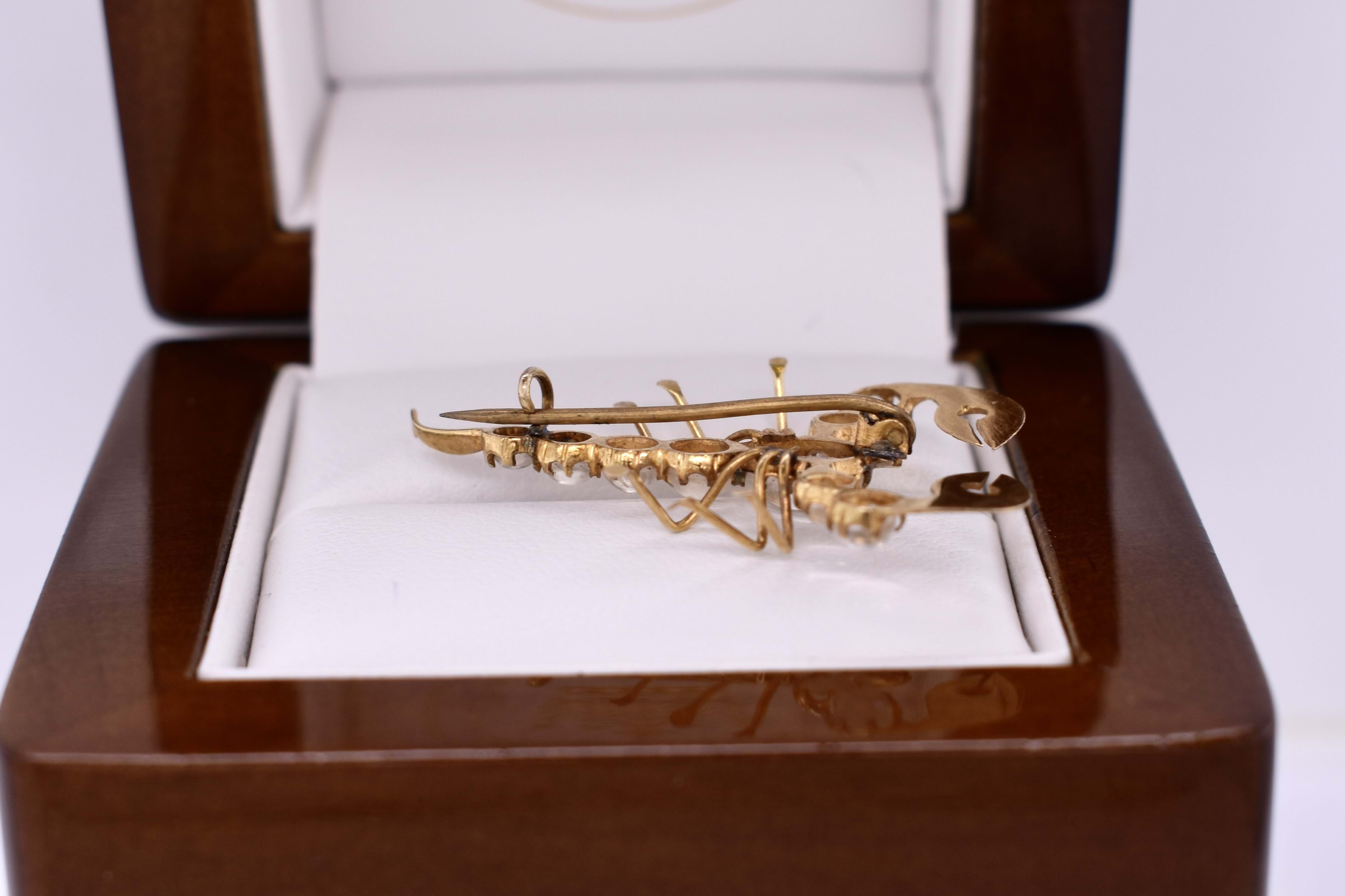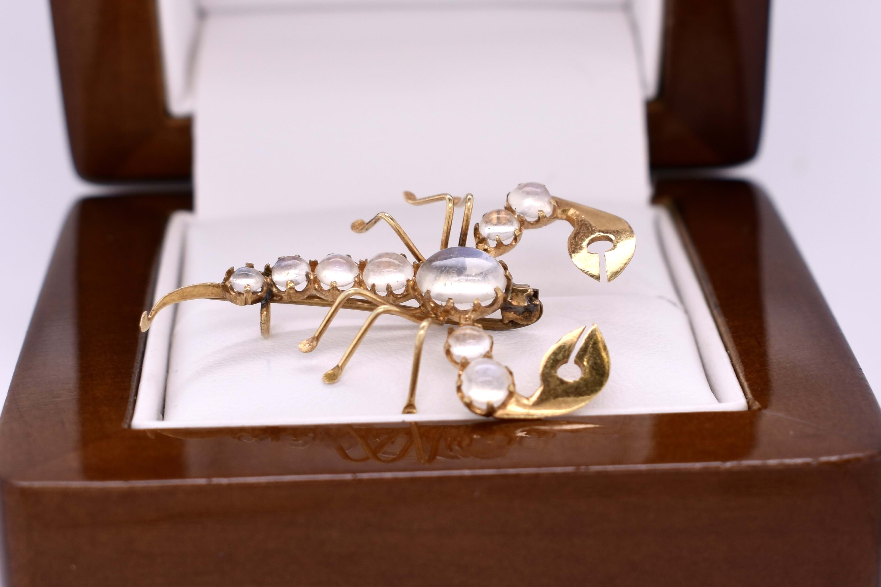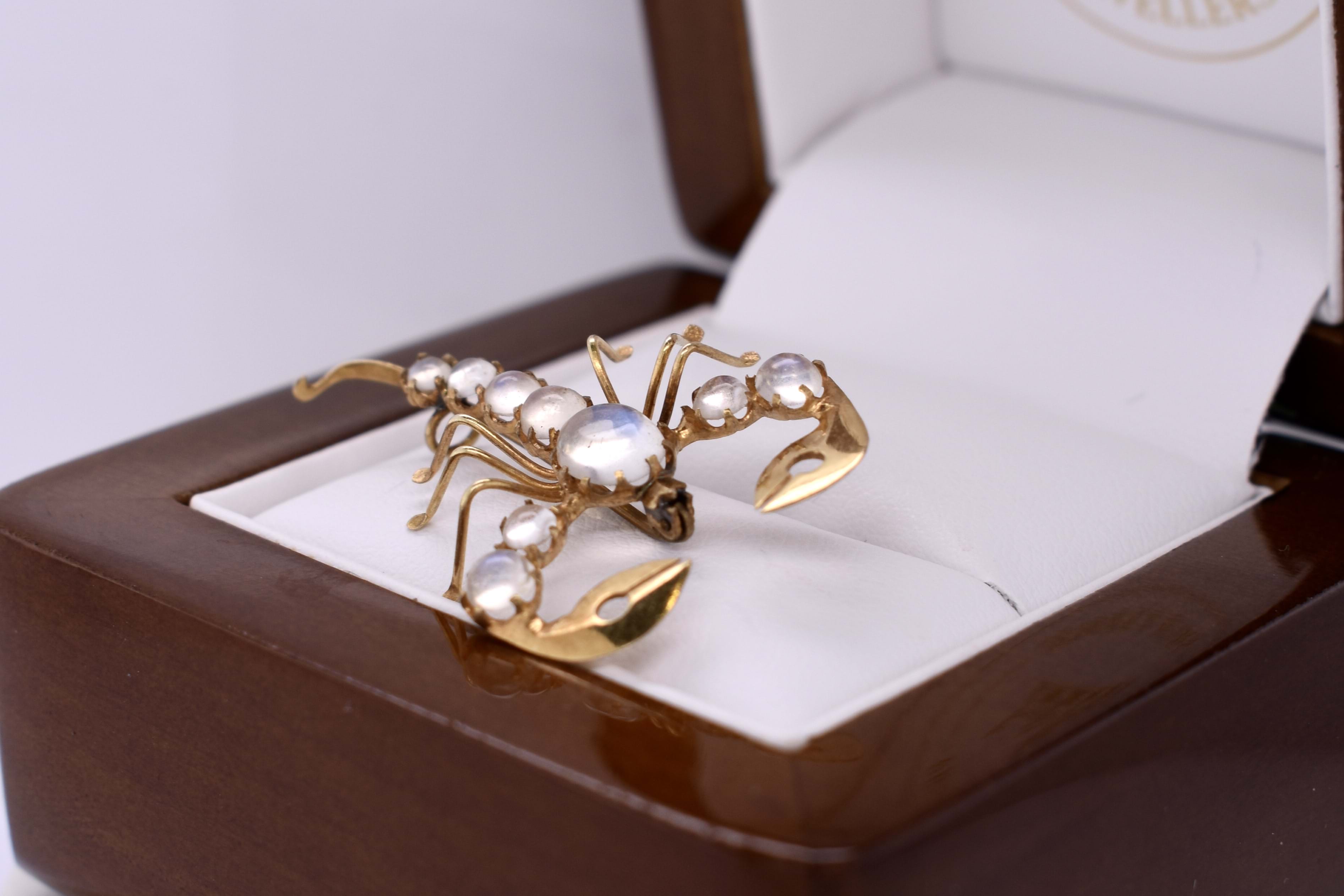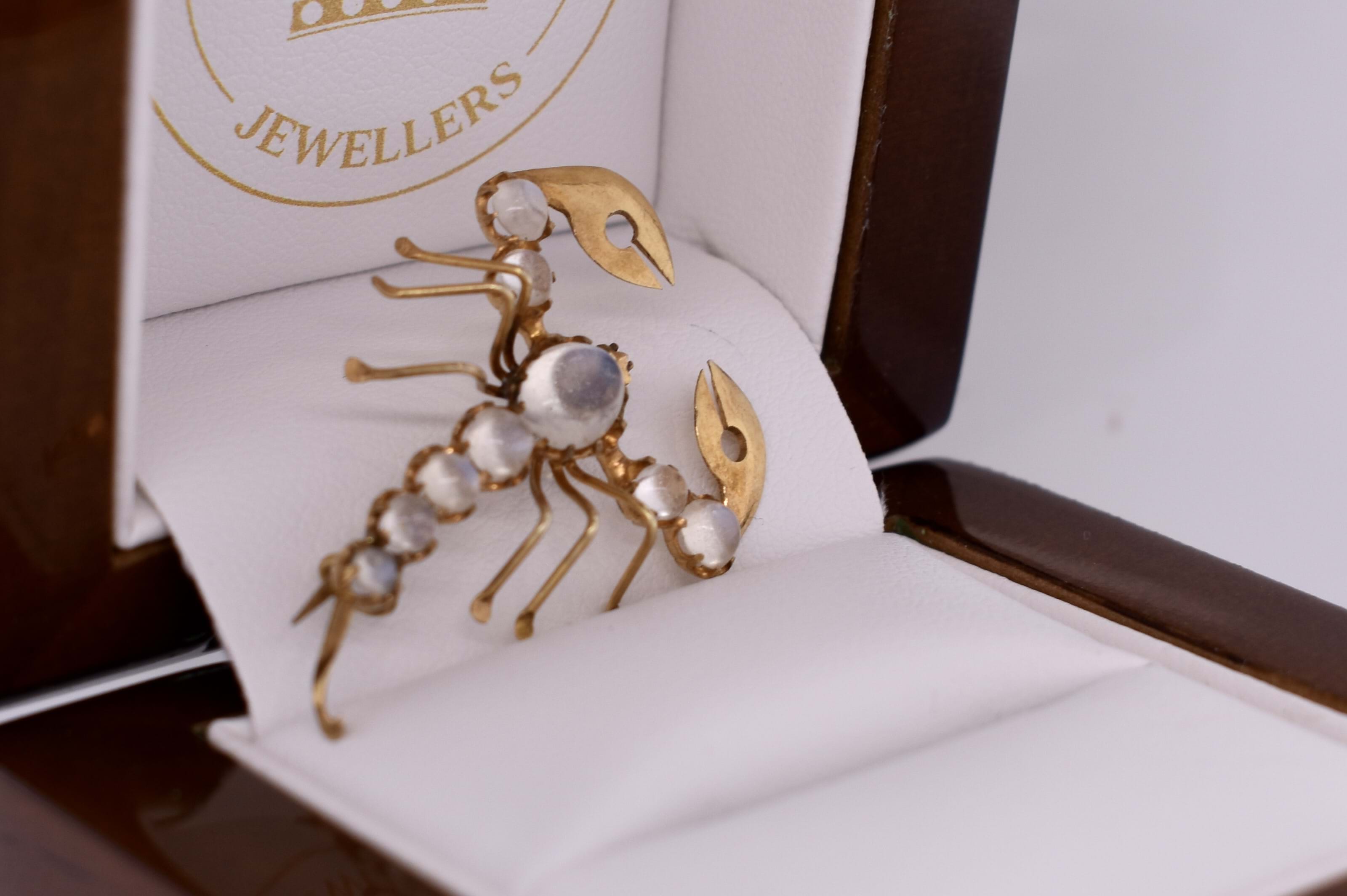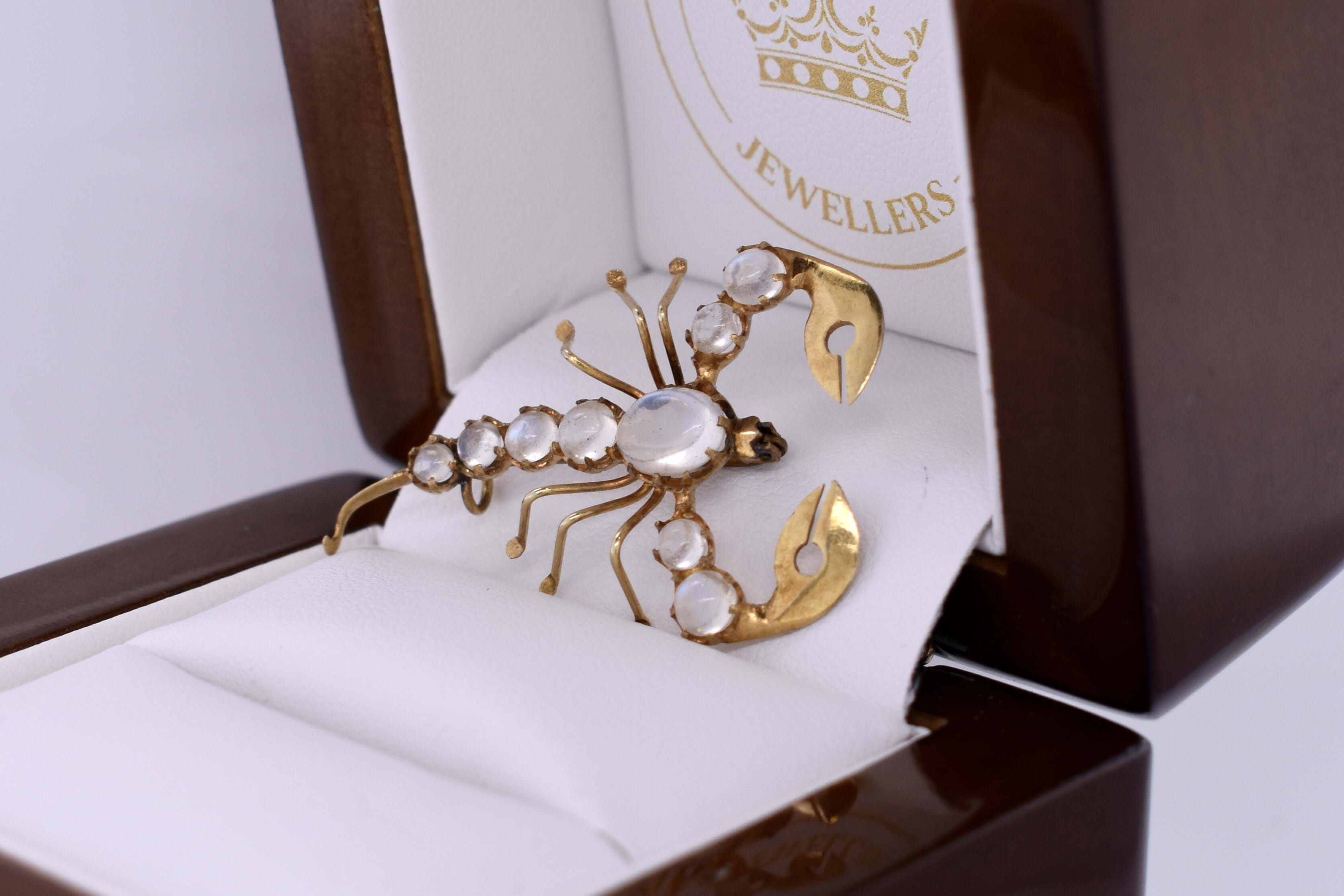 Few words are needed to describe this beautiful piece. The scorpion brooch measures a total of 35x24mm and is made in 10ct yellow gold. Set into the back of the scorpion is a total of 9 oval moonstone in varying sizes. Finished with a normal brooch pin fitting.