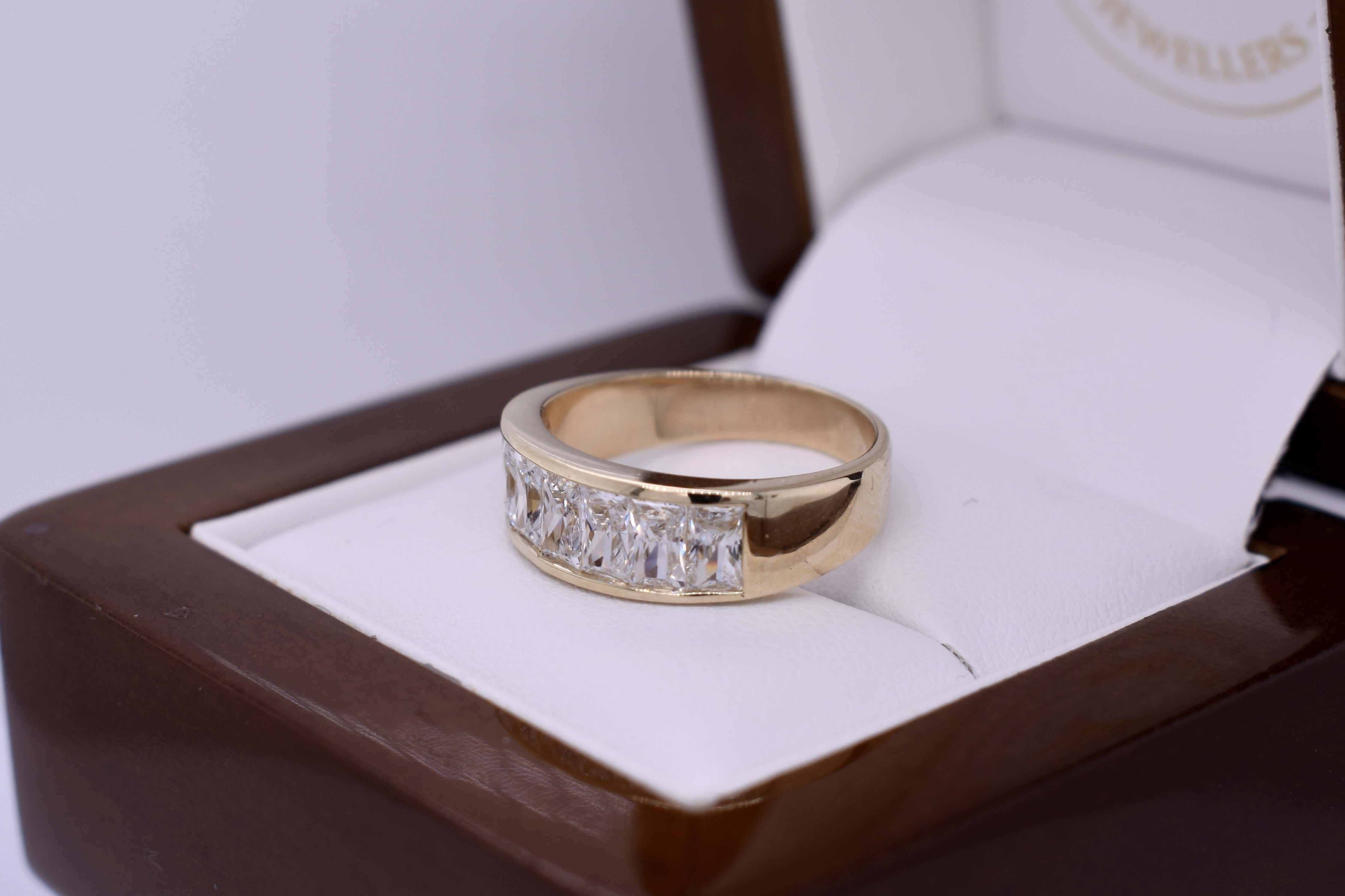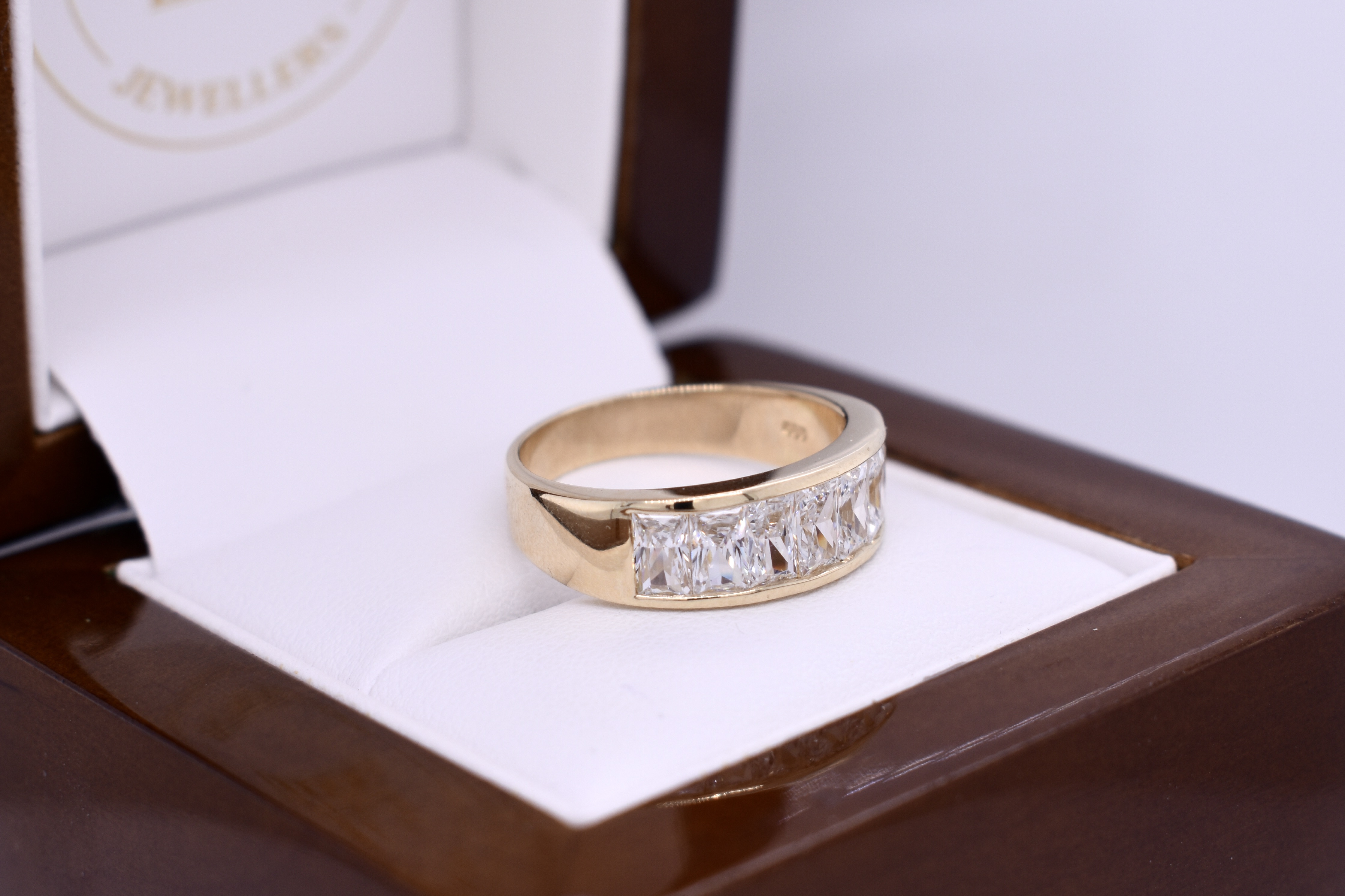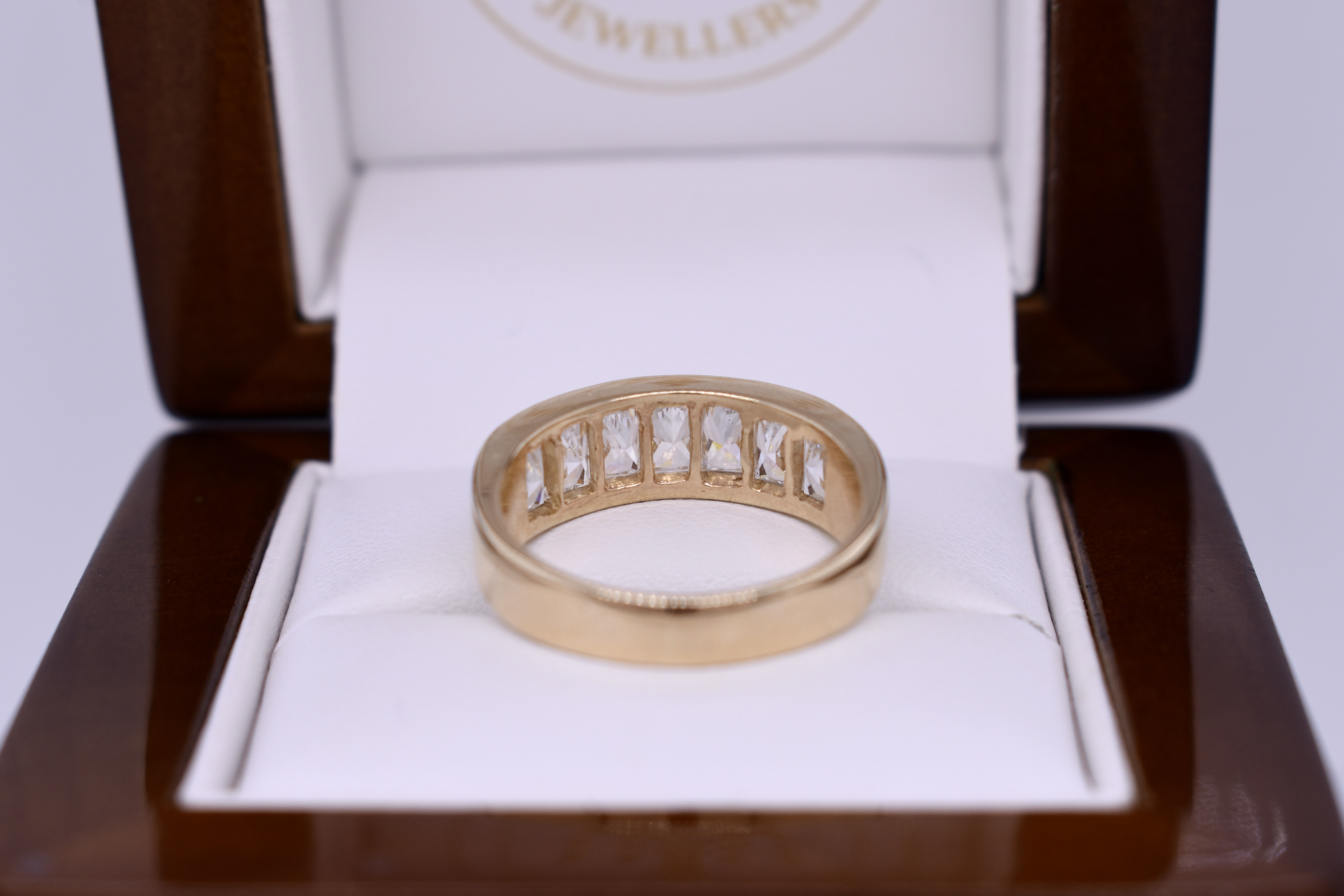 Crafted in 14ct yellow gold, this pretty cubic zirconia ring features 7 colourless channel set rectangular princess cut cubic zirconias measuring approx. 5.25x3.00mm. The band tapers from 6.6mm to 3.8mm, weighs 4.96grams and is a finger size O. Independent valuation supplied.