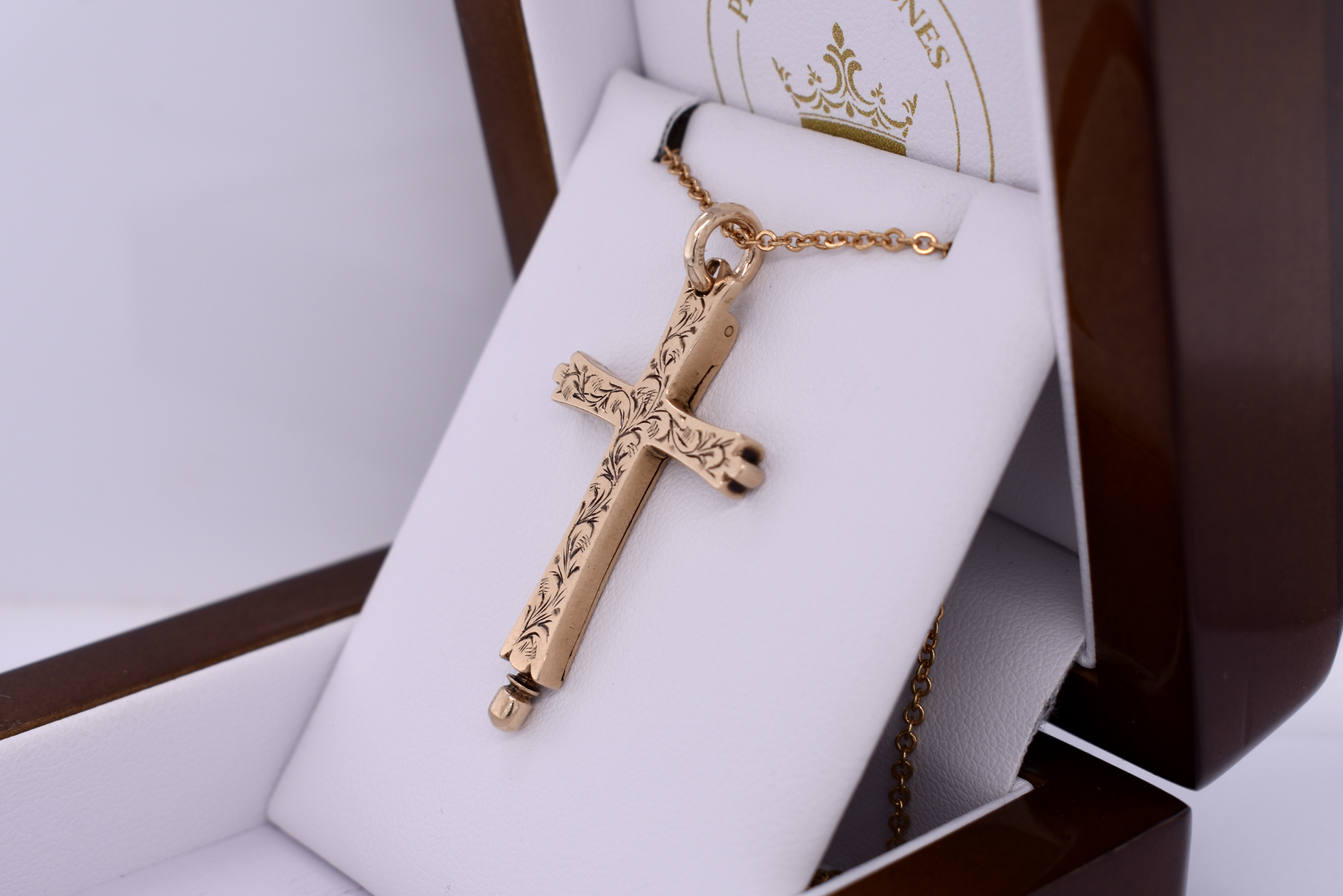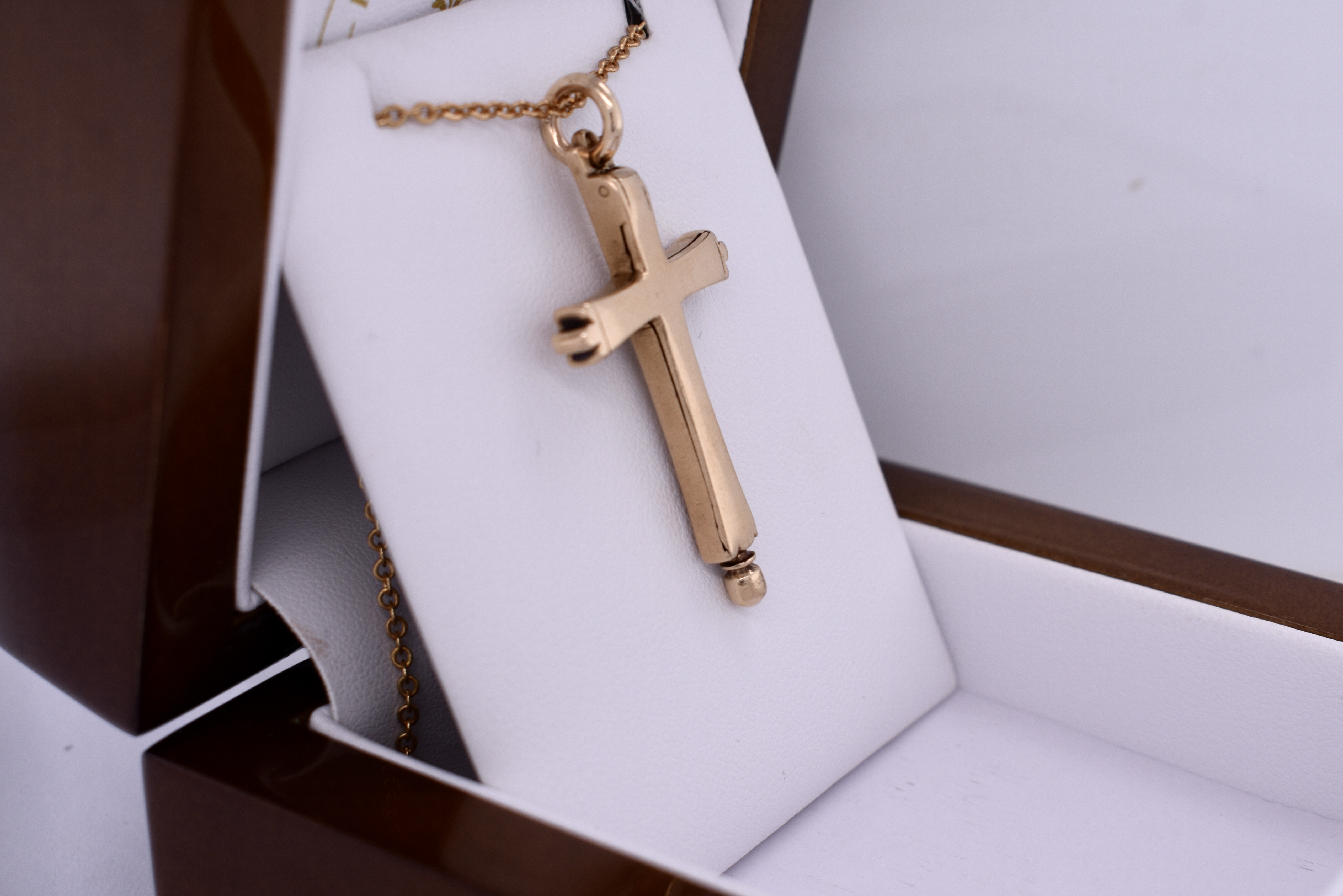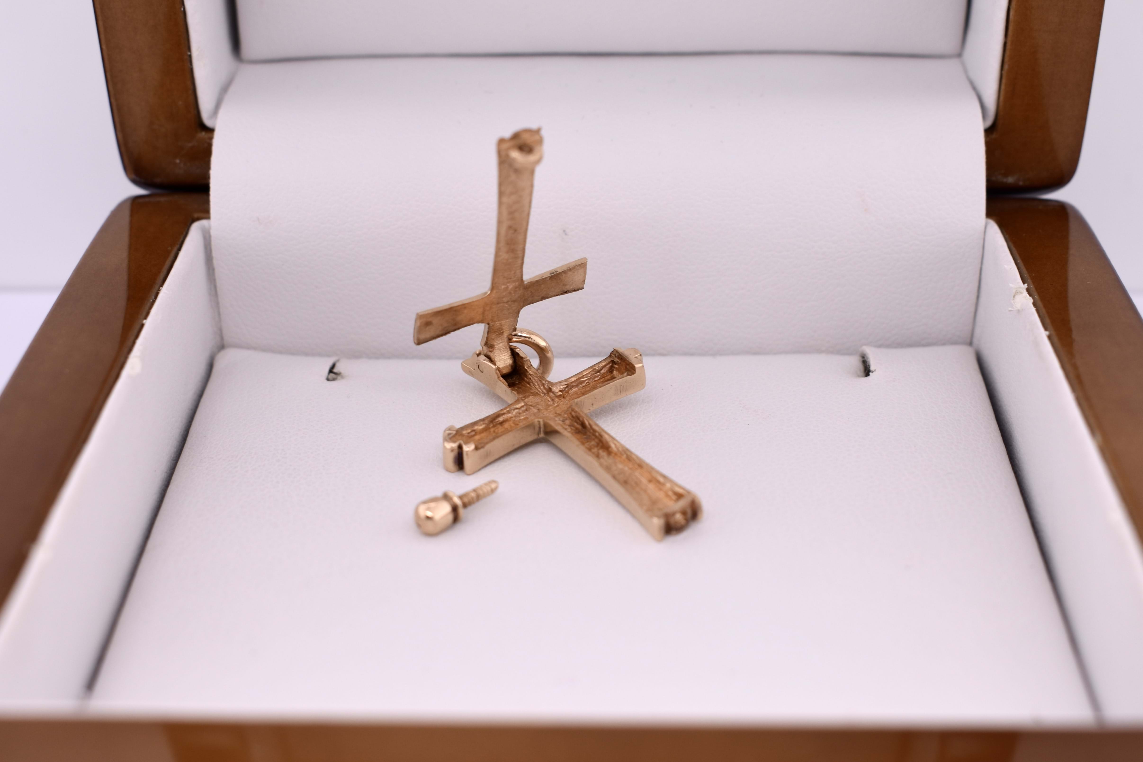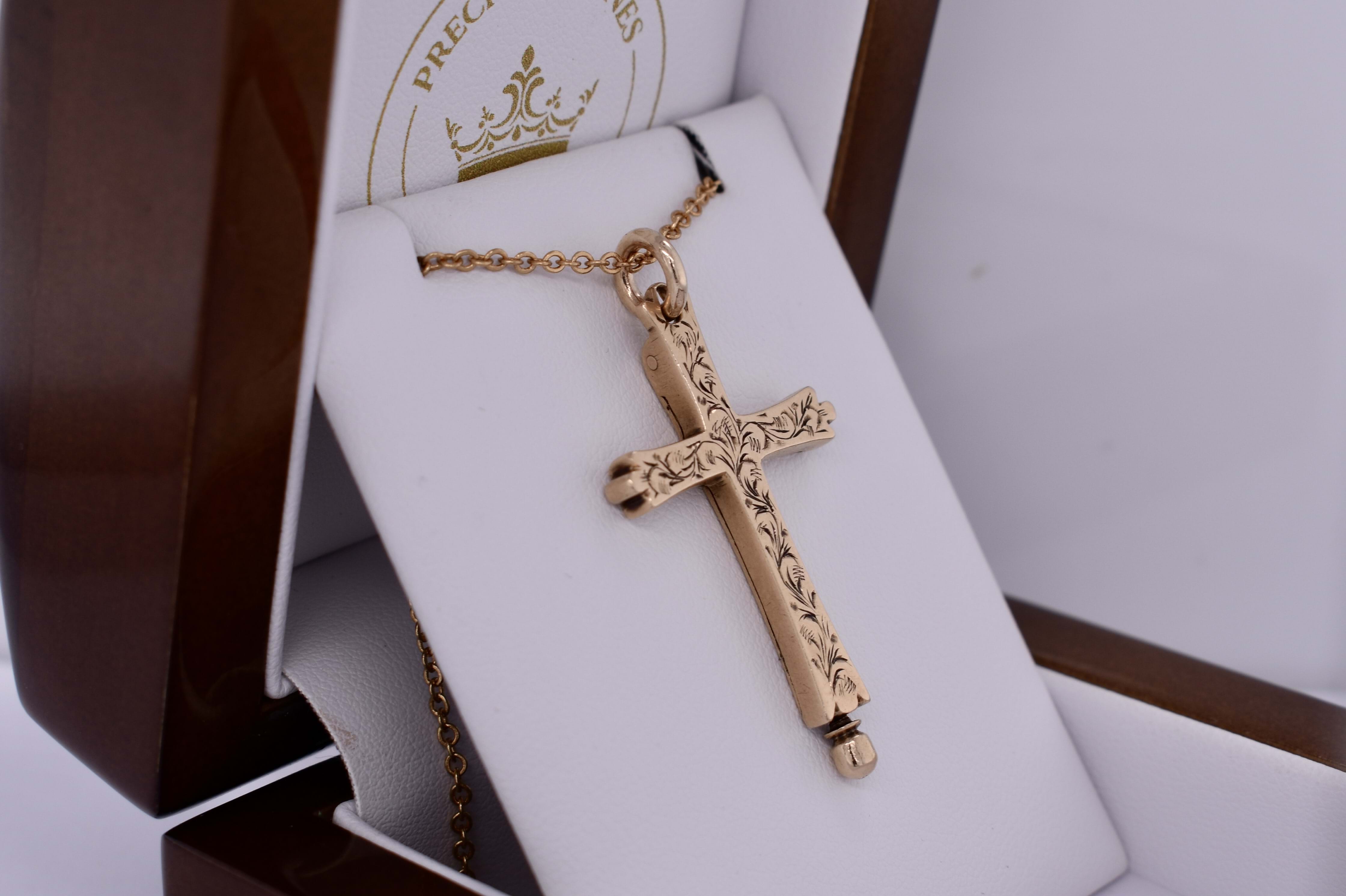 This gorgeous Victorian era memorial cross is crafted in 14ct yellow gold and showcases a gorgeous floral engraving across the face. Behind, is a hinge which opens up to the hidden inside compartment once the ball at the base is unscrewed, which they used to store ashes. Finished with a 9ct gold jump ring bale. Total weight is 6.25grams. Chains are available for separate purchase. Independent valuation supplied.