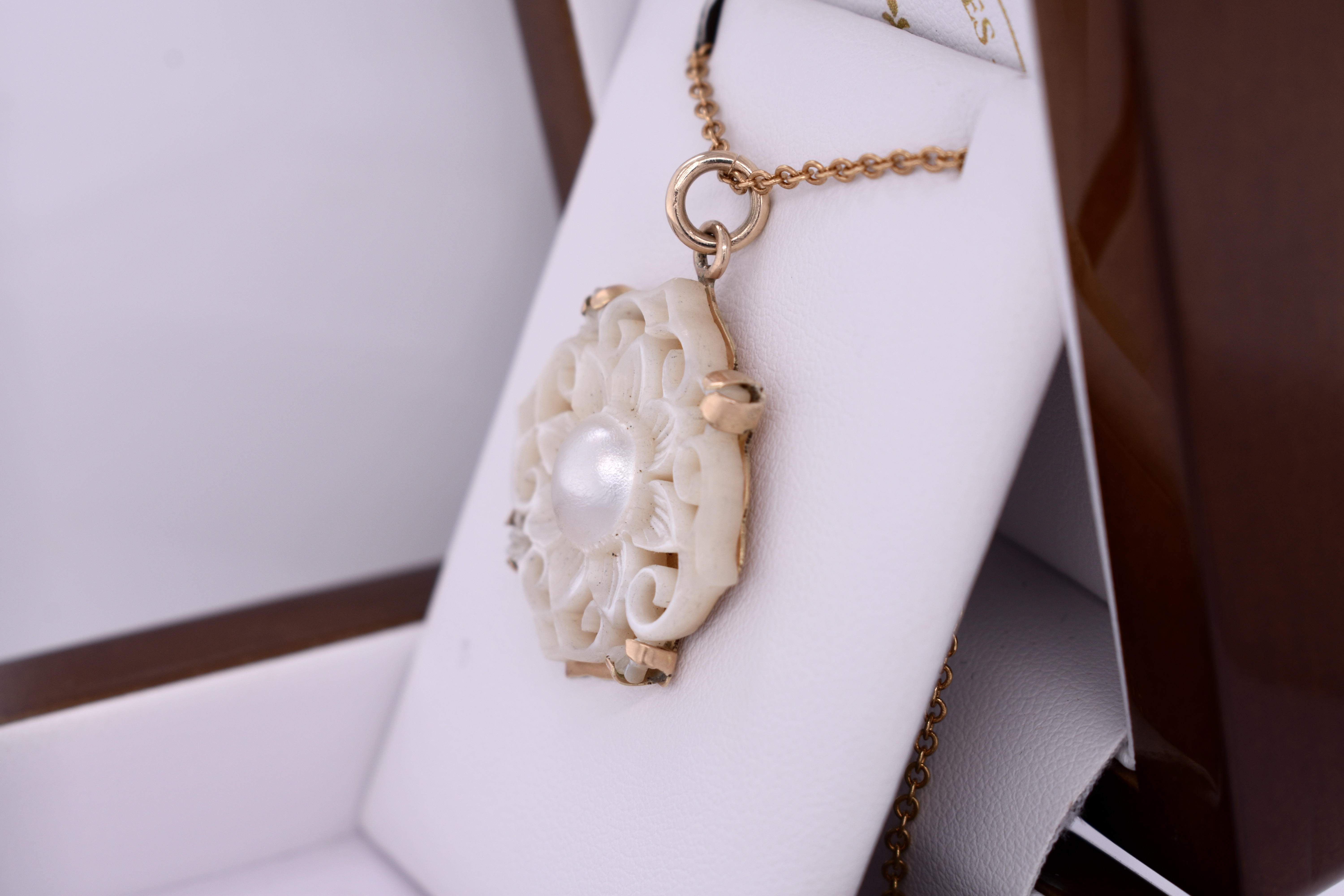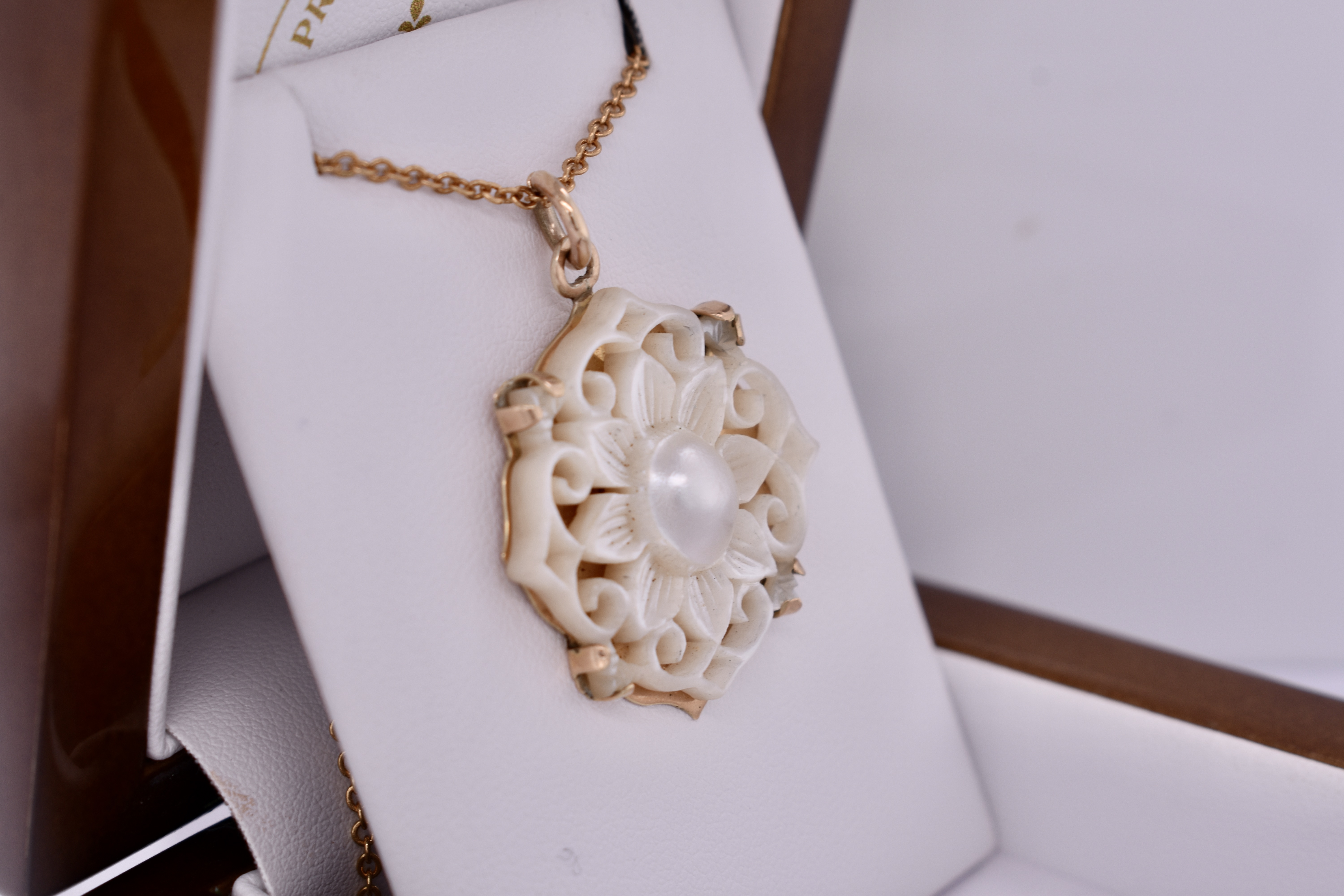 Gorgeous stamped 15ct yellow gold & mother of pearl floral pendant. The gorgeous flower and scroll outer edge is carved mother of pearl that is split 4 claw set onto a solid 15ct yellow gold back plate. Finished with a plain jump ring hoop. Chains are available for separate purchase. Independent Valuation Supplied