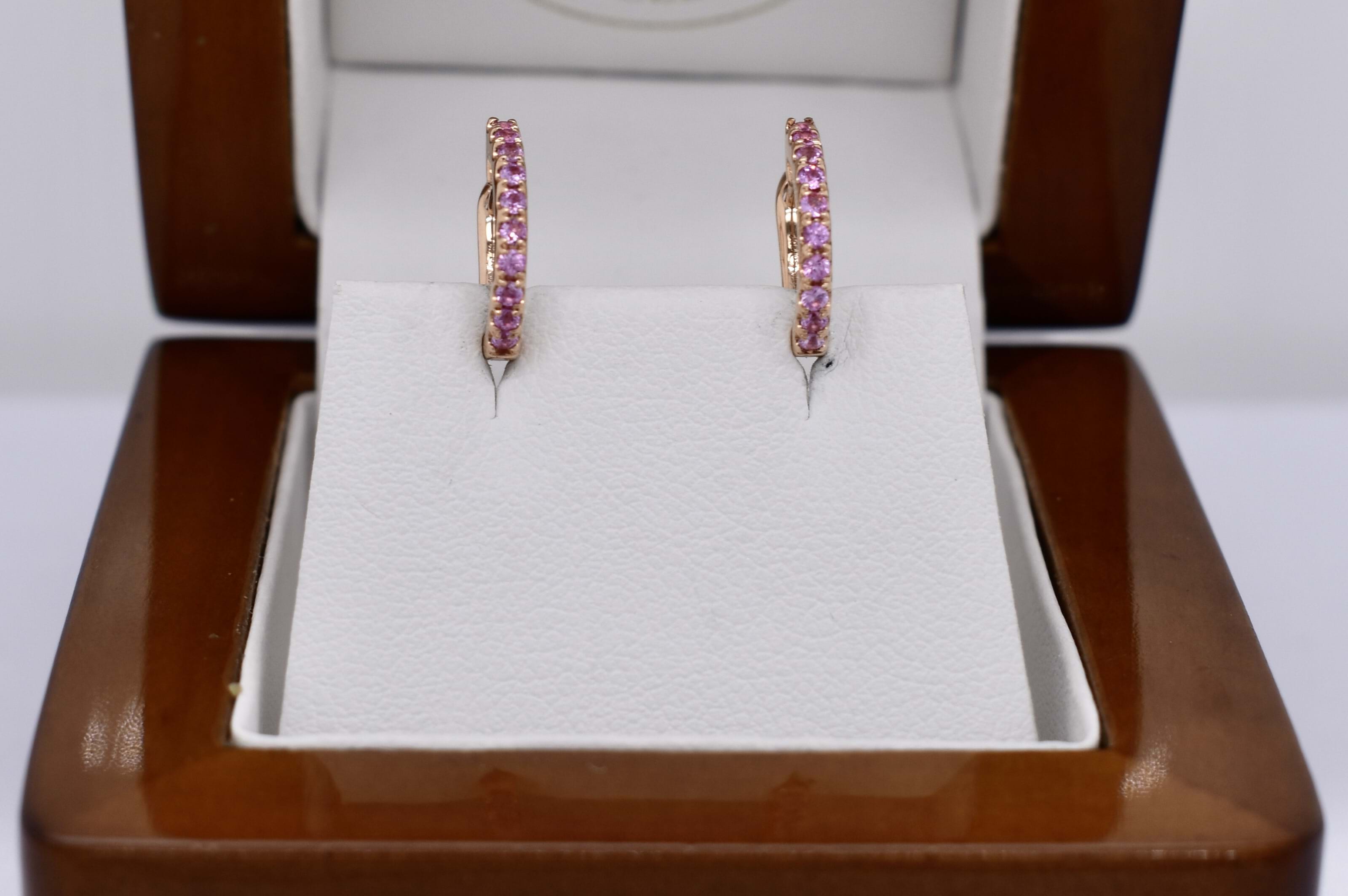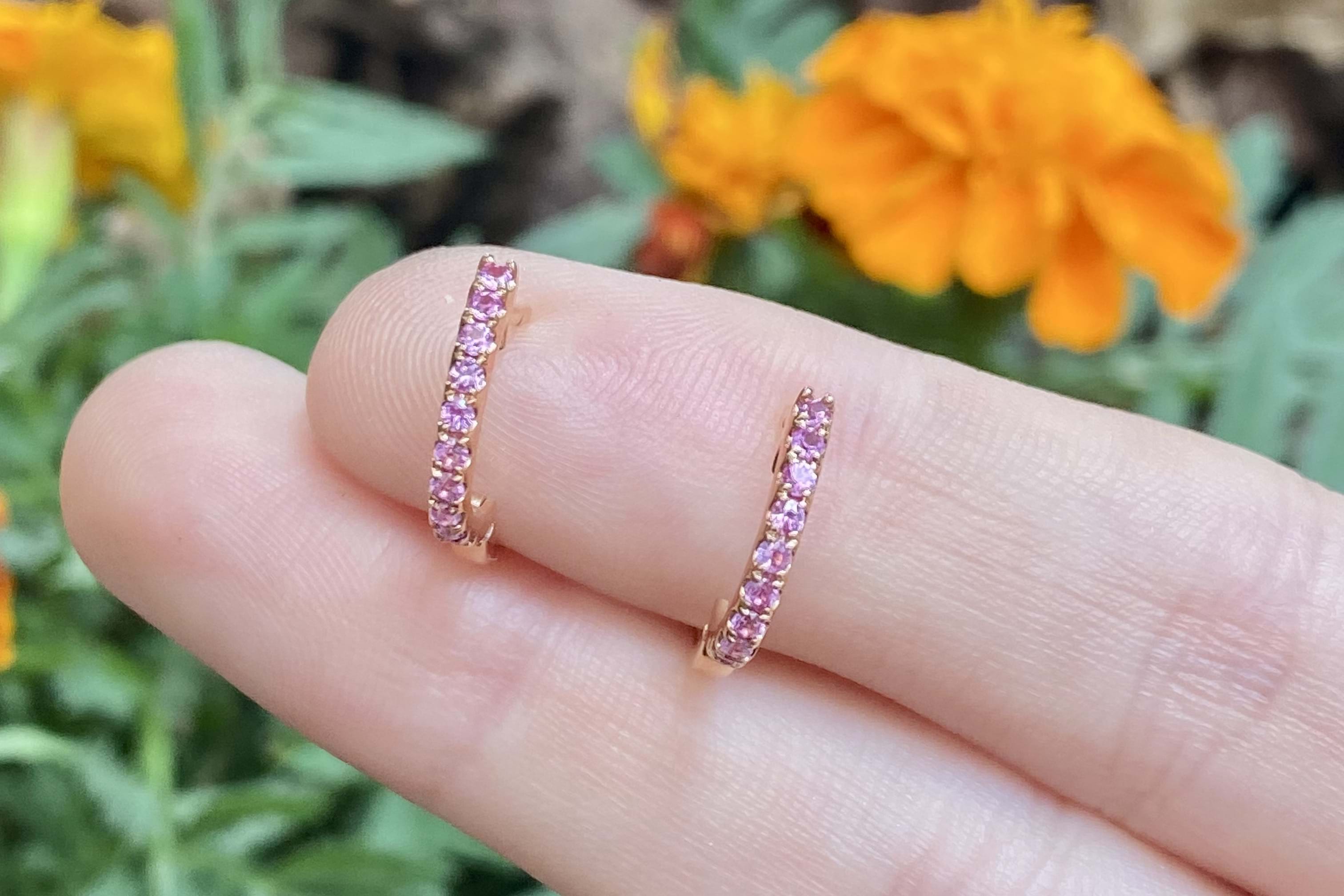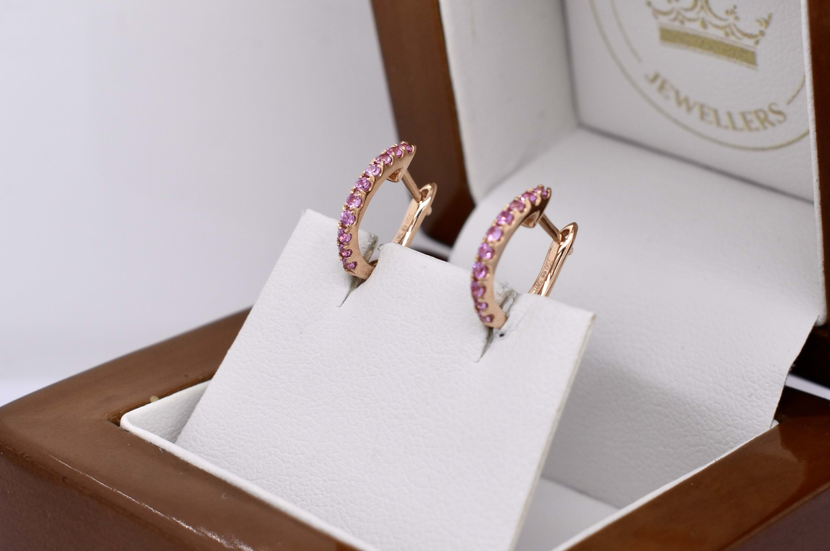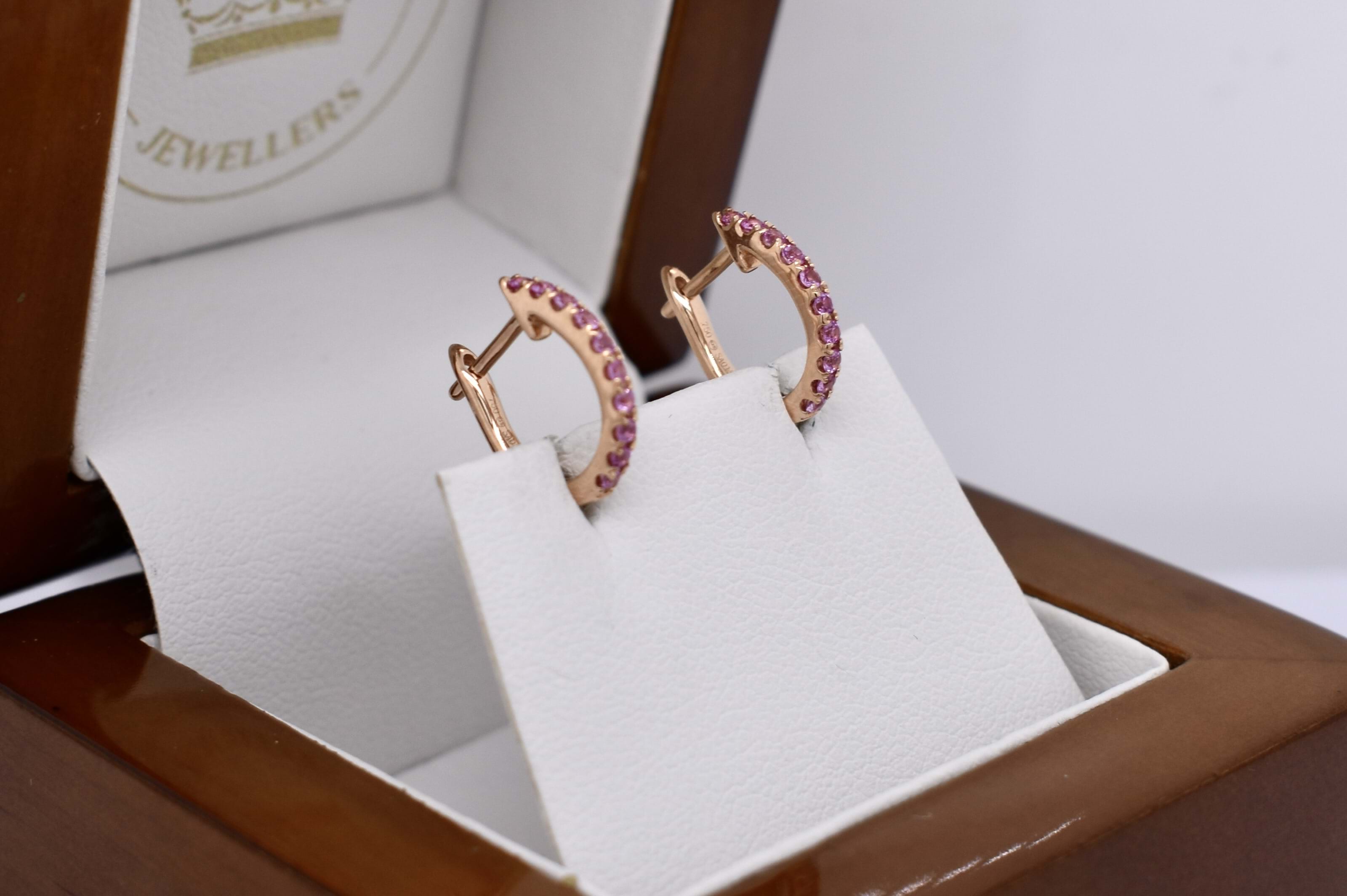 This adorable pair of huggies, crafted in 18ct rose gold, set with 20 bright mid-light pink 1.30mm sapphires. The sapphires are cut down claw set in a U-shape hinged hoop with clipped post fittings. Sapphires totalling 0.26ct eye Clean. Dainty enough to be worn everyday as well as for going out. 1.73 grams. Independent Valuation Supplied.