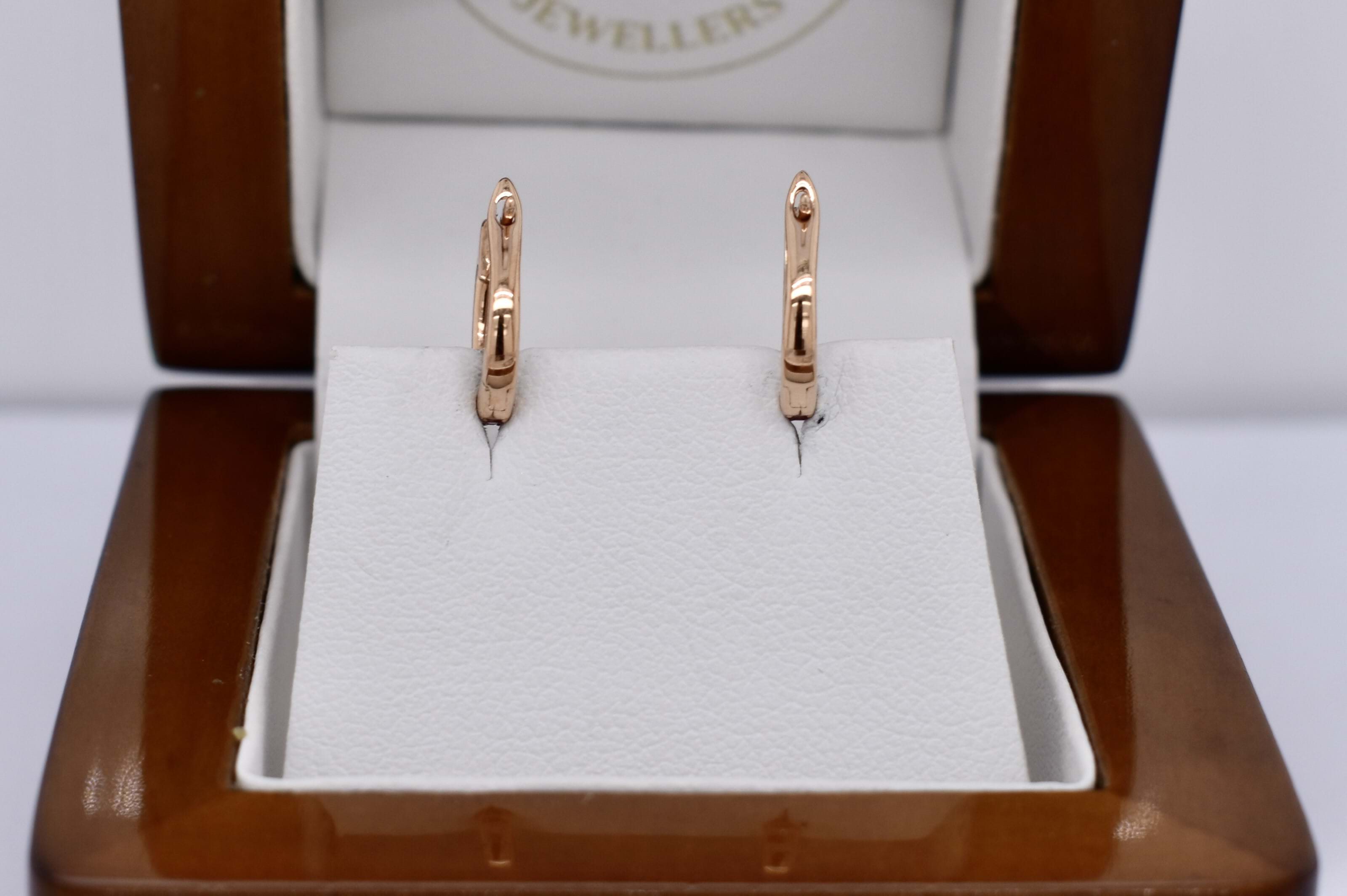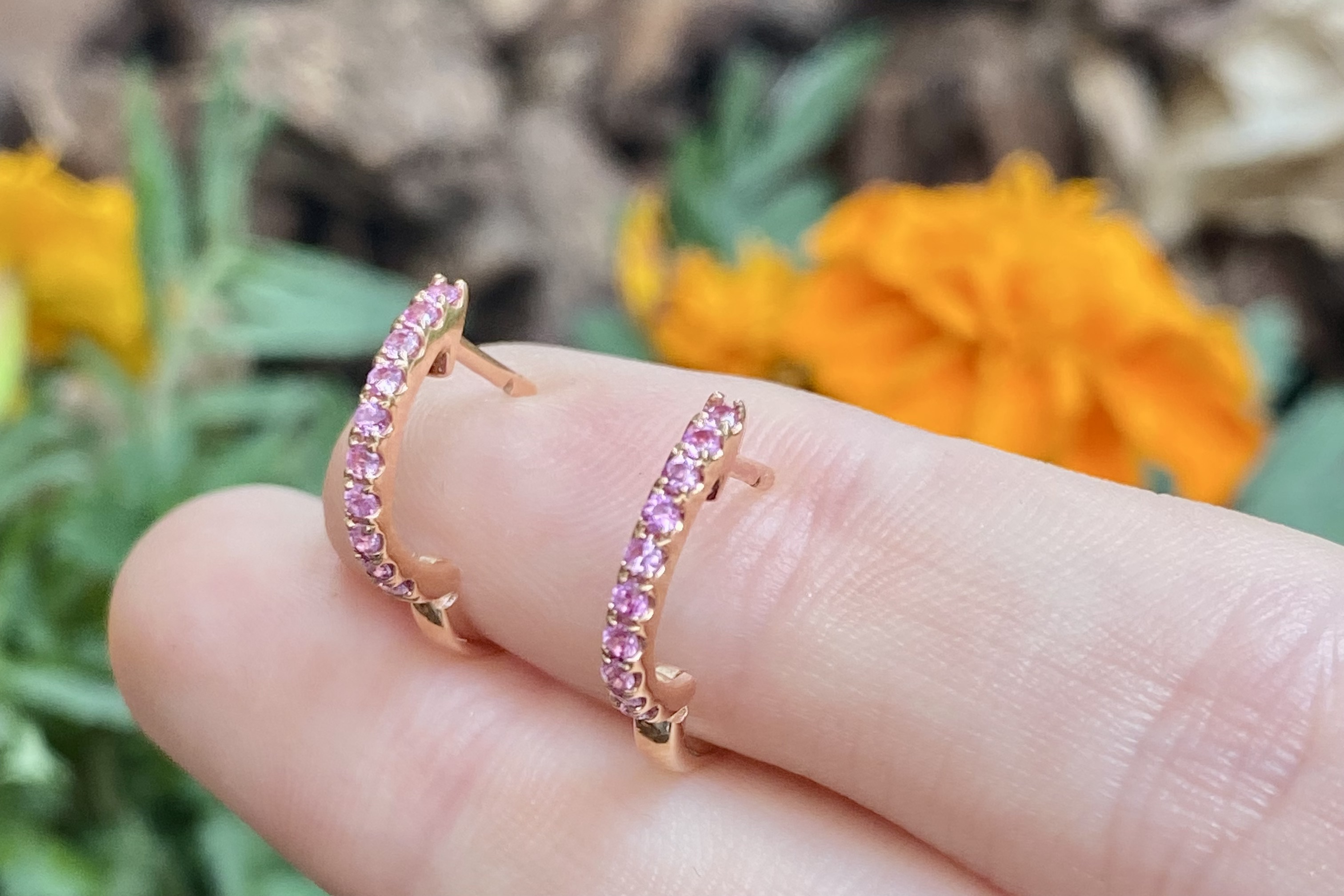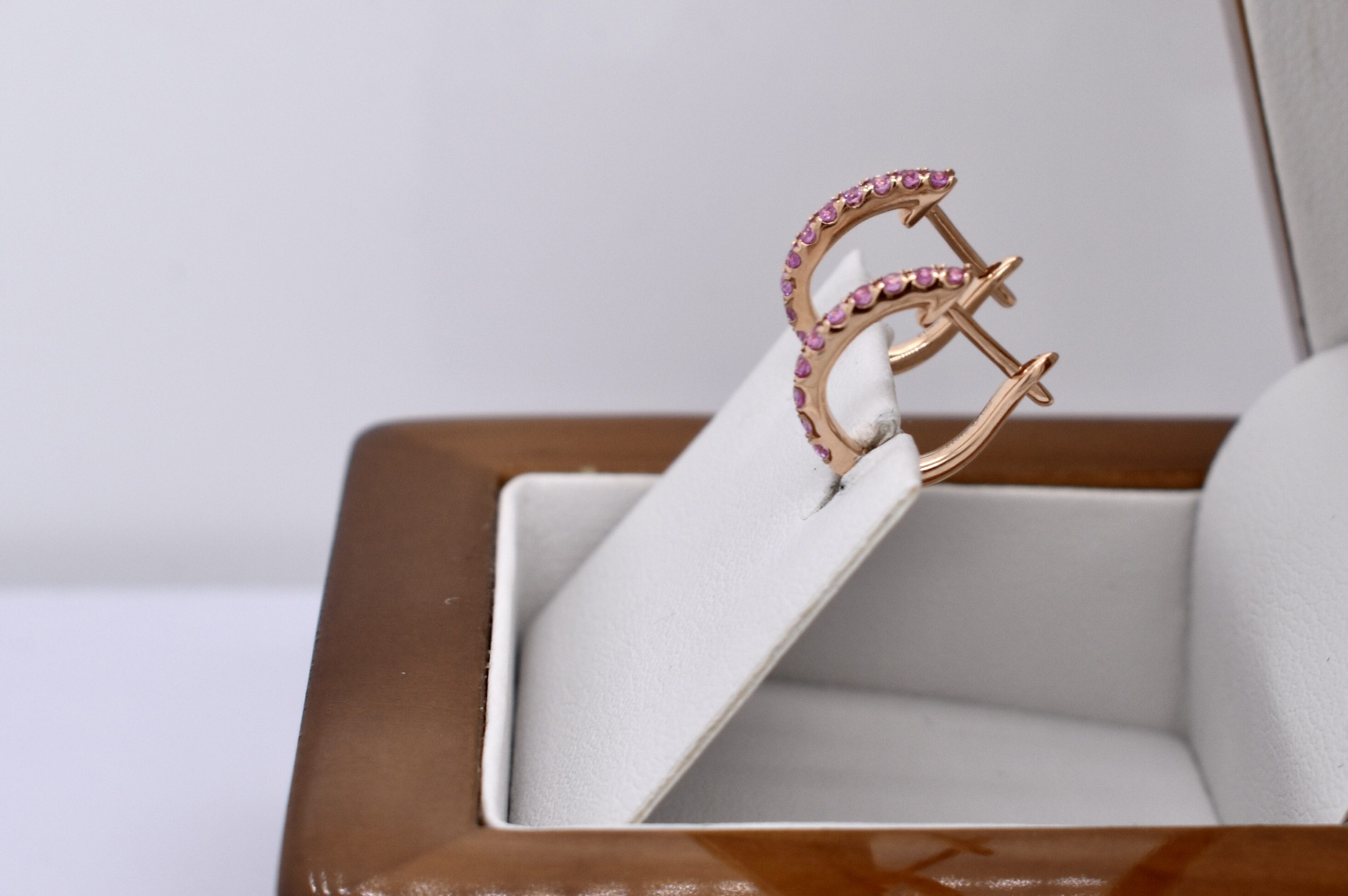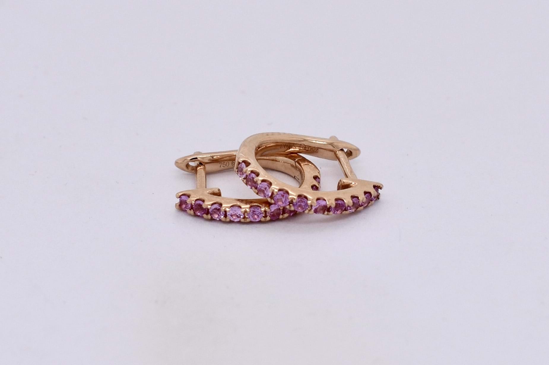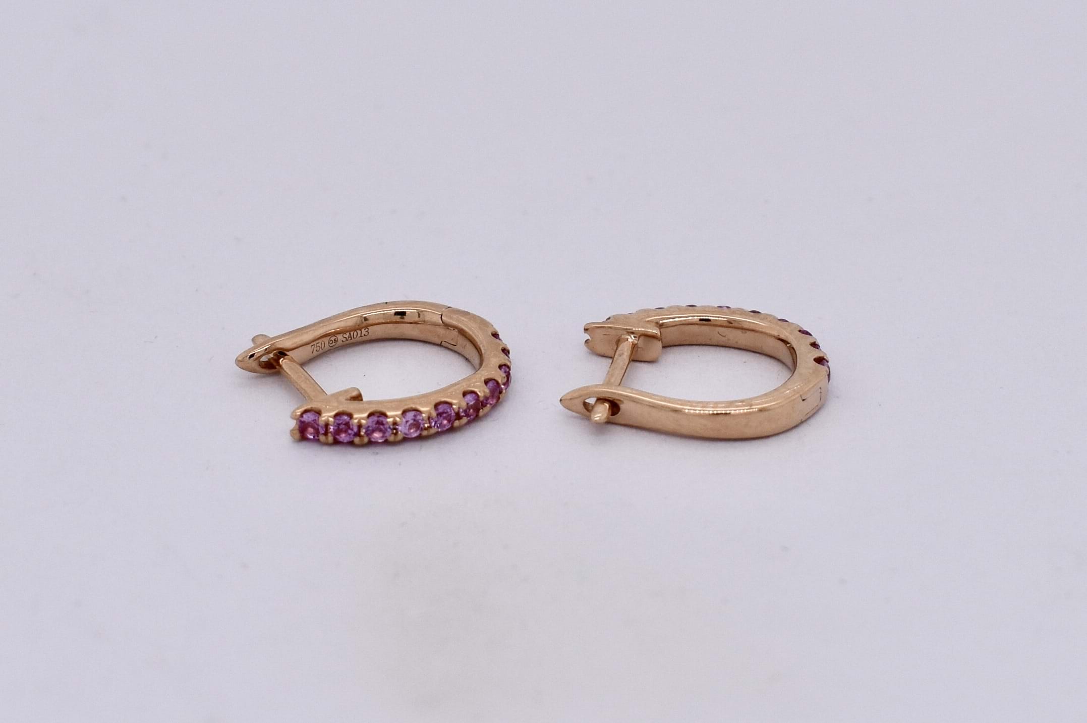 This adorable pair of huggies, crafted in 18ct rose gold, set with 20 bright mid-light pink 1.30mm sapphires. The sapphires are cut down claw set in a U-shape hinged hoop with clipped post fittings. Sapphires totalling 0.26ct eye Clean. Dainty enough to be worn everyday as well as for going out. 1.73 grams. Independent Valuation Supplied.