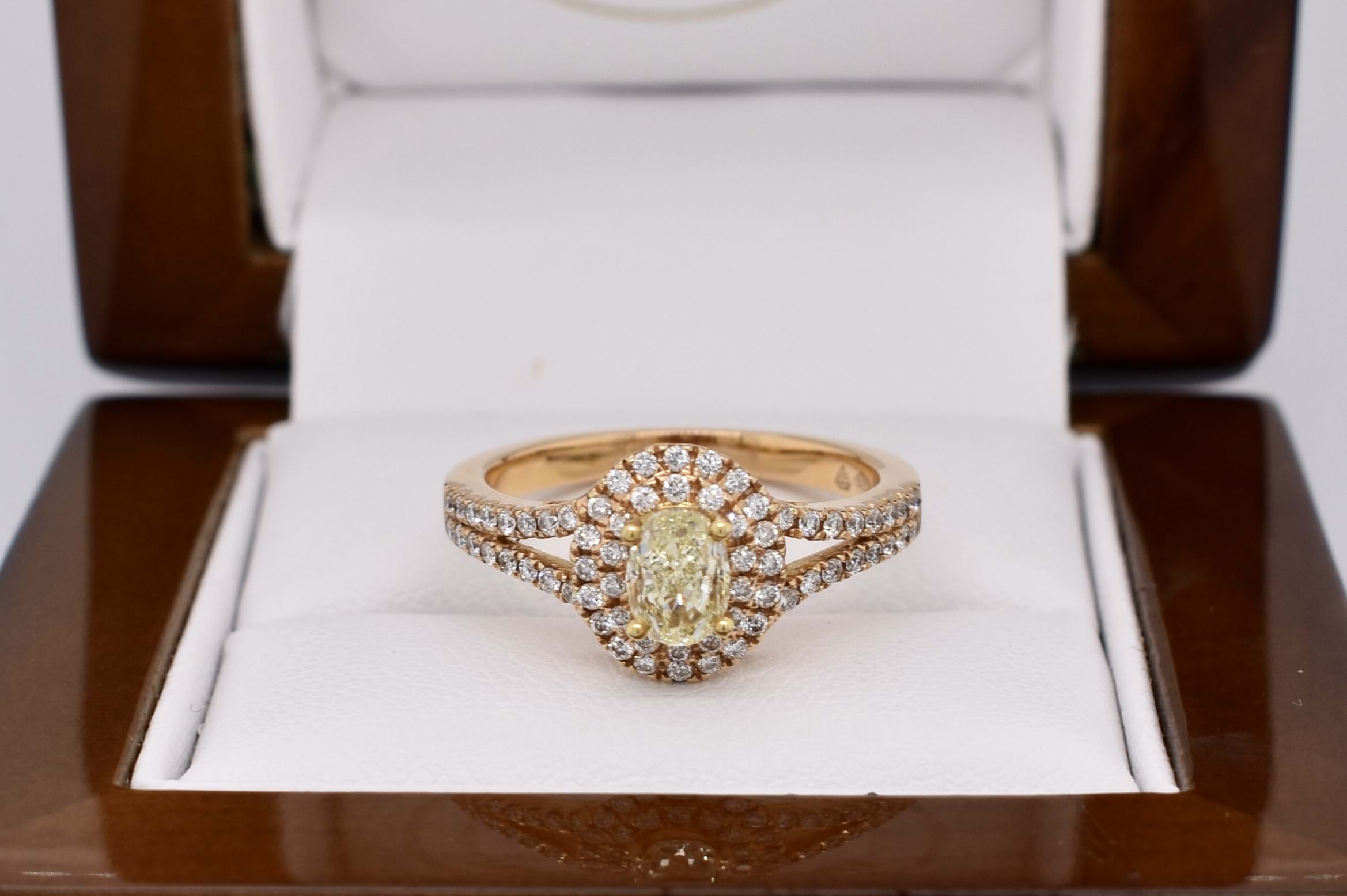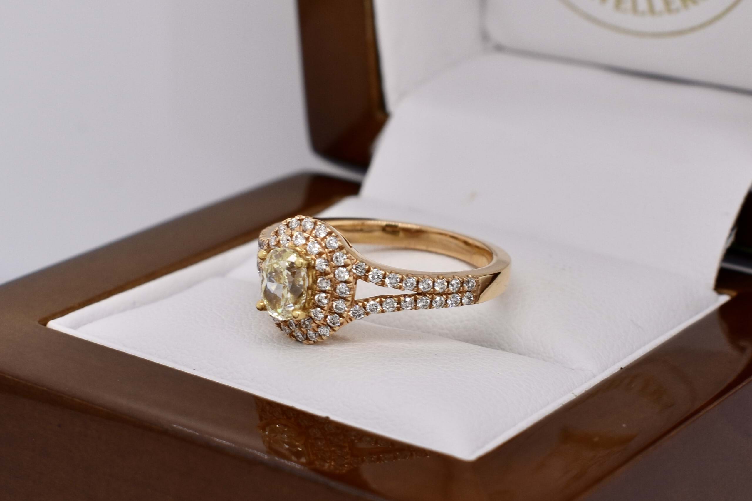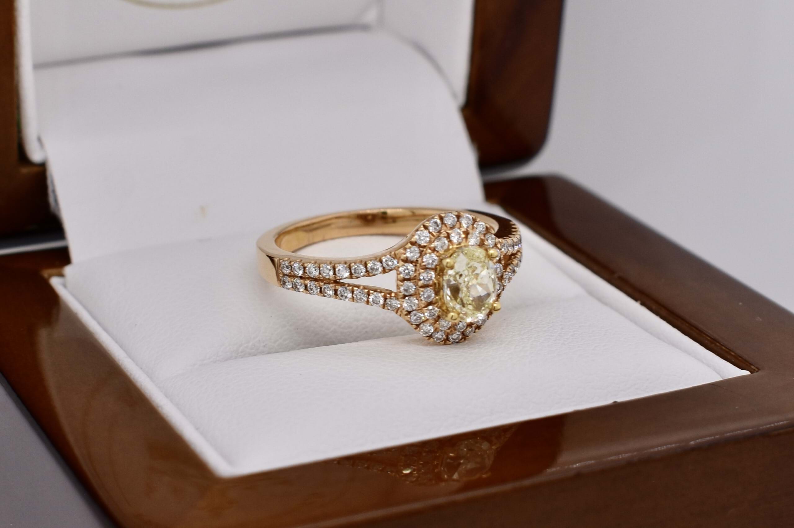 A gorgeous 18ct rose gold double halo ring featuring a stunning 0.64ct fancy yellow/VS2 oval diamond four claw set and surrounded by two rows of sparkling white round brilliant cut diamonds and diamond set split shoulders. The white diamonds total 0.40cts FG/VS-SI and the ring is finger size M+. Independent Valuation Supplied
