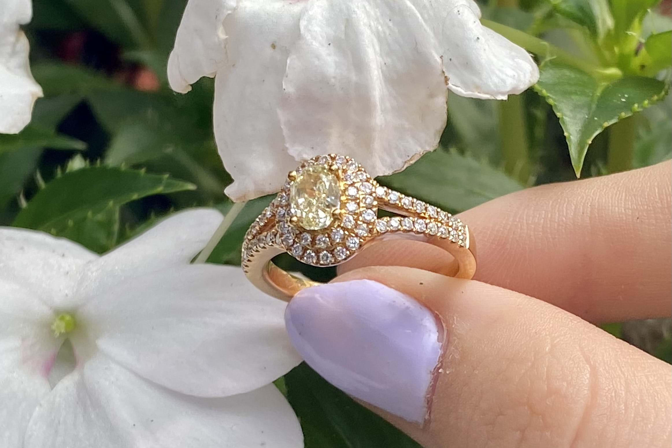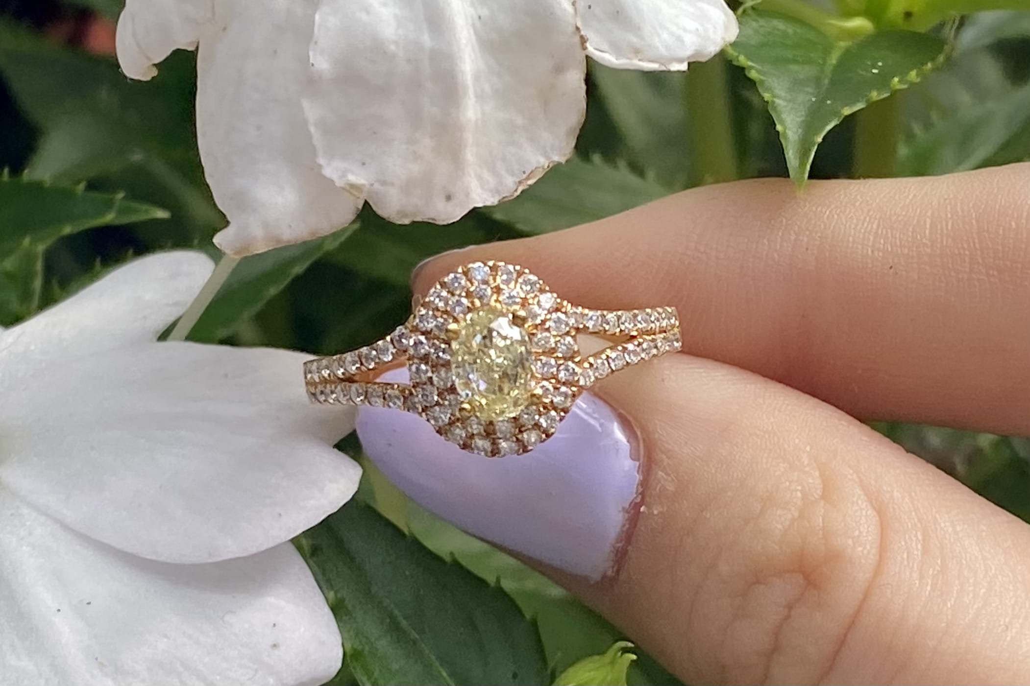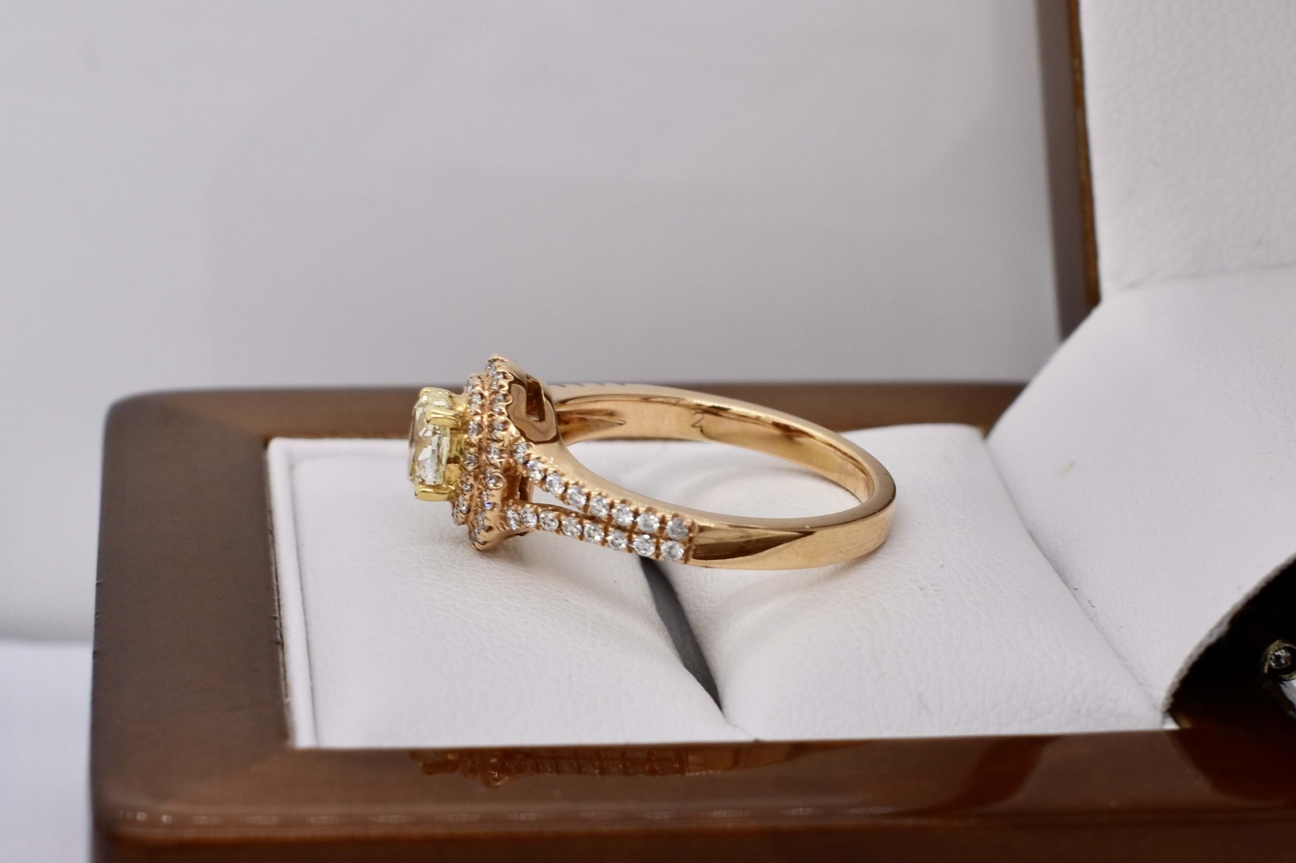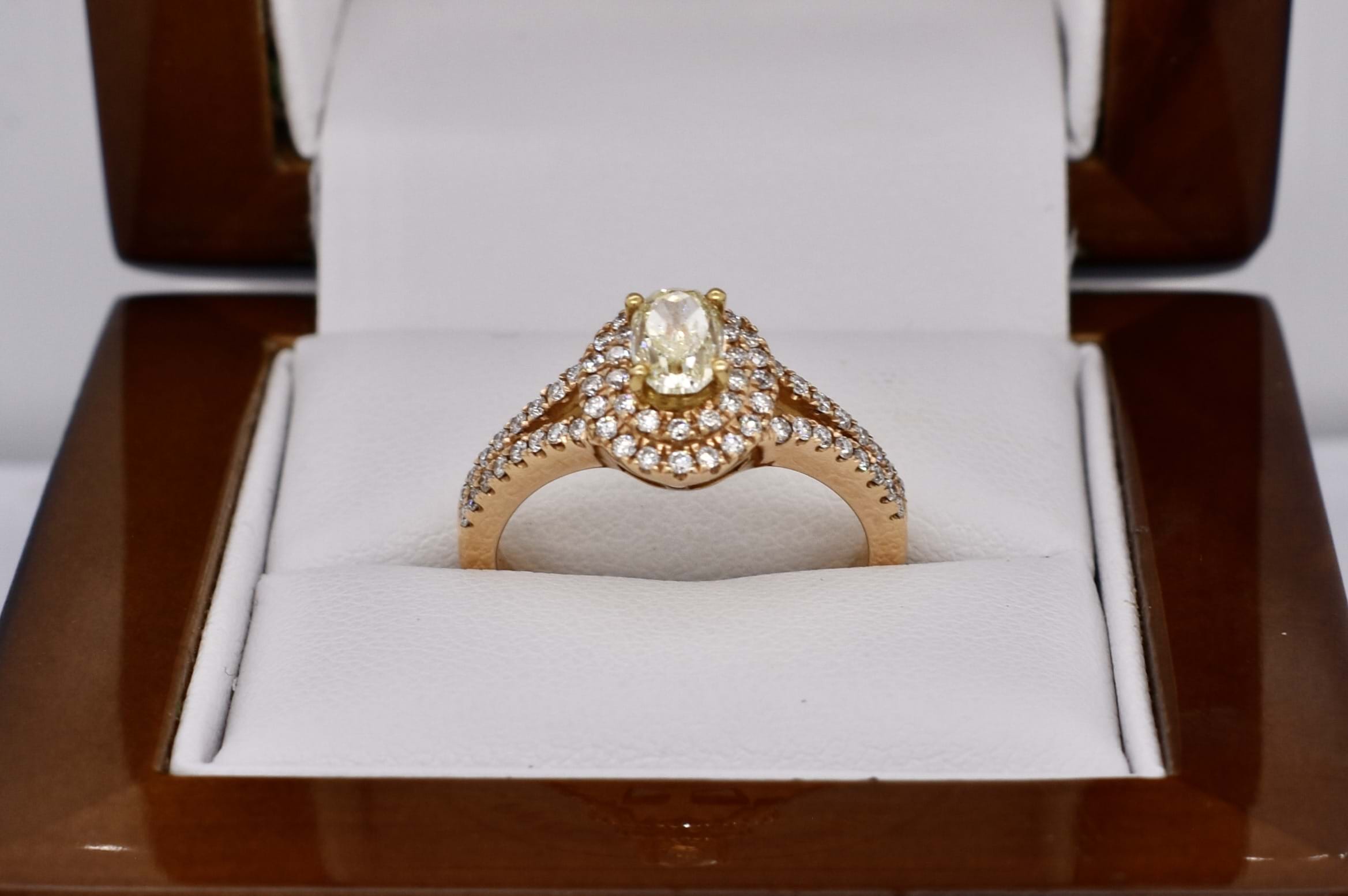 A gorgeous 18ct rose gold double halo ring featuring a stunning 0.64ct fancy yellow/VS2 oval diamond four claw set and surrounded by two rows of sparkling white round brilliant cut diamonds and diamond set split shoulders. The white diamonds total 0.40cts FG/VS-SI and the ring is finger size M+. Independent Valuation Supplied