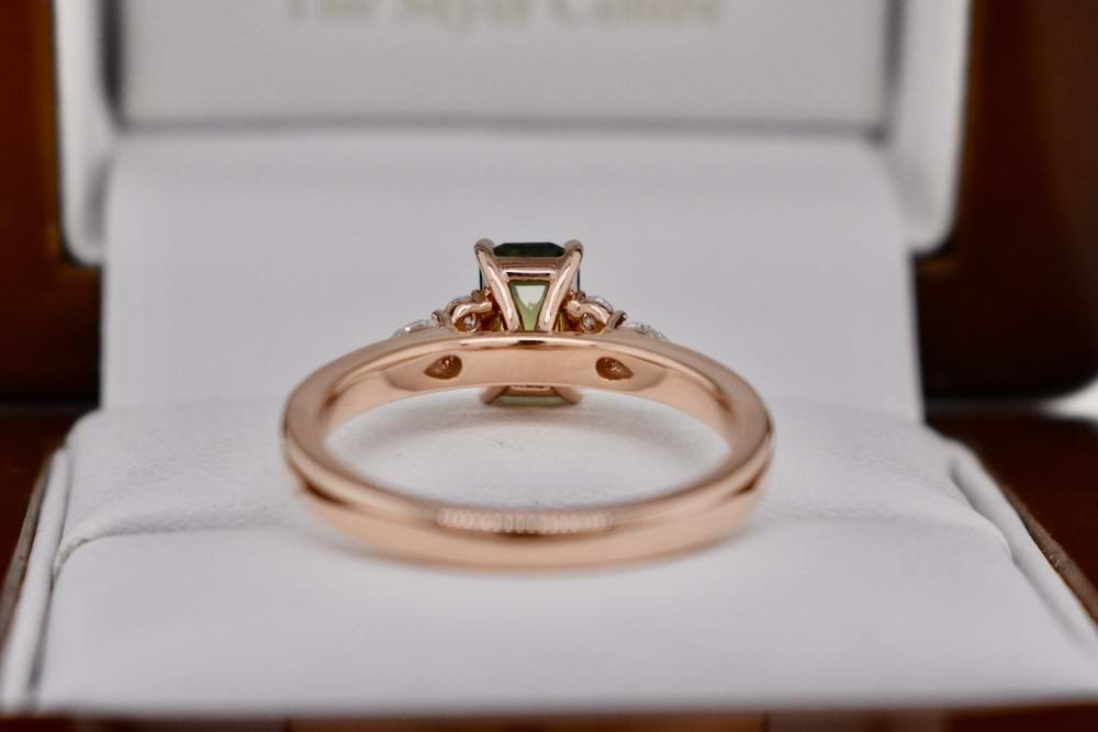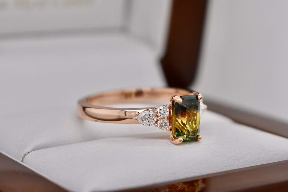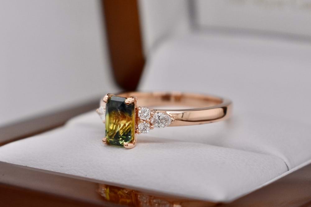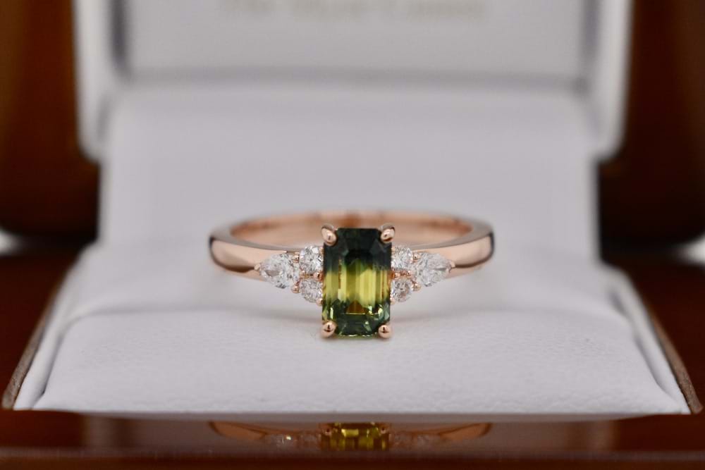 A spectacular bright, Australian, parti sapphire of 1.26cts with a zoned blue and yellow display. Set into an 18ct rose gold ring with two round brilliant cut diamonds and a pearshape diamond on each shoulder with a combined diamond weight of 0.24cts (FG/VS). Finger size M+ Independent Valuation Supplied