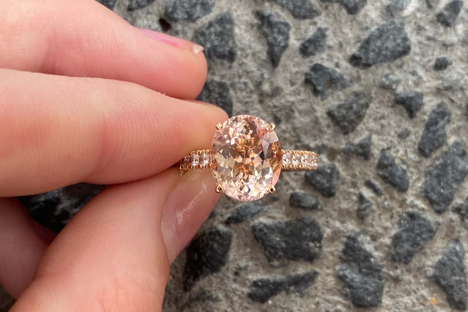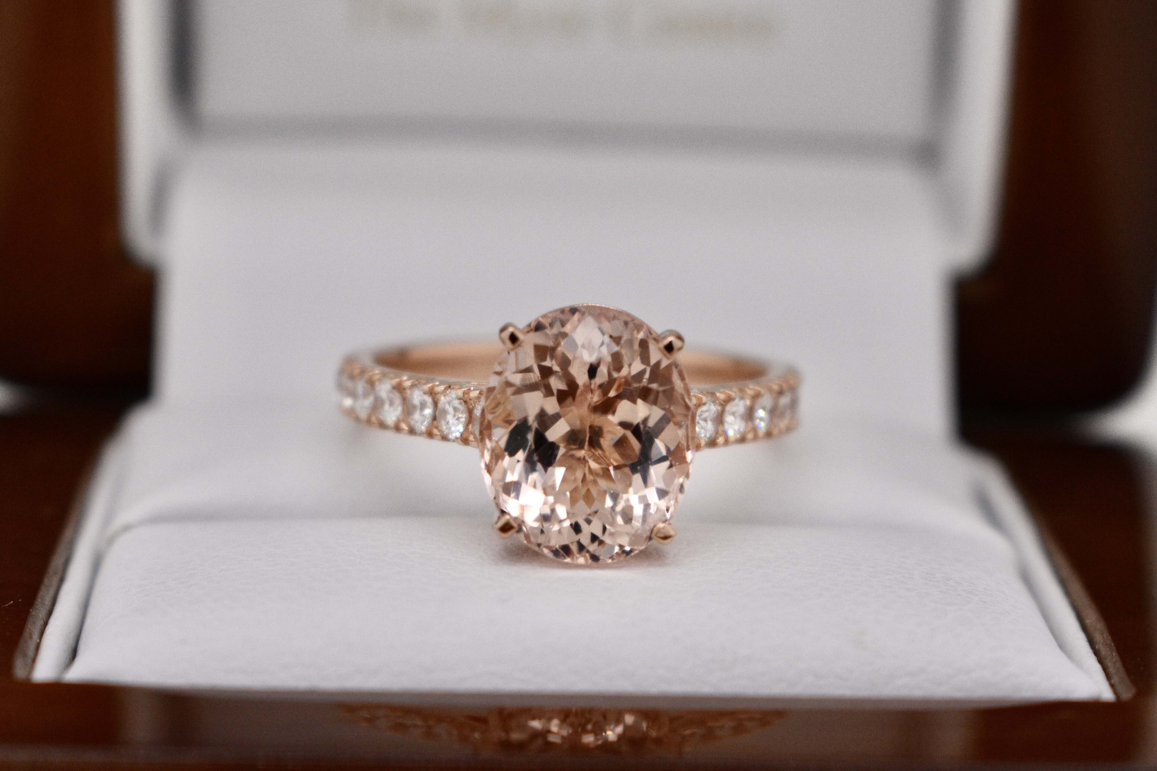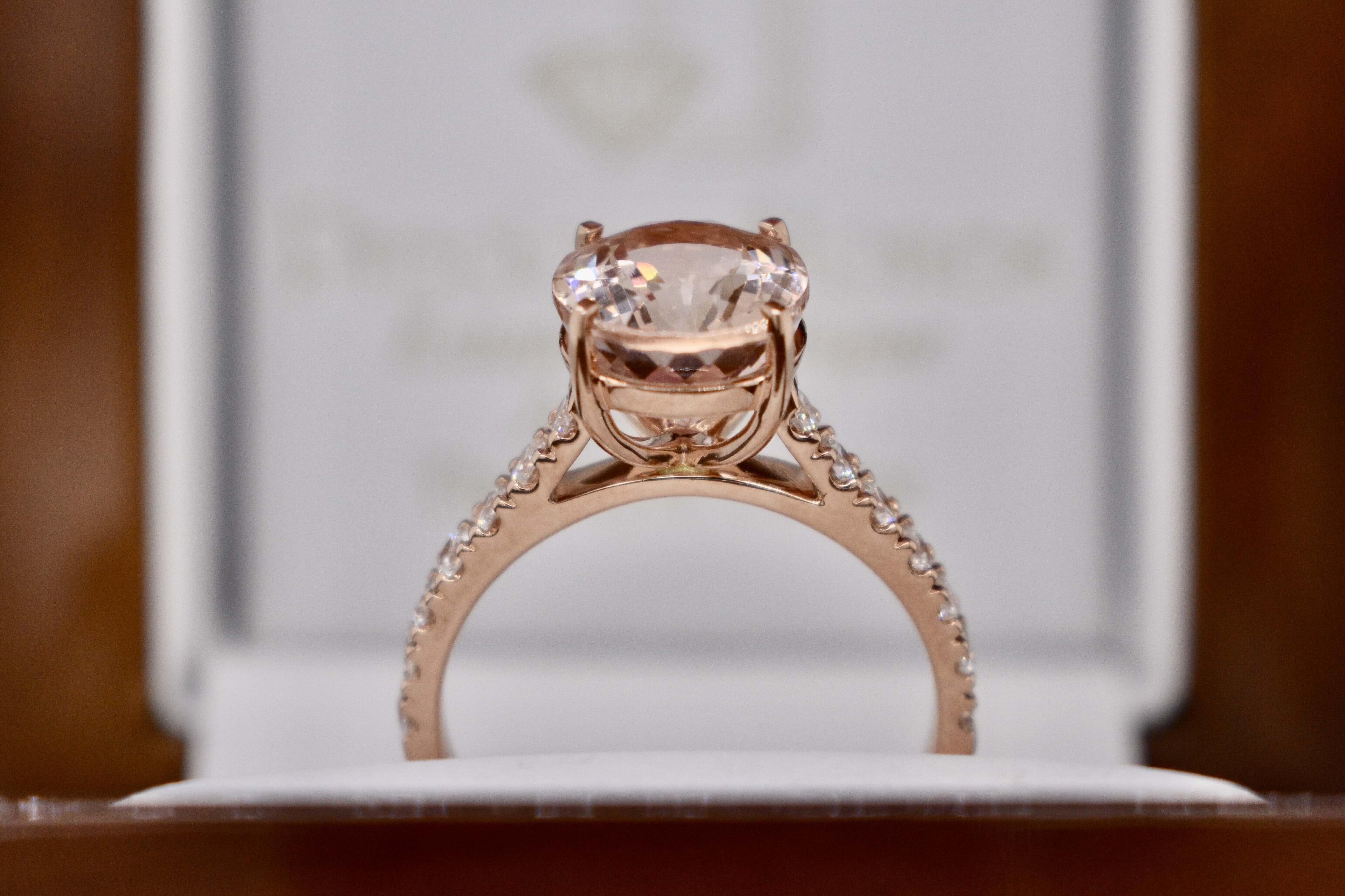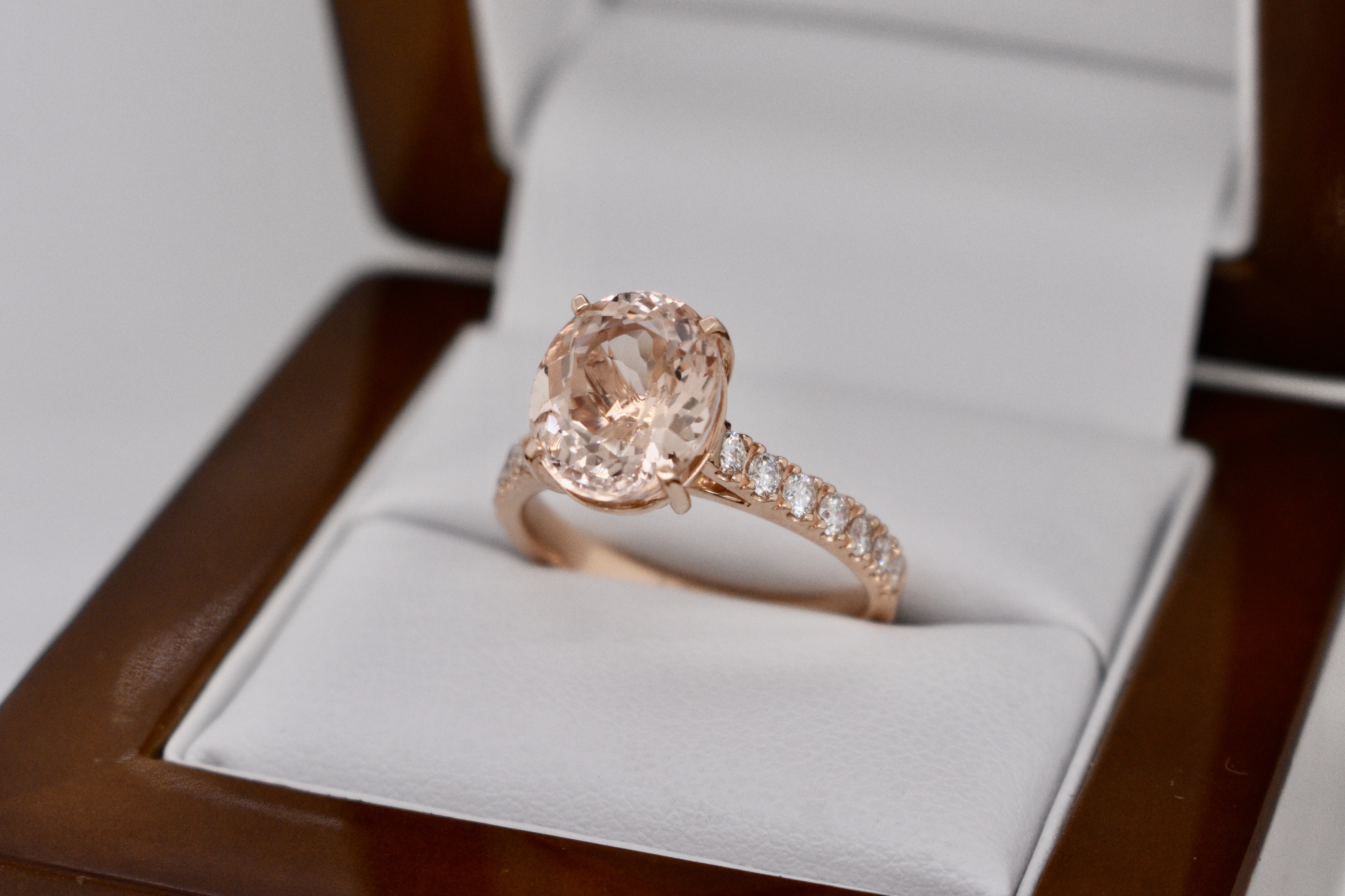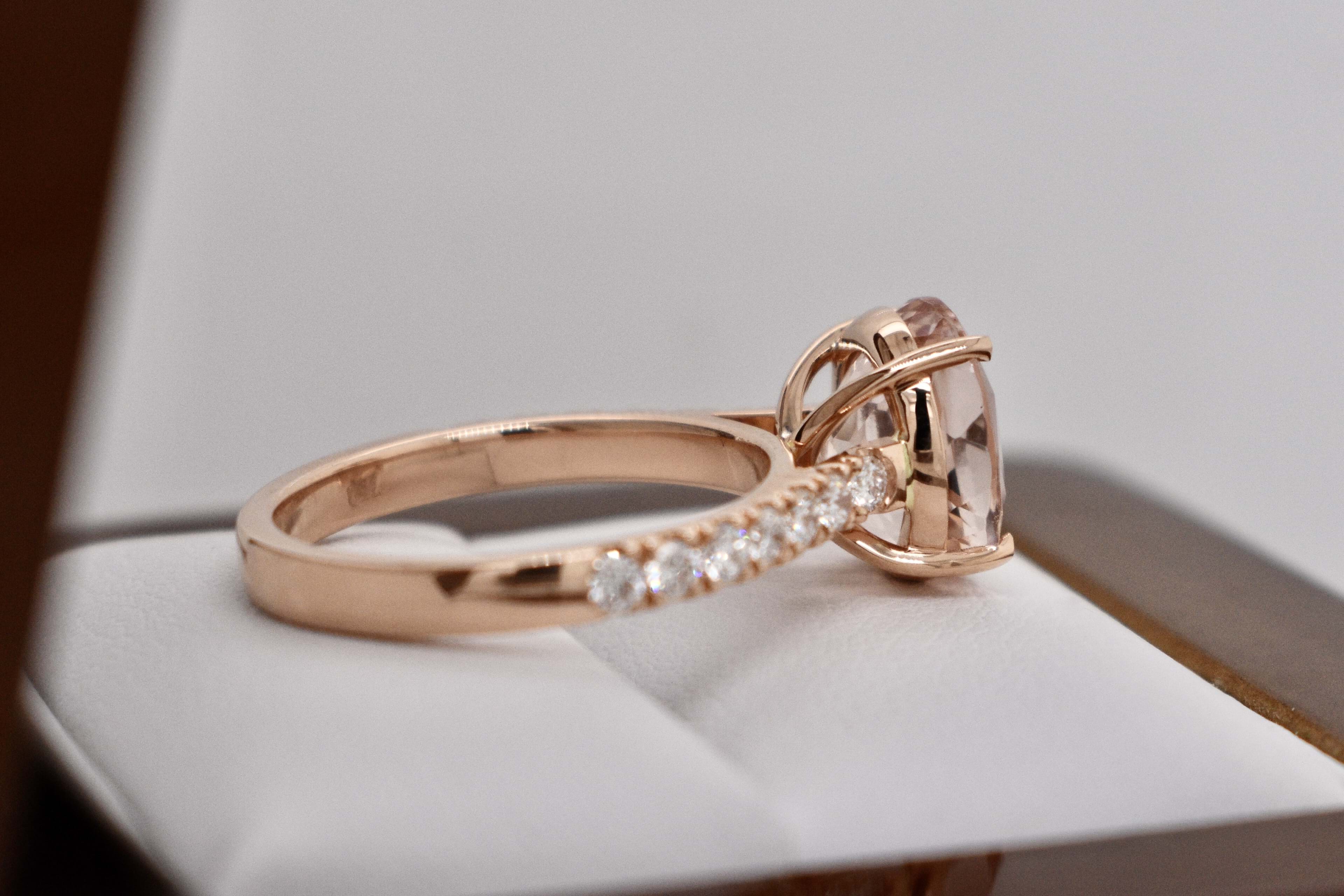 This 3.59ct oval morganite was hand chosen in store to be the feature of this 18ct rose gold bespoke ring. Created in the workshop the morganite has been four claw set with seven shimmering round brilliant cut diamonds set into each shoulder with a combined total of 0.49cts (GH/SI), with the ring designed to sit perfectly with bands if desired. Finger size N+ Independent Valuation Supplied