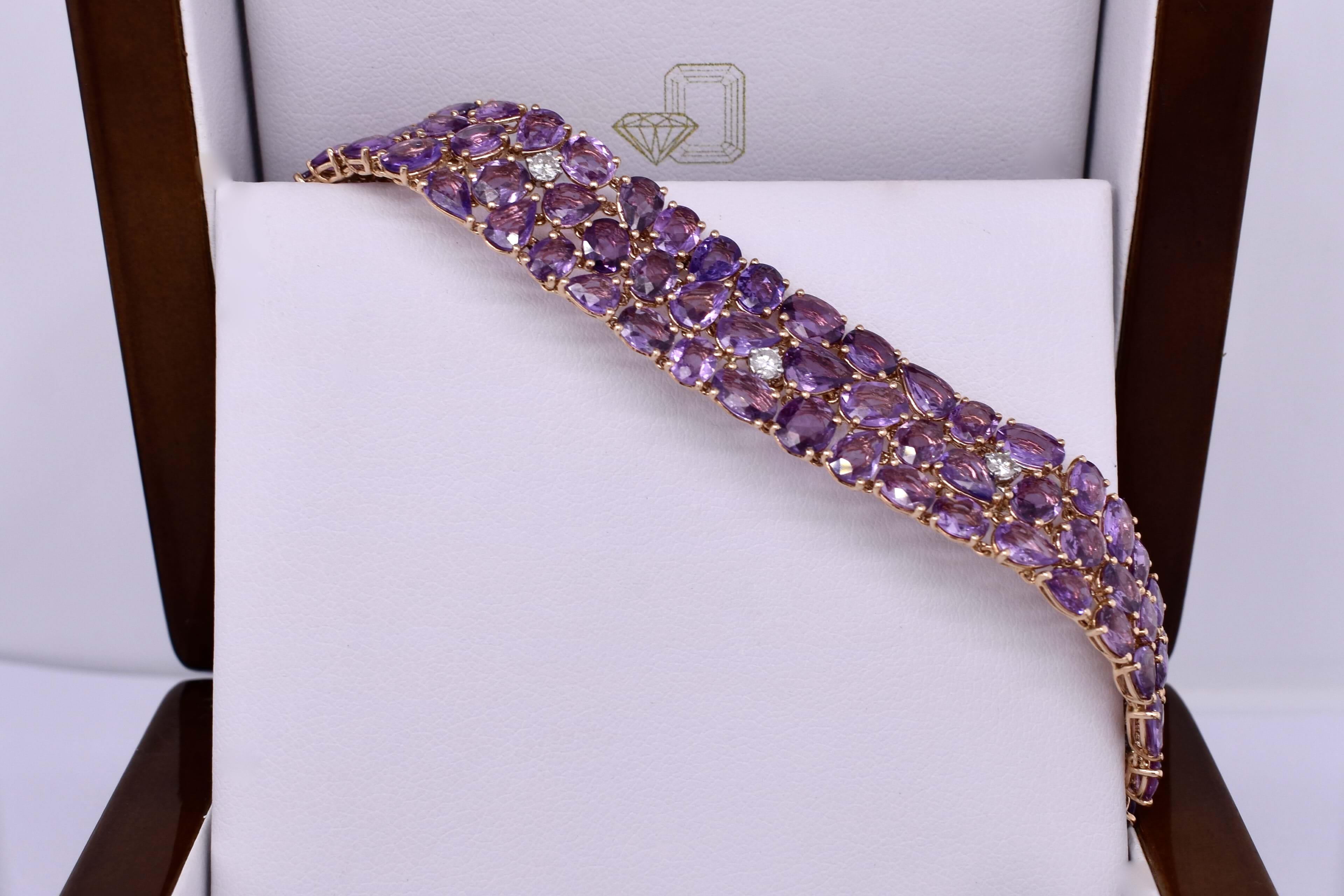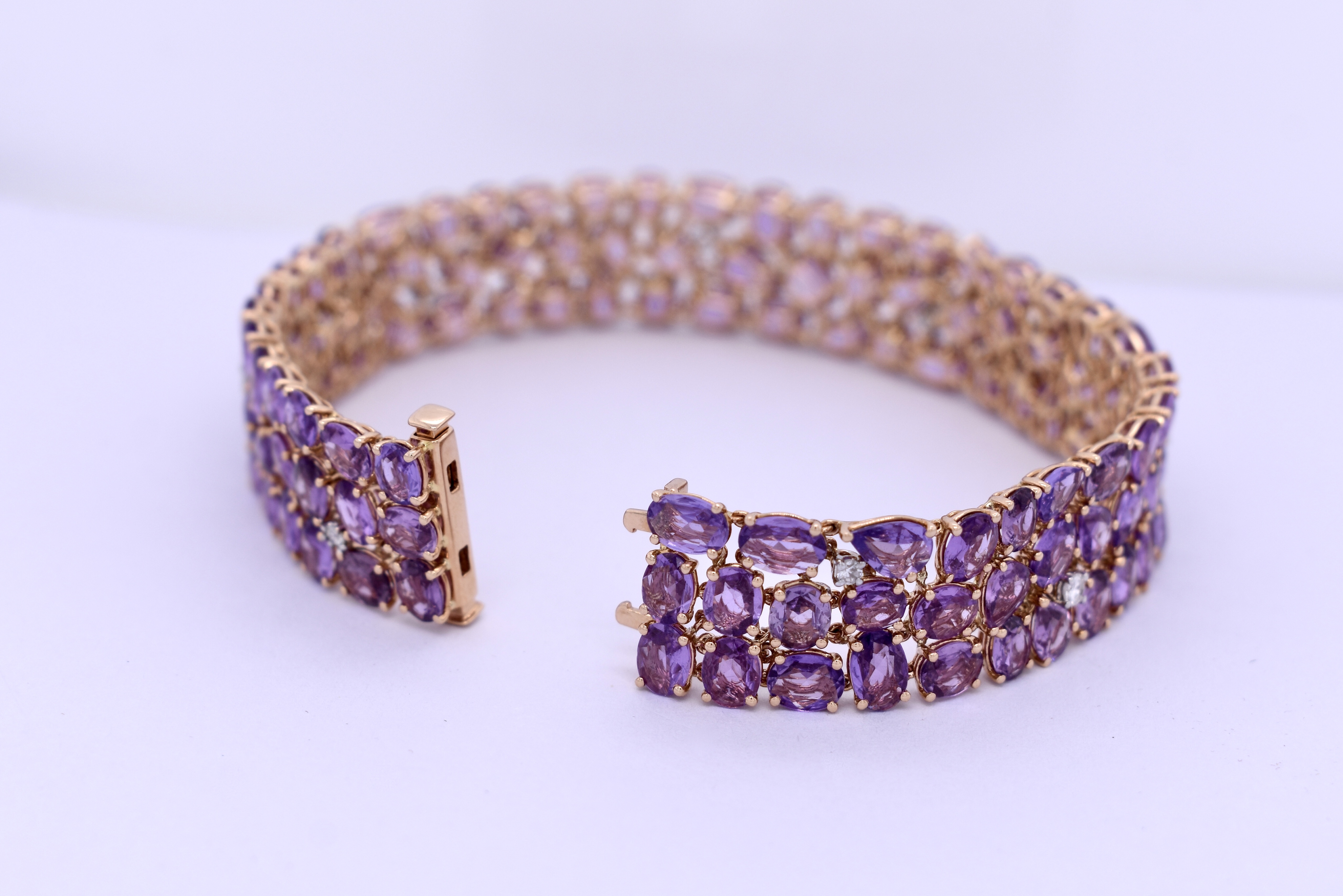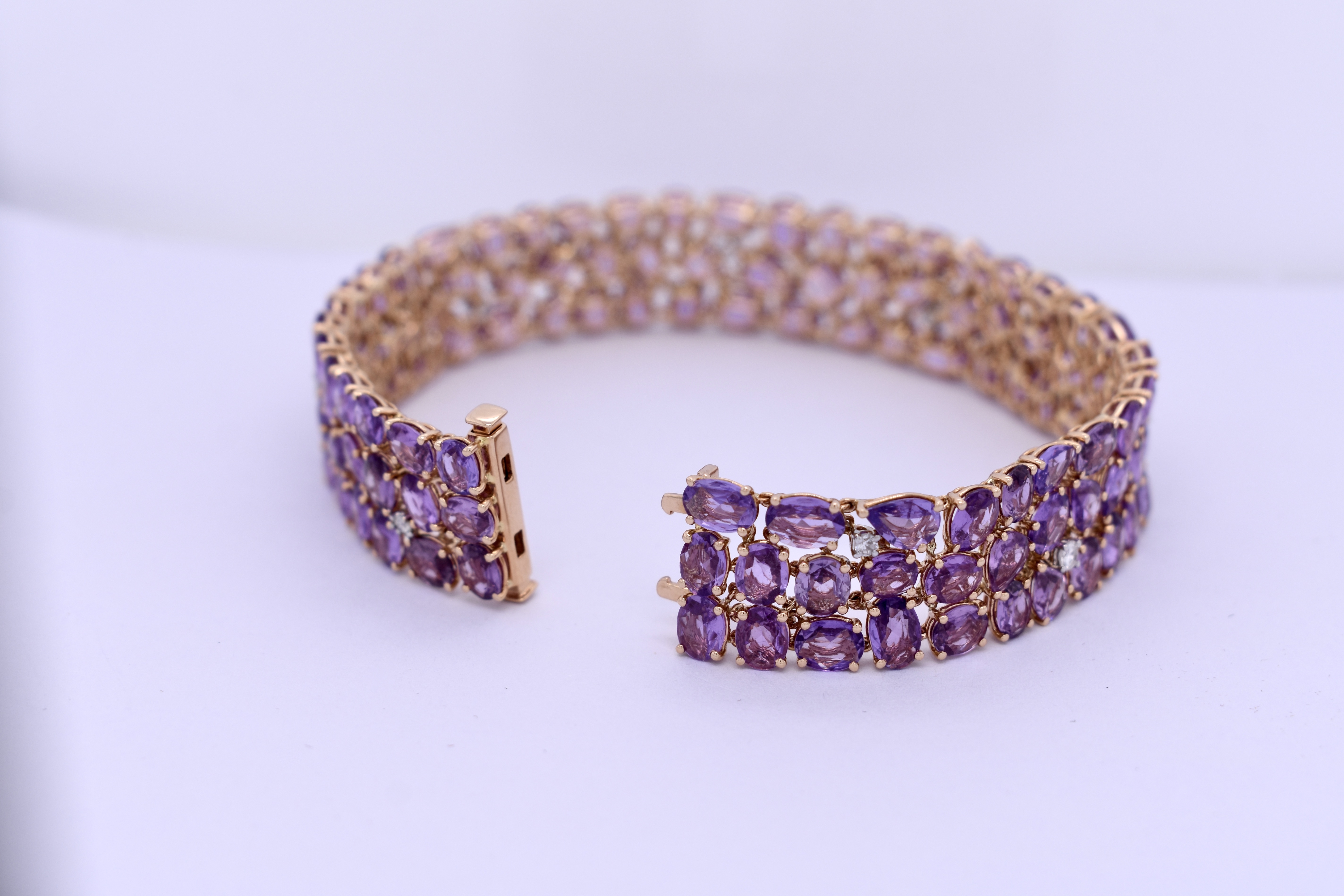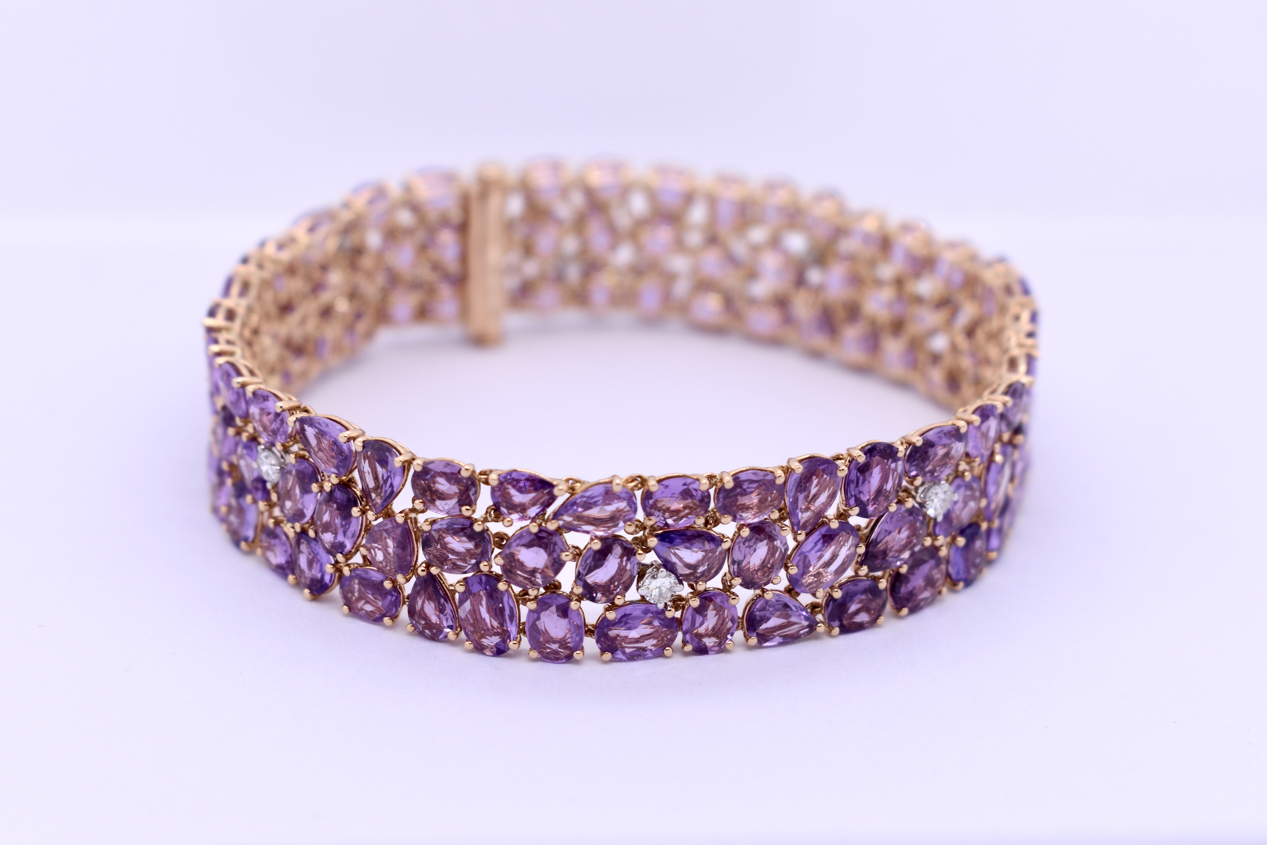 An wonderful display of craftsmanship, this 18ct rose gold articulated bracelet is set with a cluster of purple sapphires and diamonds. With a total of 114 oval and pear shaped diamonds totalling 36.82ct and 8 round brilliant cut 1.7-2.7mm diamonds scattered throughout, equalling 0.44ct H VS-SI. Bracelet measures 18.5cm long and 14mm wide and is finished with an integrated box clasp. 27.99 grams. Independent Valuation Supplied