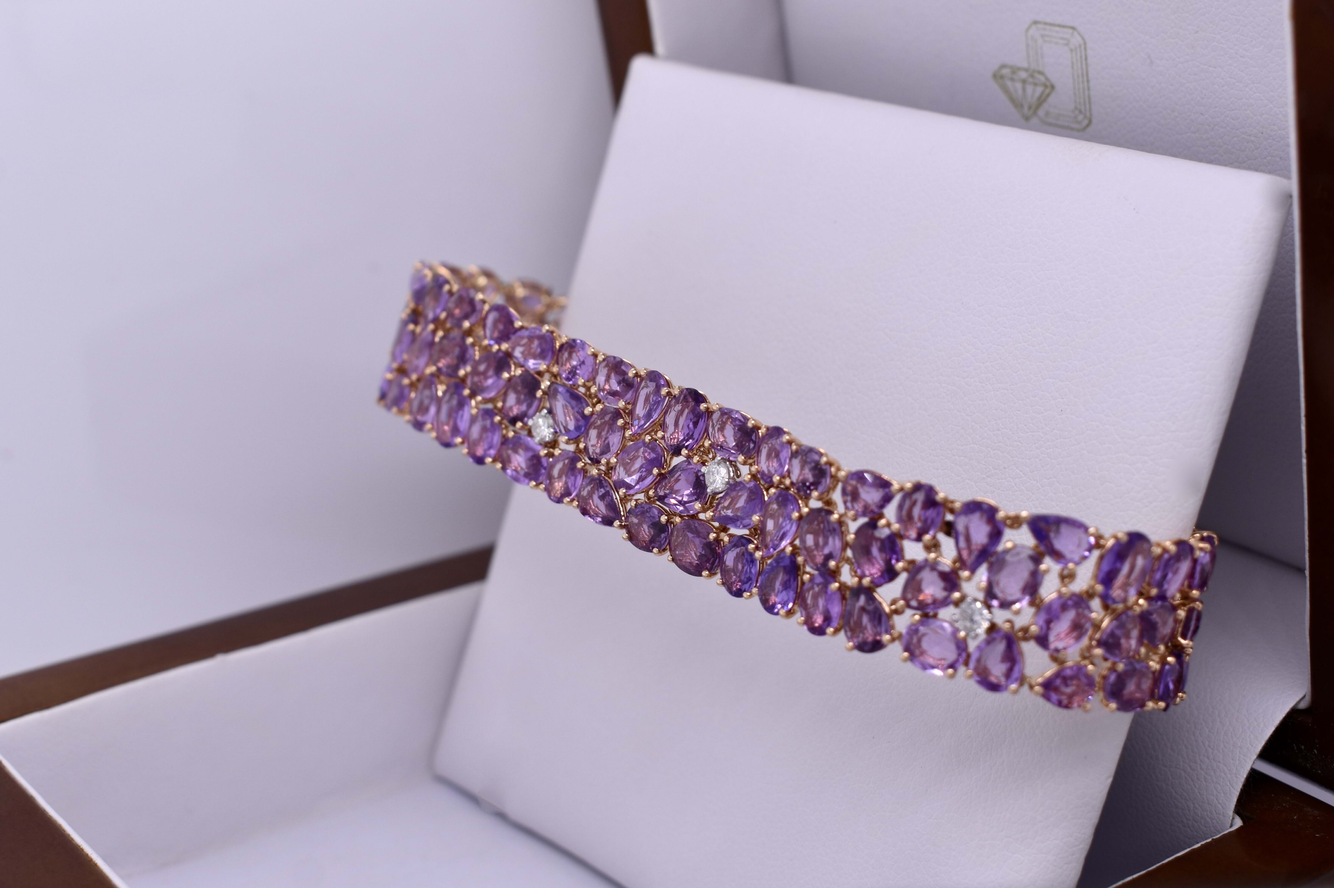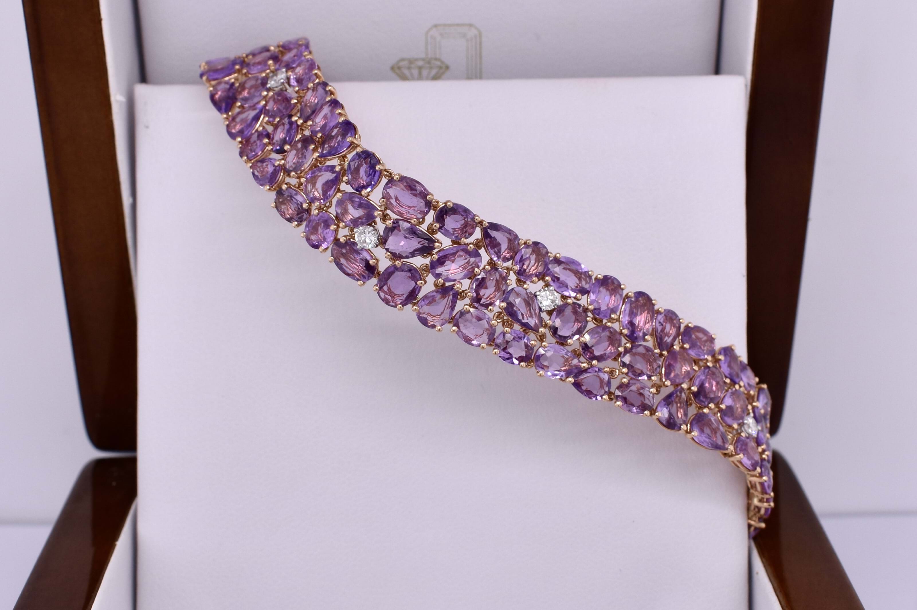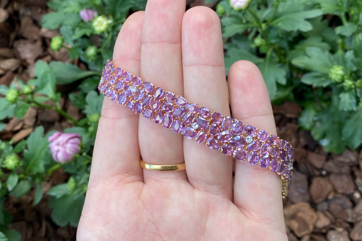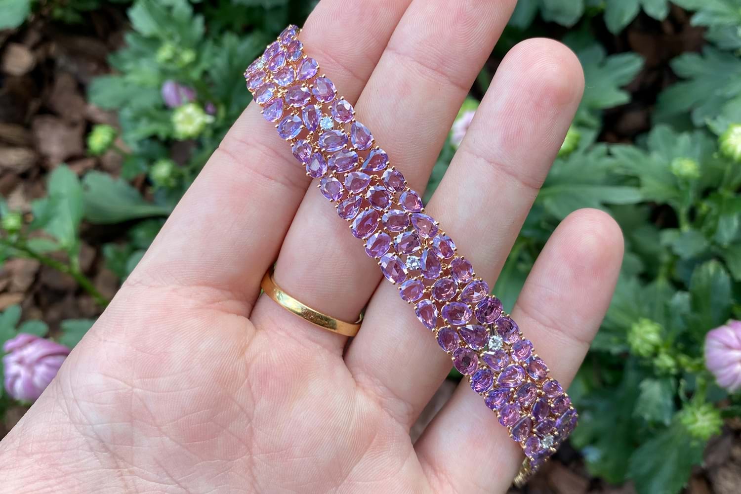 An wonderful display of craftsmanship, this 18ct rose gold articulated bracelet is set with a cluster of purple sapphires and diamonds. With a total of 114 oval and pear shaped diamonds totalling 36.82ct and 8 round brilliant cut 1.7-2.7mm diamonds scattered throughout, equalling 0.44ct H VS-SI. Bracelet measures 18.5cm long and 14mm wide and is finished with an integrated box clasp. 27.99 grams. Independent Valuation Supplied