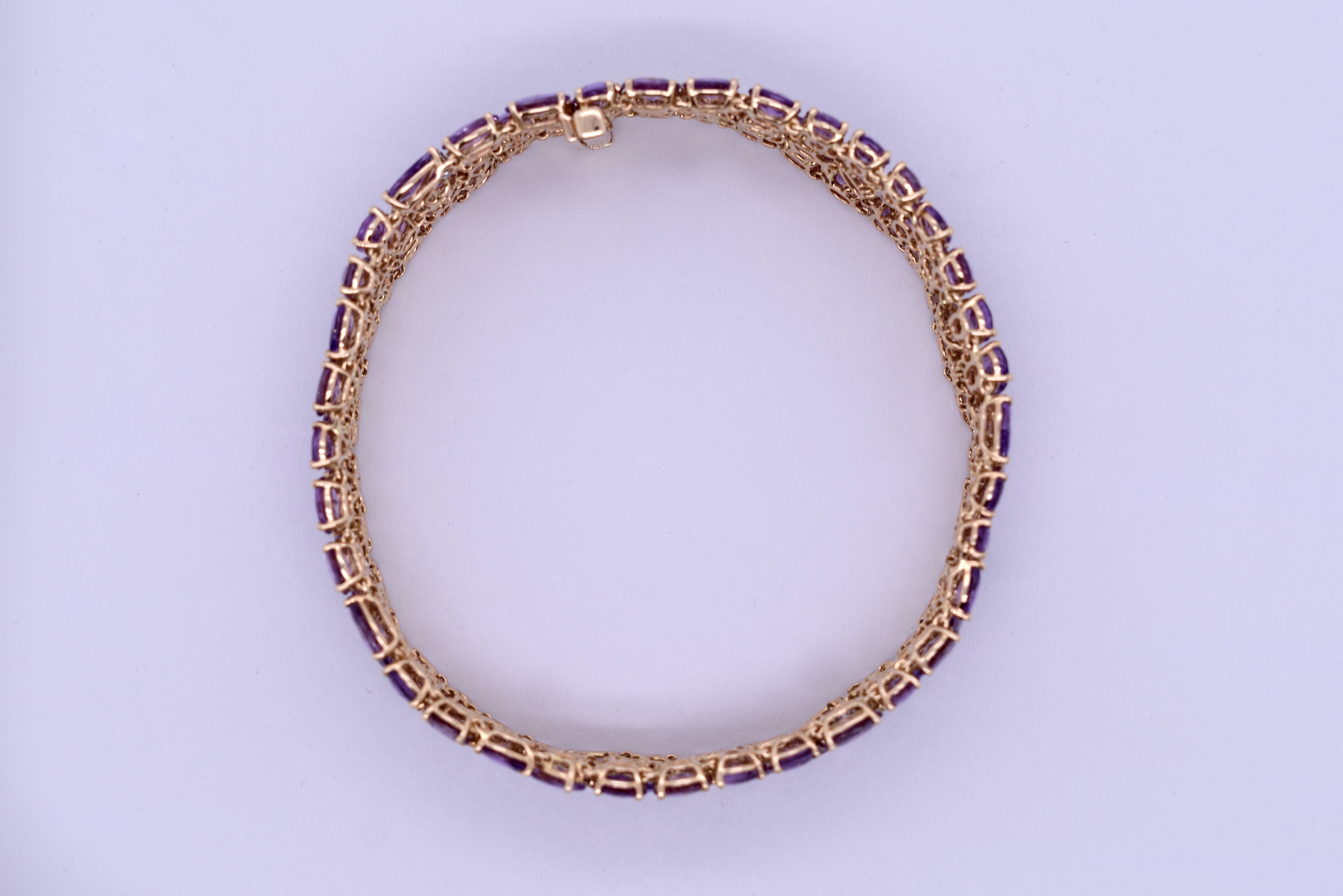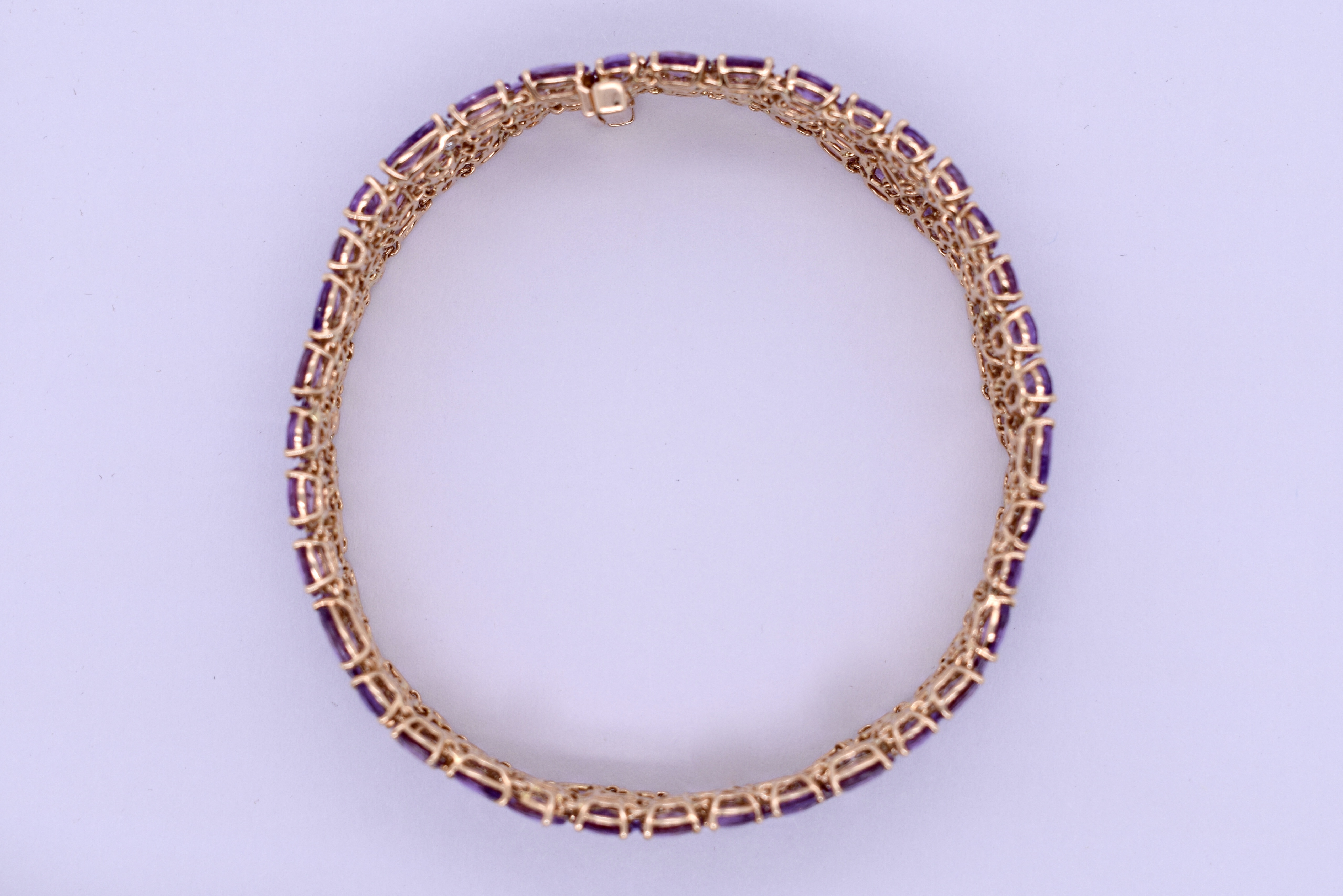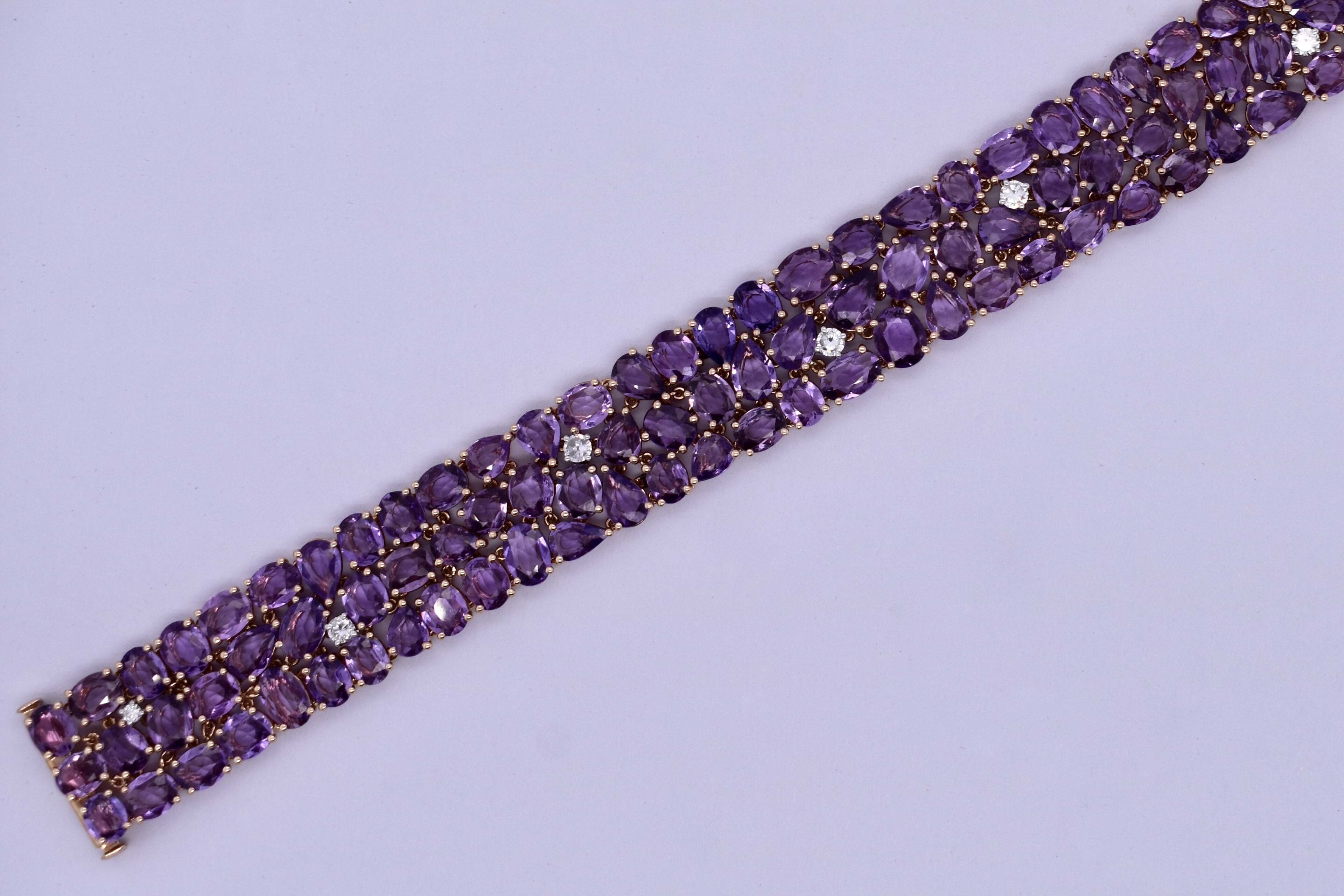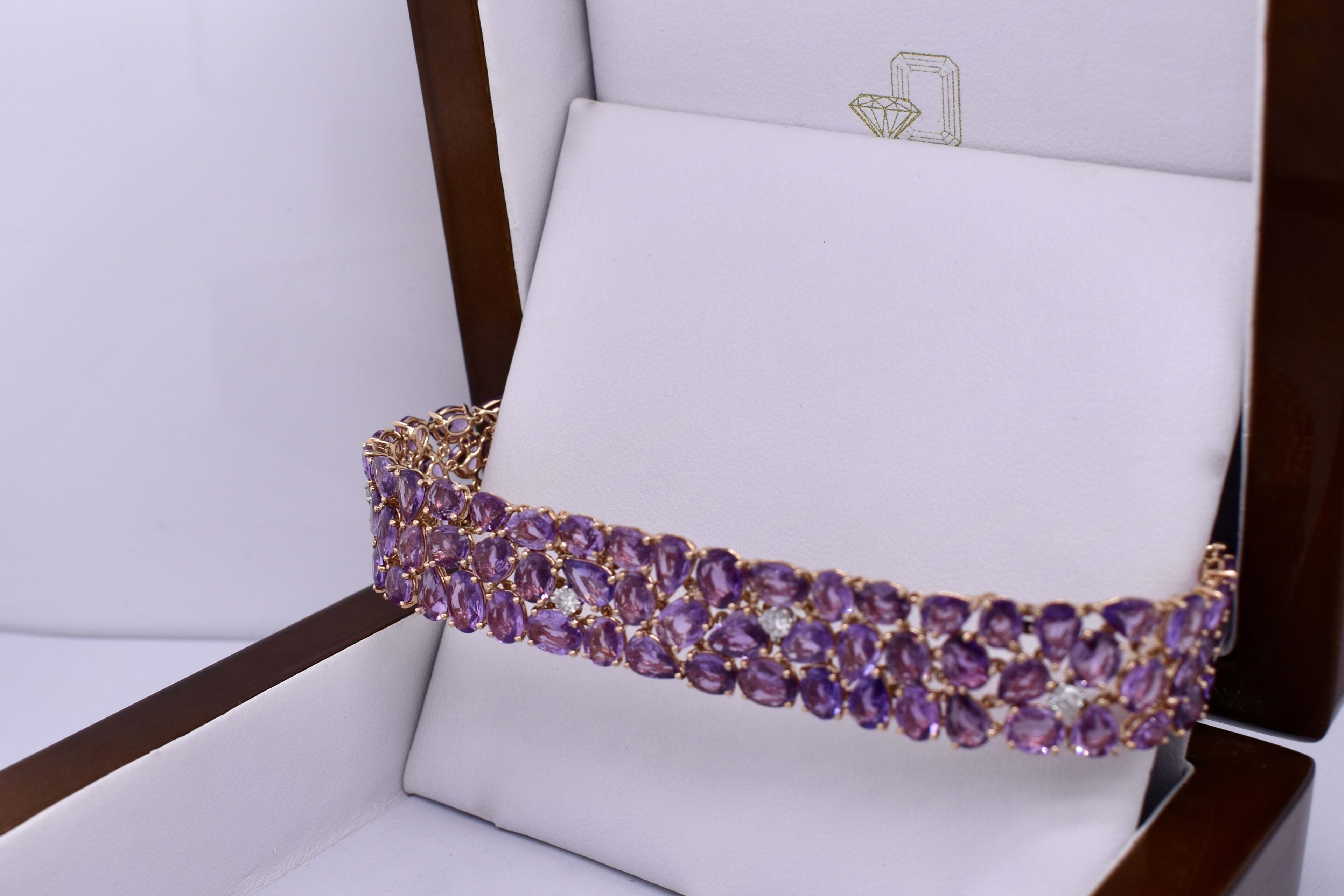 An wonderful display of craftsmanship, this 18ct rose gold articulated bracelet is set with a cluster of purple sapphires and diamonds. With a total of 114 oval and pear shaped diamonds totalling 36.82ct and 8 round brilliant cut 1.7-2.7mm diamonds scattered throughout, equalling 0.44ct H VS-SI. Bracelet measures 18.5cm long and 14mm wide and is finished with an integrated box clasp. 27.99 grams. Independent Valuation Supplied