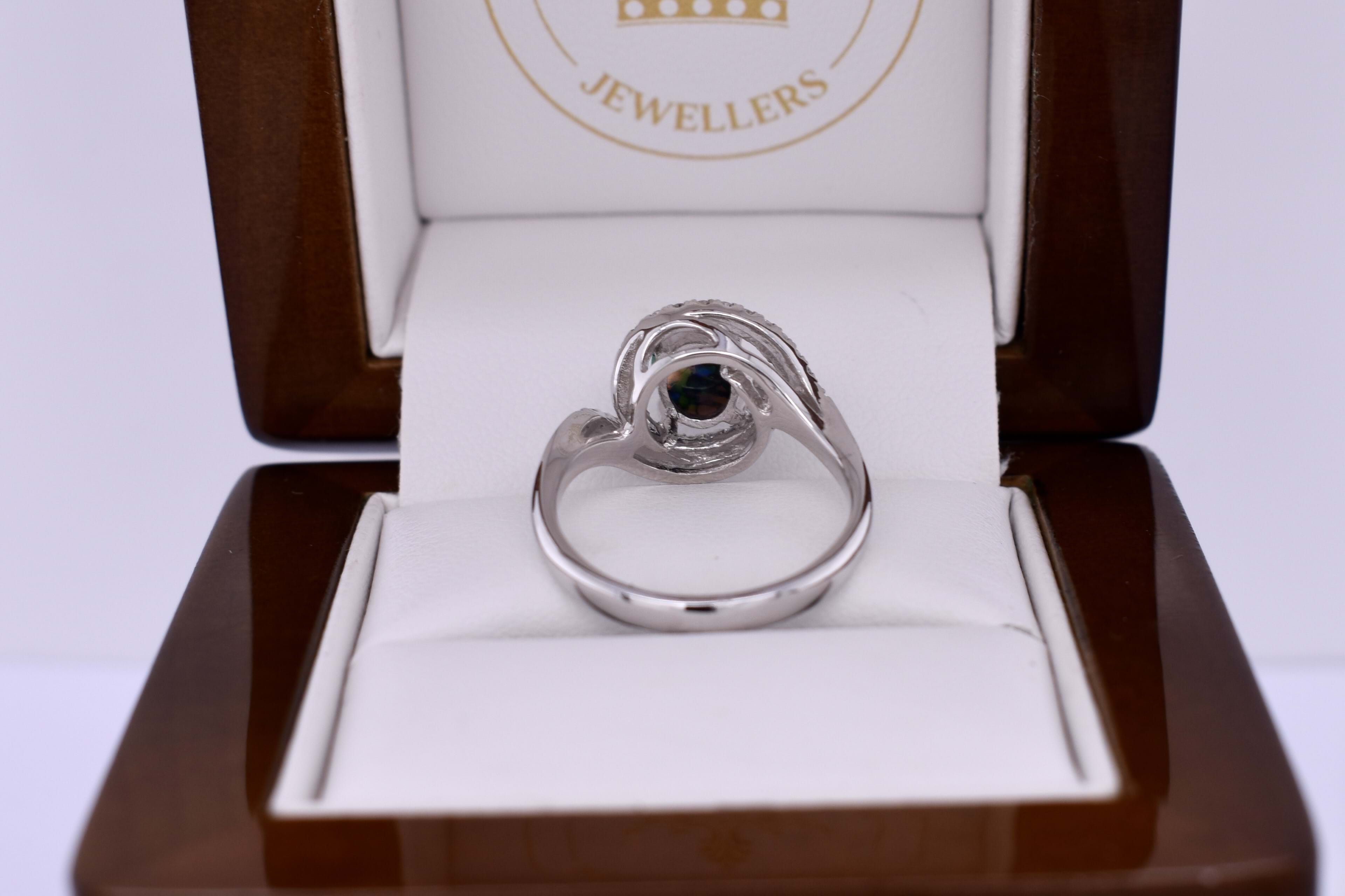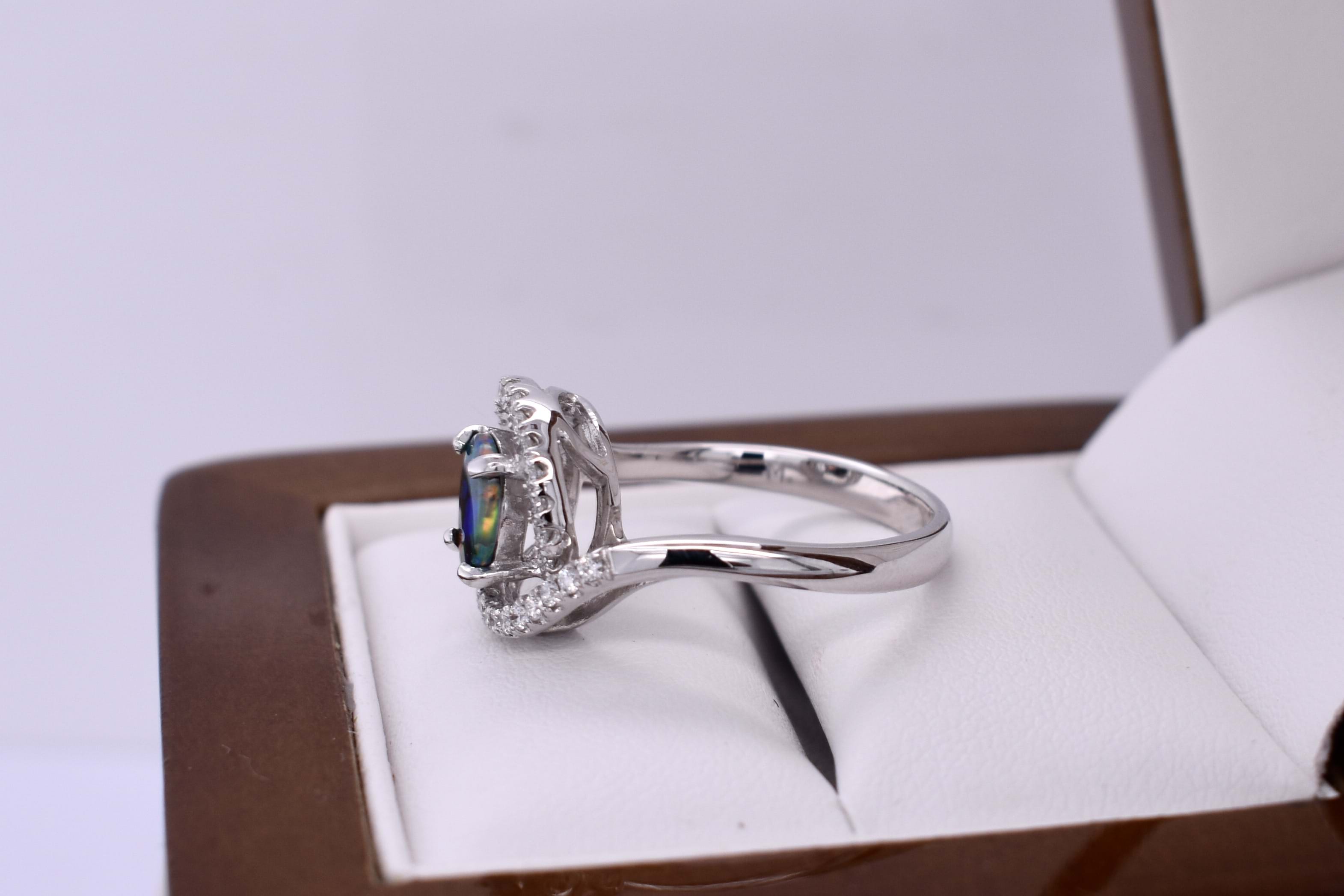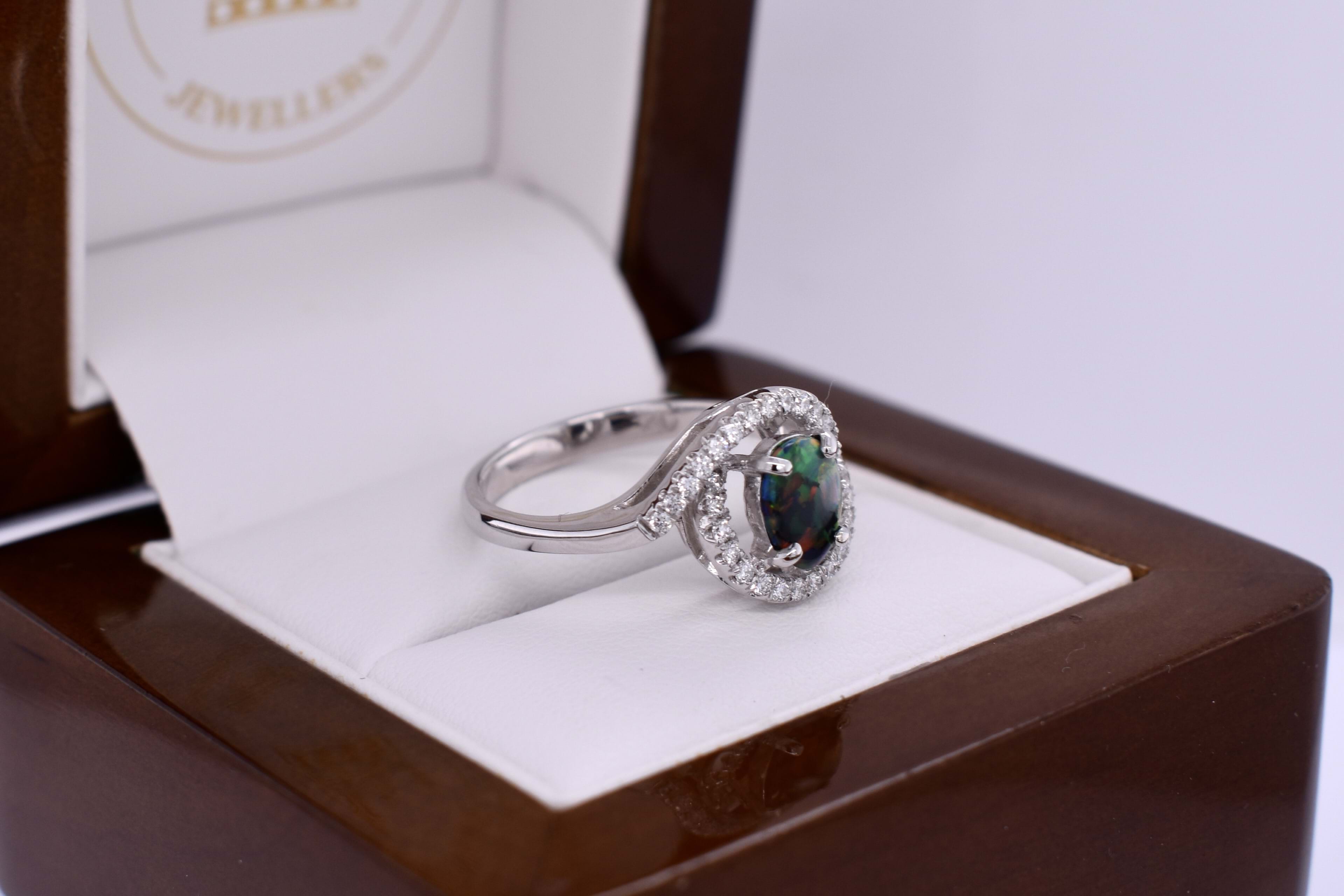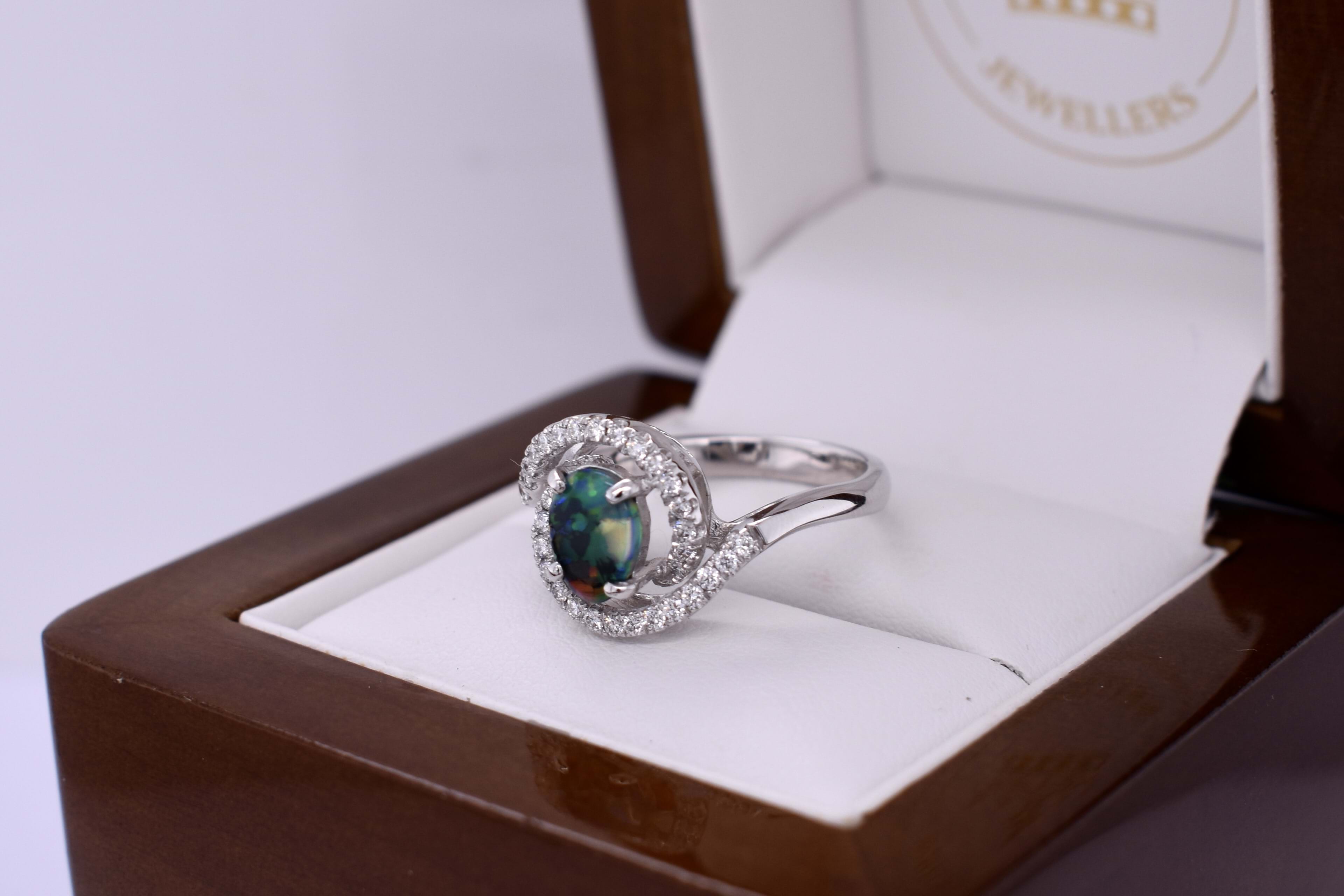 This unique ring is crafted in 18ct white gold and centres around a 0.38ct Lightning Ridge crystal opal. The opal shows bright flashes of orange, blue and green throughout. The opal is complimented by a swirl halo surround consisting of 32 round brilliant cut diamonds equalling 0.28ct G VS. Finger size M+. Independent valuation supplied.