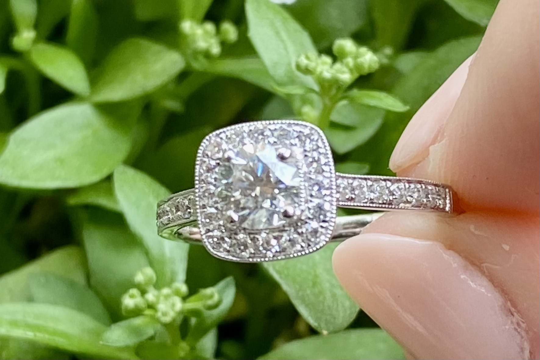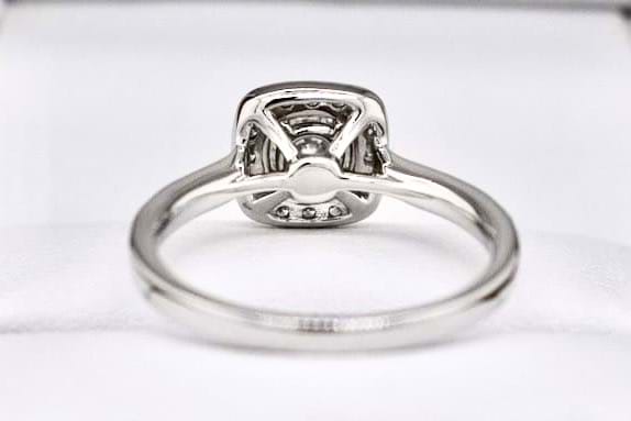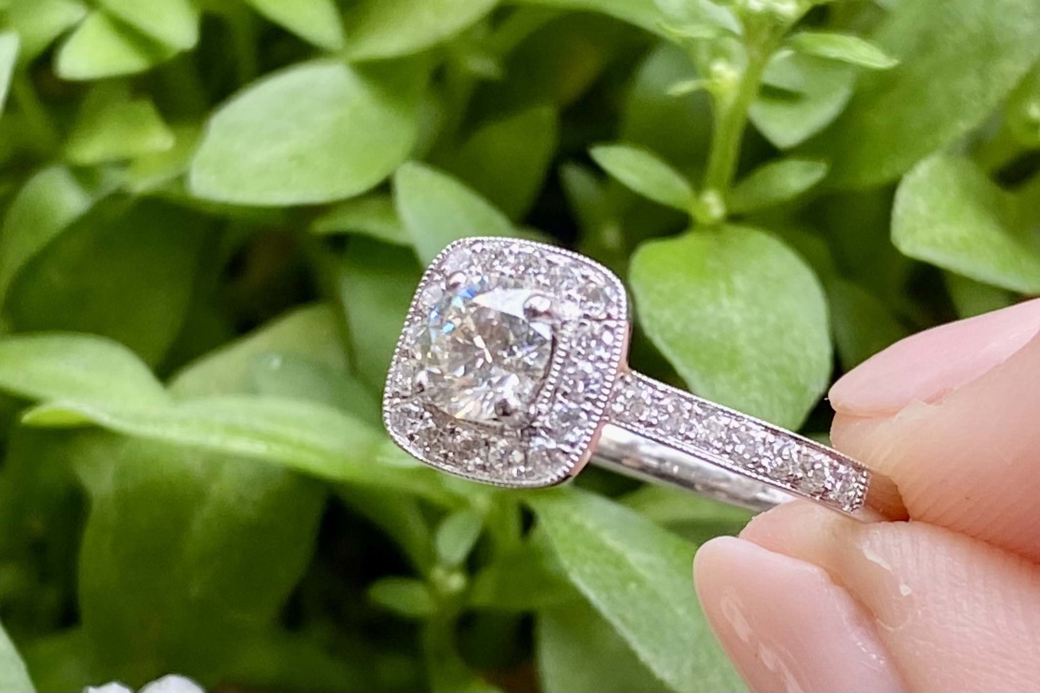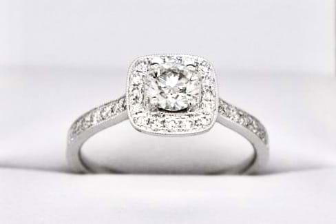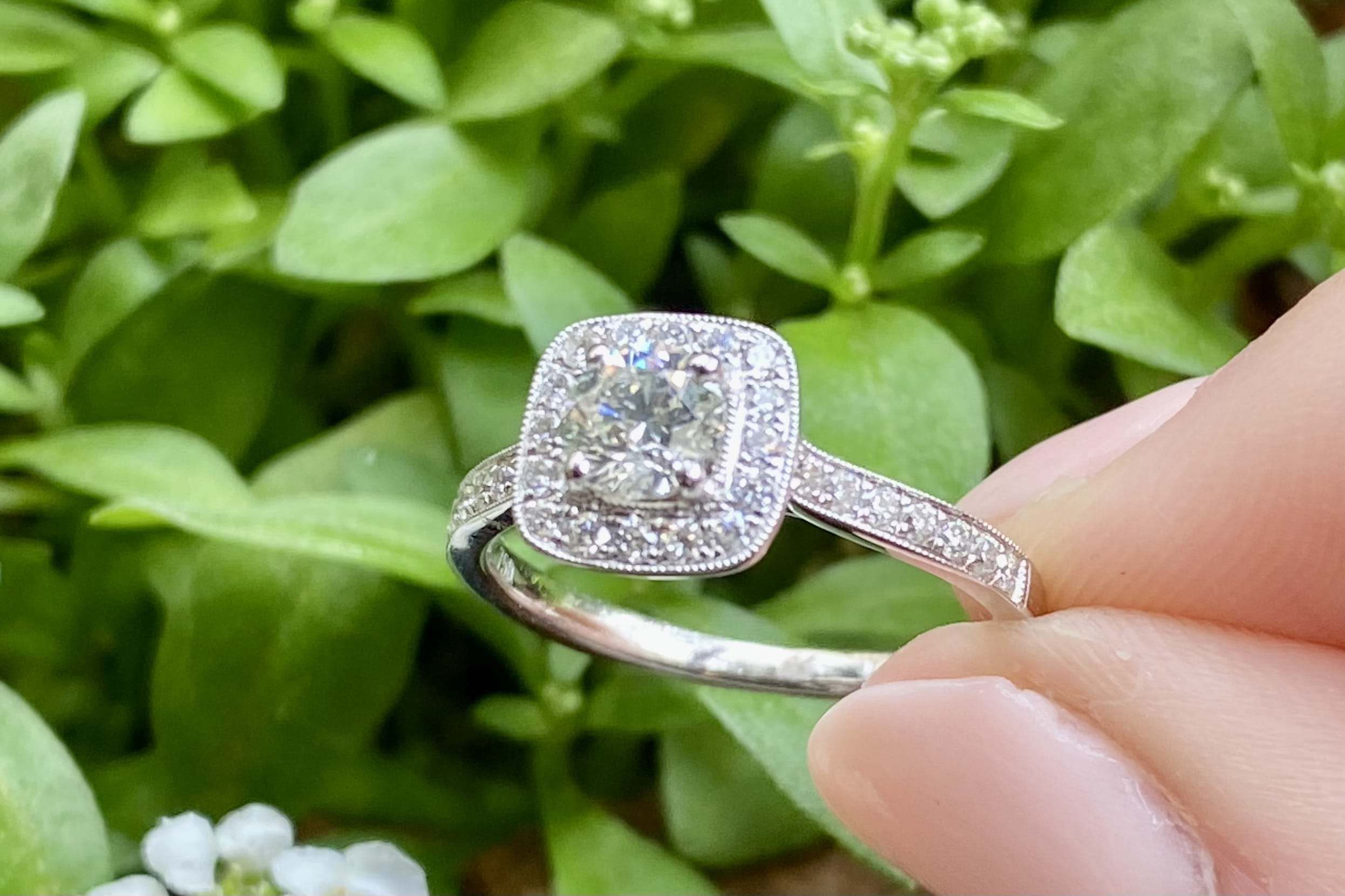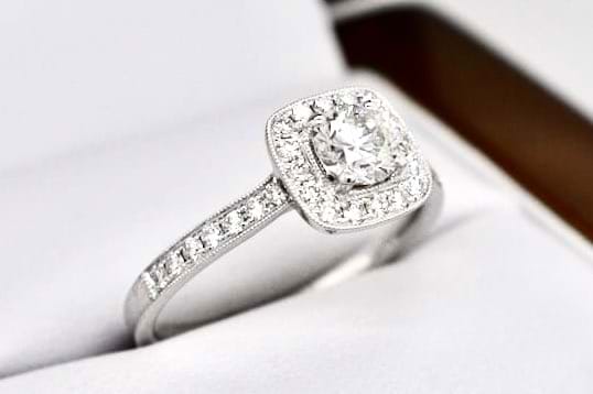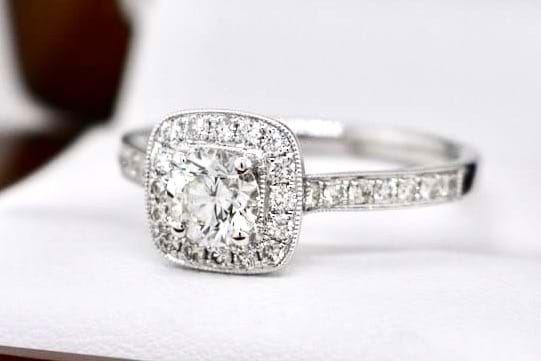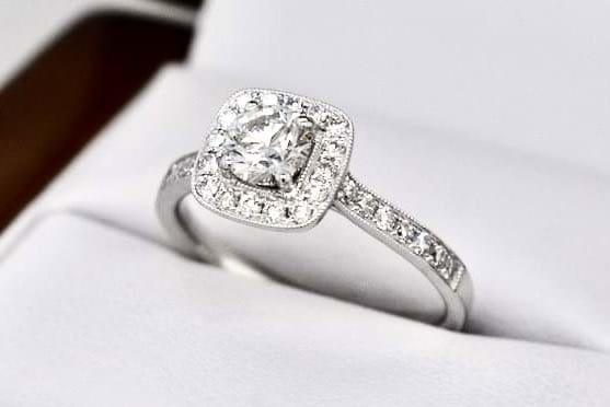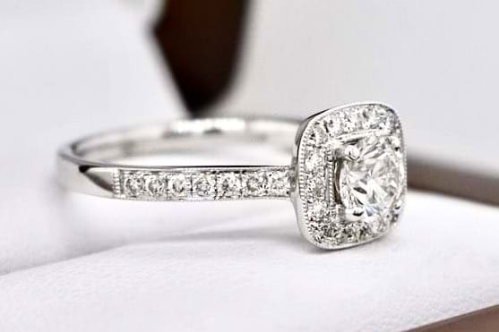 Scintillating 0.50ct G colour, SI2 clarity round brilliant cut diamond set into an elegant 18ct white gold grain set cushion shape halo ring with diamond set shoulders. The 30 sparkling round brilliant cut diamonds in the halo and shoulders total 0.34cts G/SI, the ring has been designed to sit perfectly with wedding bands-plain or diamond set. Independent Valuation Supplied. Finger size M+