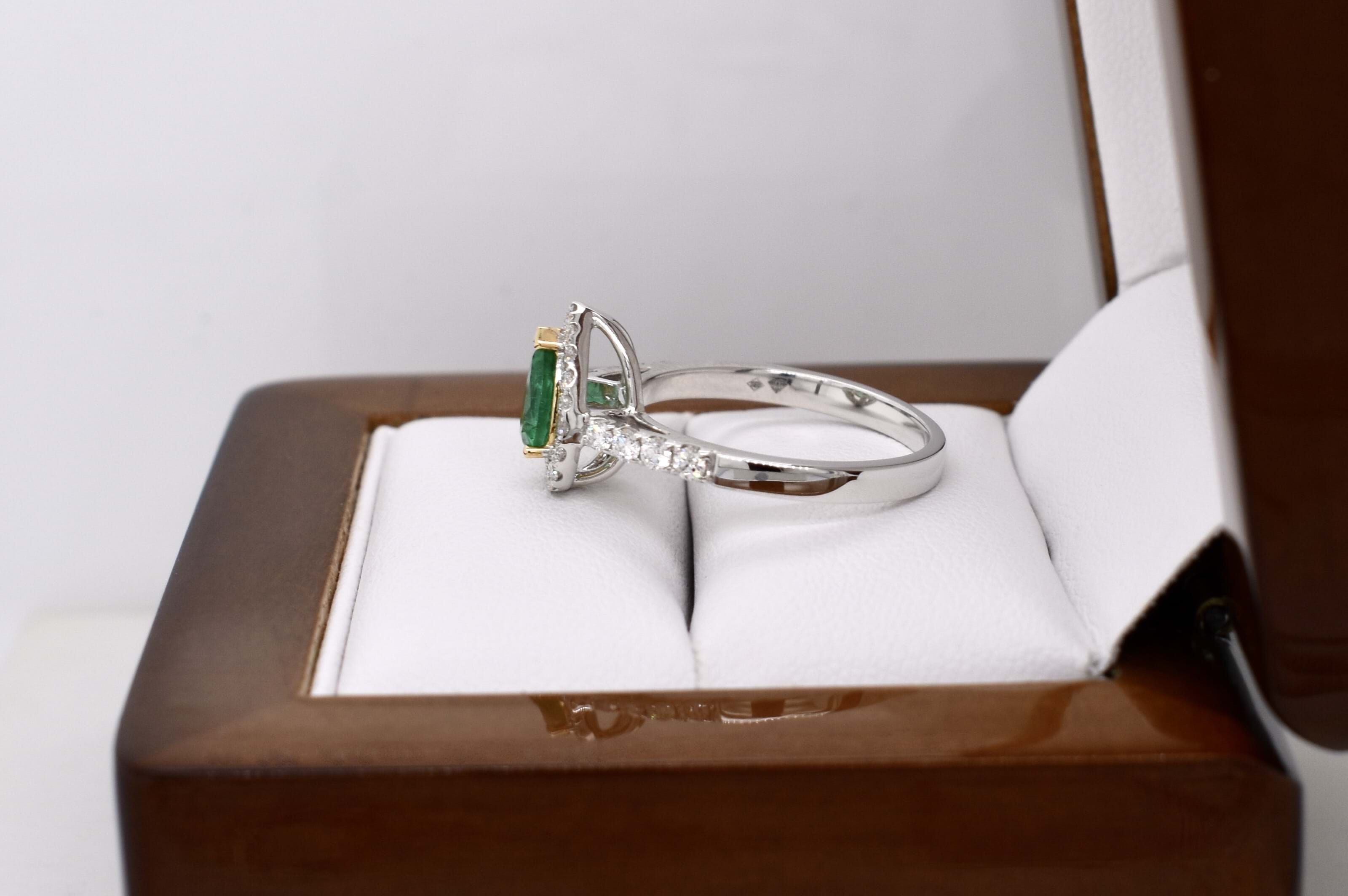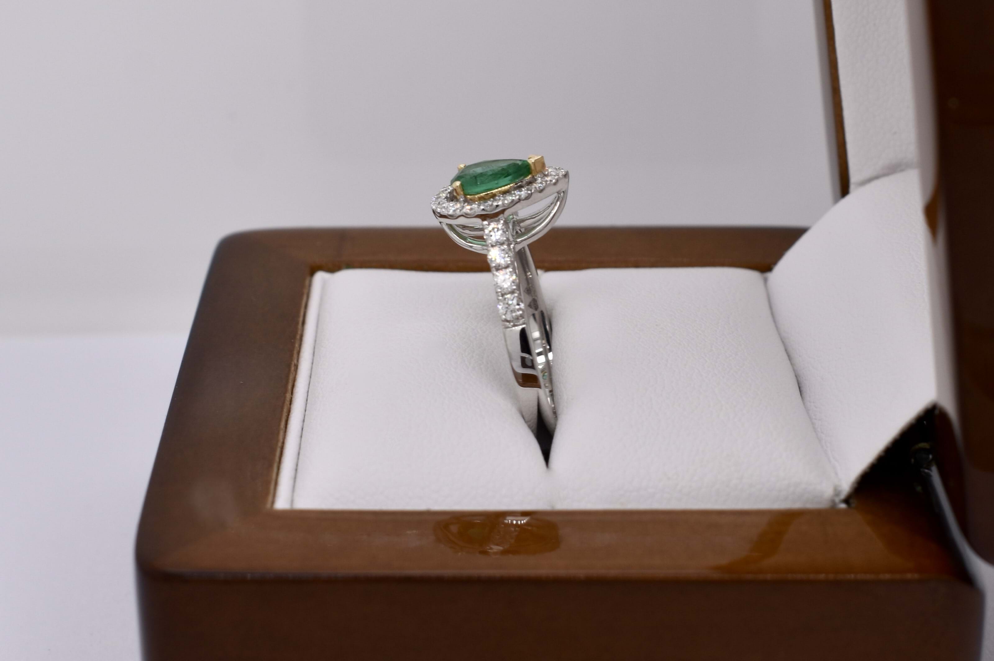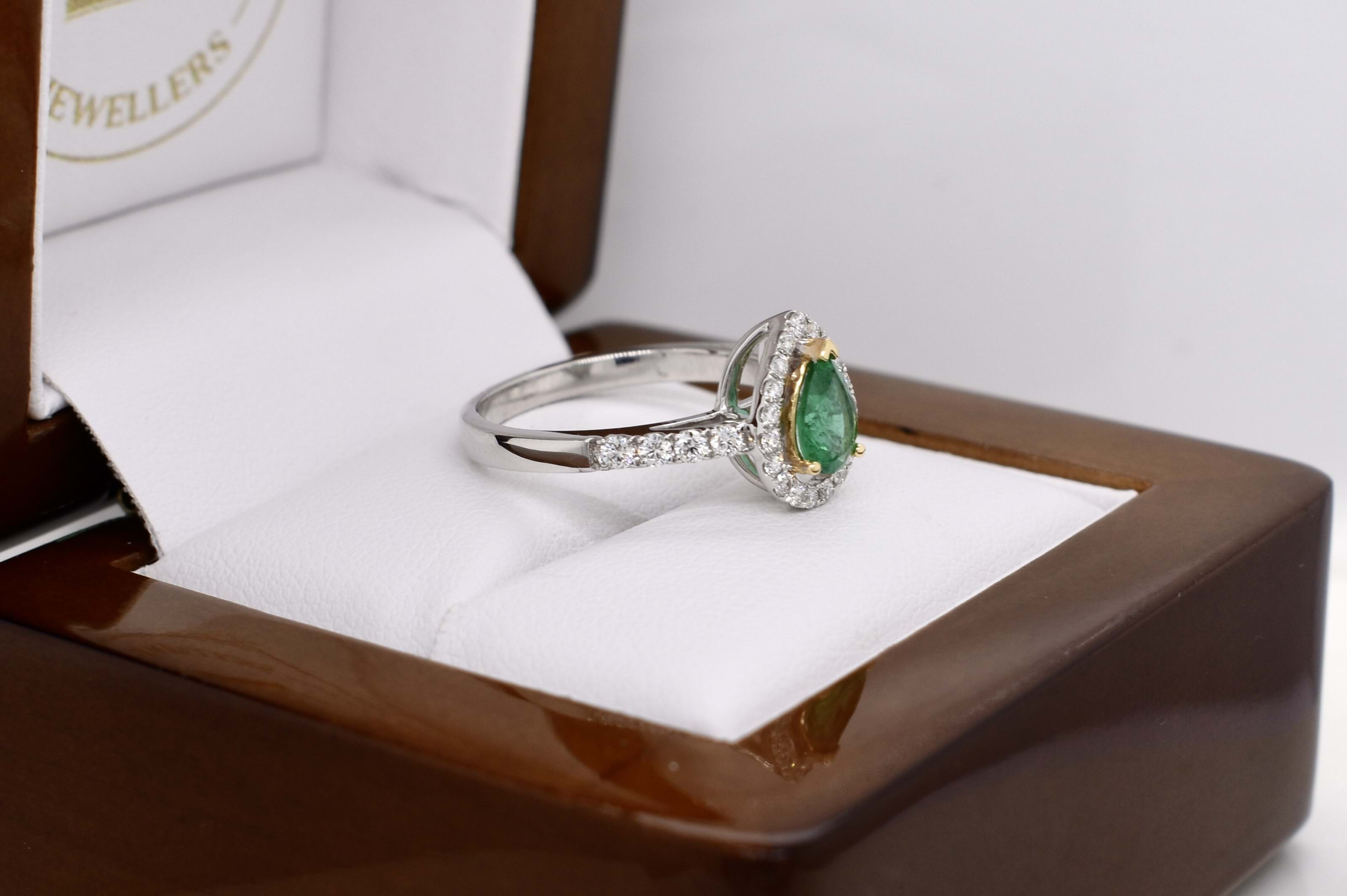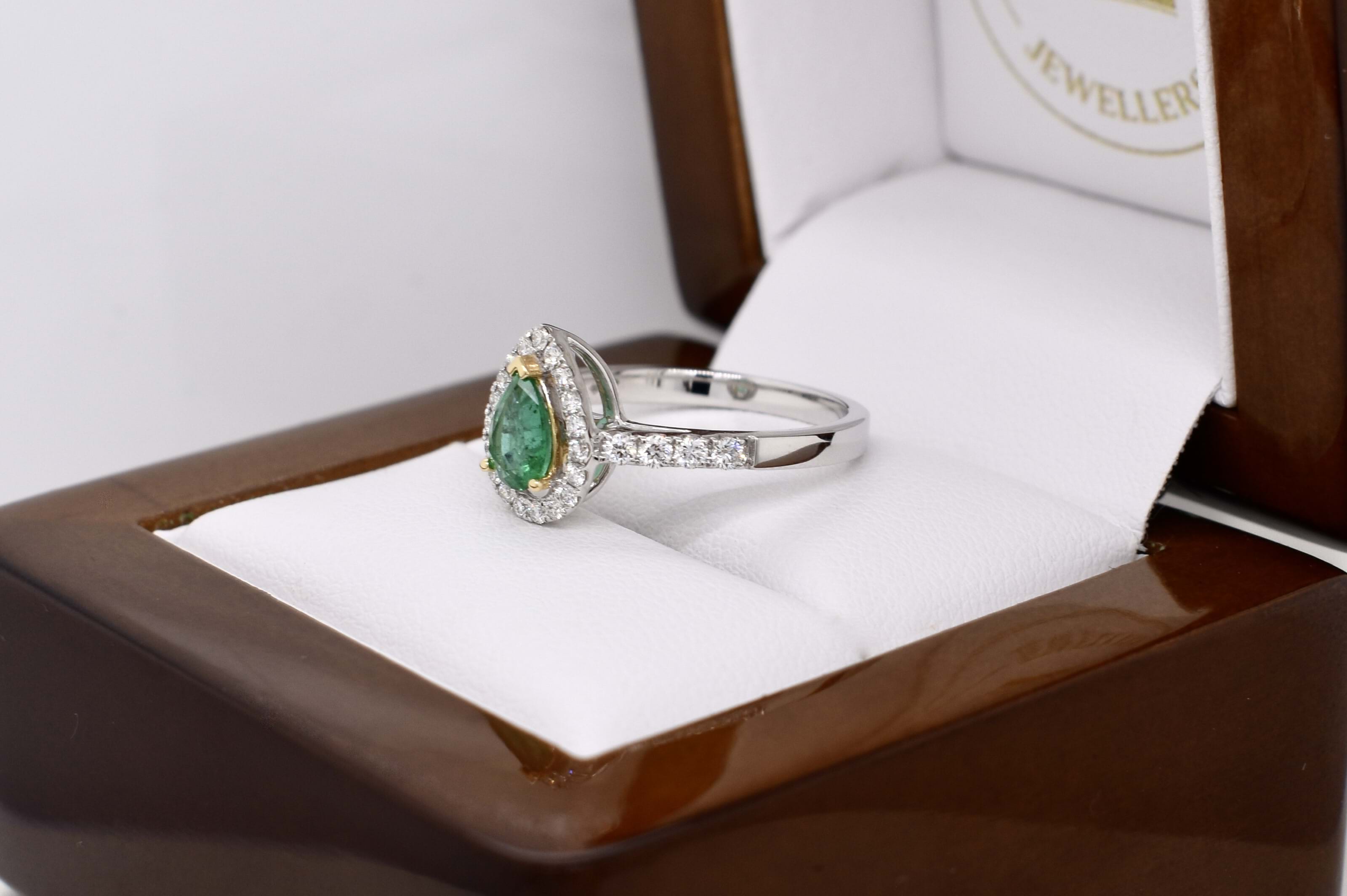 18ct white gold pearshape halo ring featuring a stunning, mid green, 0.52ct emerald yellow gold cap and two claw set with a sparkling surround of round brilliant cut diamonds in the halo and down the shoulders totalling 0.38ct FGVS-SI. The ring is designed to sit beautifully as a stand alone piece. Finger size M+. Independent Valuation Supplied