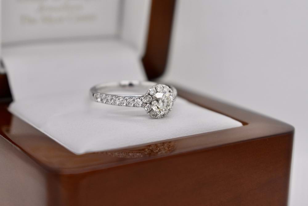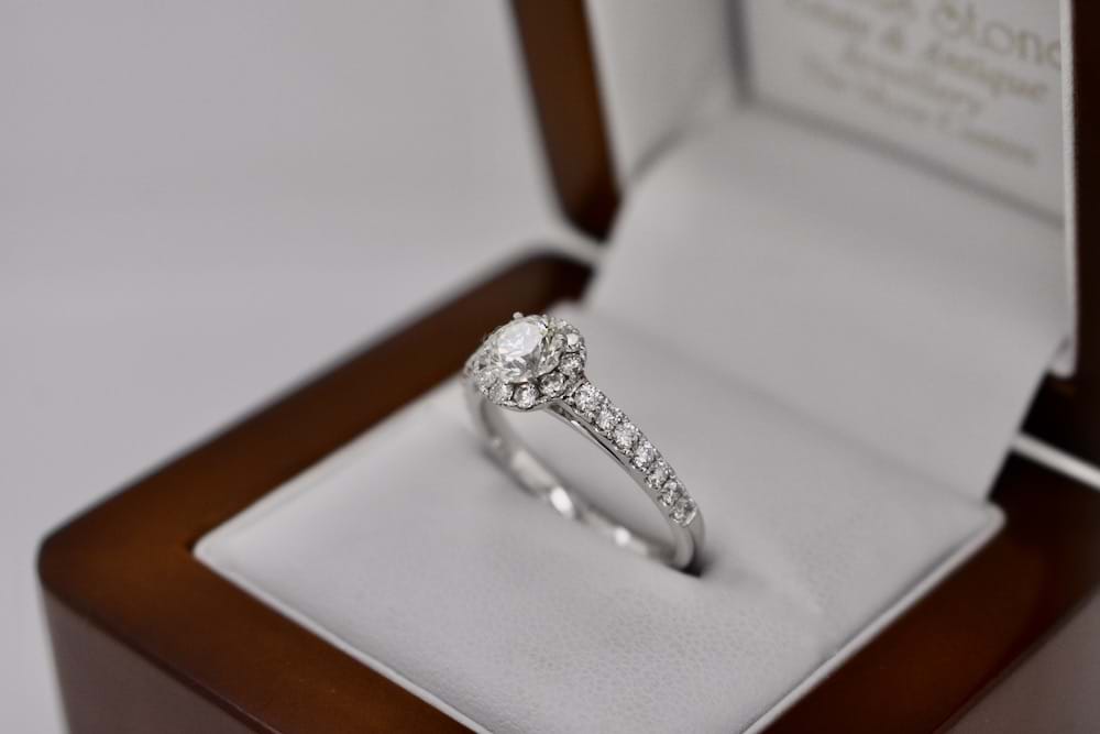 Featuring a central round brilliant cut diamond of 0.63cts I colour, SI2 clarity, four claw set into the centre of an 18ct white gold round halo design ring. The ring contains 24 sparkling round brilliant cut diamonds in the halo and down the shoulders totalling 0.52cts FG/VS and is designed to sit with wedding bands. Finger size M+ Independent Valuation Supplied