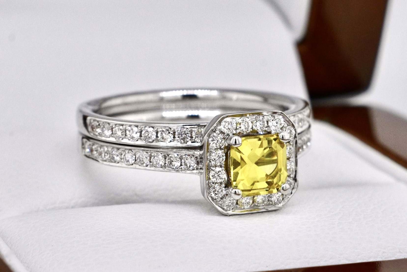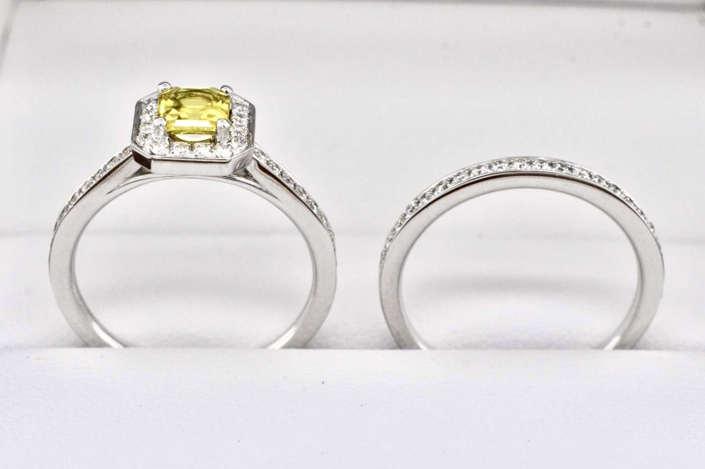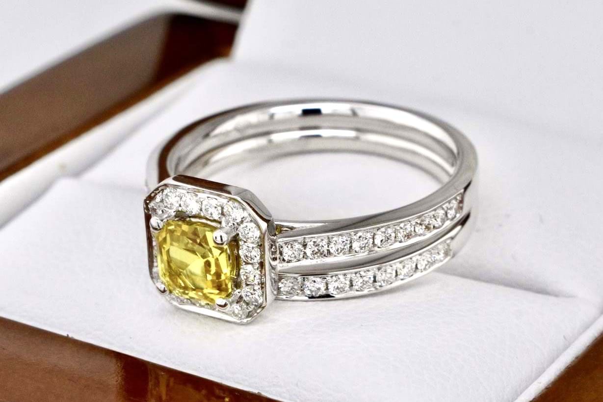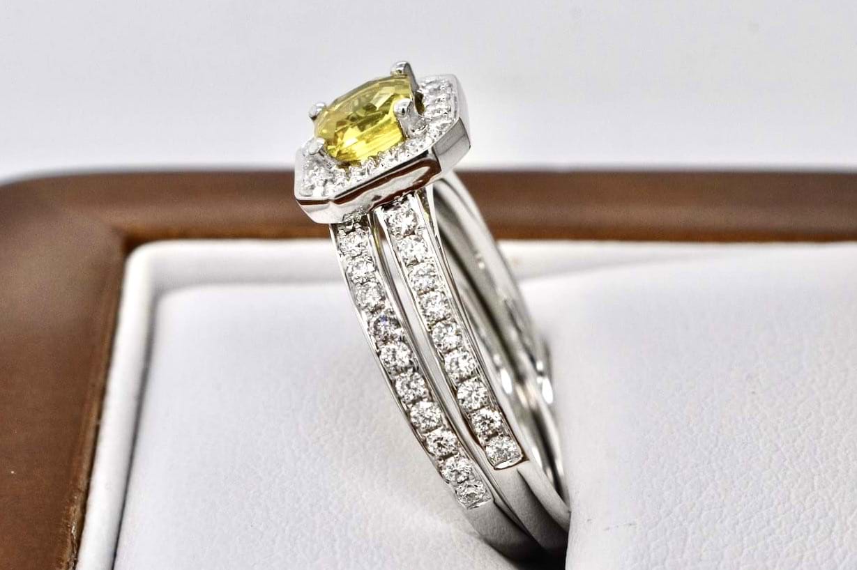 Featuring a bright, stunning, mid yellow Australian sapphire 0.64cts set into a square emerald shape diamond set halo with a matching diamond band. Crafted in 18ct white gold the main ring makes the perfect engagement ring with the band ideal for a wedding band. Total diamond content equals 0.50cts FG/VS-SI. Finger size M+. Independent Valuation Supplied