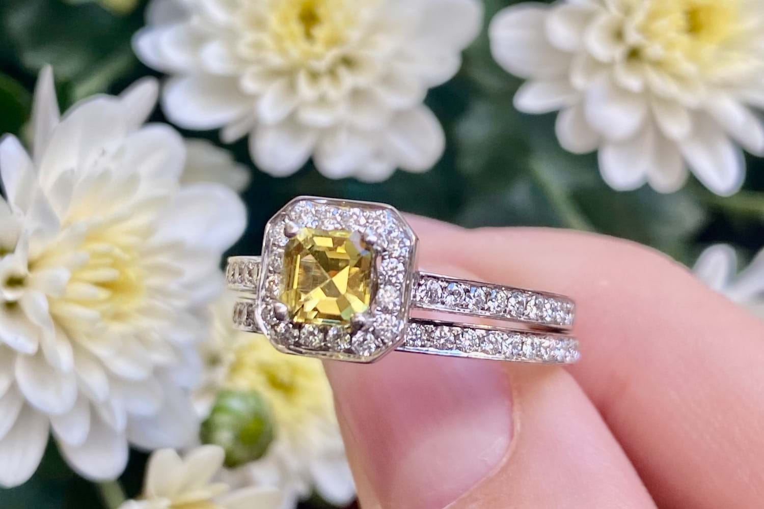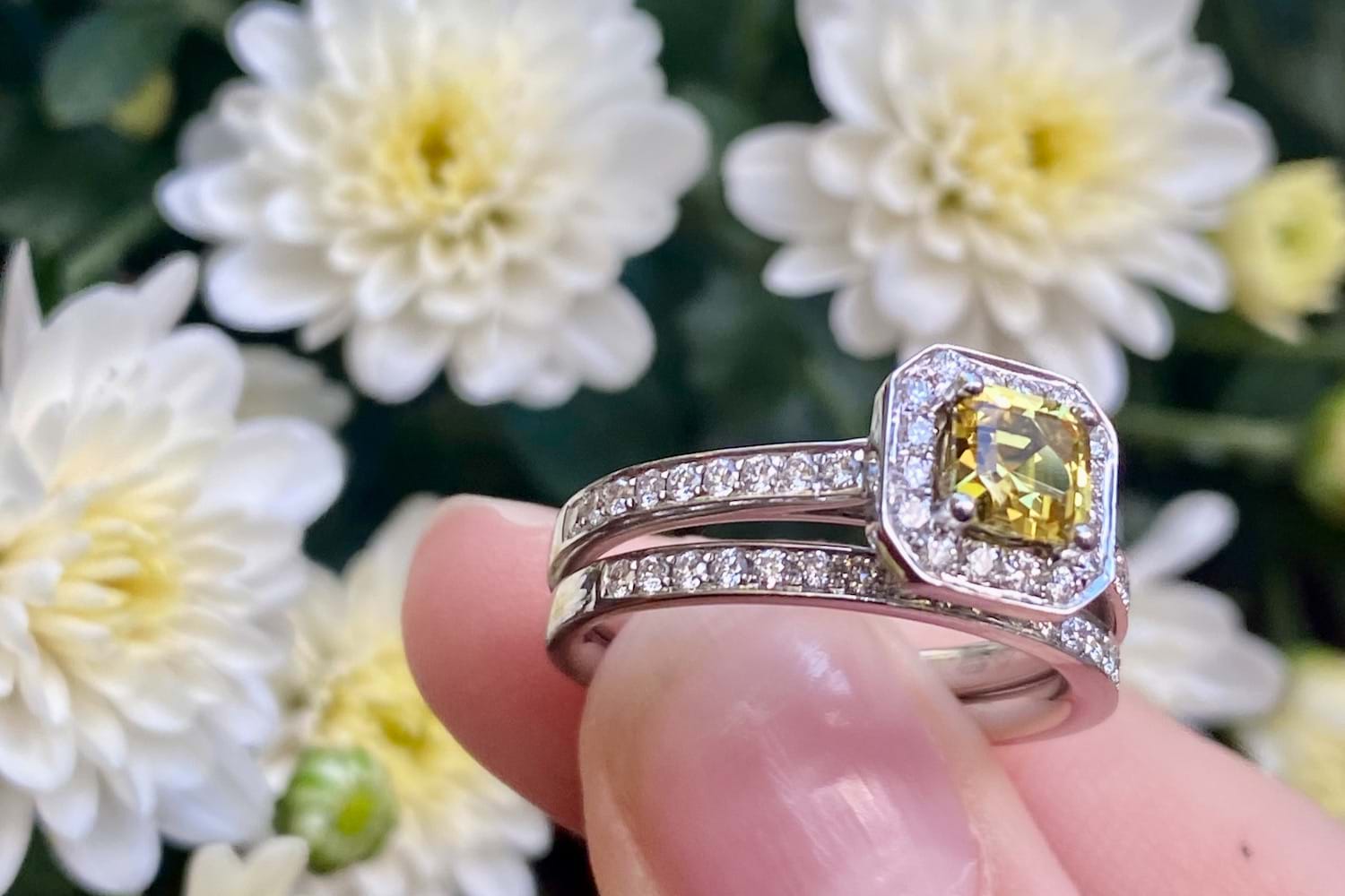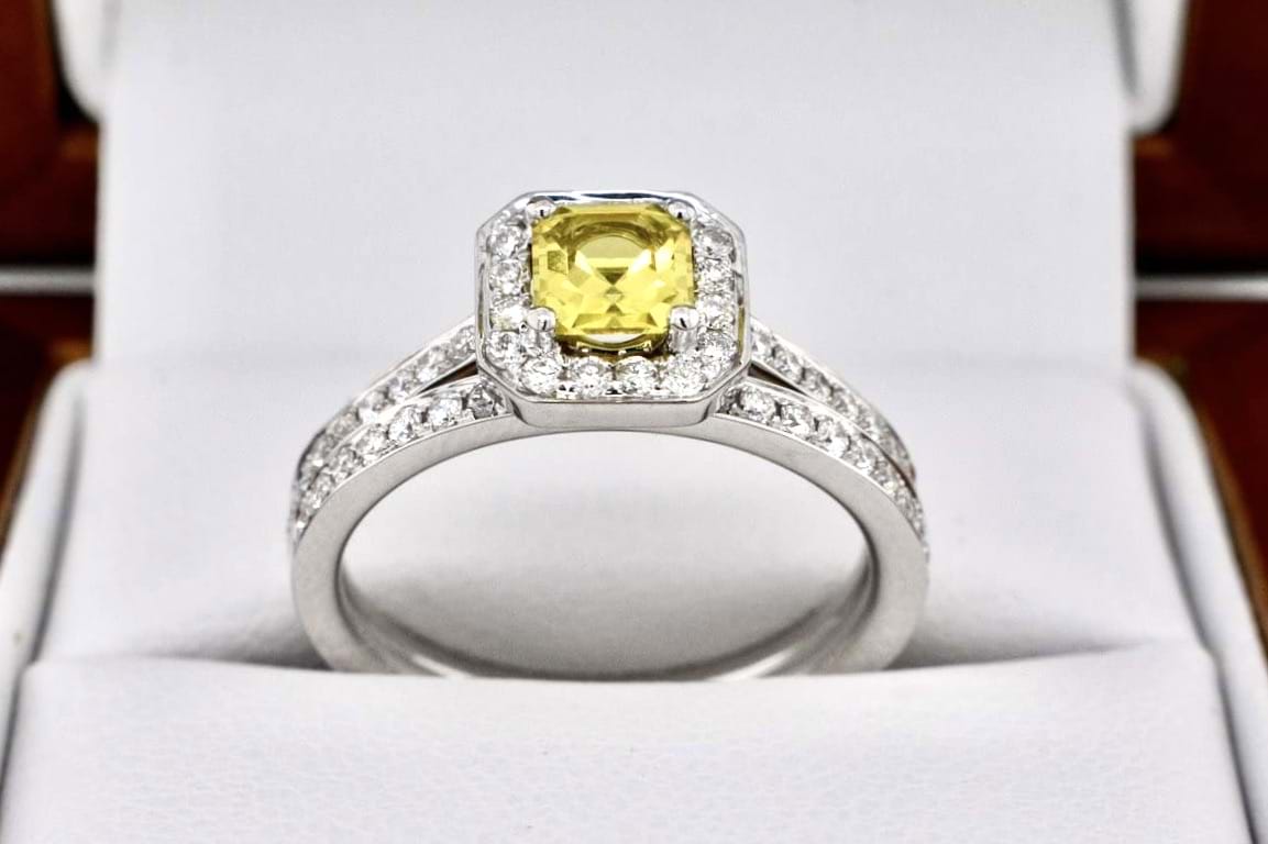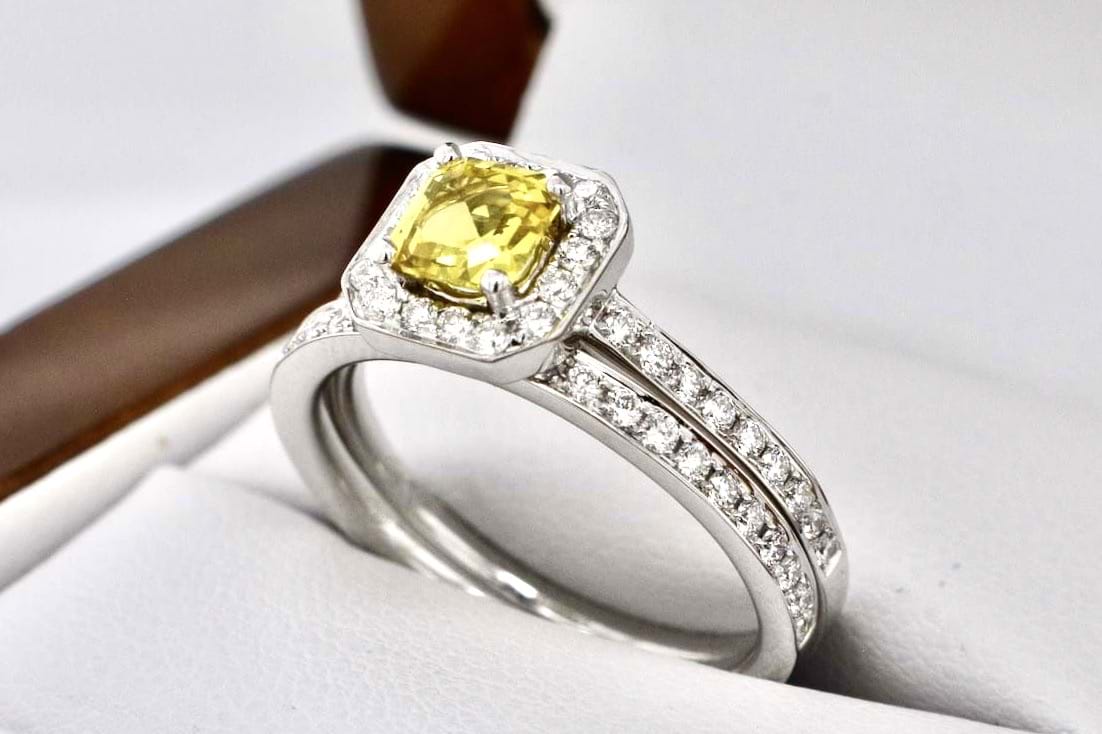 Featuring a bright, stunning, mid yellow Australian sapphire 0.64cts set into a square emerald shape diamond set halo with a matching diamond band. Crafted in 18ct white gold the main ring makes the perfect engagement ring with the band ideal for a wedding band. Total diamond content equals 0.50cts FG/VS-SI. Finger size M+. Independent Valuation Supplied
