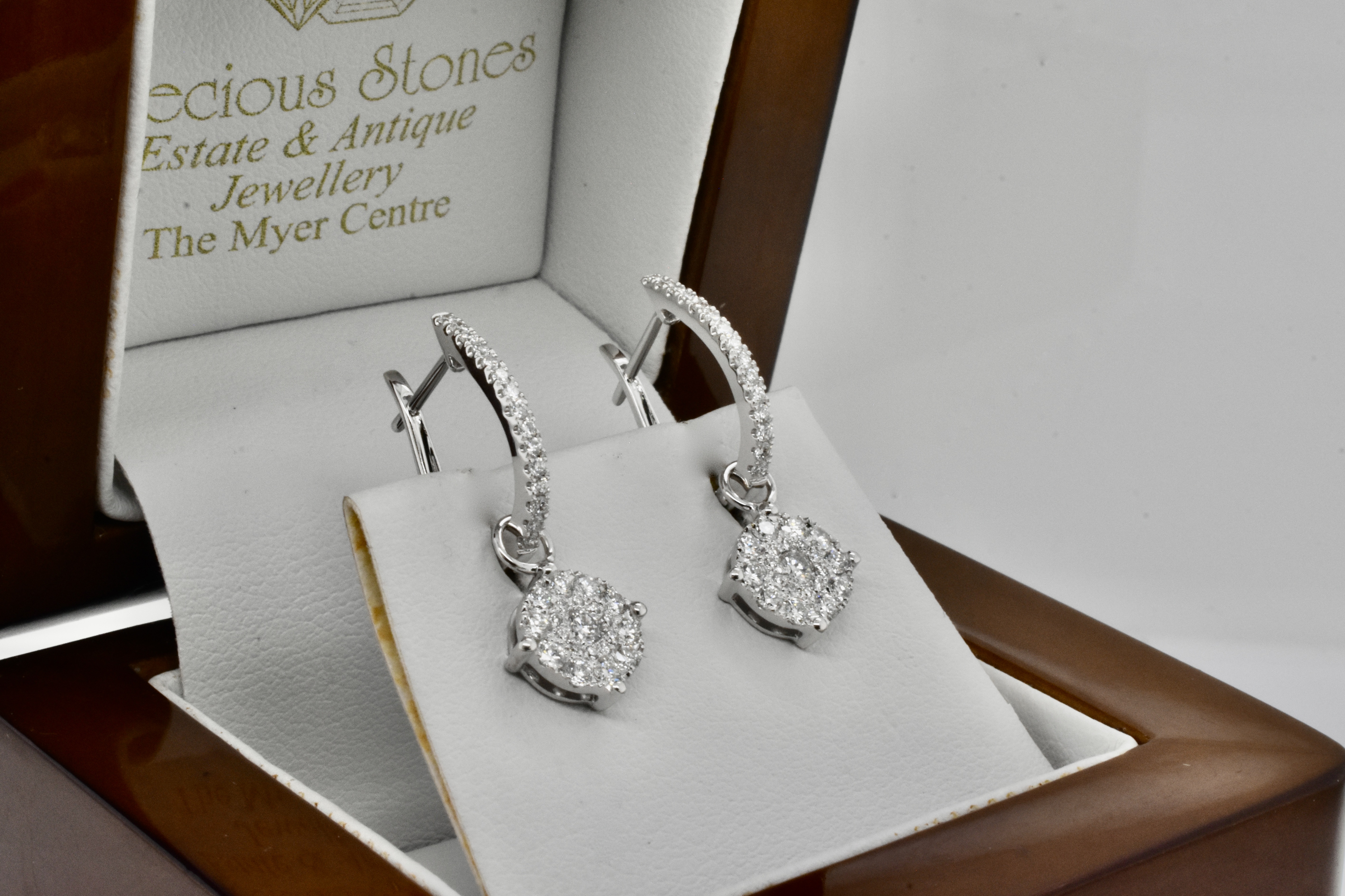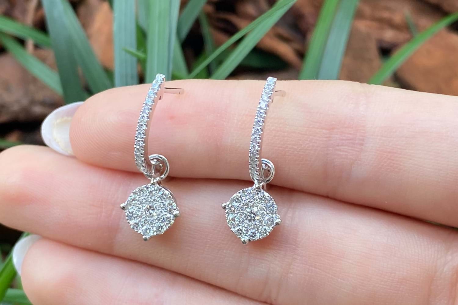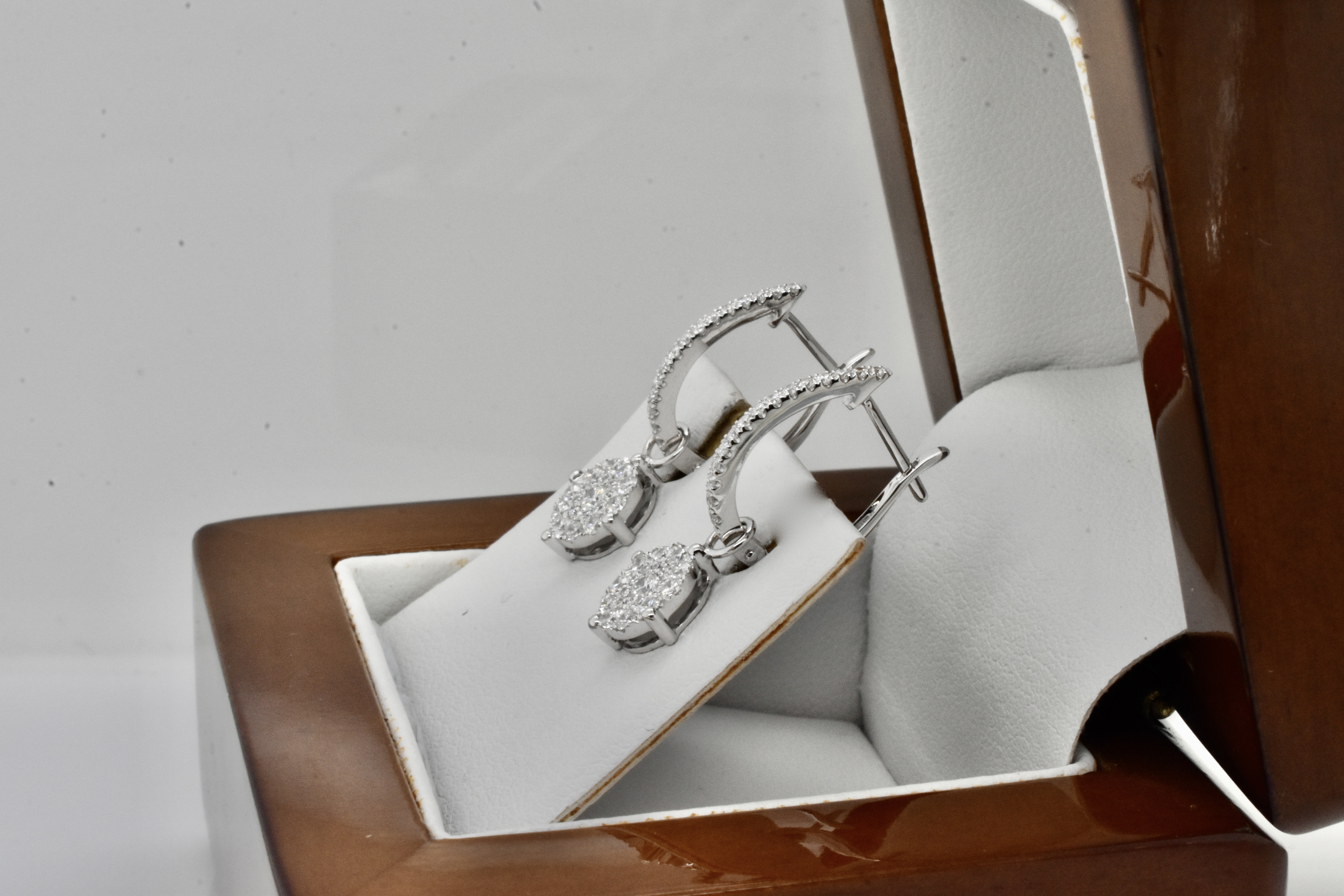A dazzling and sparkly pair of 18ct white gold huggies featuring a removable illusion drop, making them perfectly versatile for day to night wear. The huggies feature a total of 30 shimmering RBC diamonds while the detachable drops have 42, making a total of 72 equalling 0.67ct FG/VS-SI. The huggies are U-shaped and have a hinged clipped post fitting