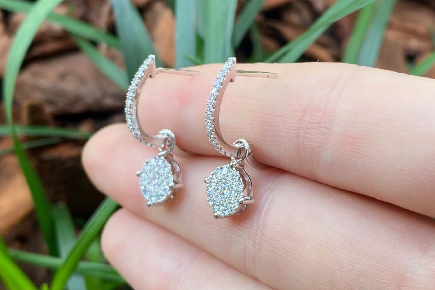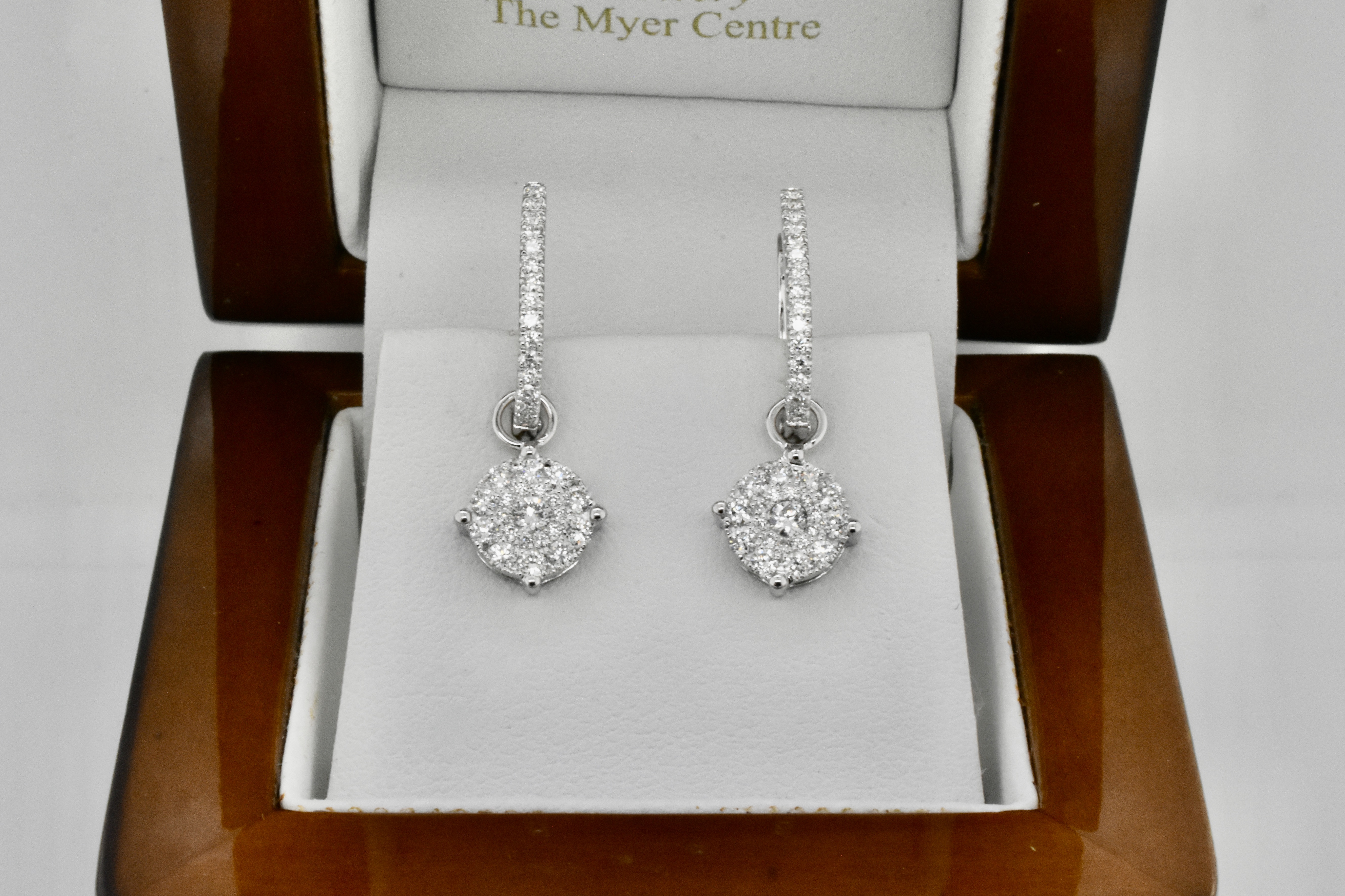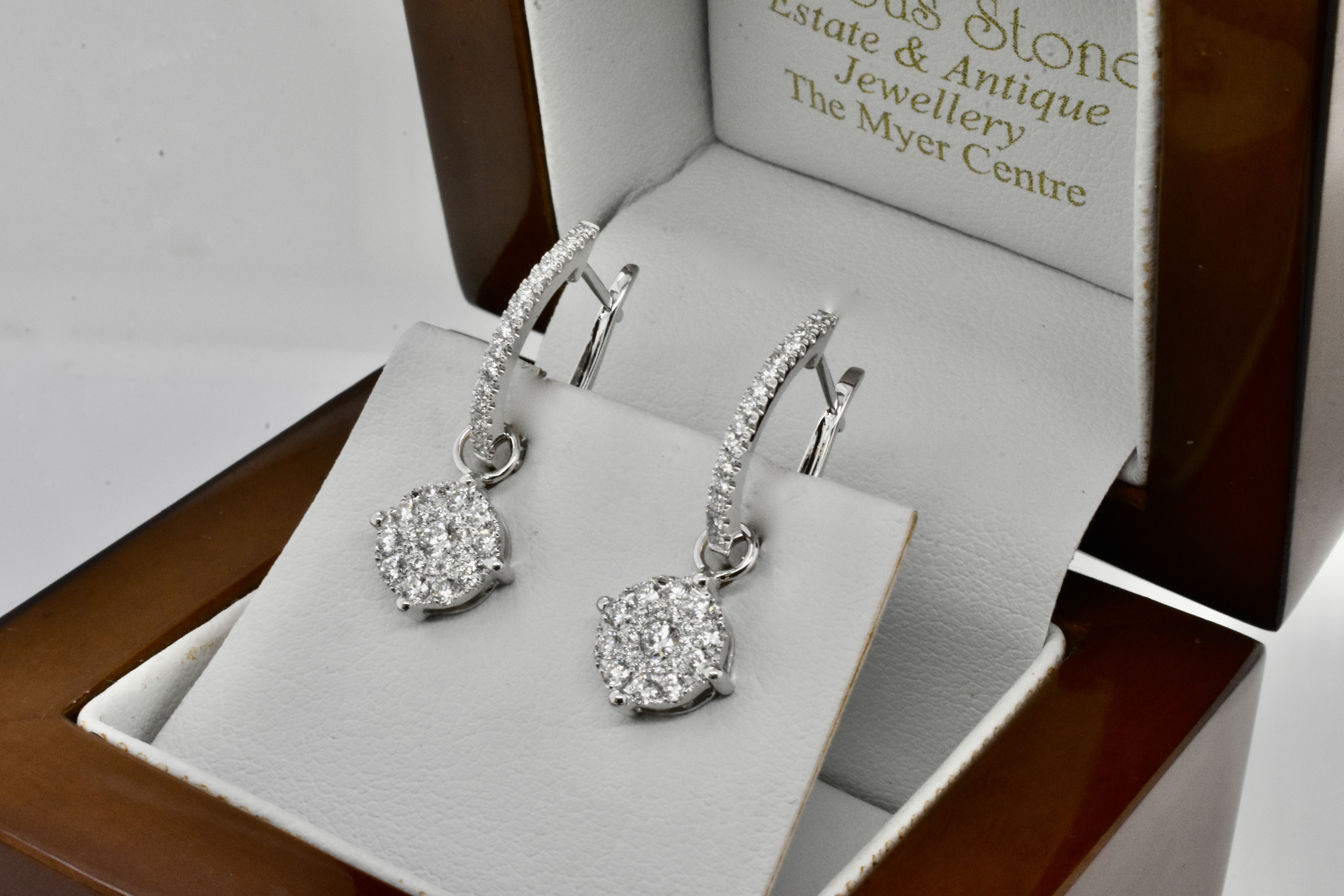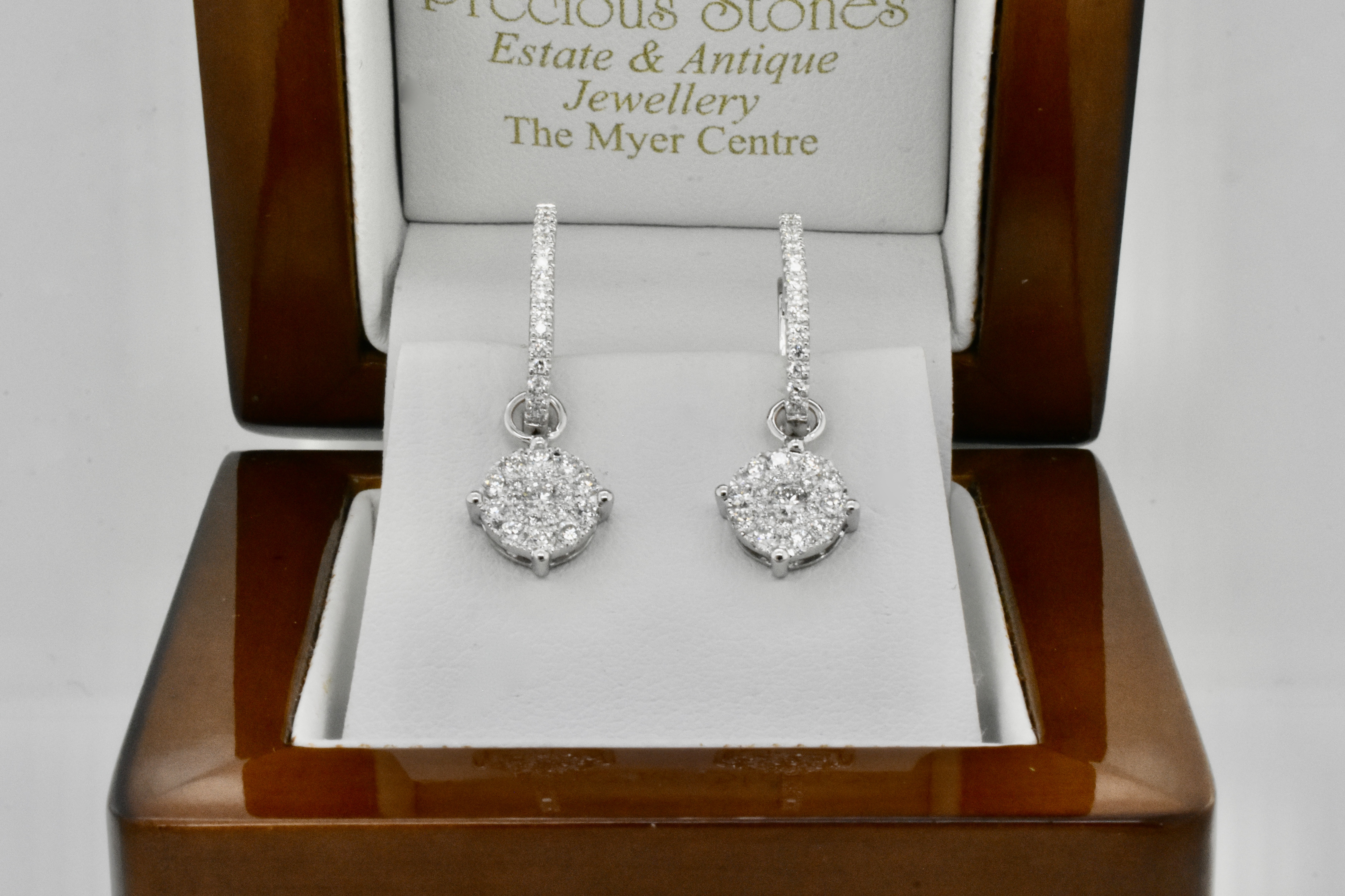 A dazzling and sparkly pair of 18ct white gold huggies featuring a removable illusion drop, making them perfectly versatile for day to night wear. The huggies feature a total of 30 shimmering RBC diamonds while the detachable drops have 42, making a total of 72 equalling 0.67ct FG/VS-SI. The huggies are U-shaped and have a hinged clipped post fitting