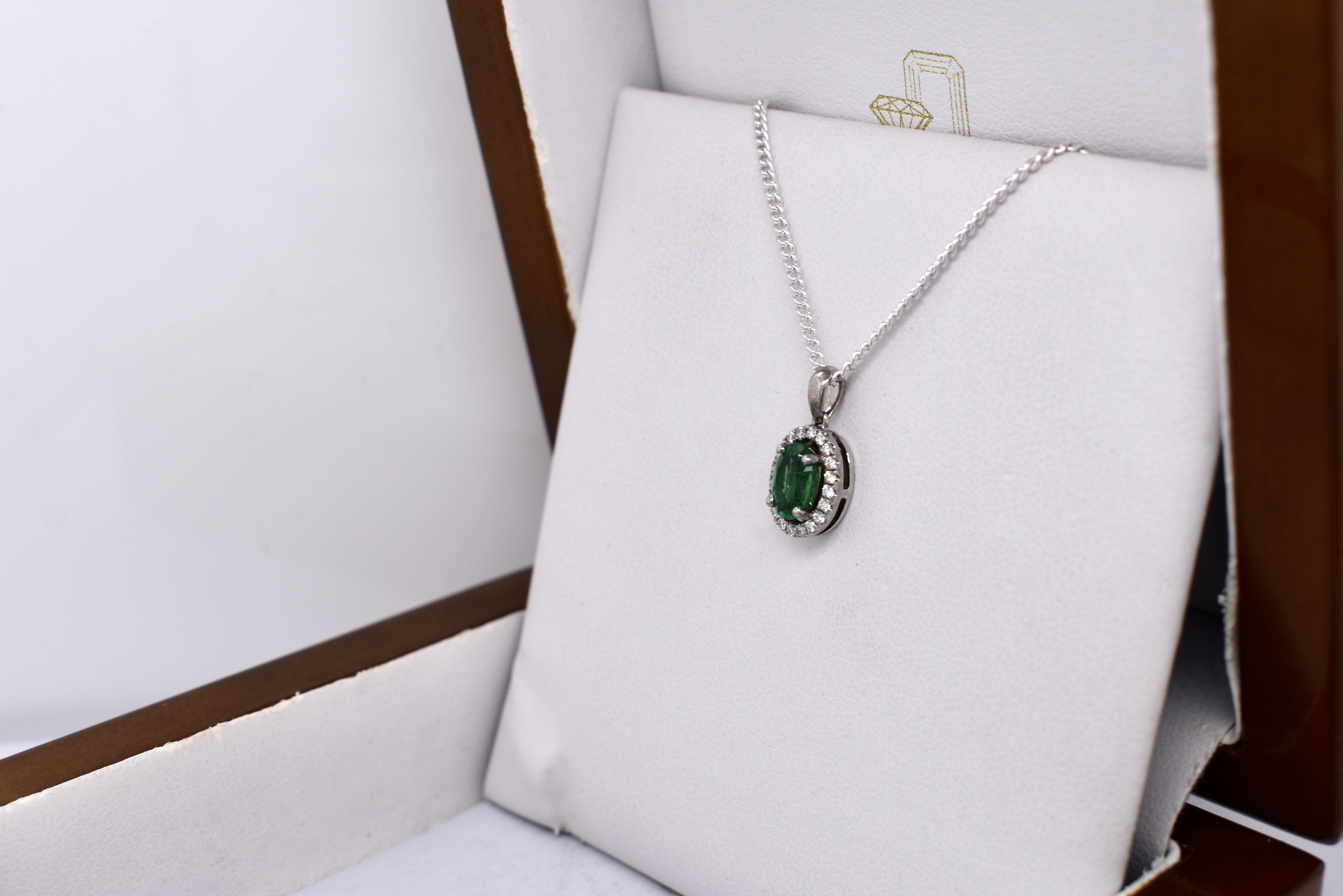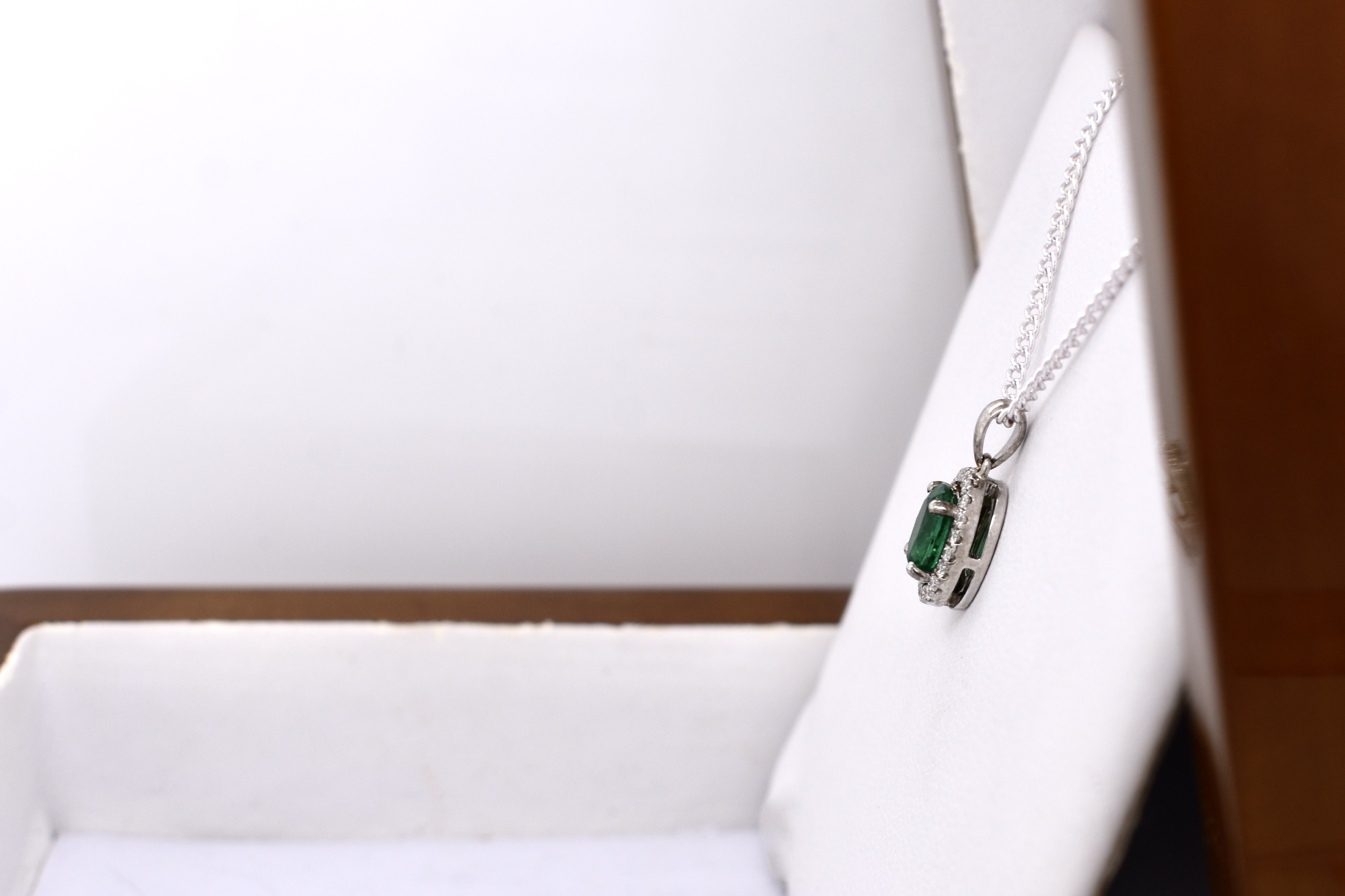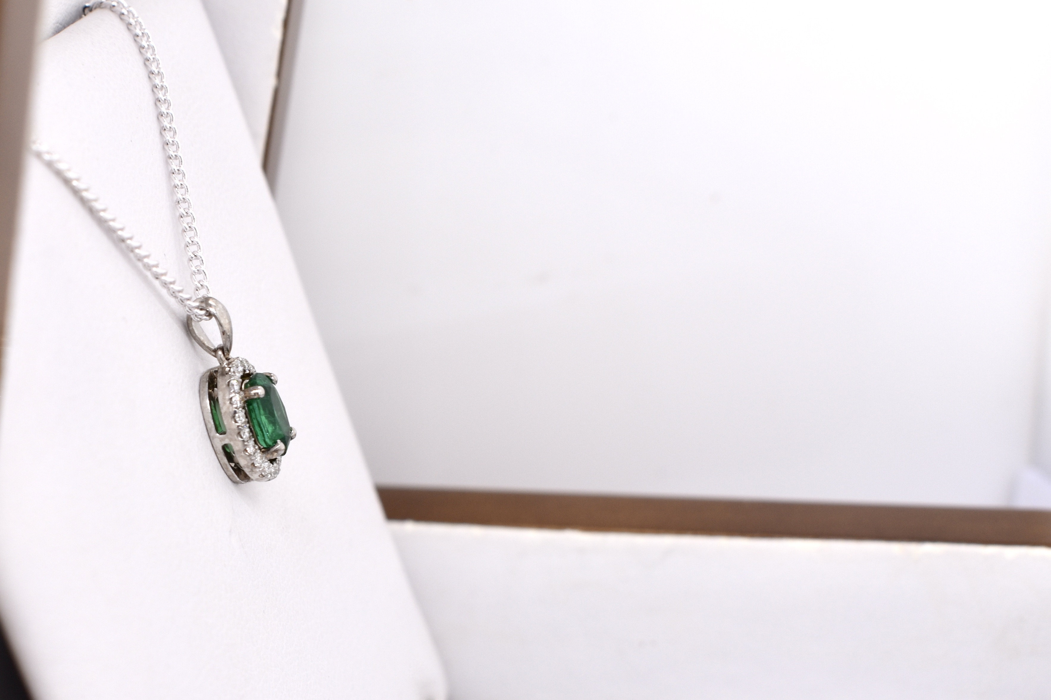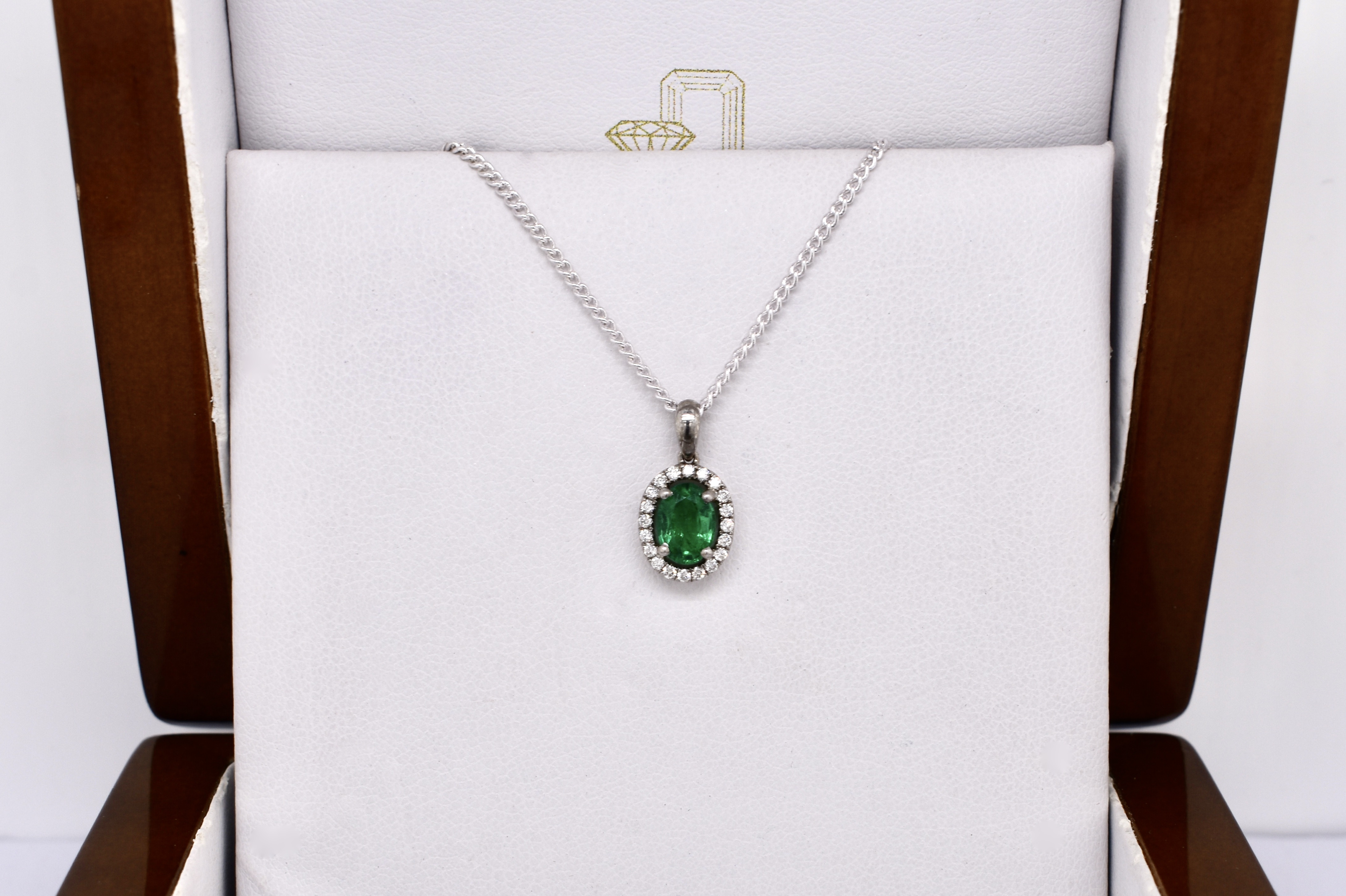 This elegant 18ct white gold pendant, features an oval 6.95x5.00x3.15mm Zambian emerald, weighing 0.69ct. Four claw set with a beautiful scintillating halo of twenty 1.20mm diamonds, totalling 0.14ct F SI. Completed with a plain pendant bale. Chains are available for separate purchase. Independent Valuation Supplied.