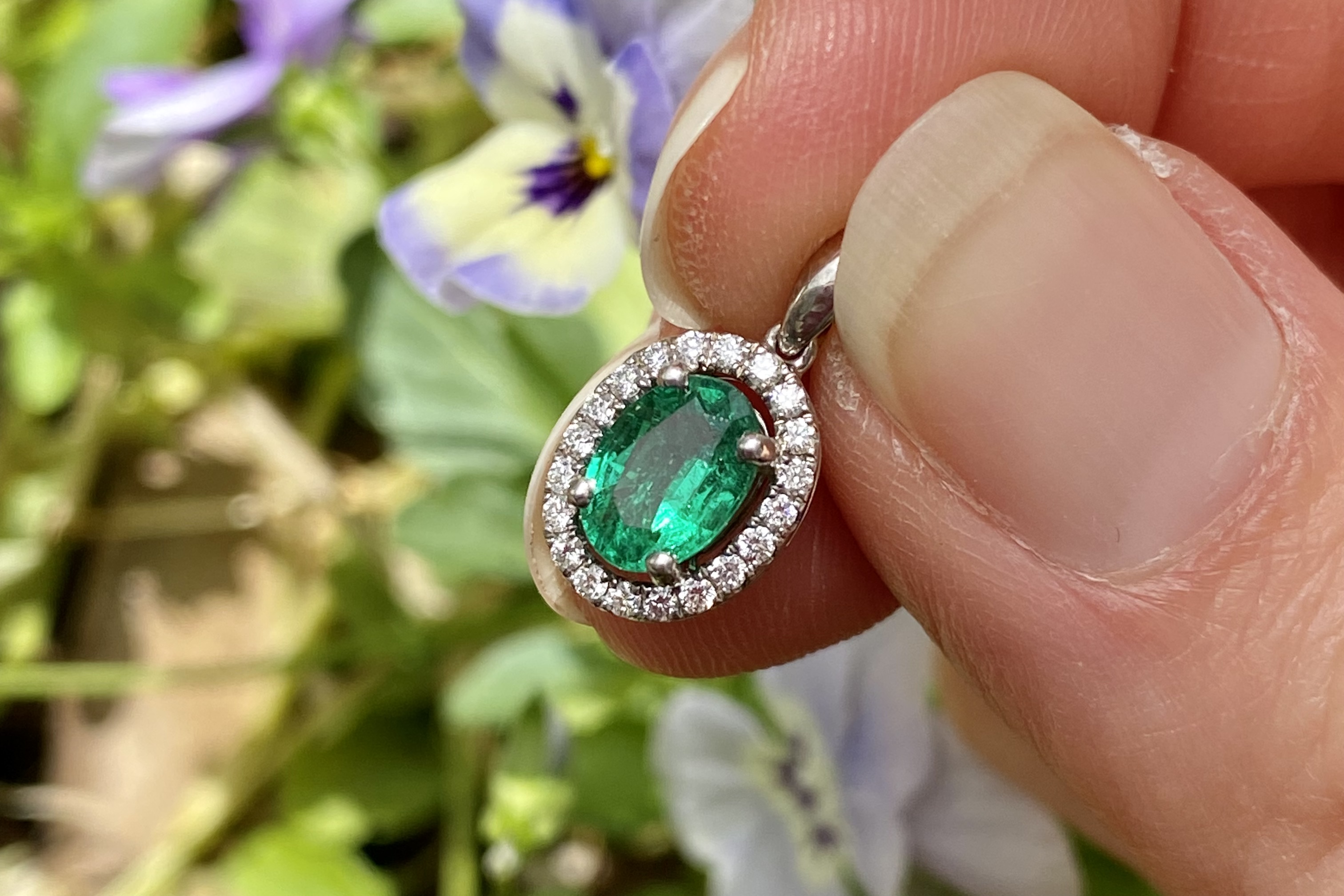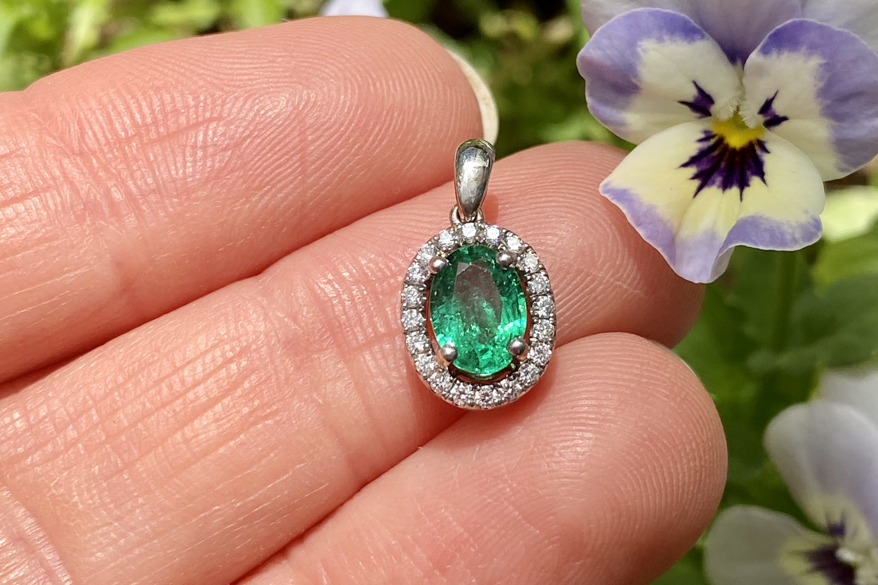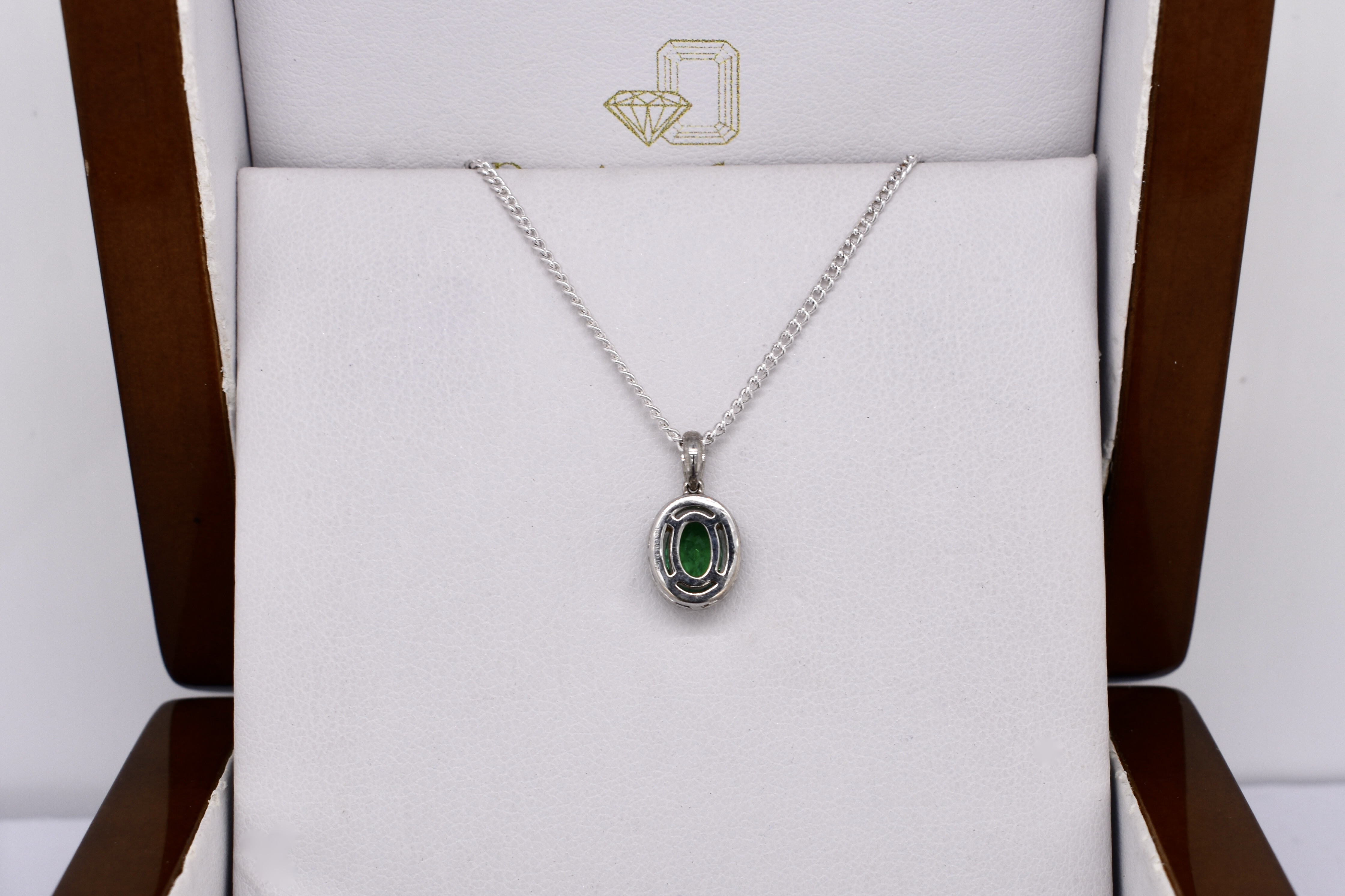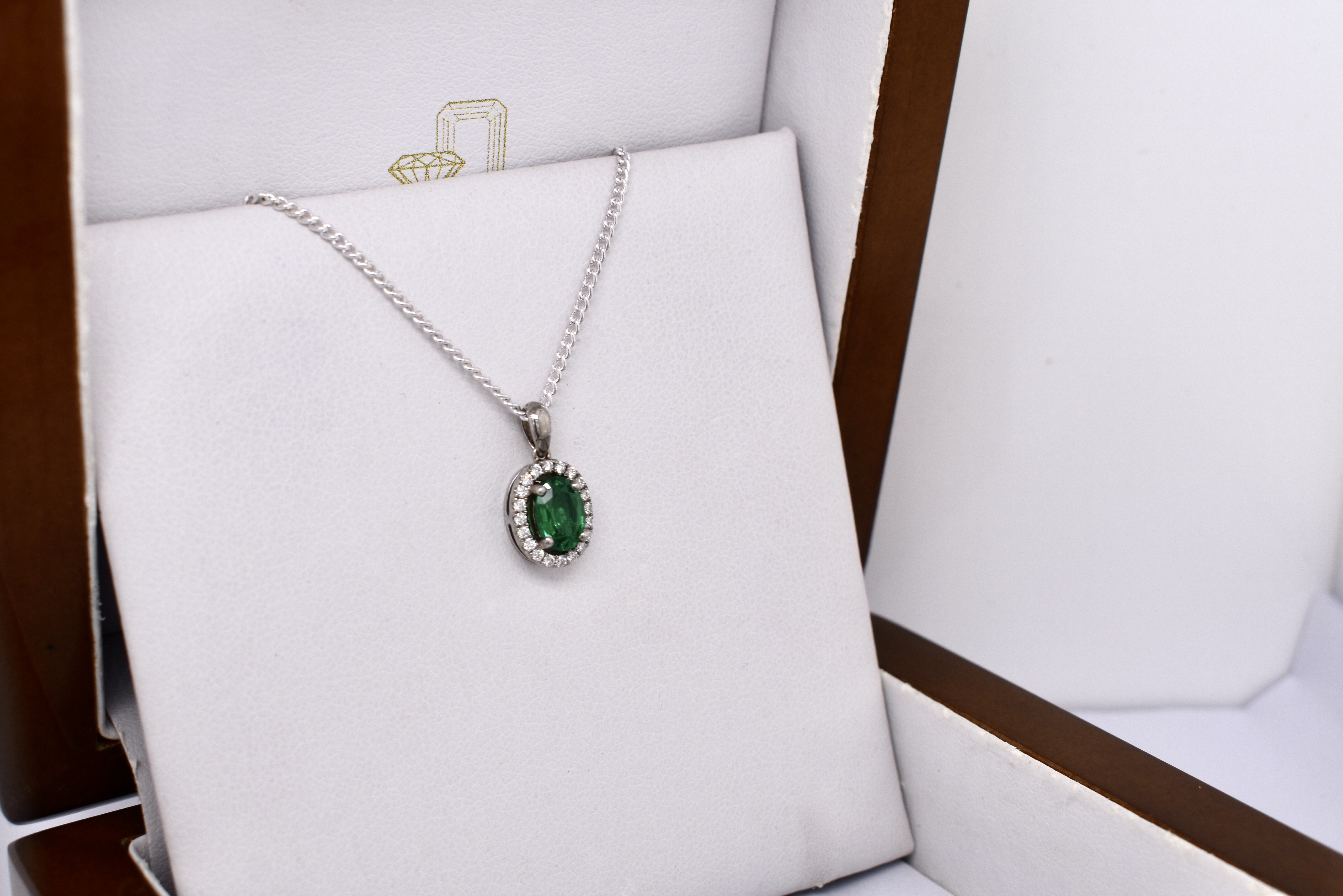 This elegant 18ct white gold pendant, features an oval 6.95x5.00x3.15mm Zambian emerald, weighing 0.69ct. Four claw set with a beautiful scintillating halo of twenty 1.20mm diamonds, totalling 0.14ct F SI. Completed with a plain pendant bale. Chains are available for separate purchase. Independent Valuation Supplied.