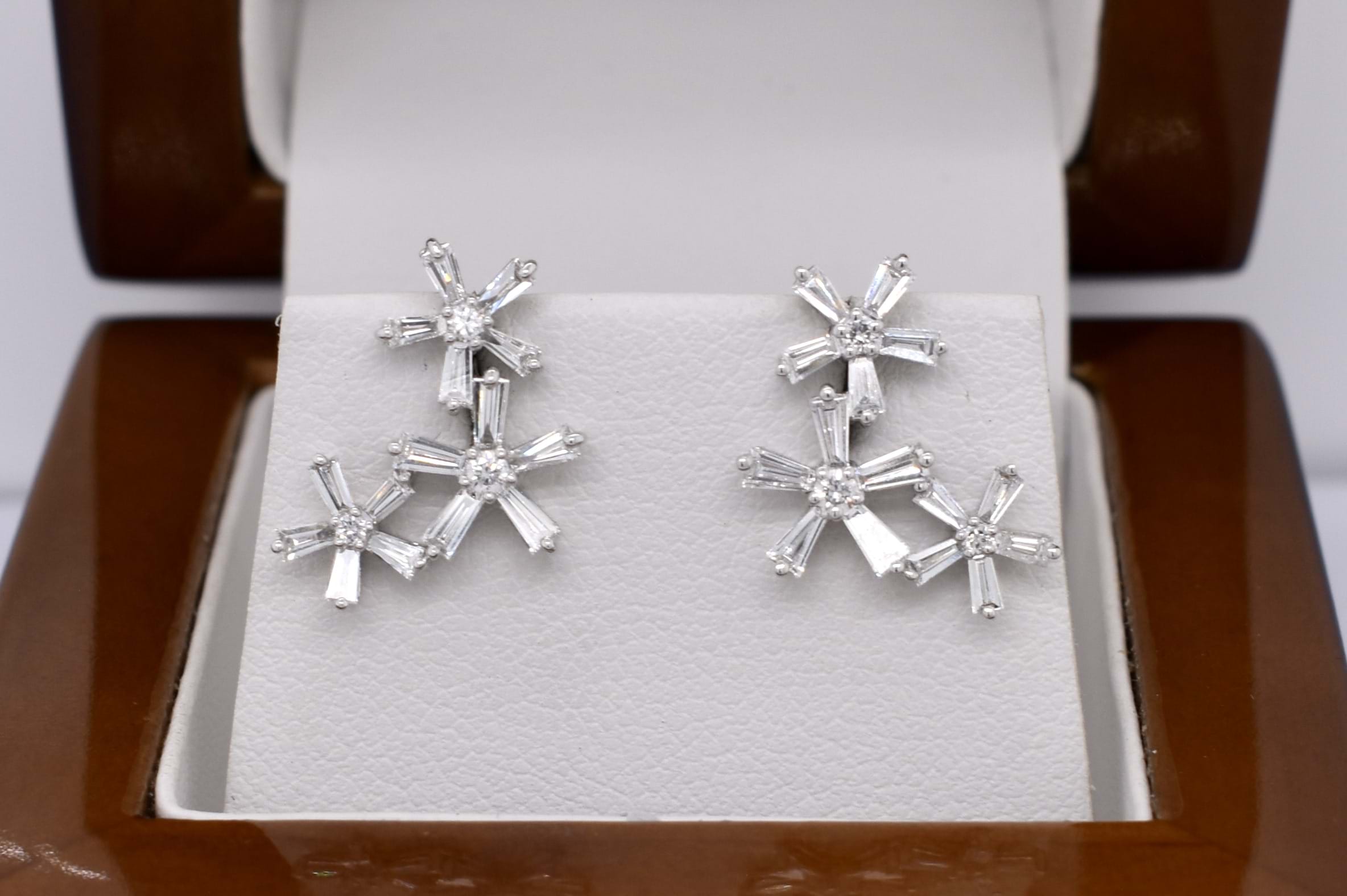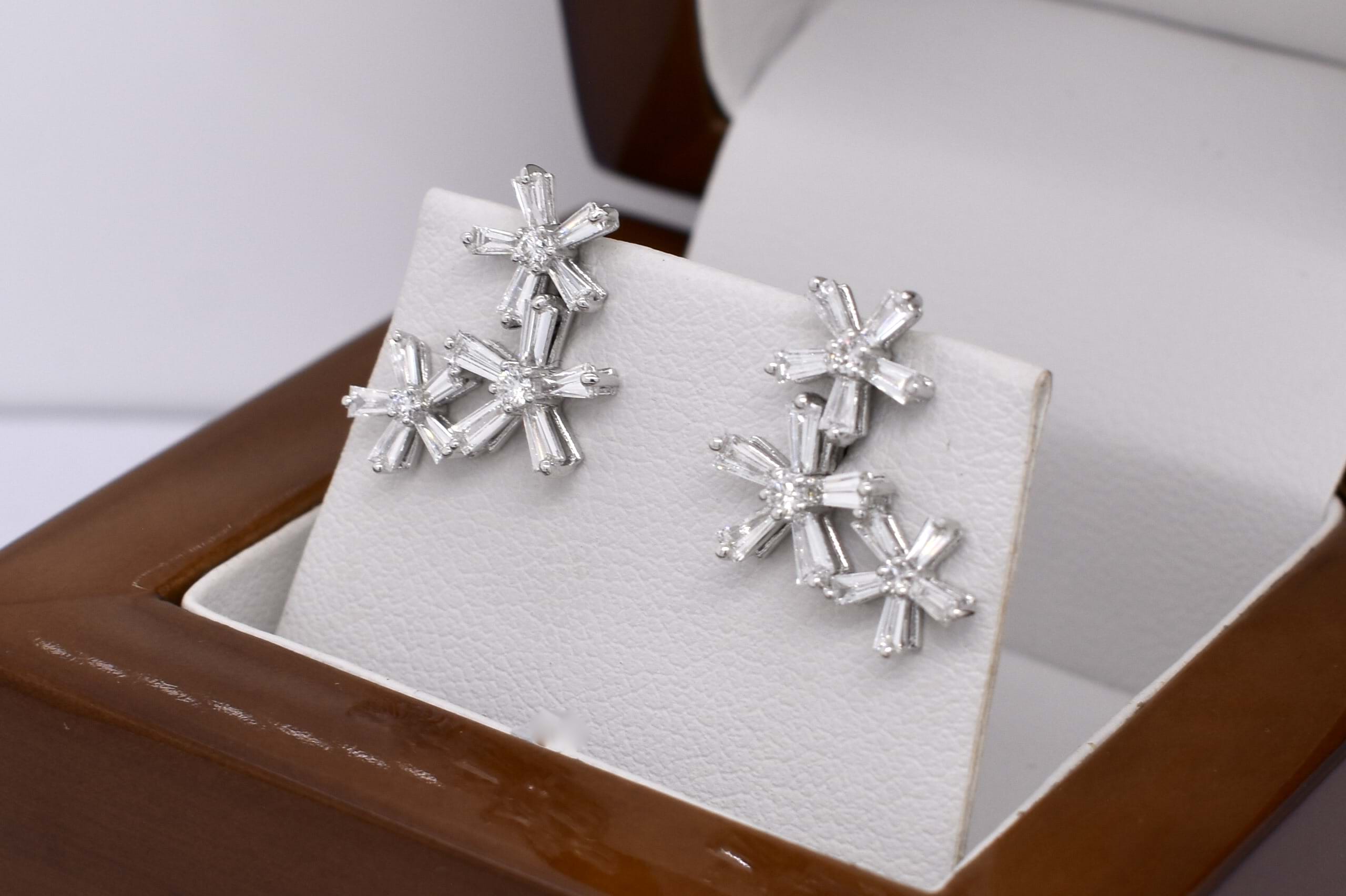 This beautiful and contemporary design features a collection of tapered baguette cut and round diamonds to form three flowers offset in each earring. The studs have been crafted in 18ct white gold and contain a combined total of 30 tapered baguettes equalling 0.74cts & six round brilliant cut diamonds equalling 0.11ct FG/VS-SI. Independent Valuation Supplied