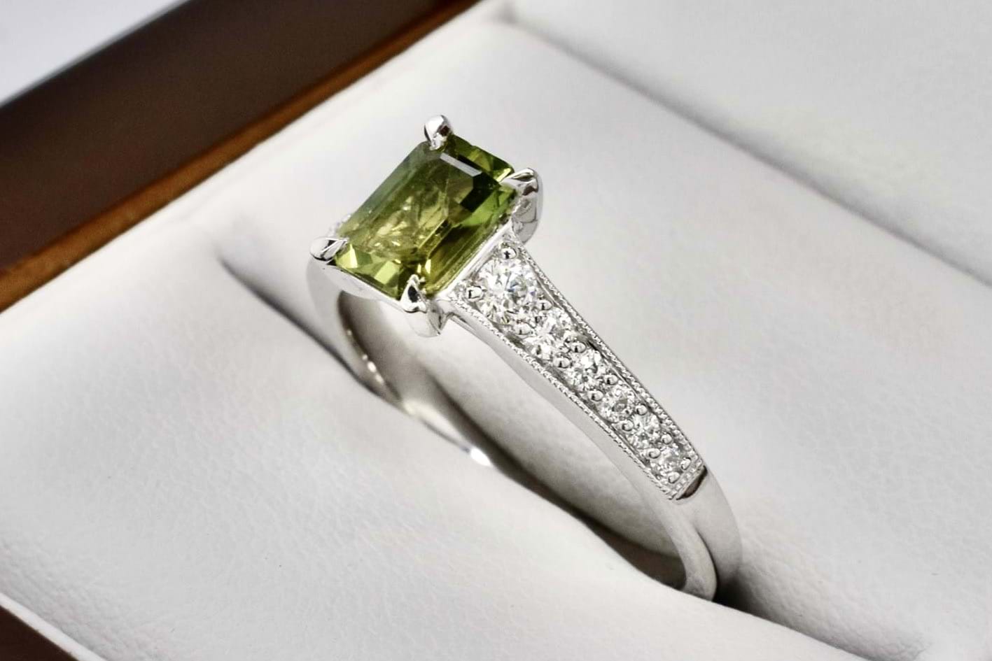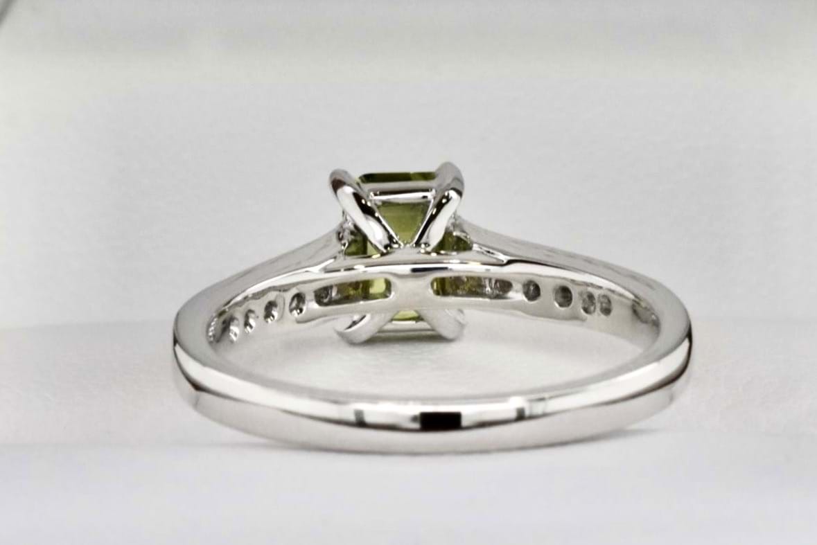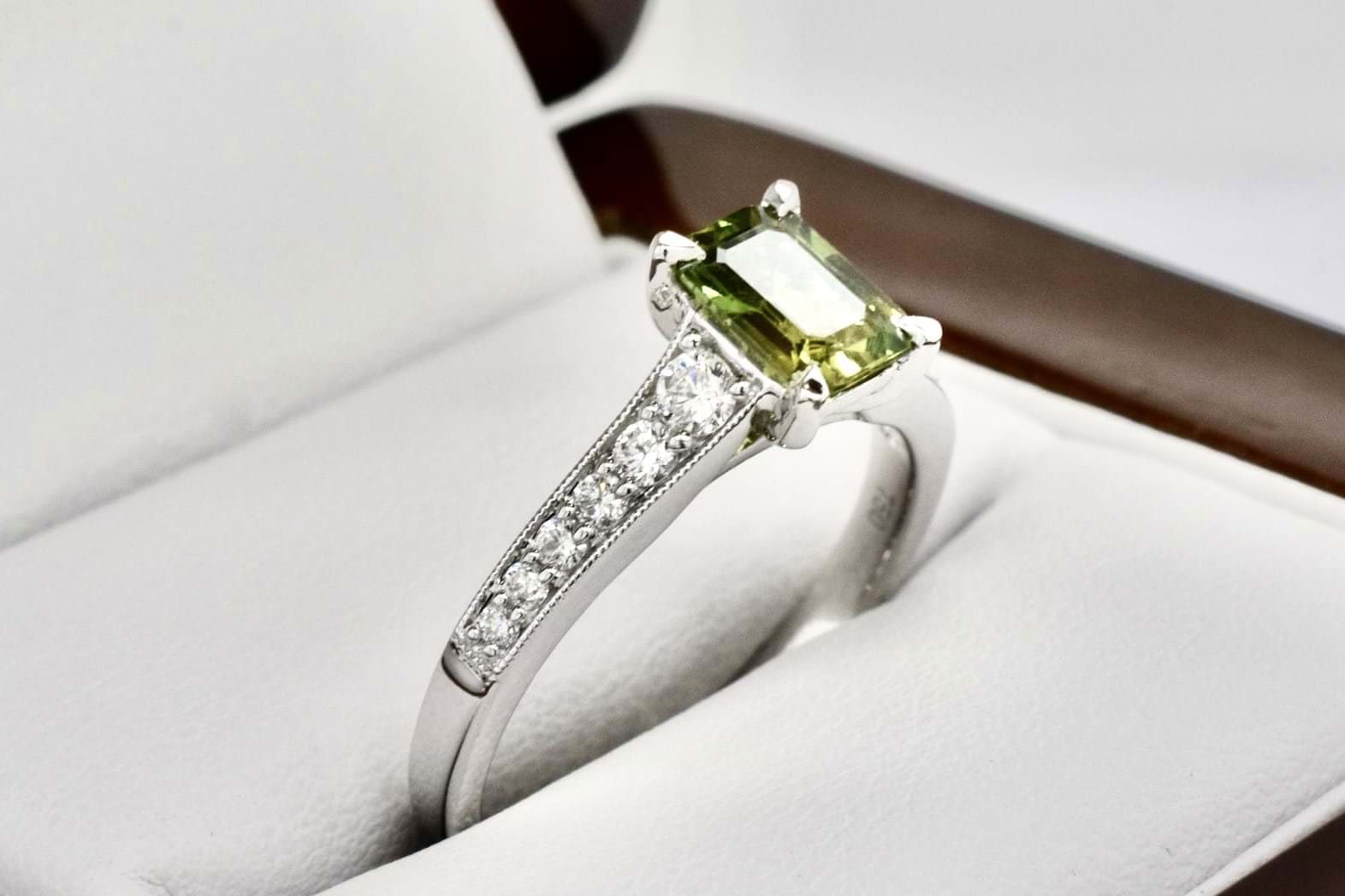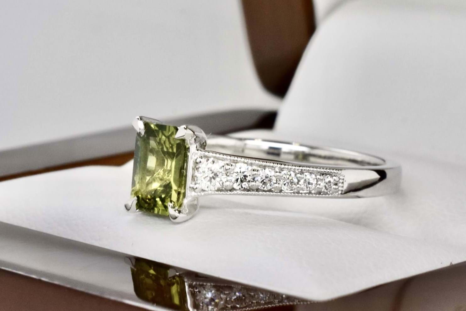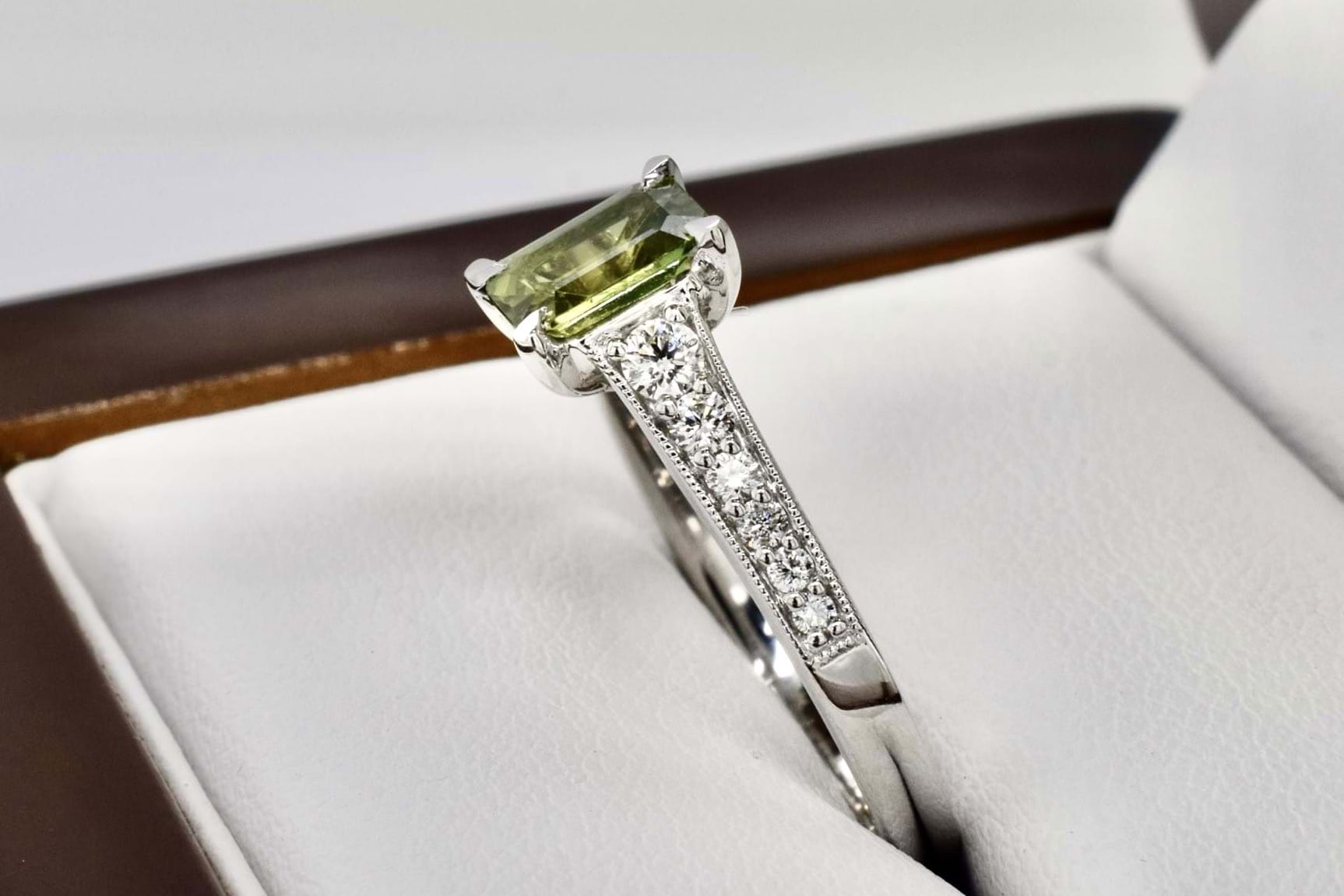 A beautiful 0.86ct emerald cut, bright mid yellowish green Parti, Australian sapphire four claw set into this striking and contemporary 18ct white gold ring with grain set round diamonds going down the shoulders. The ring contains a total of 12 round brilliant cut diamonds equalling 0.28ct FVS-SI. Finger size M+ Independent Valuation Supplied