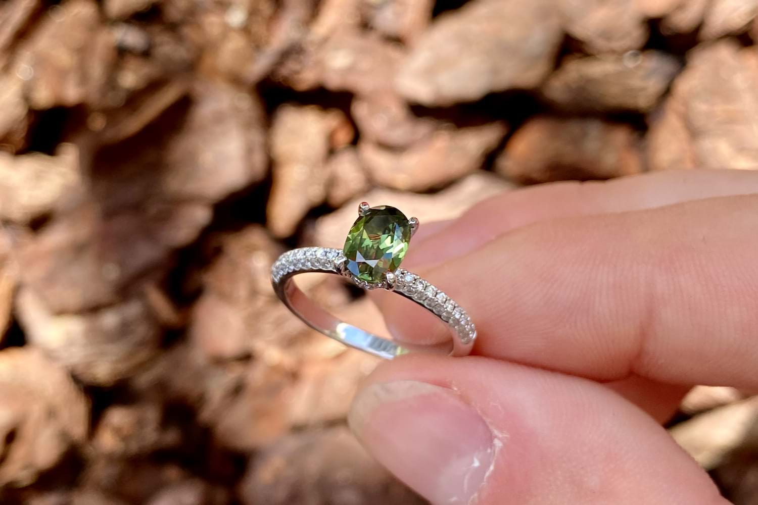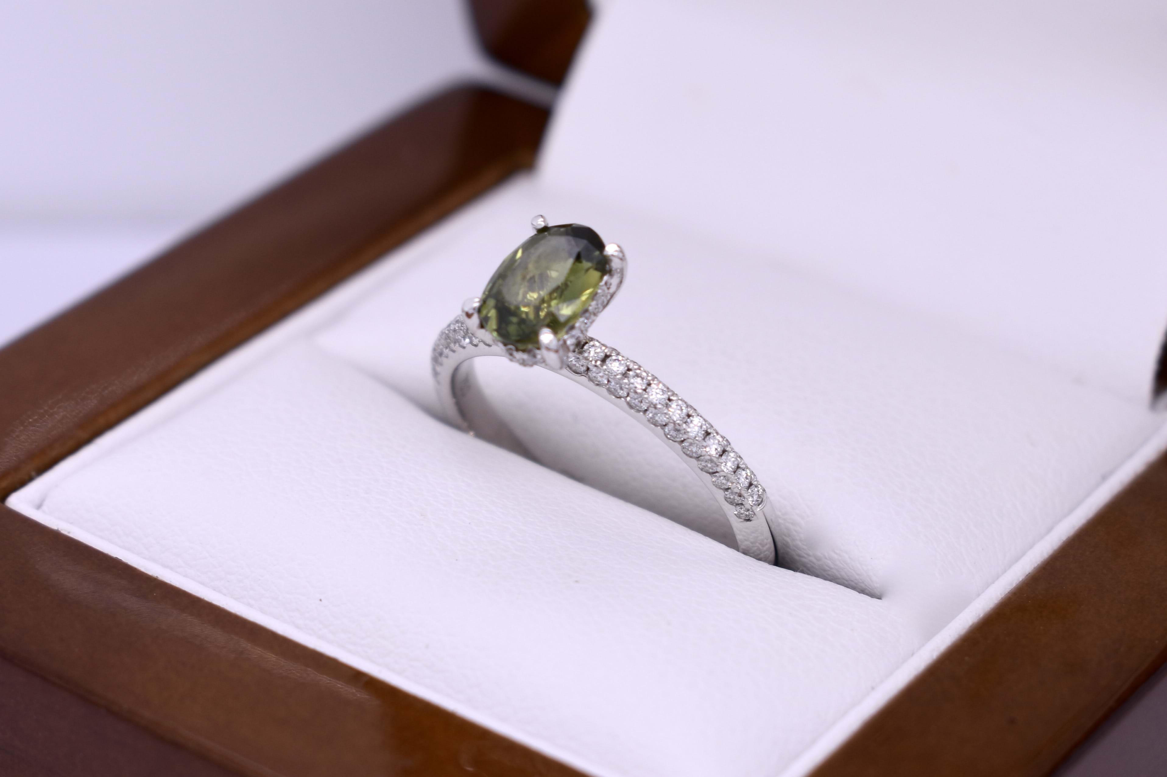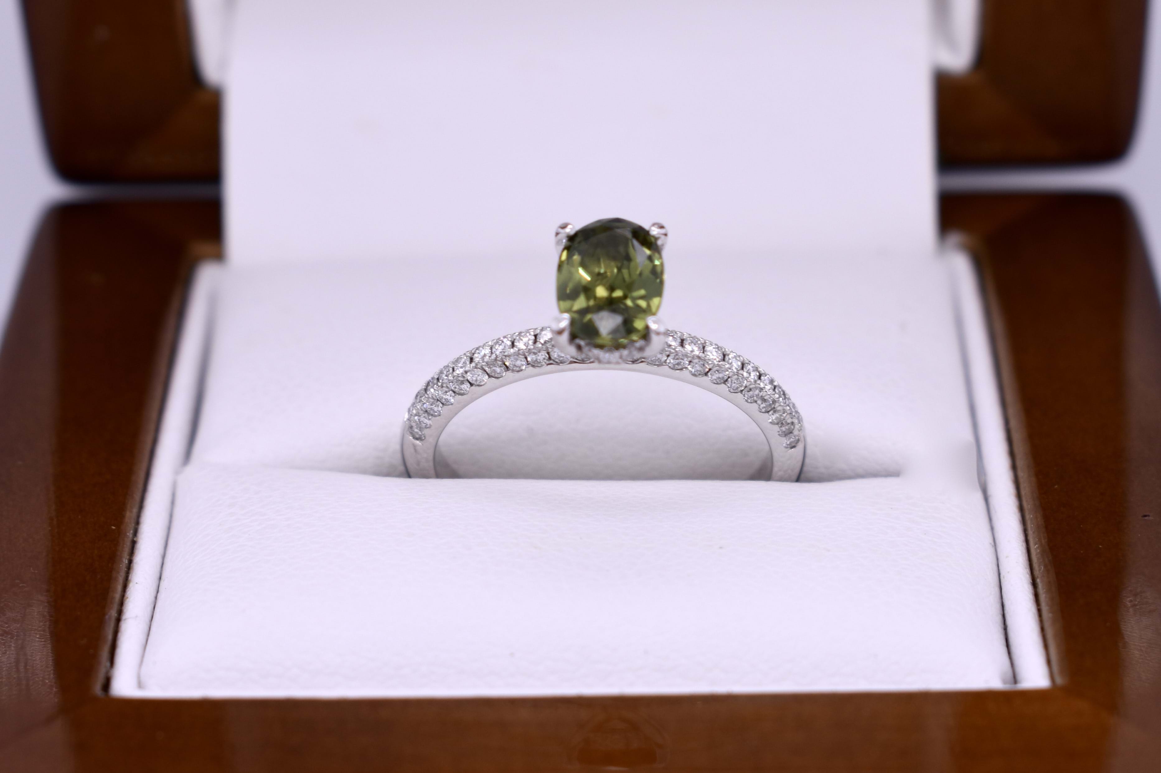 Classic and charming, this 18ct white gold ring consists of an oval 0.96ct Australian green parti sapphire, four claw set with a shimmering diamond pave set band and hidden halo. Total of 78 round brilliant cut diamonds equalling 0.34ct FG SI. Finger size L.