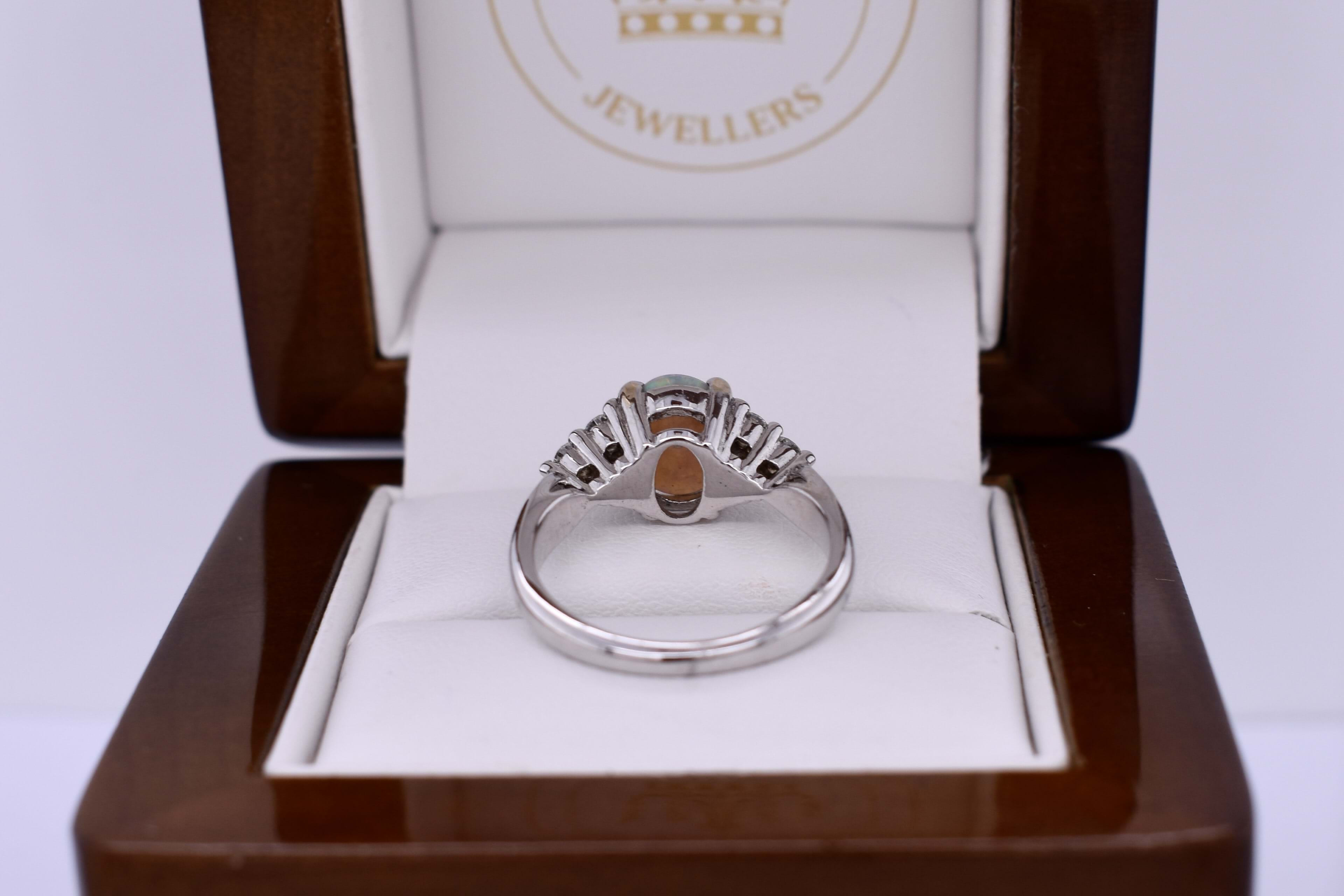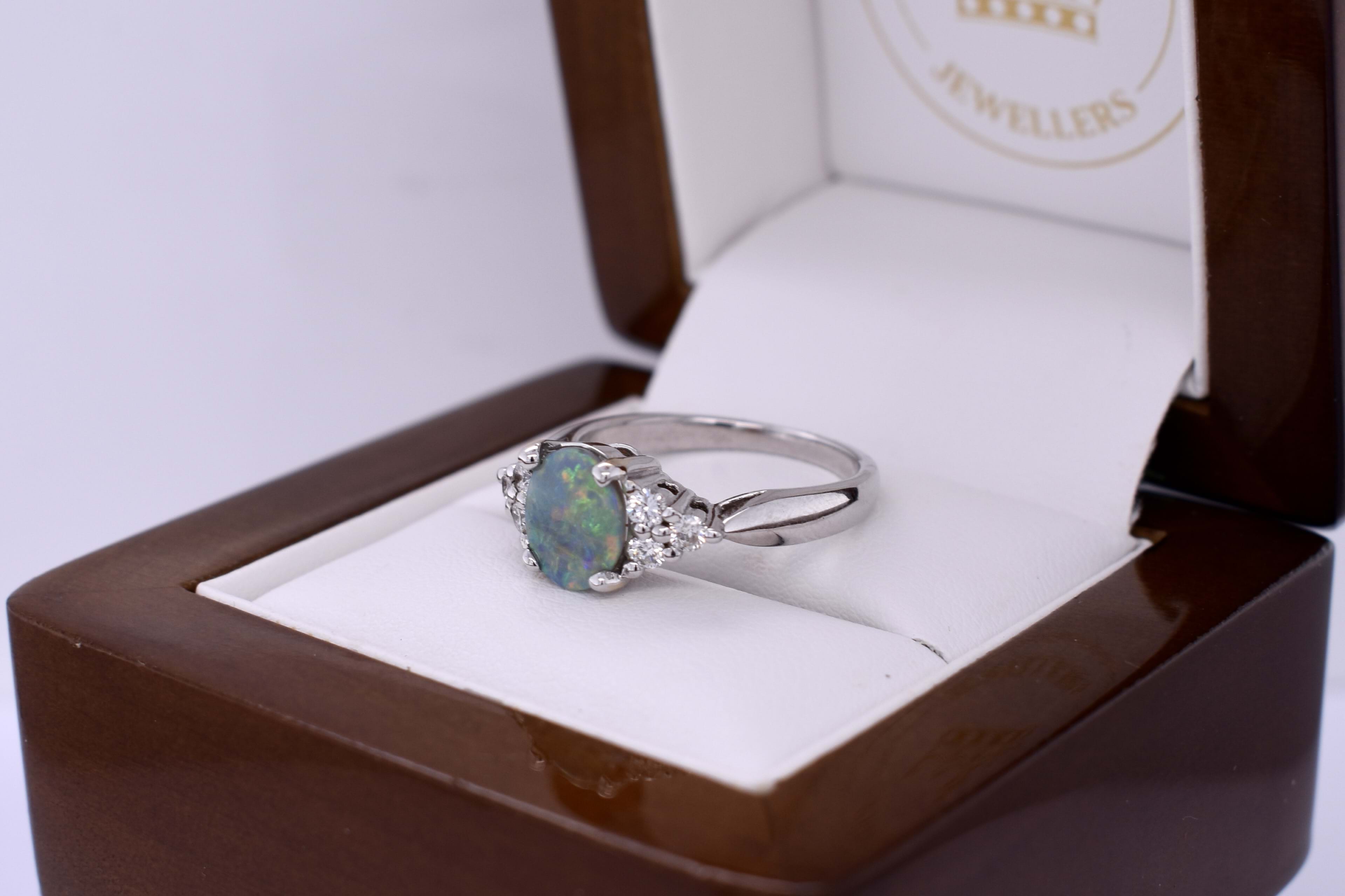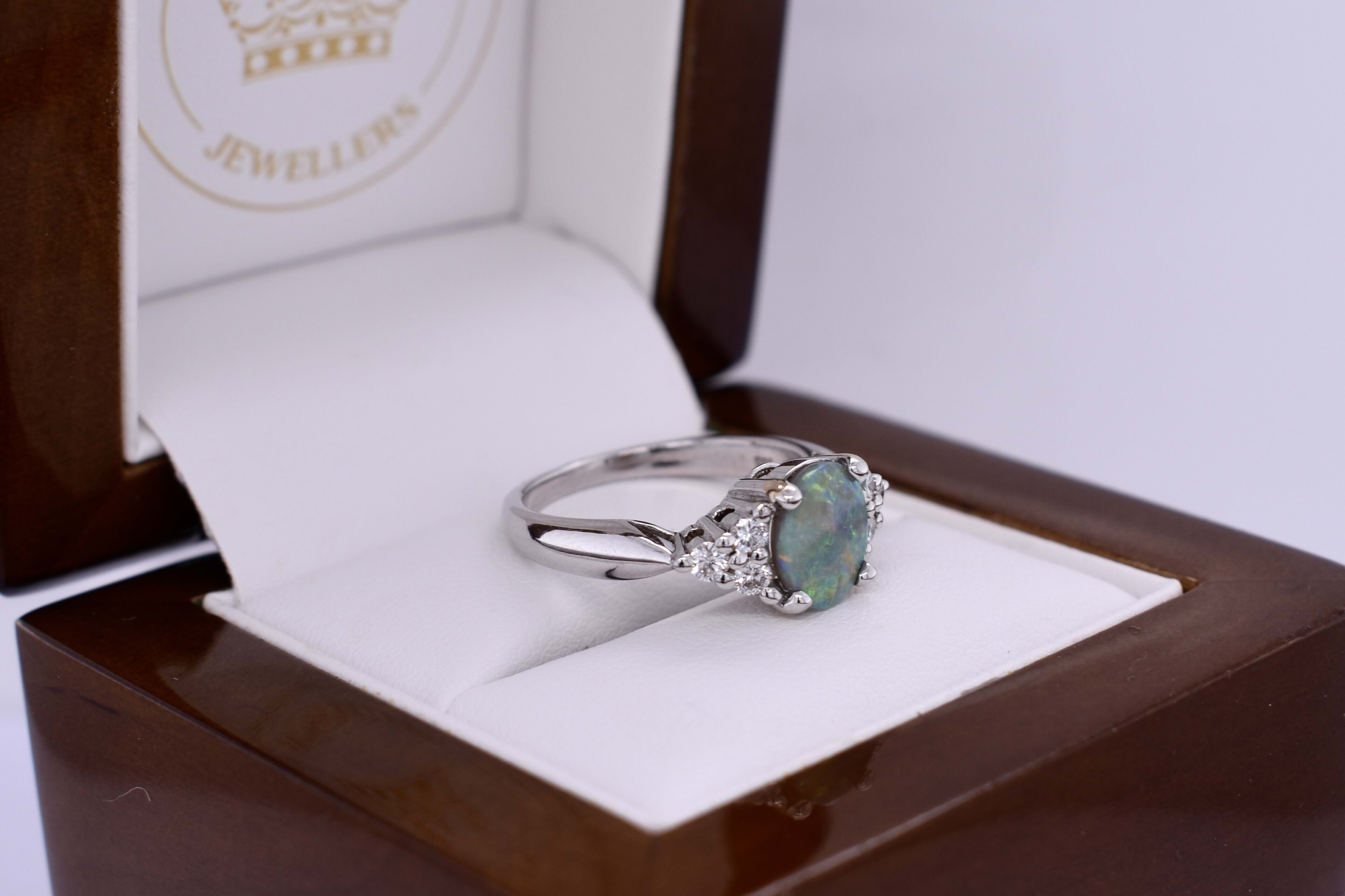 This gorgeous ring is crafted in 18ct white gold and features a 0.96ct Lightning Ridge opal. The opal has a light grey base and shows vibrant flashes of blue and green throughout. The opal is complimented by 3 round brilliant cut diamond side stones each side totalling 0.20ct G SI. Finished on a swept up, tapered band. Finger size M+. Independent valuation supplied.