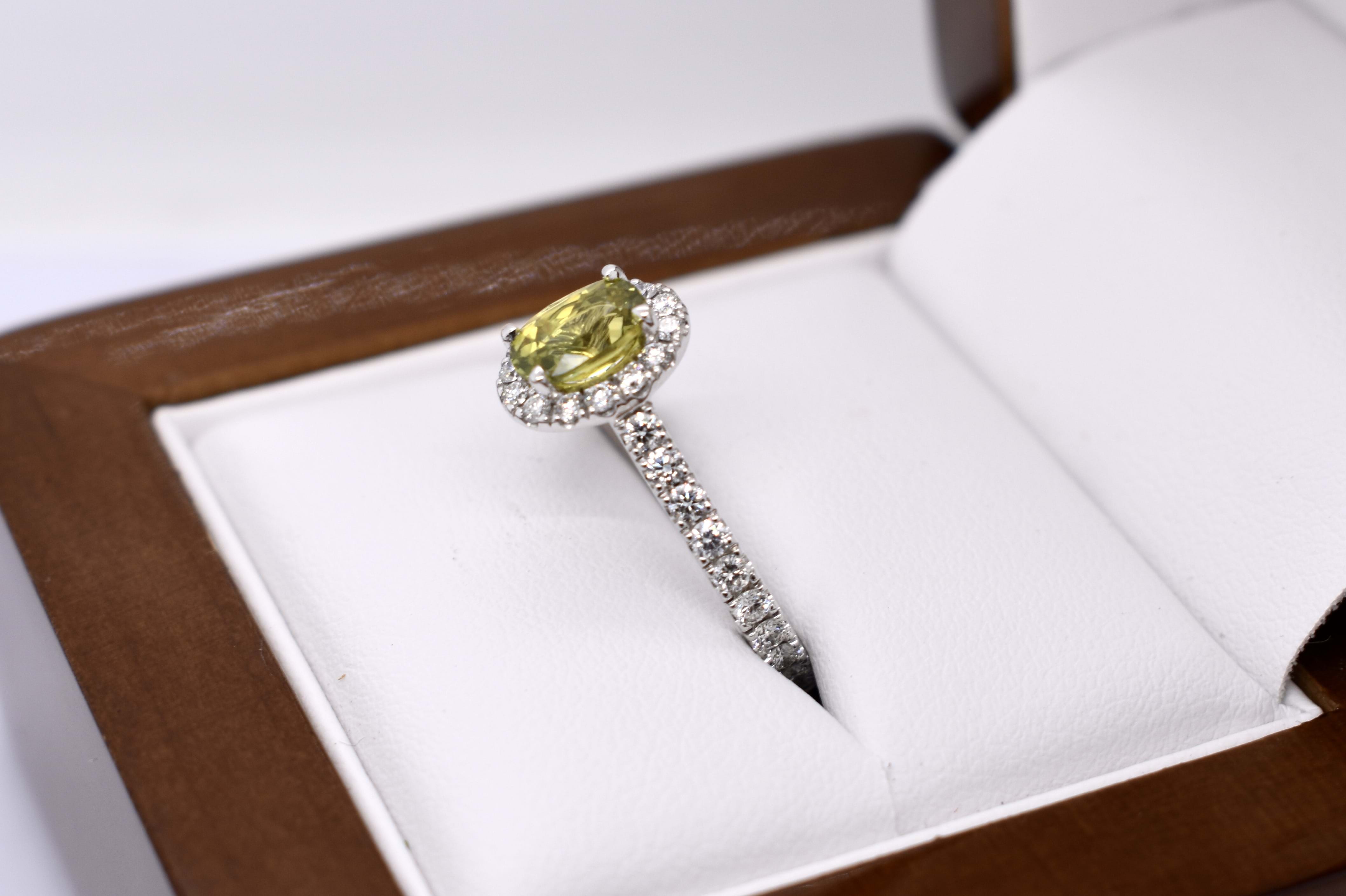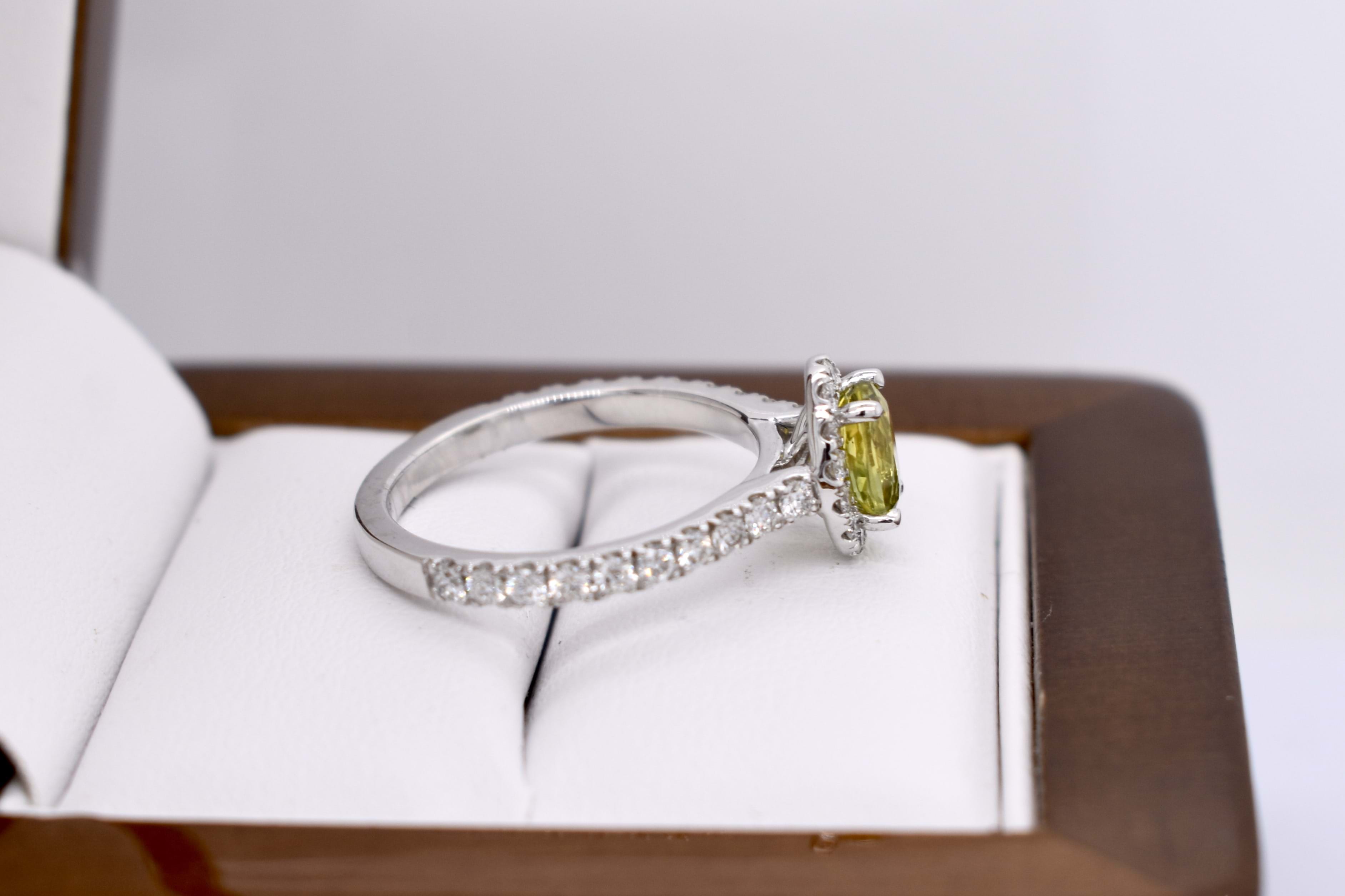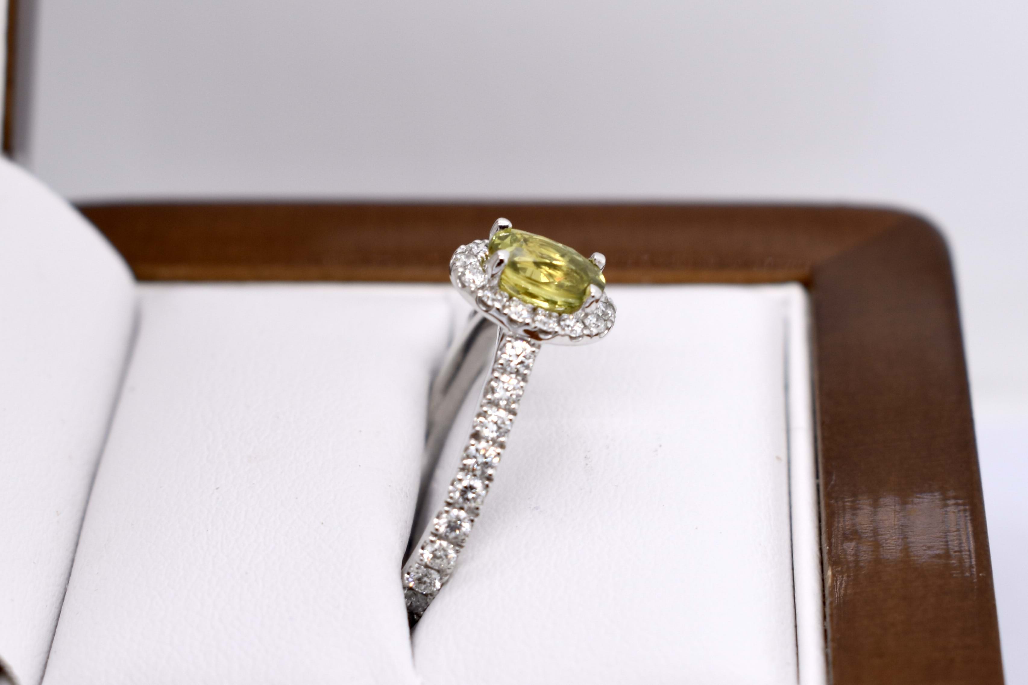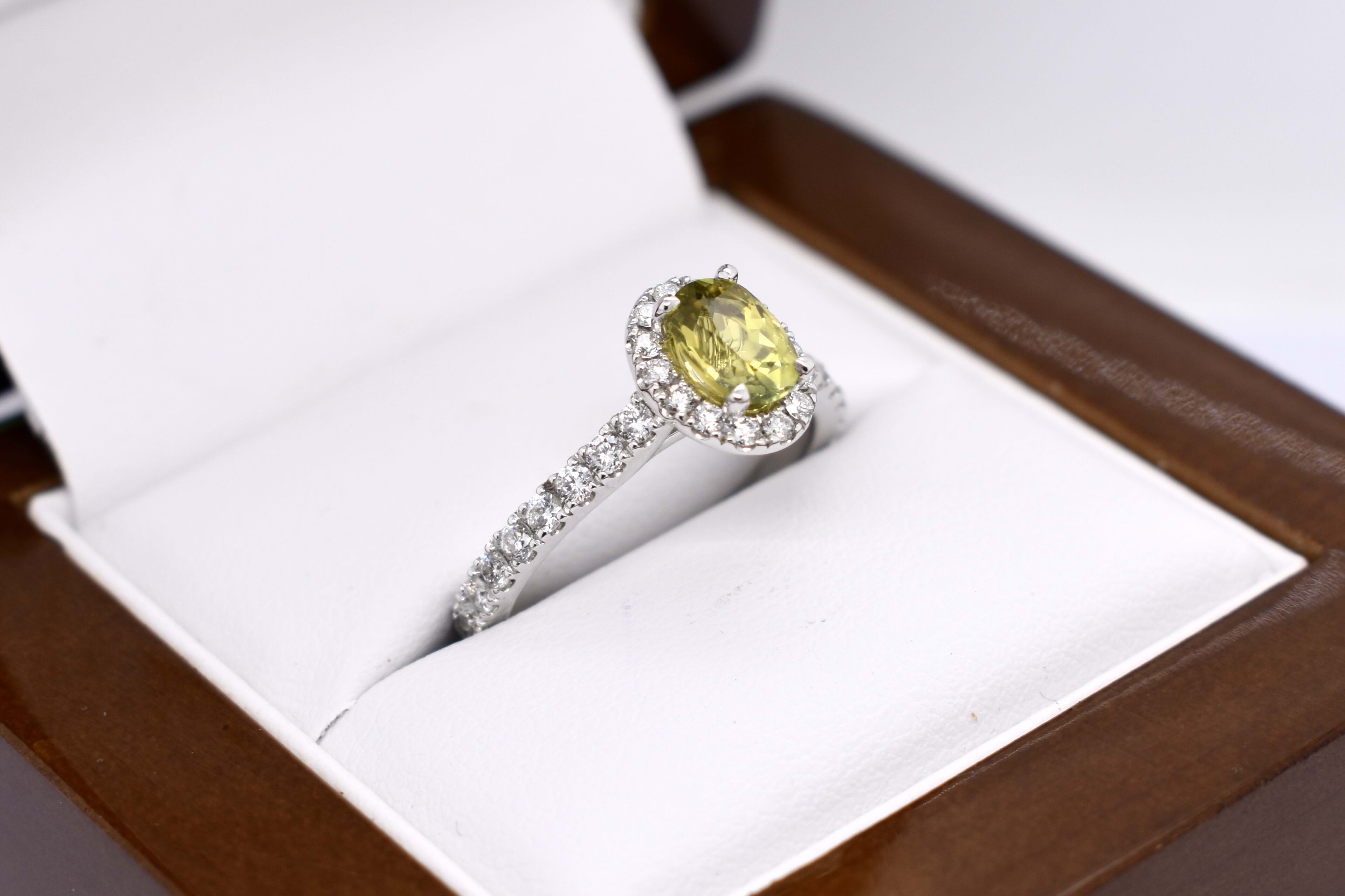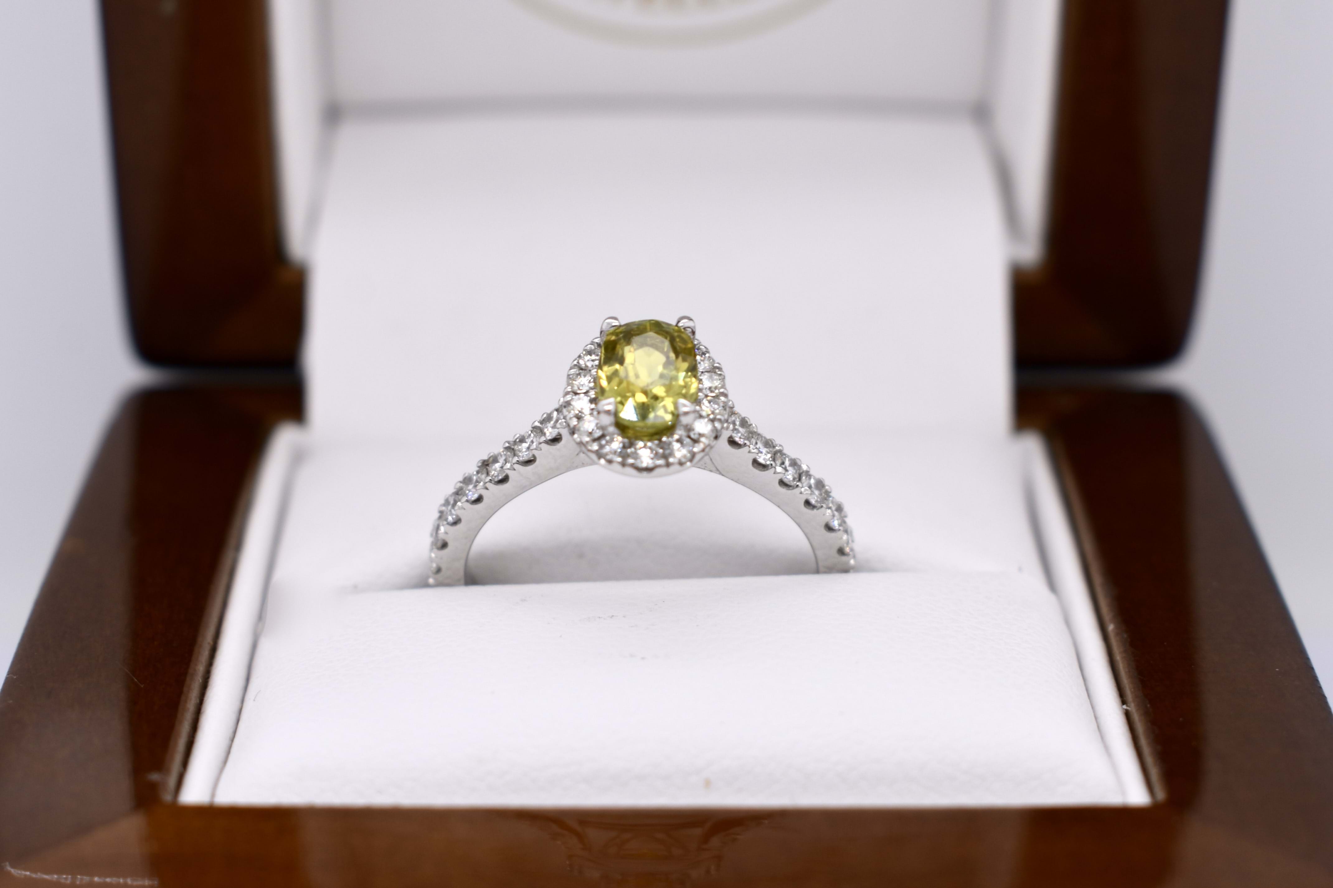 This beautiful 18ct white gold ring features a central oval Australian yellow parti sapphire of 0.99ct, four claw set. With a sparkling halo of round brilliant cut diamonds which continue down the band. The ring contains a total of 34 diamonds weighing 0.59ct GH SI total. Finger size M. Independent Valuation available upon purchase.