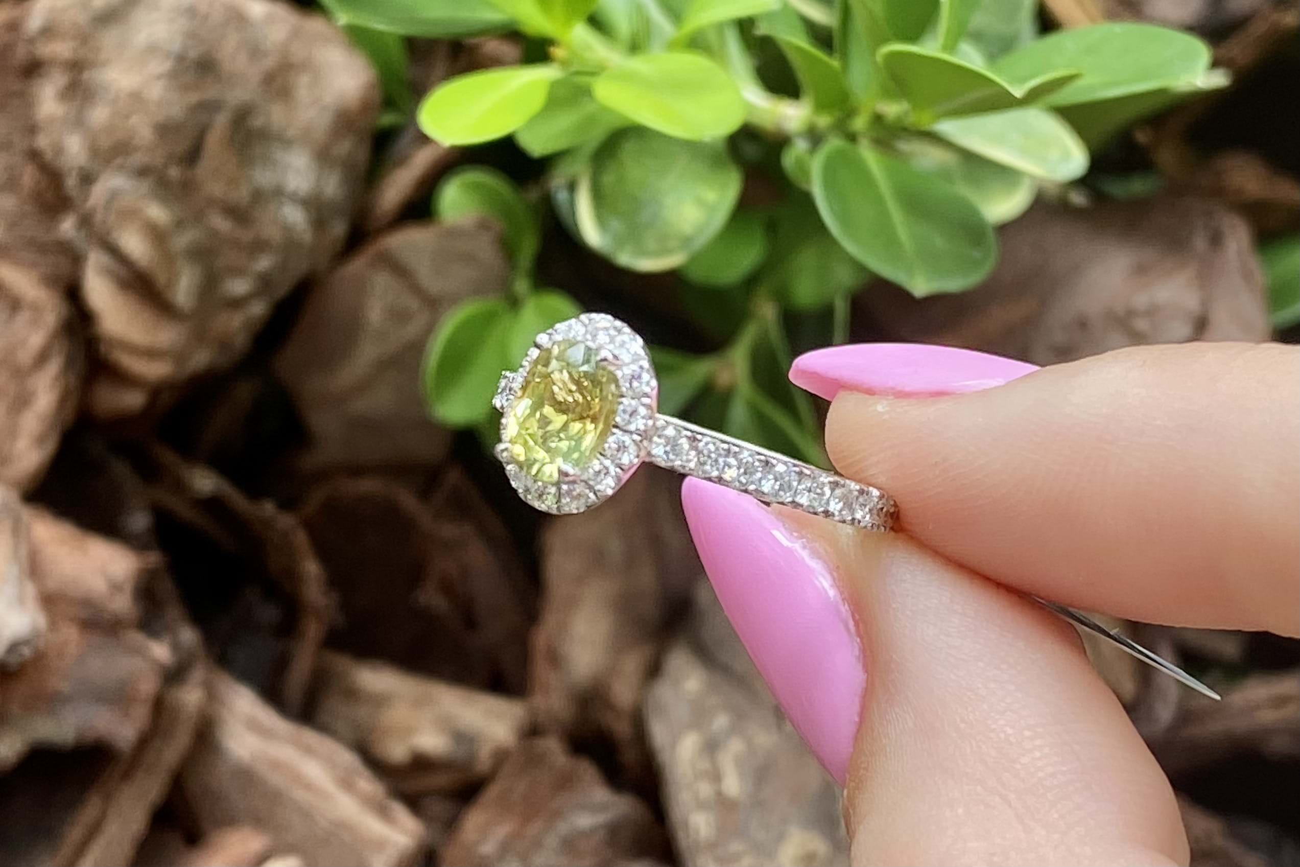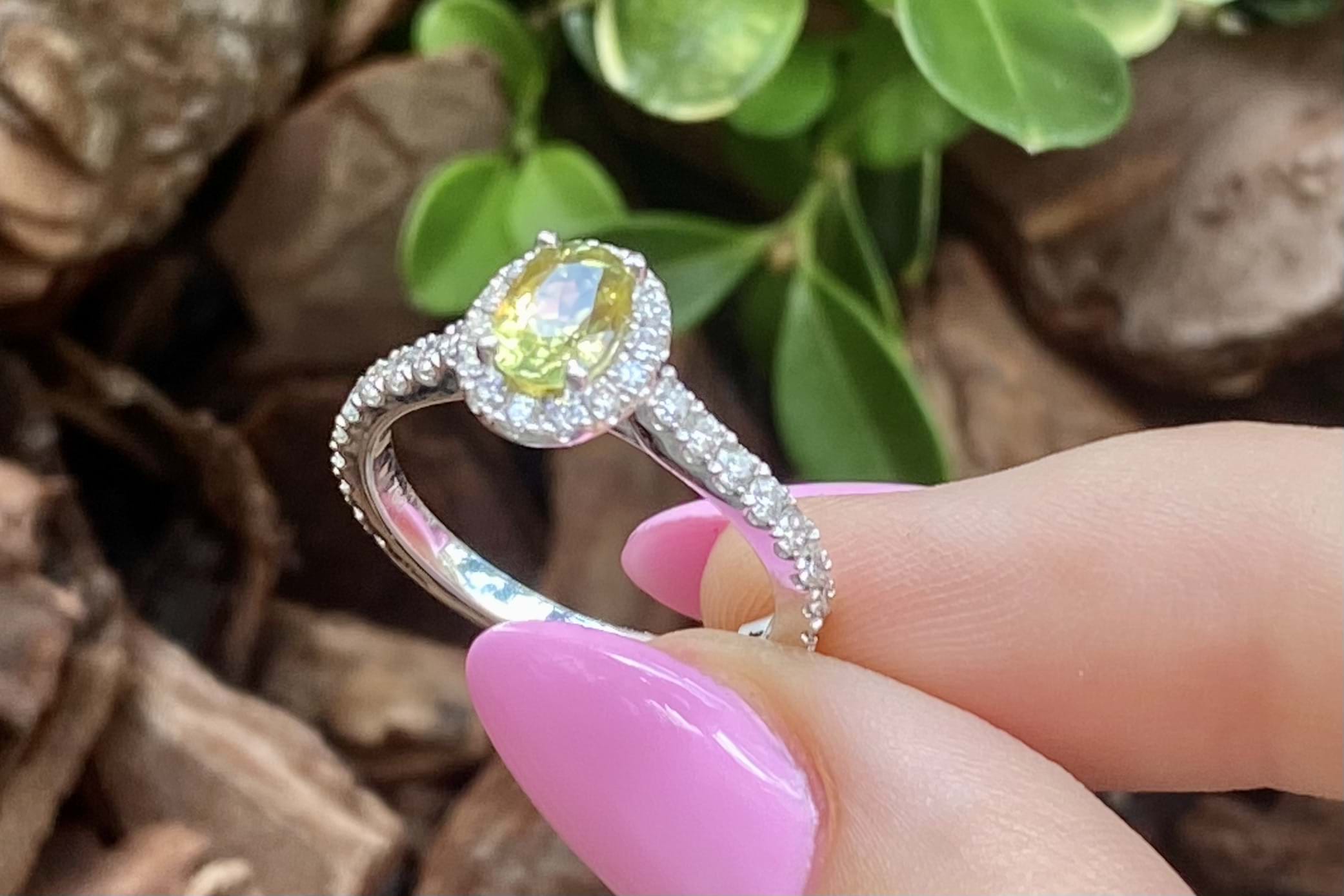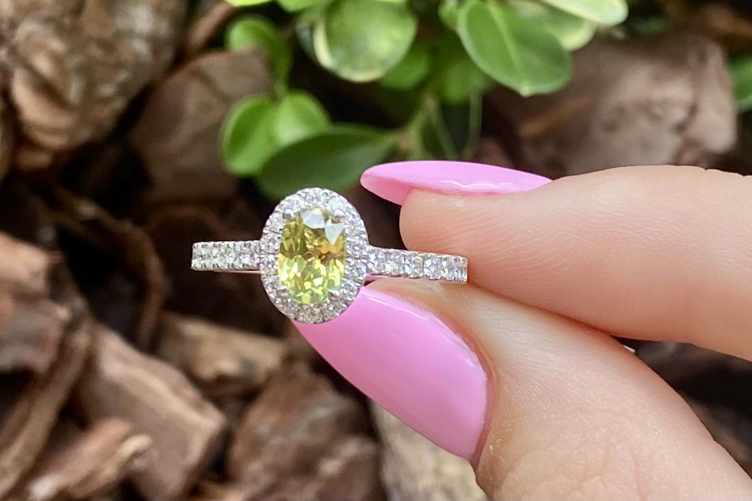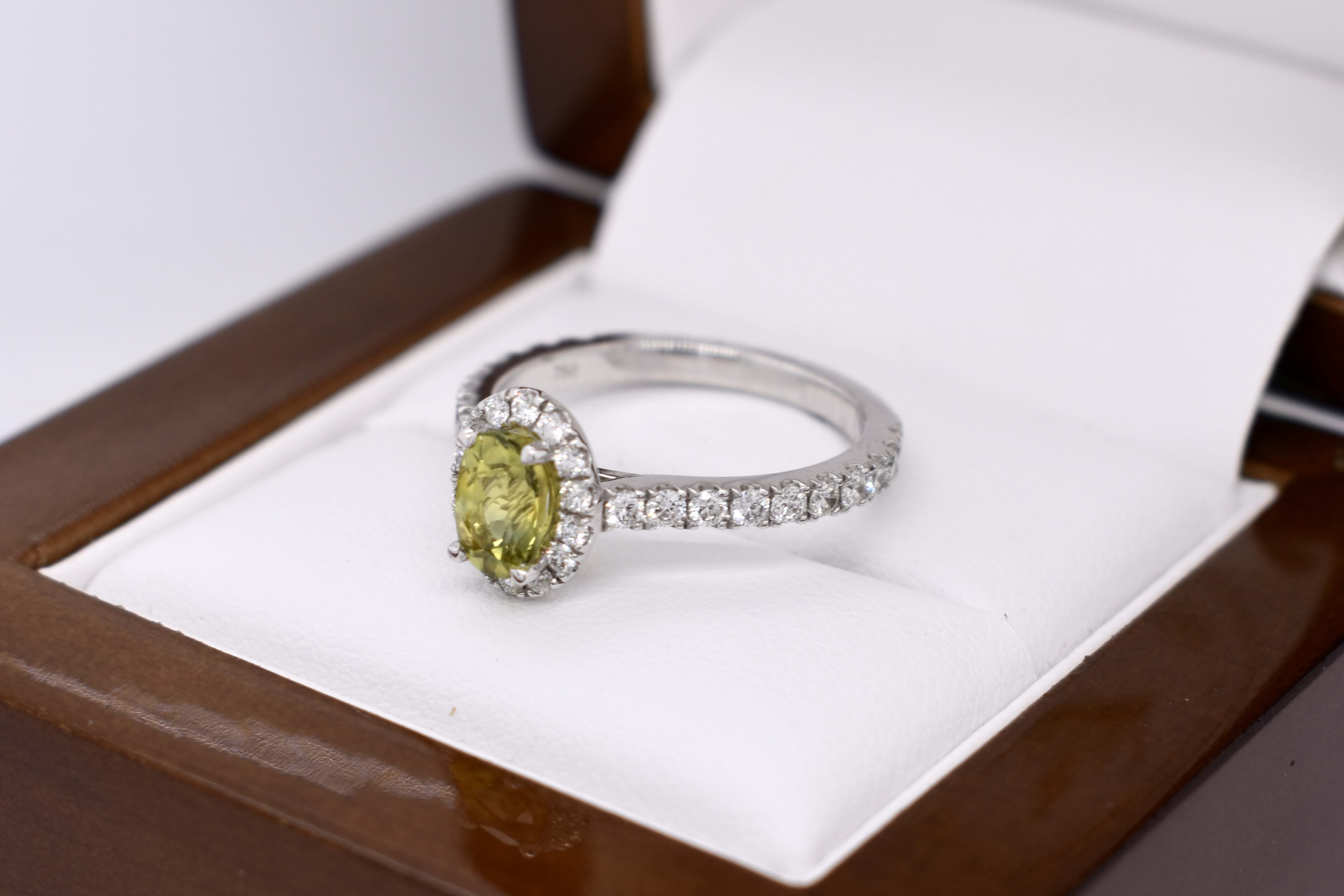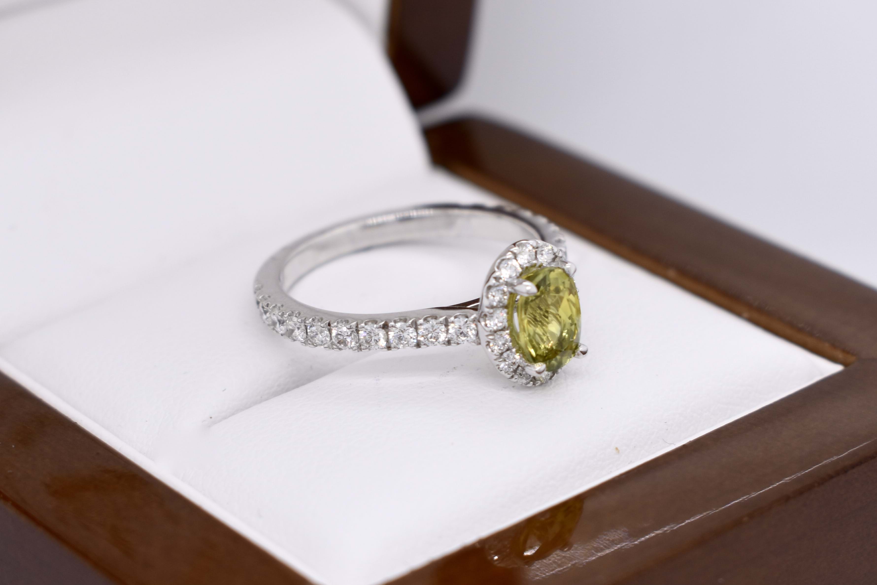 This beautiful 18ct white gold ring features a central oval Australian yellow parti sapphire of 0.99ct, four claw set. With a sparkling halo of round brilliant cut diamonds which continue down the band. The ring contains a total of 34 diamonds weighing 0.59ct GH SI total. Finger size M. Independent Valuation available upon purchase.