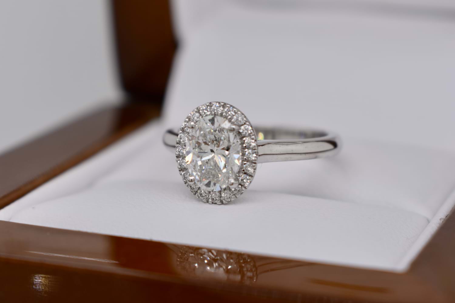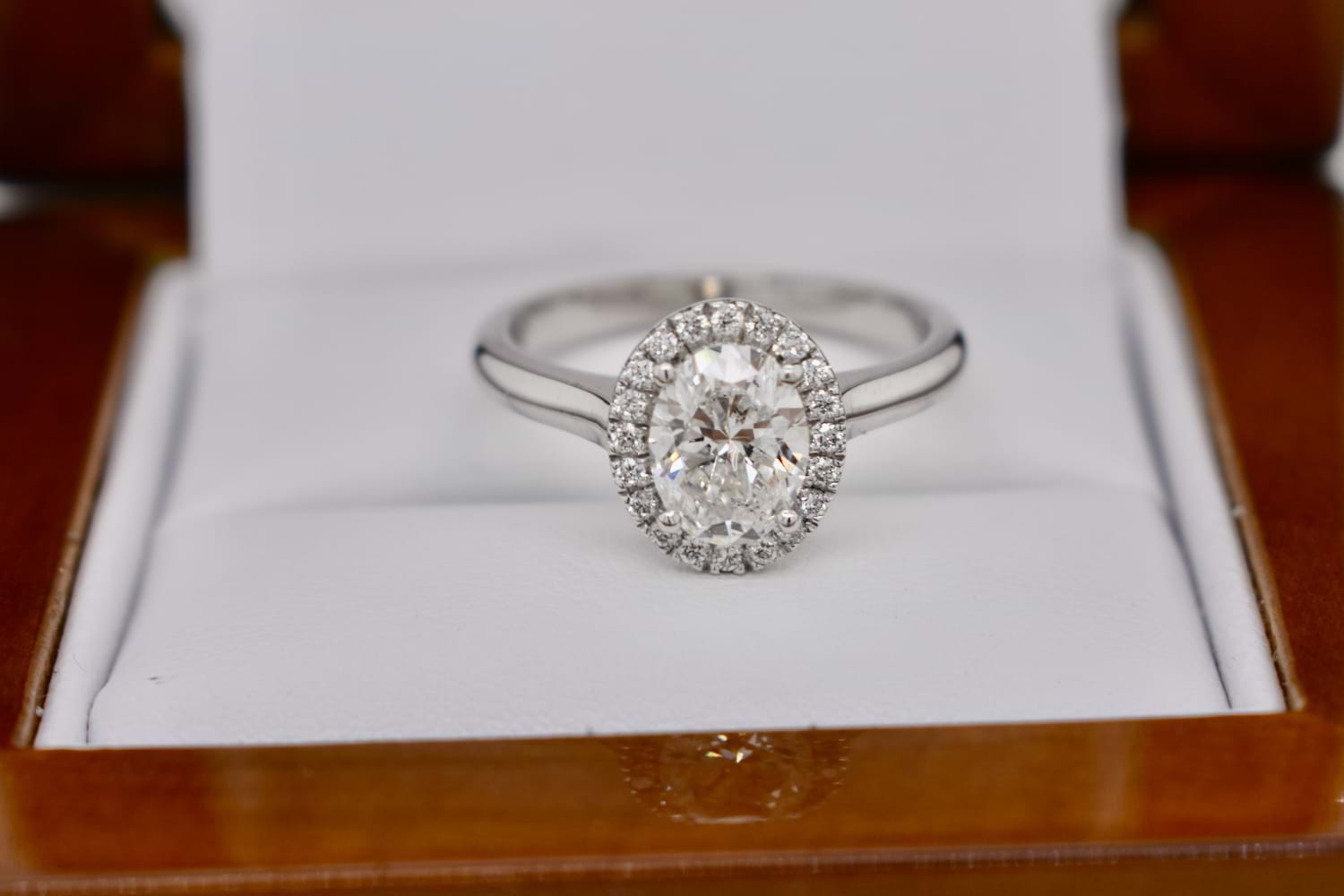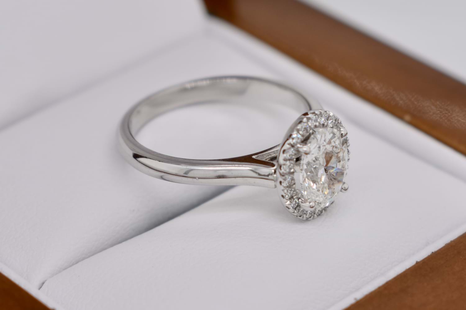 A scintillating and beautiful oval diamond halo ring crafted in 18ct white gold and featuring a central 1.01ct oval diamond (G/P1) four claw set with a single halo of shimmering round brilliant cut diamonds and a plain and classic band. The halo contains 22 diamonds equaling 0.12cts GSI, and the ring will sit perfectly with wedding bands. Finger size J+ Independent Valuation Supplied