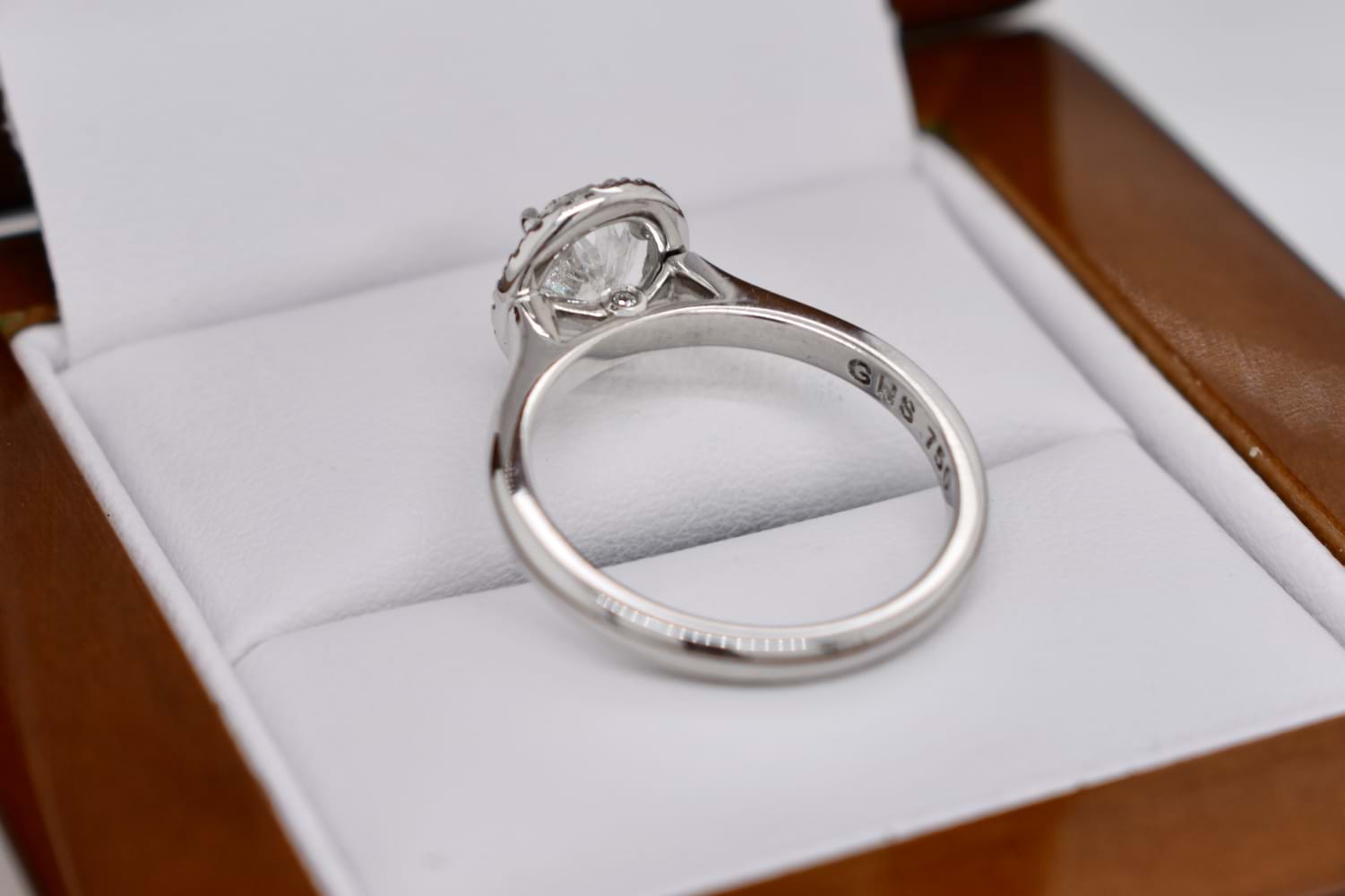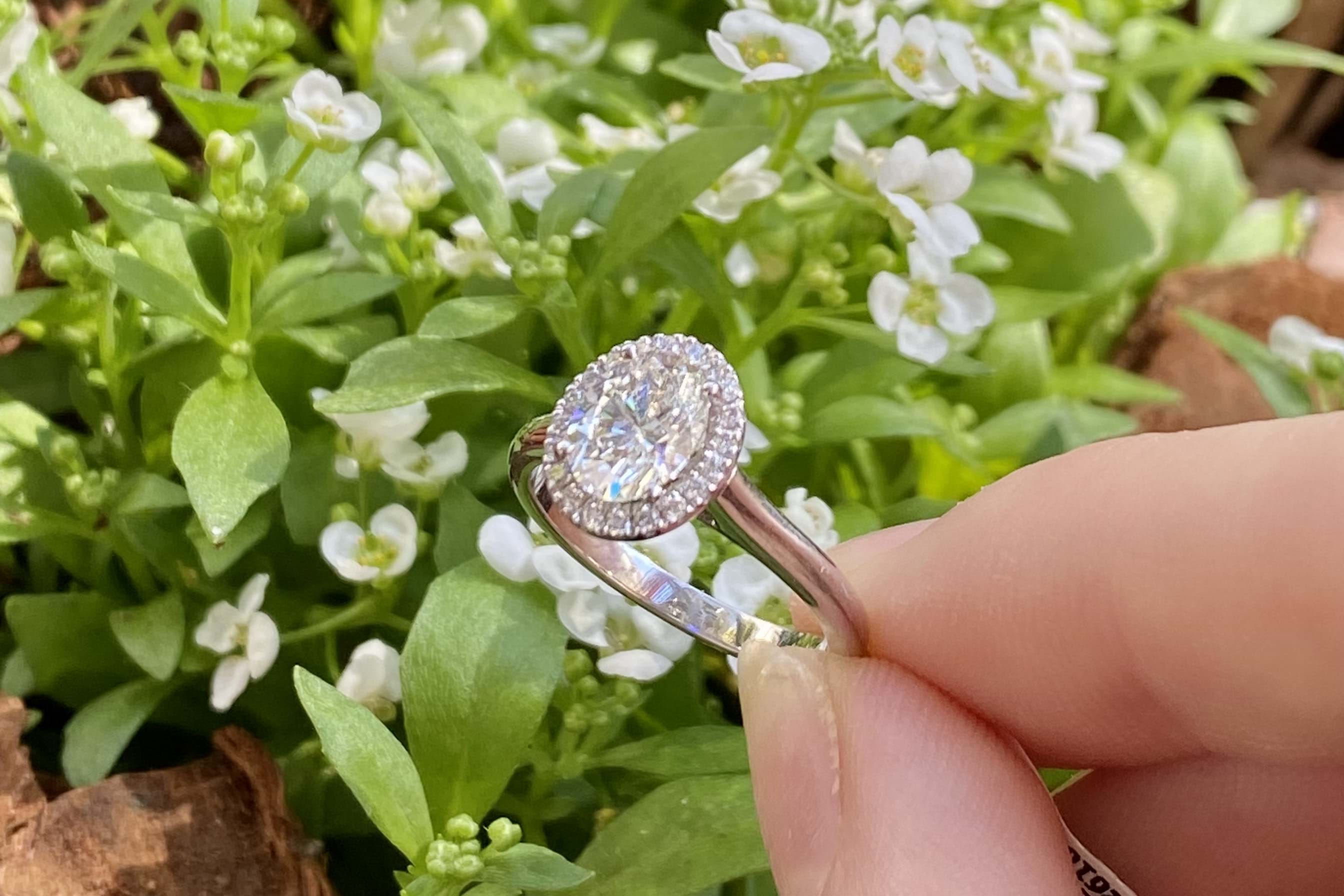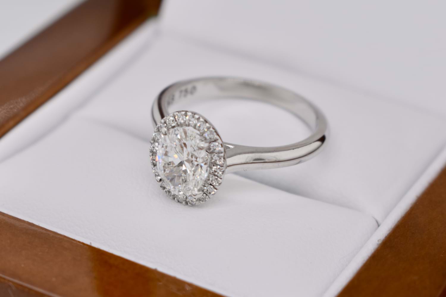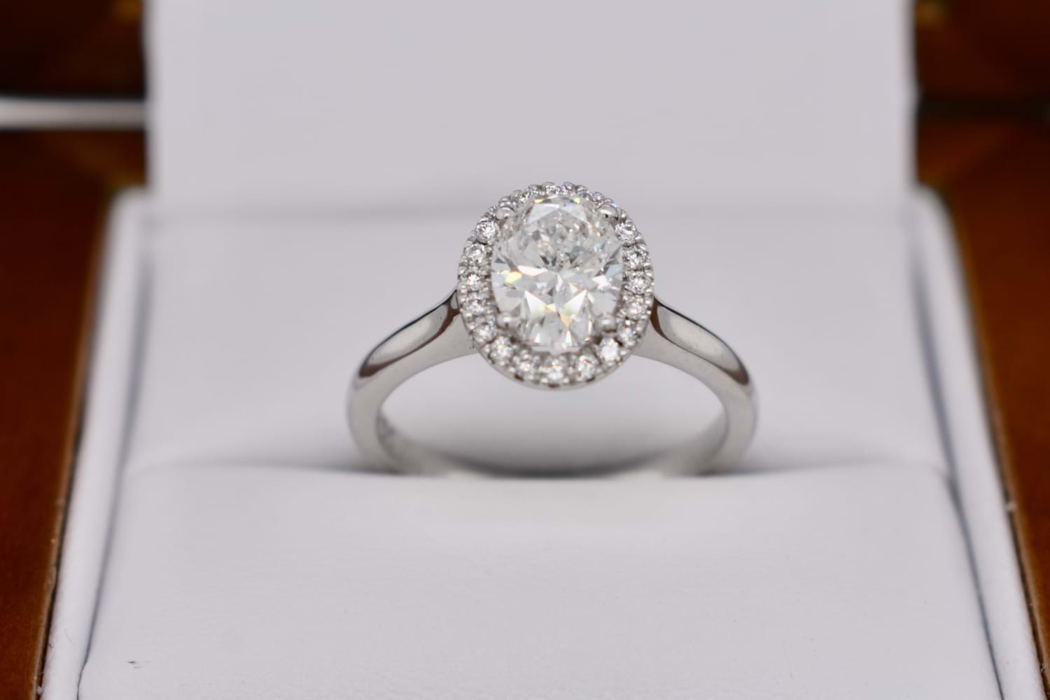 A scintillating and beautiful oval diamond halo ring crafted in 18ct white gold and featuring a central 1.01ct oval diamond (G/P1) four claw set with a single halo of shimmering round brilliant cut diamonds and a plain and classic band. The halo contains 22 diamonds equaling 0.12cts GSI, and the ring will sit perfectly with wedding bands. Finger size J+ Independent Valuation Supplied