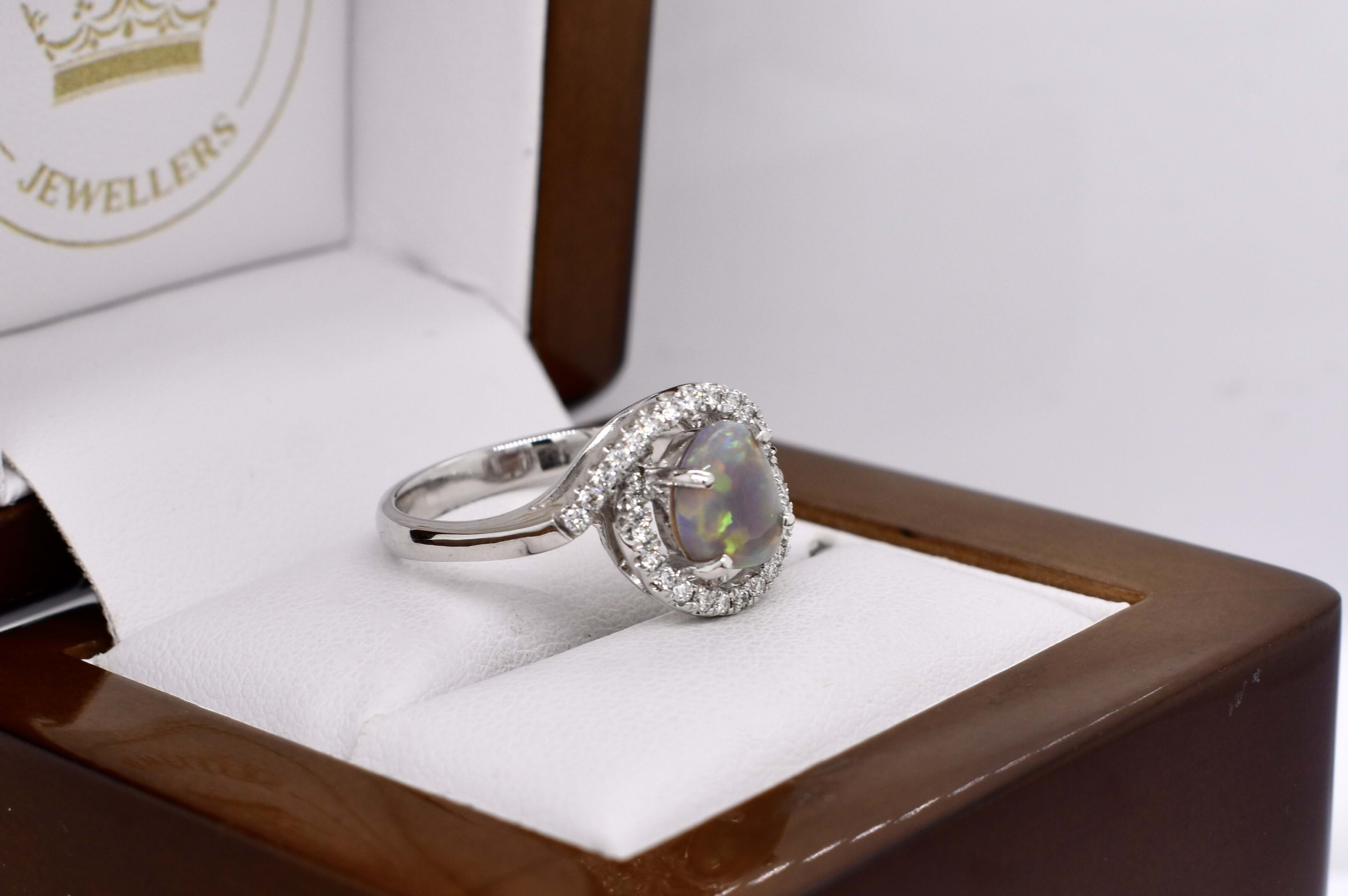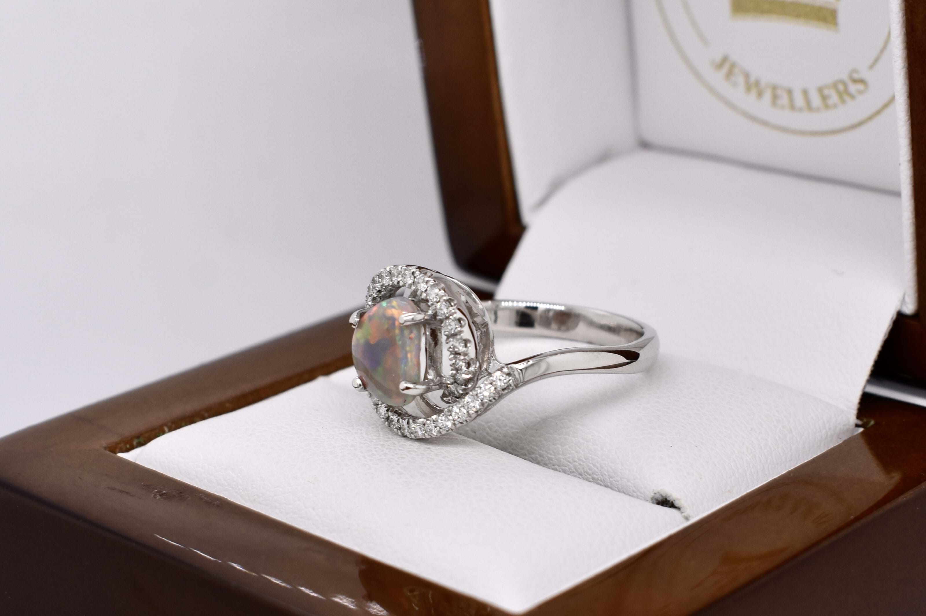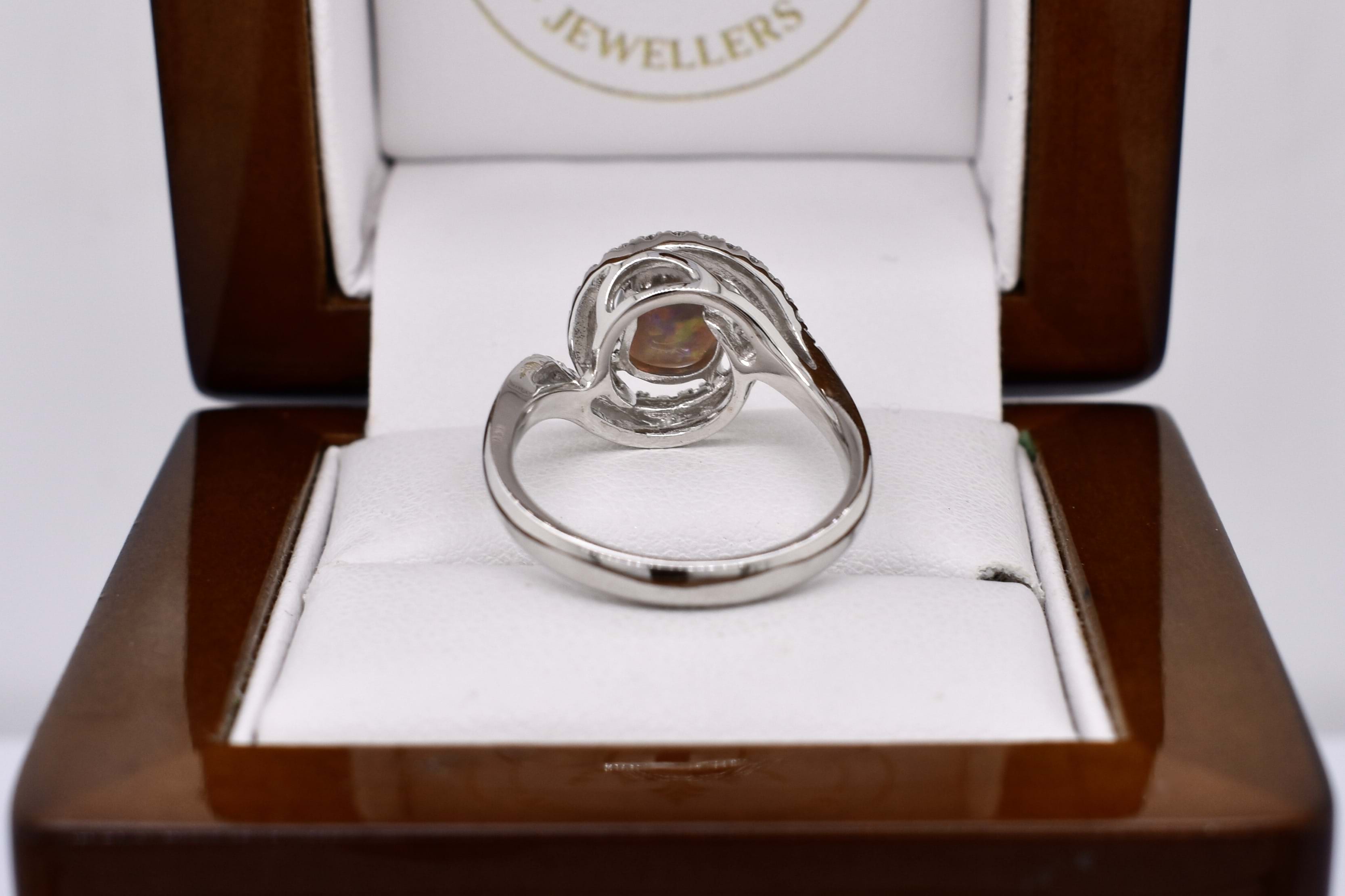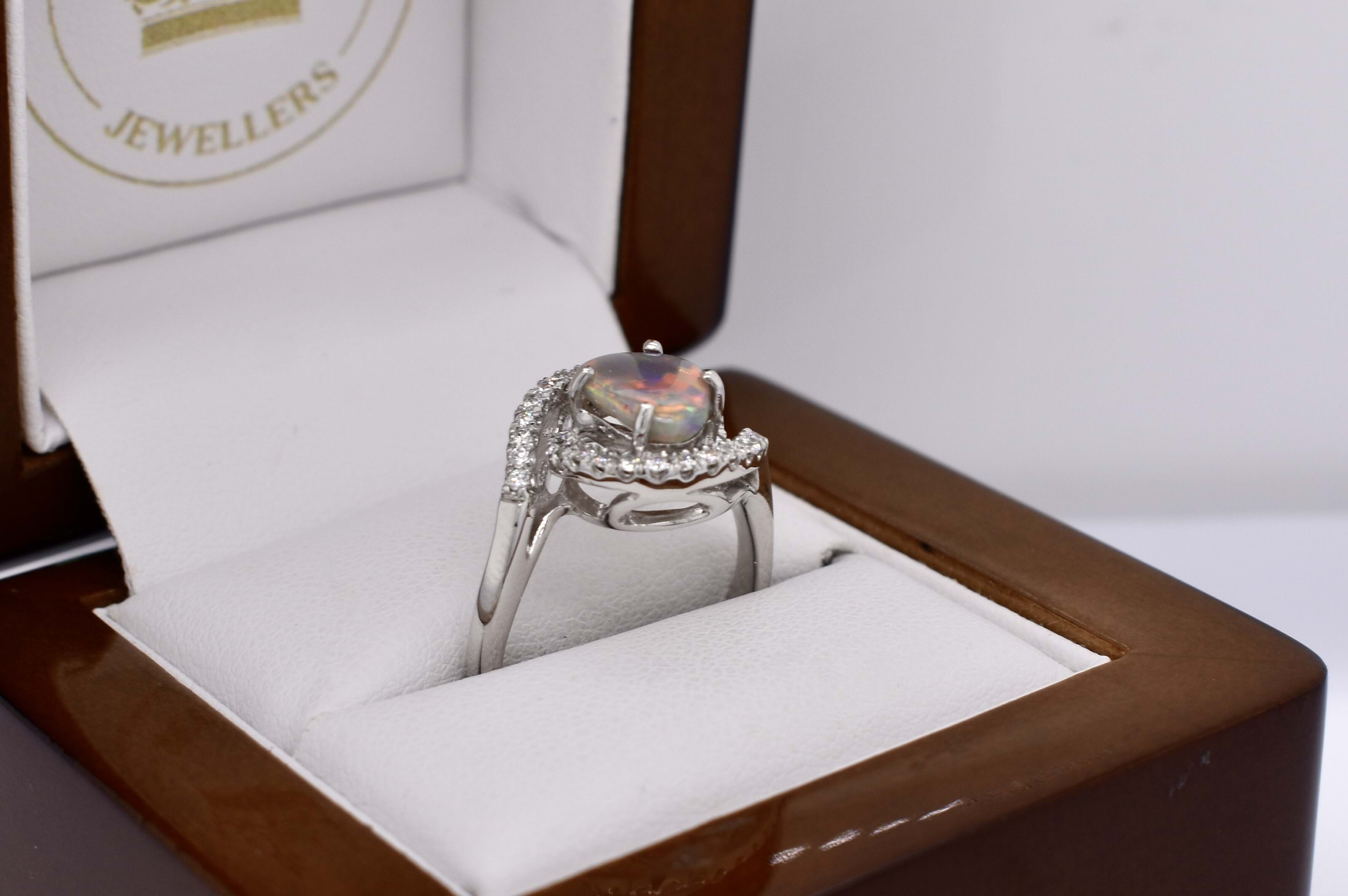 This lovely freeform ring featuring a Lightning Ridge solid opal of 1.03ct Lightning Ridge, measuring 8.00x6.45x3.1mm, with flashes of orange, blue and green throughout. The opal is four claw set in 18ct white gold, surrounded by a swirl border of 32 round brilliant cut diamonds, measuring 1.30-1.20mm, totalling 0.28ct G SI. Finished on a half round 2.82mm tapered band. Finger size N+. Independent Valuation Supplied.