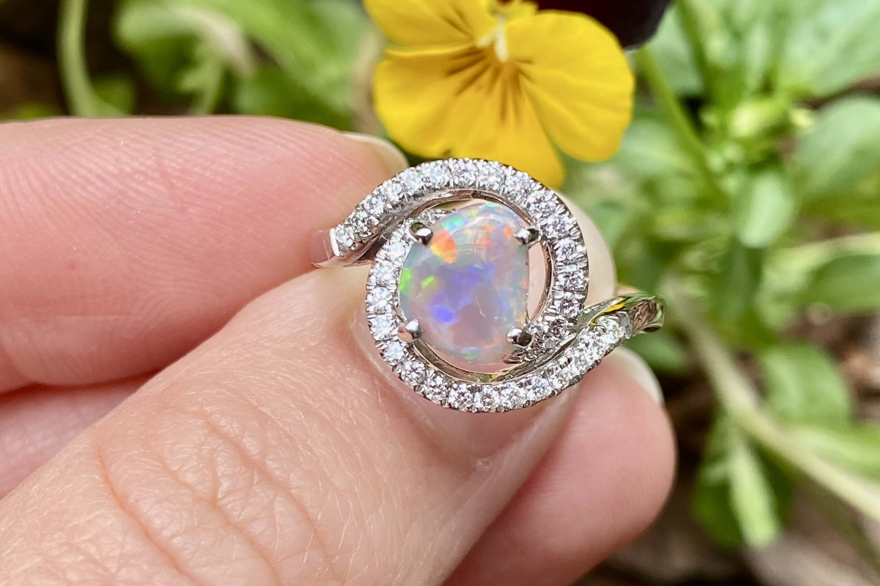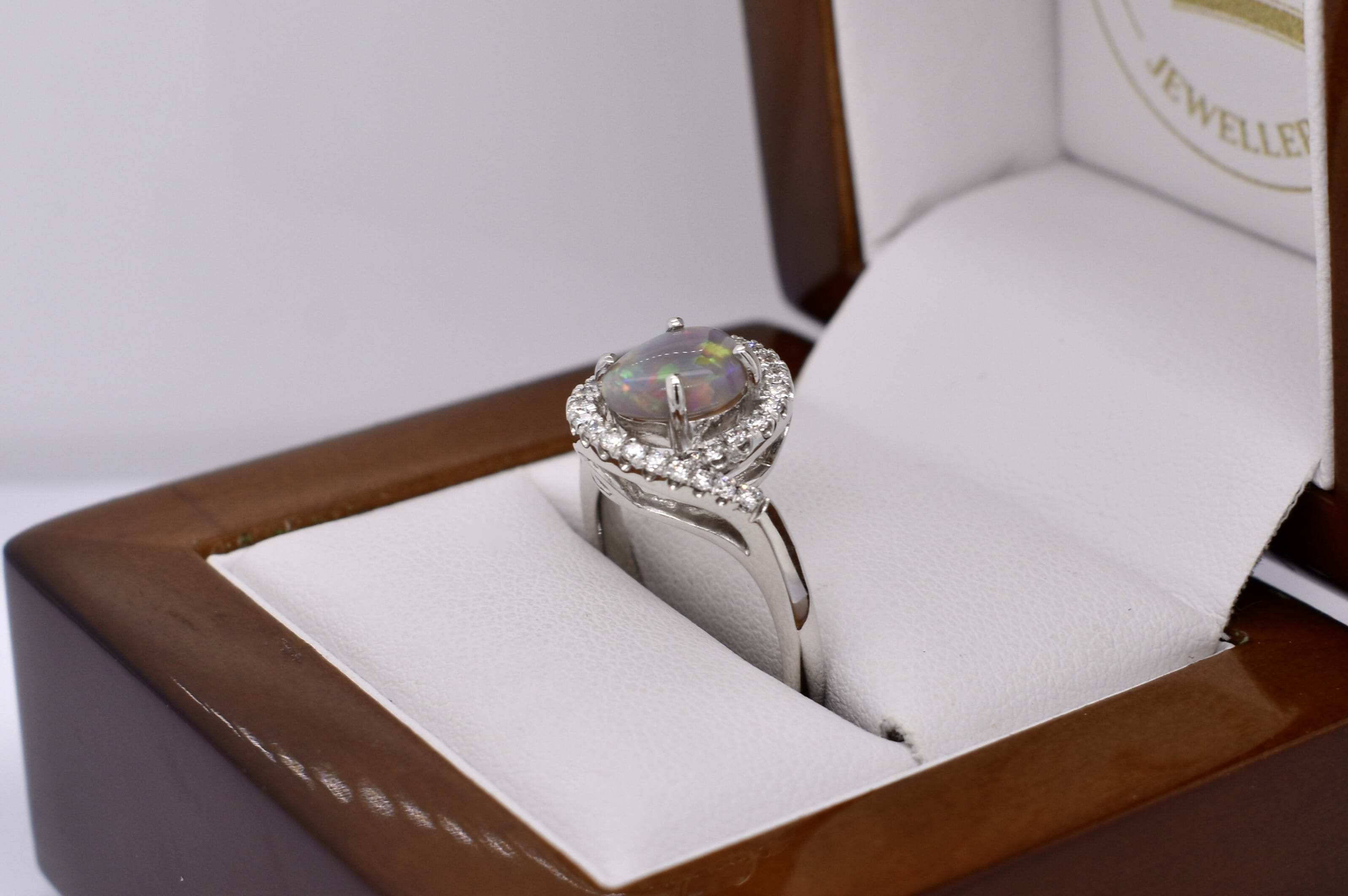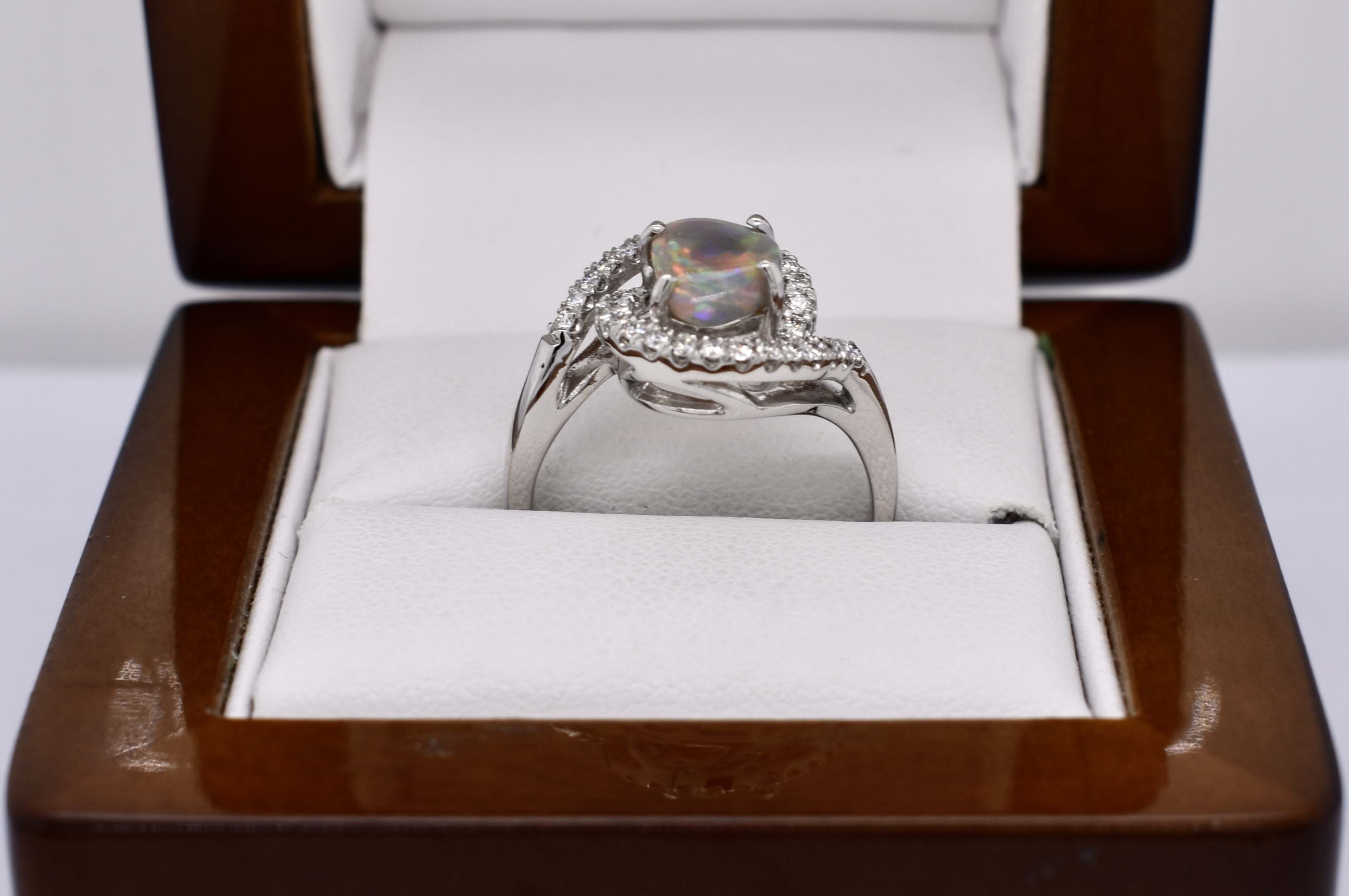 This lovely freeform ring featuring a Lightning Ridge solid opal of 1.03ct Lightning Ridge, measuring 8.00x6.45x3.1mm, with flashes of orange, blue and green throughout. The opal is four claw set in 18ct white gold, surrounded by a swirl border of 32 round brilliant cut diamonds, measuring 1.30-1.20mm, totalling 0.28ct G SI. Finished on a half round 2.82mm tapered band. Finger size N+. Independent Valuation Supplied.
