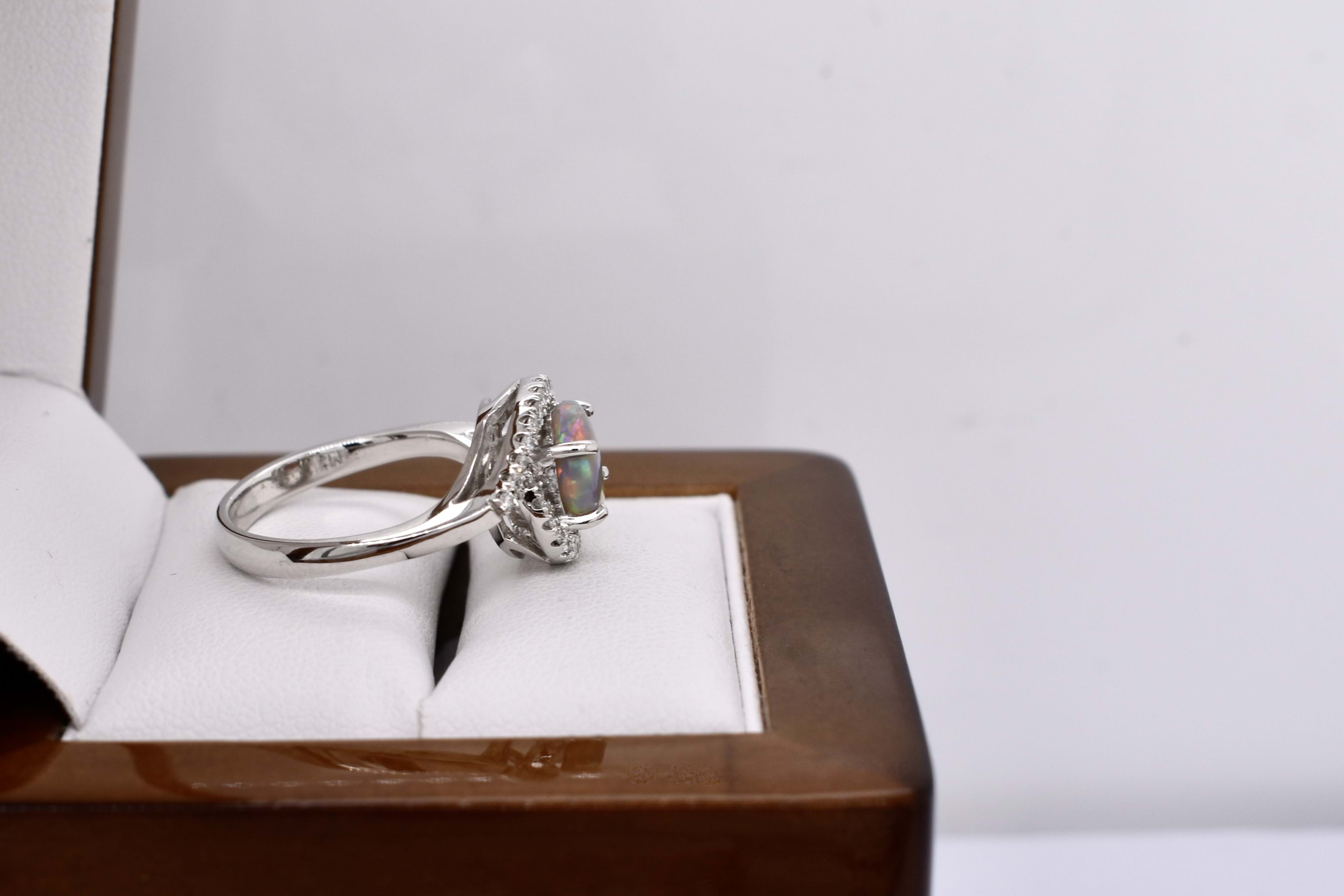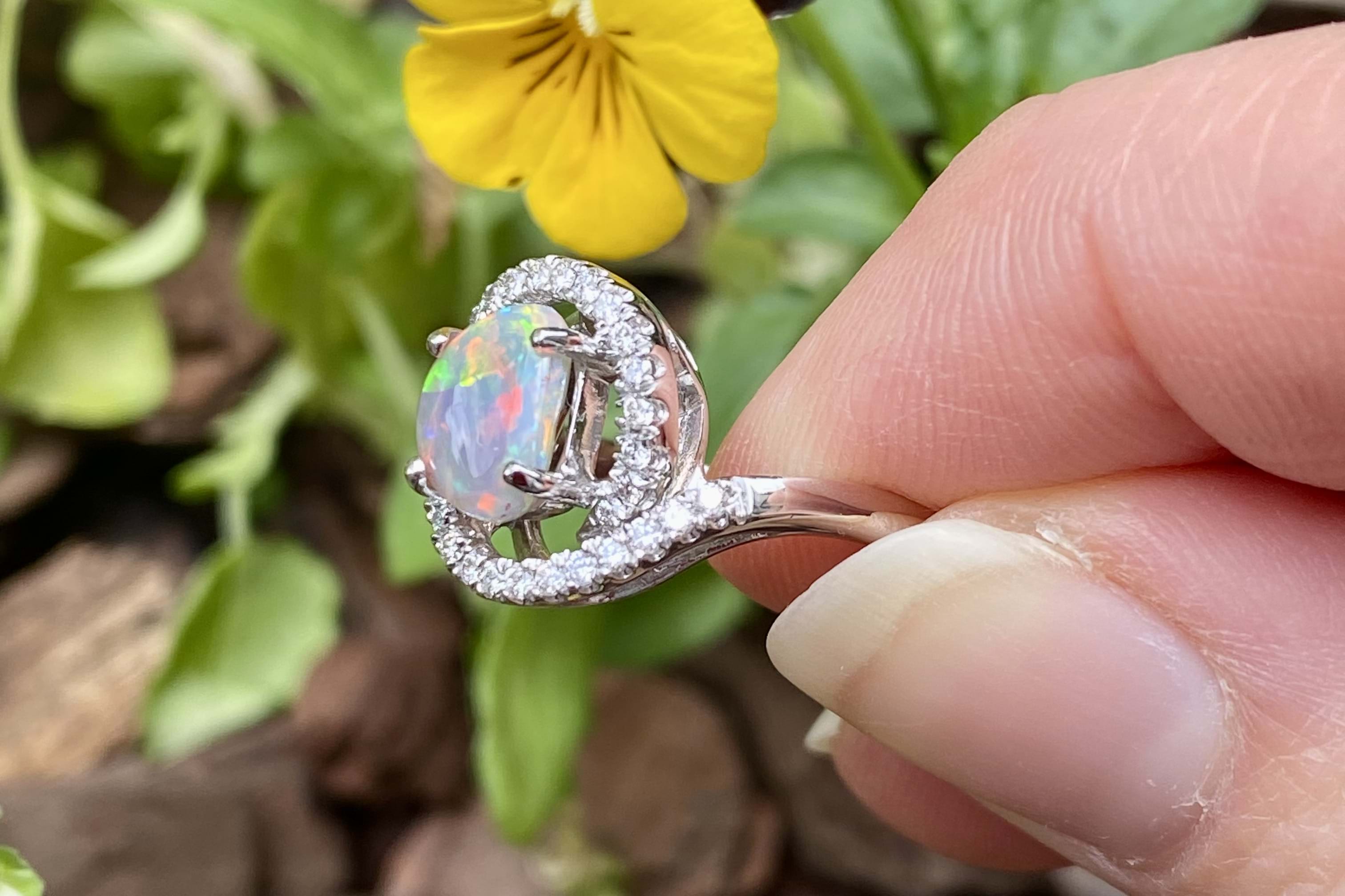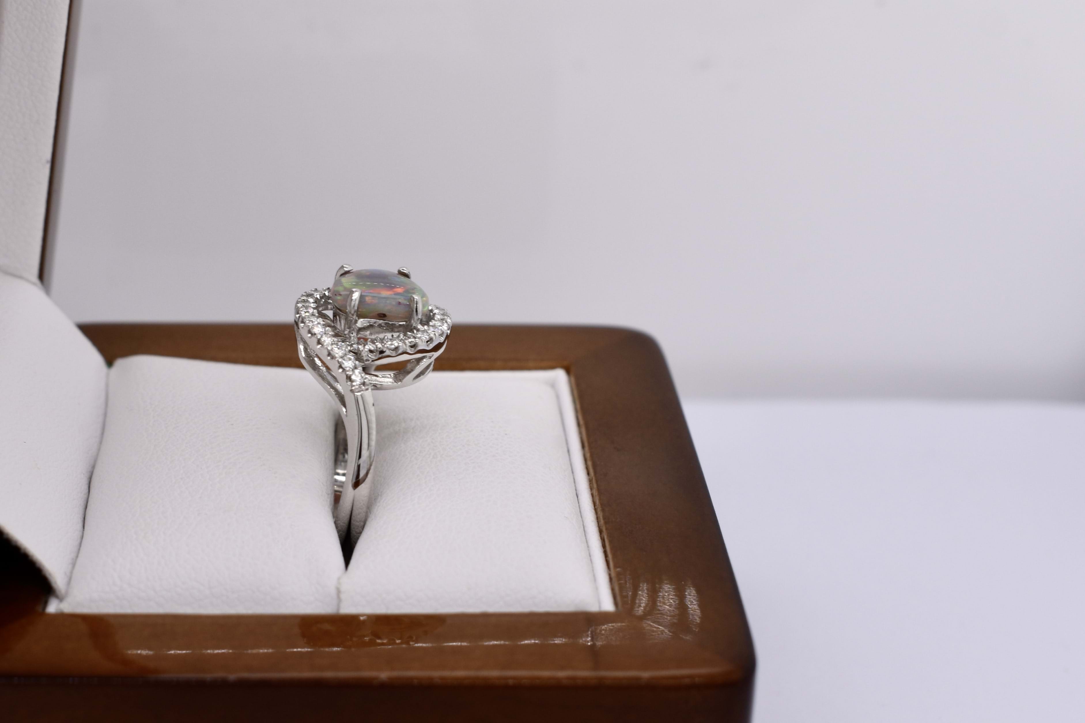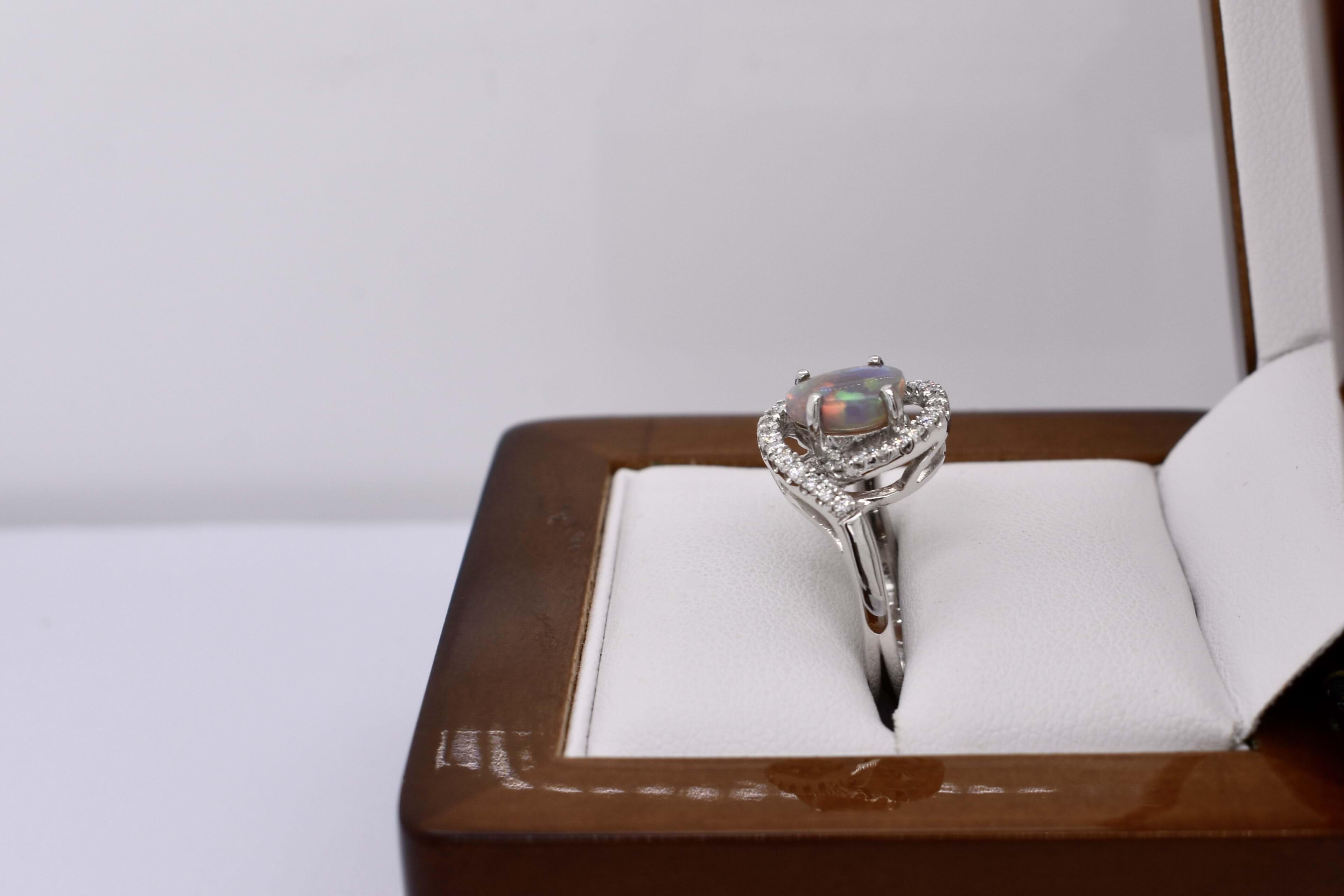 This lovely freeform ring featuring a Lightning Ridge solid opal of 1.03ct Lightning Ridge, measuring 8.00x6.45x3.1mm, with flashes of orange, blue and green throughout. The opal is four claw set in 18ct white gold, surrounded by a swirl border of 32 round brilliant cut diamonds, measuring 1.30-1.20mm, totalling 0.28ct G SI. Finished on a half round 2.82mm tapered band. Finger size N+. Independent Valuation Supplied.