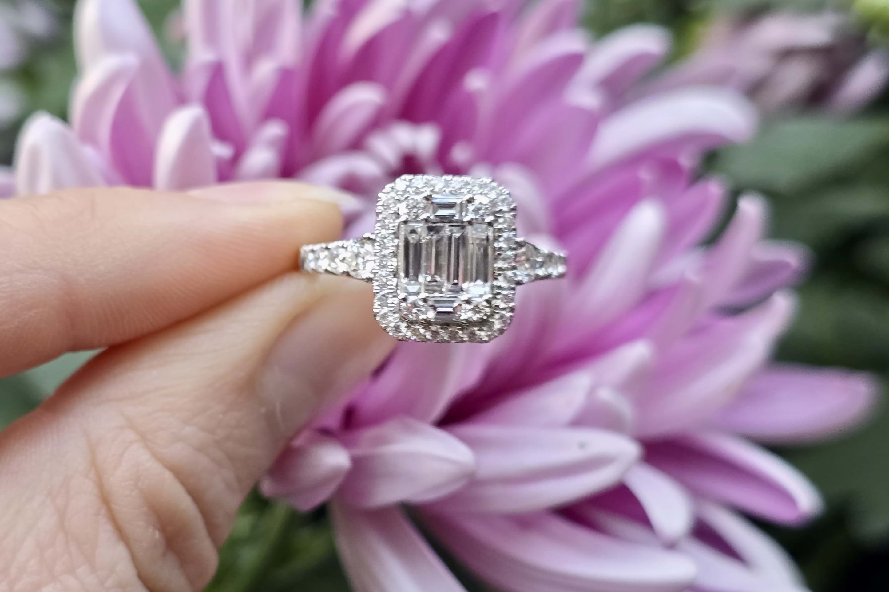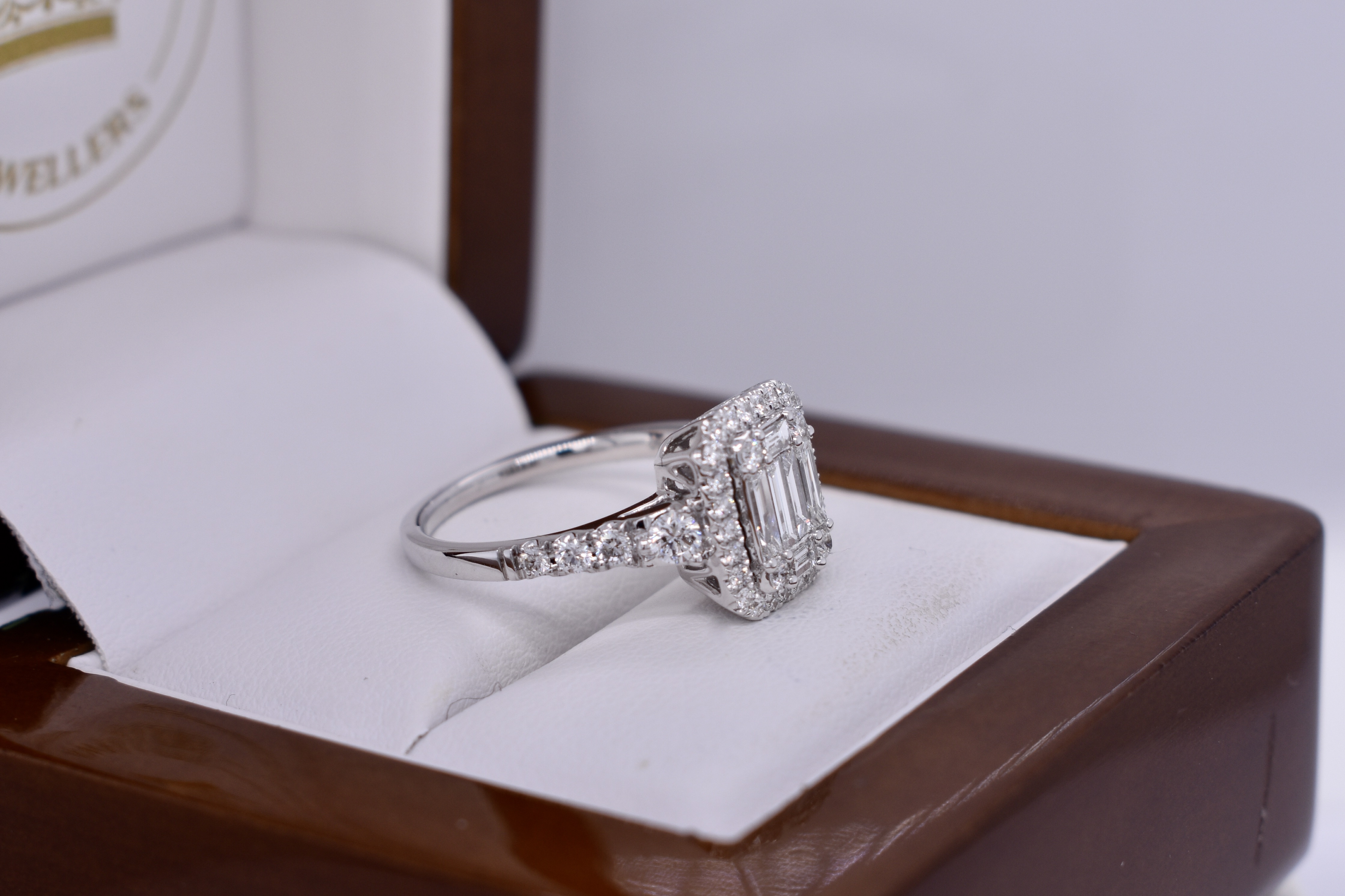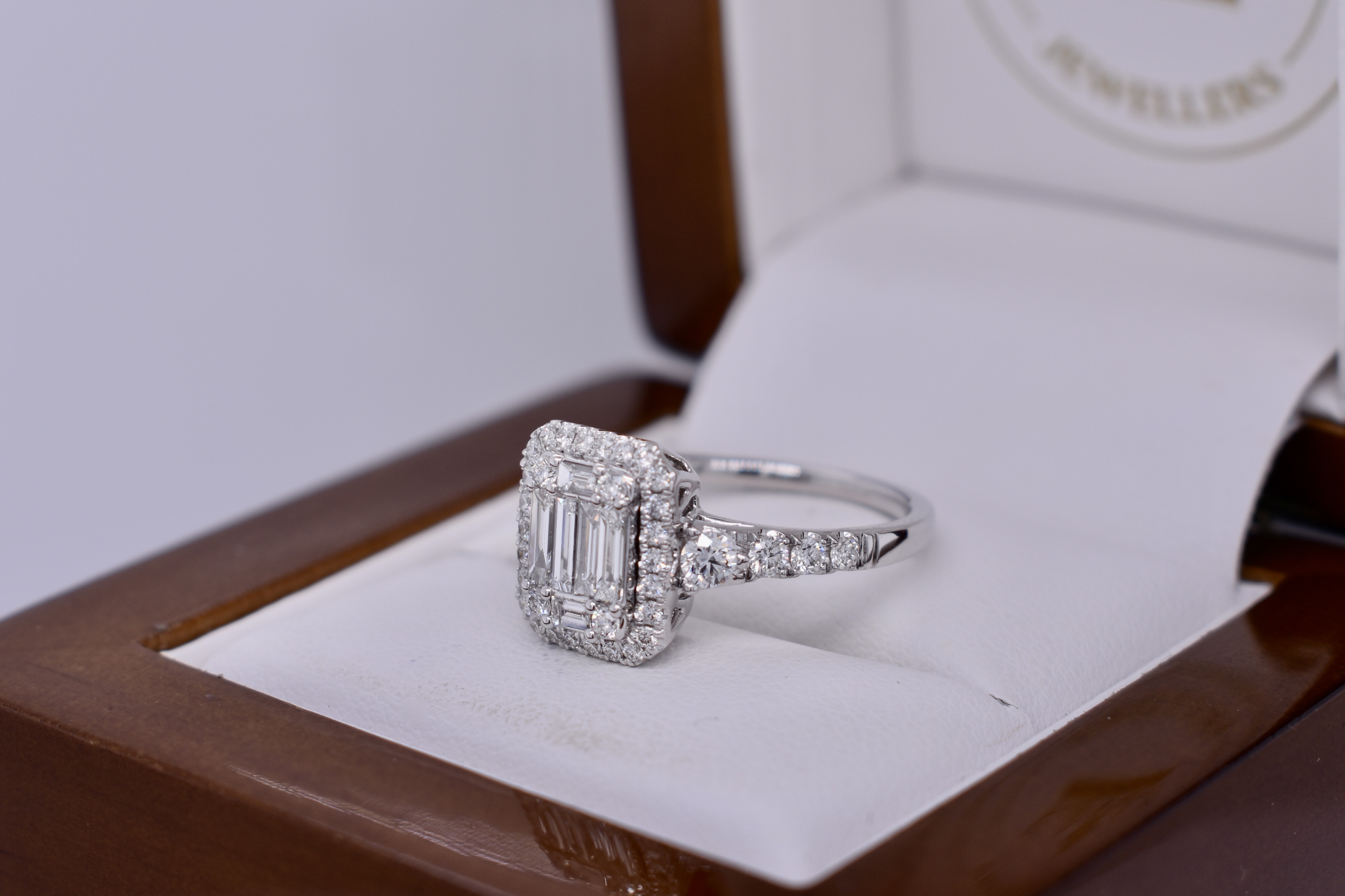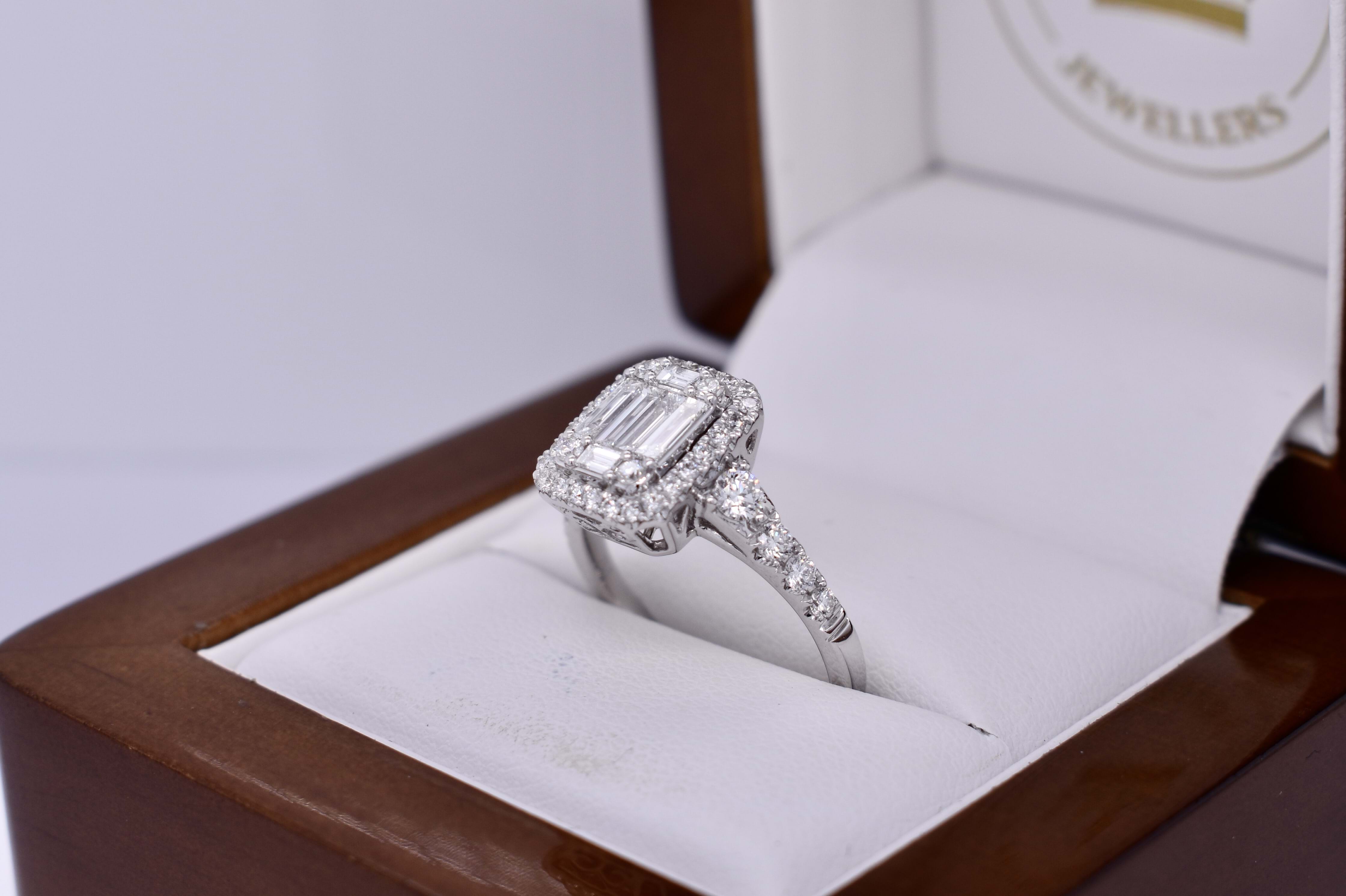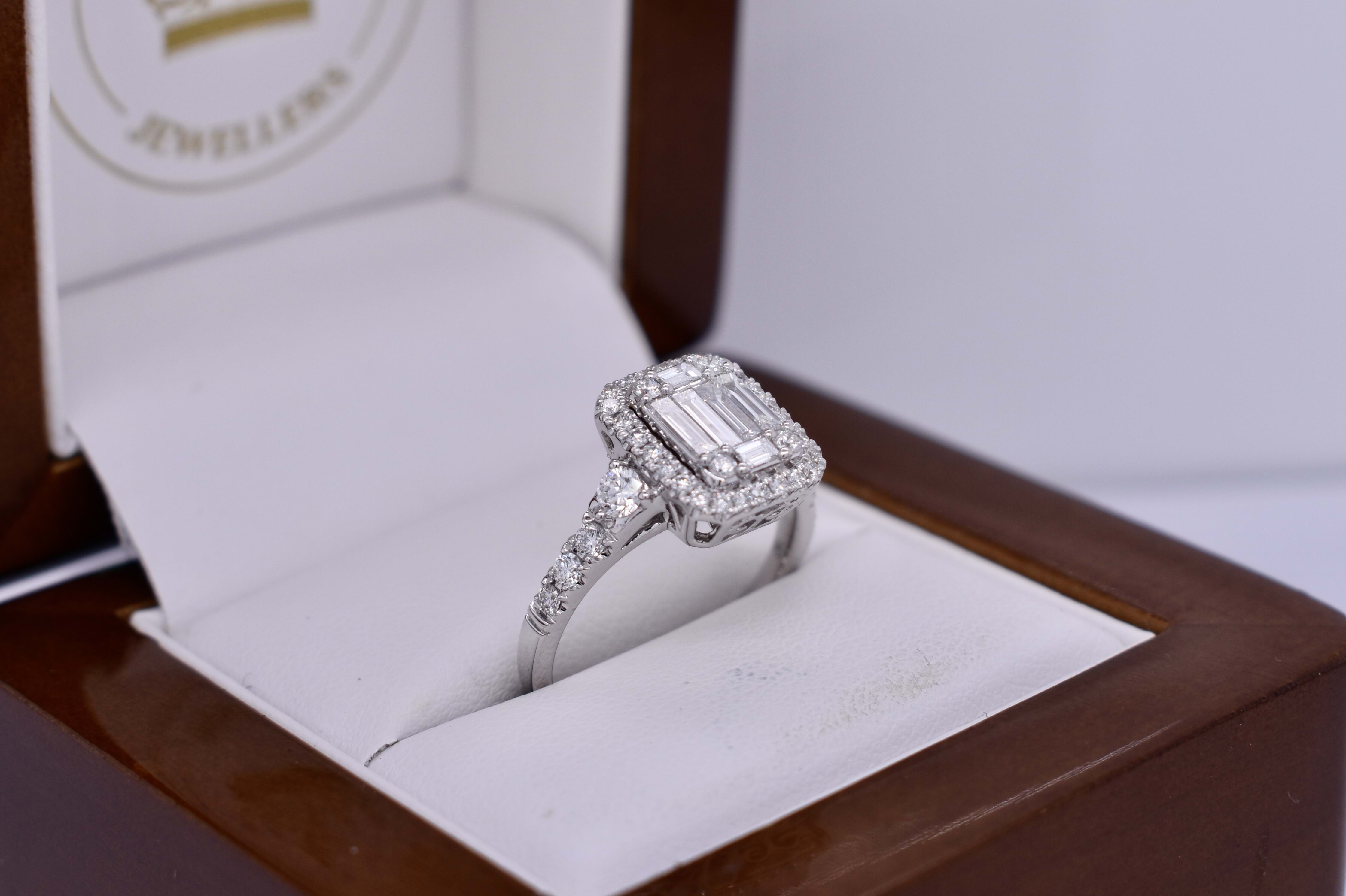 Elegant and sparkling, this 18ct white gold diamond cluster illusion ring features six baguette diamonds, equalling 0.43ct FG VS-SI, set in cross shape with round brilliant diamonds in the corners, further set with a gapped halo of round diamonds and diamonds continuing down the band. With 38 round diamonds equalling 0.62ct FG VS-SI and a total diamond weight of 1.05ct altogether. Finger size M.