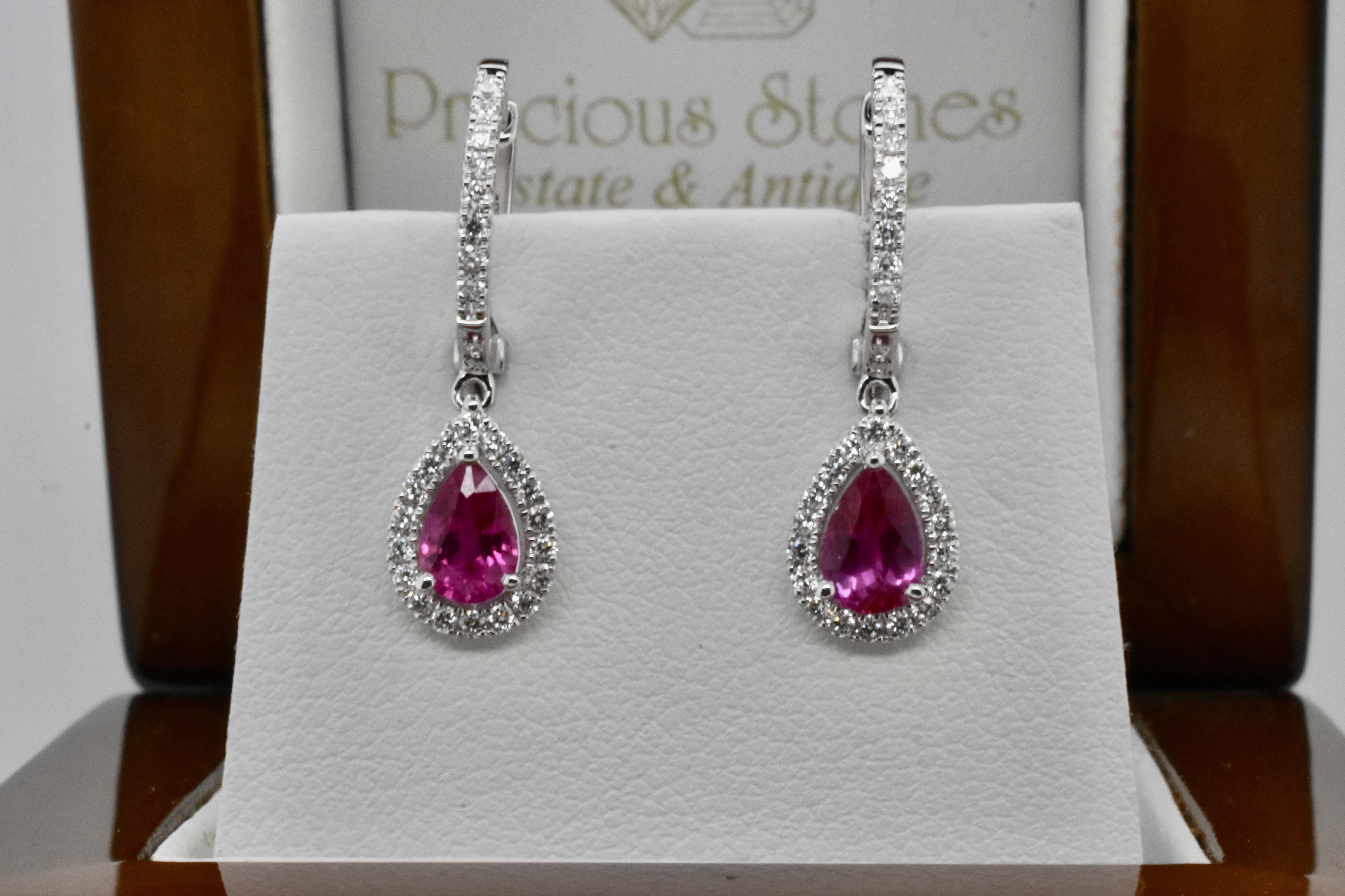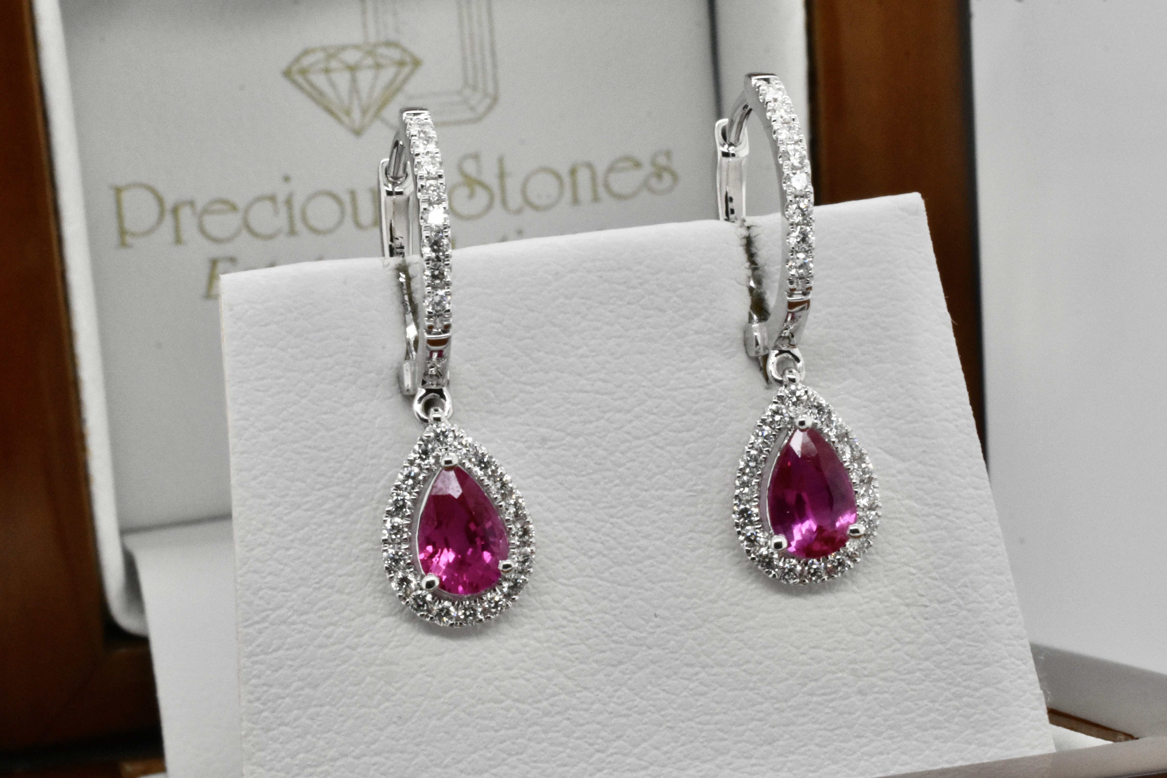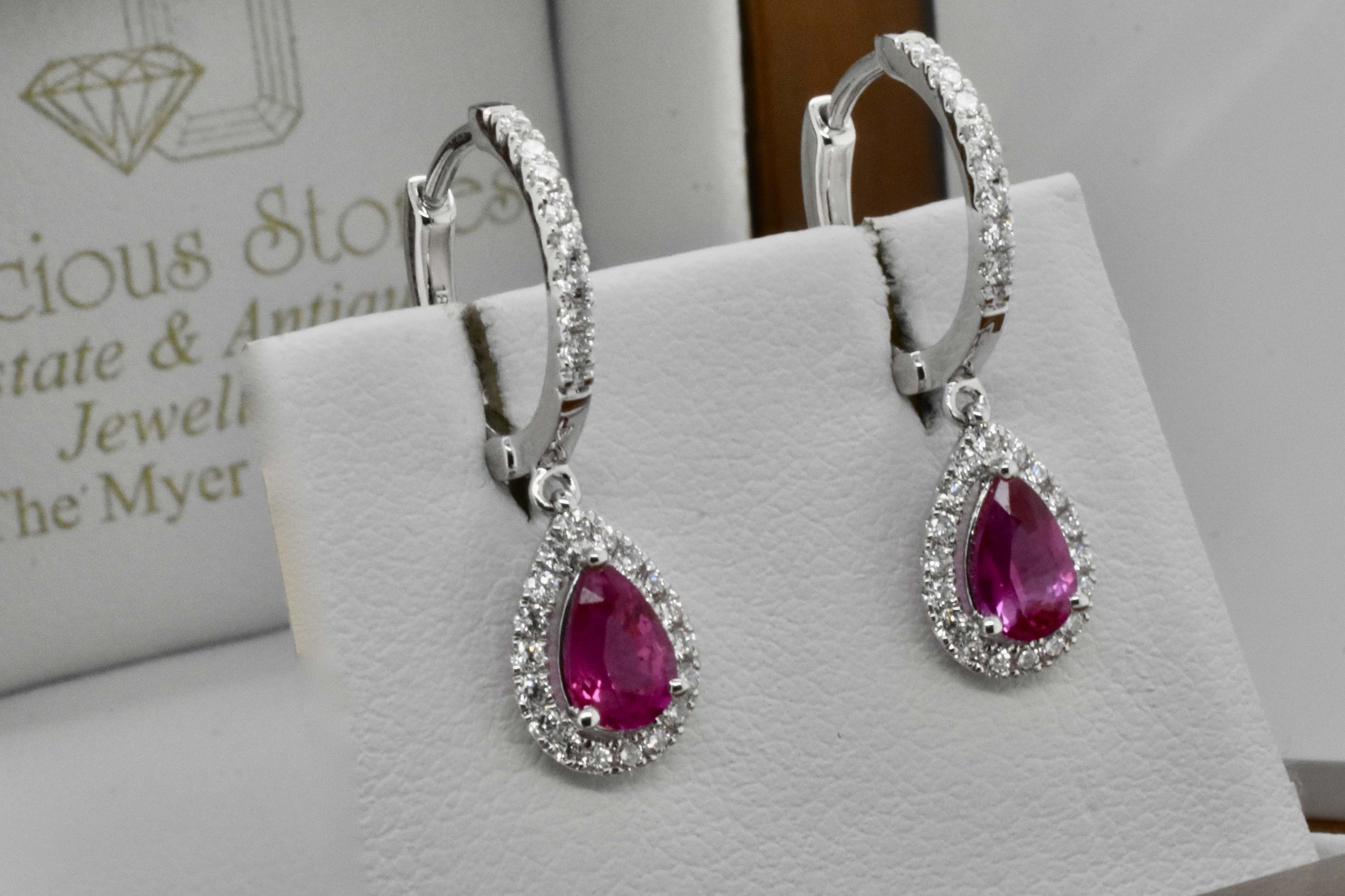 A sparkling pair of drop earrings set in 18ct white gold with two lovely pinkish red pear shape rubies totalling 1.07ct with a shimmering white G/VS RBC diamond halo (total of 52 equalling 0.31ct) and suspended from diamond set huggies. Independent Valuation Supplied