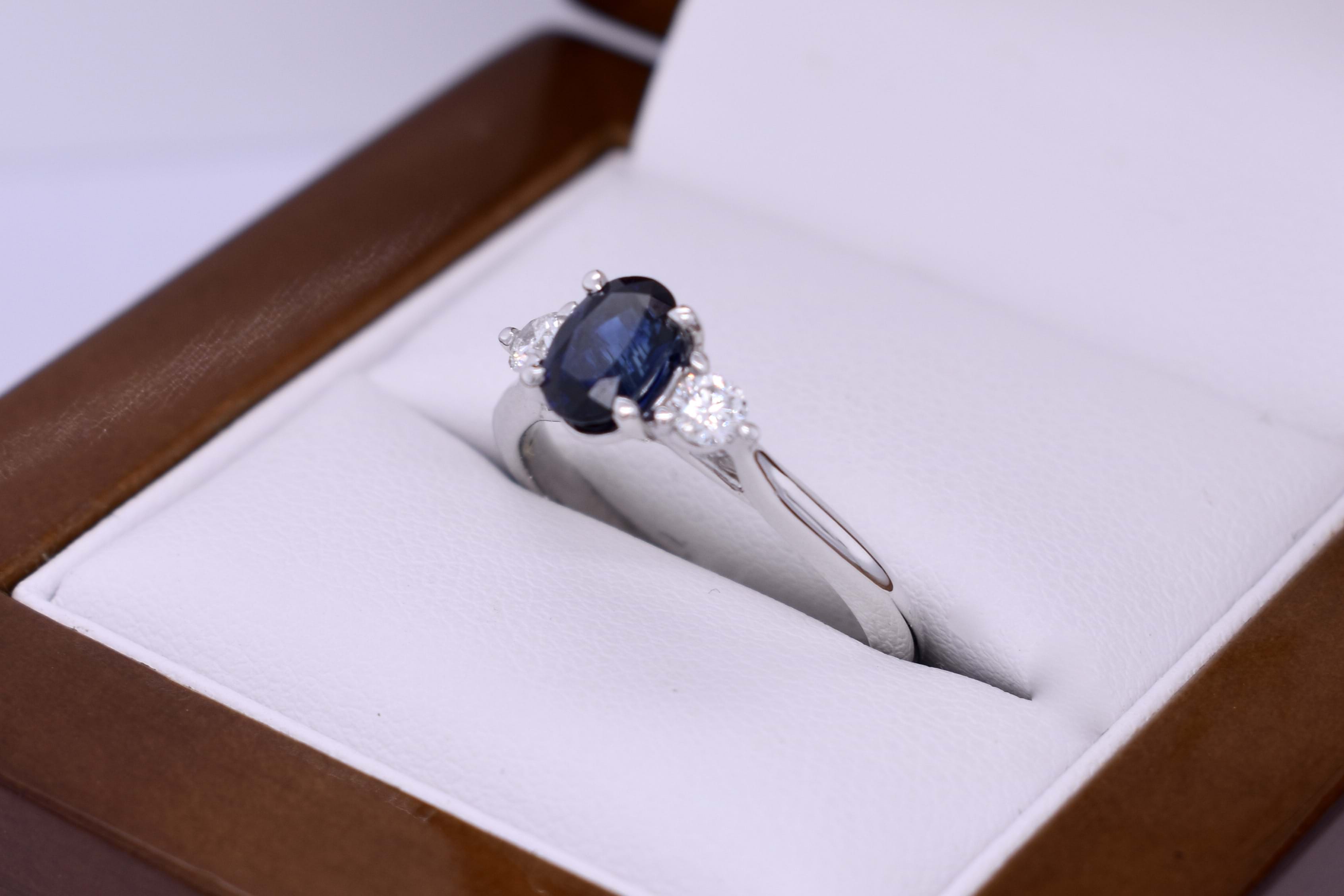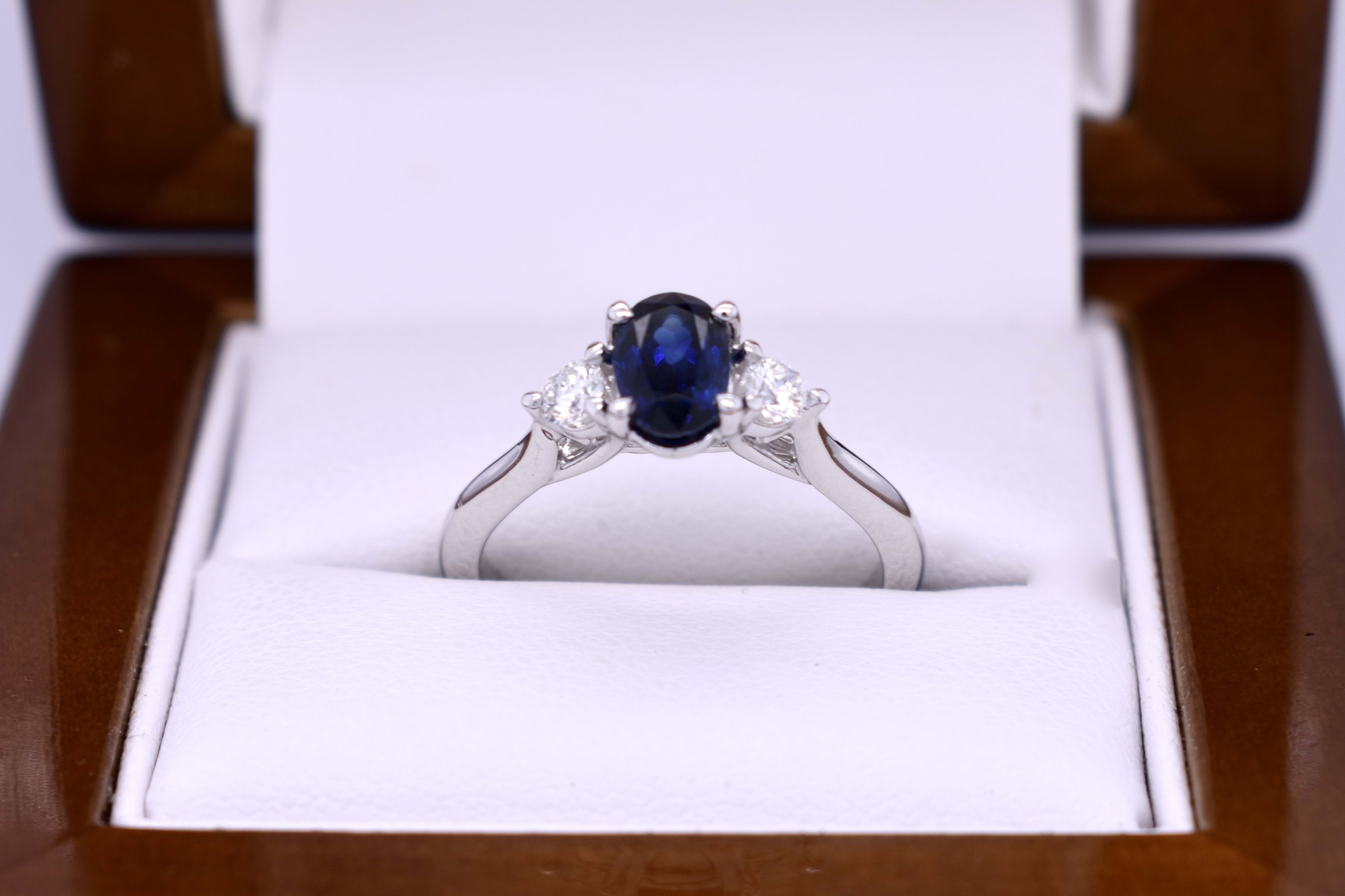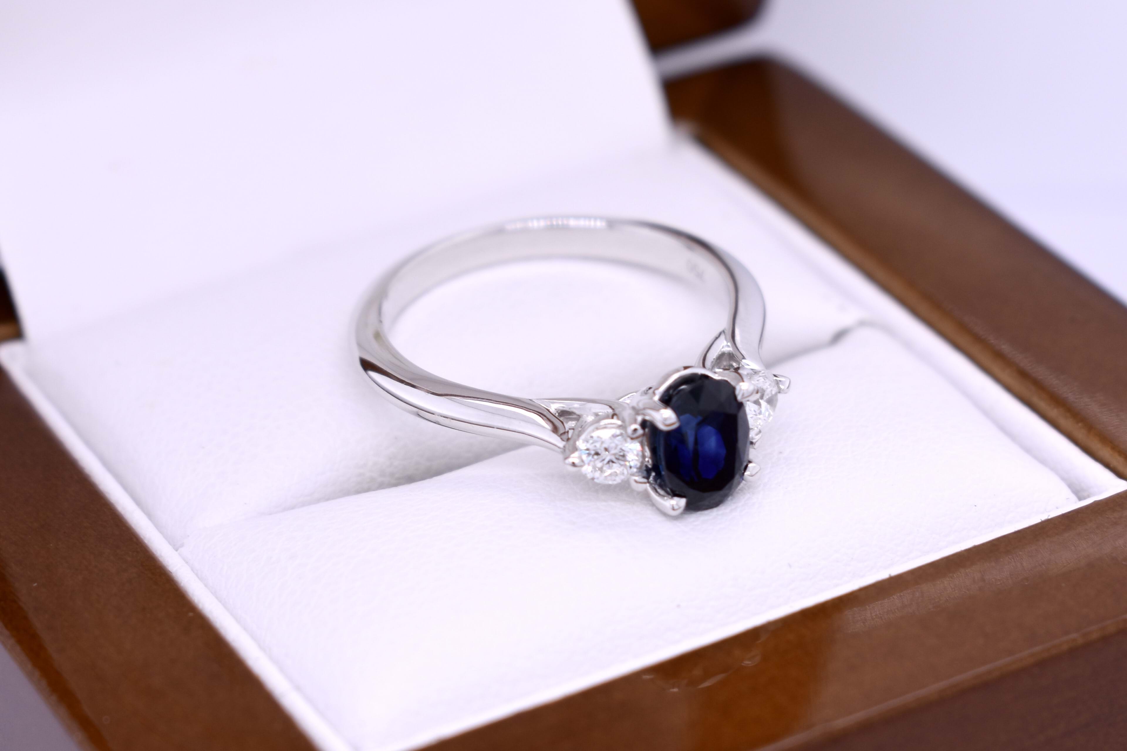 This lovely ring features a central oval Nigerian blue sapphire of 1.08ct, four claw set in white gold, paired with a round brilliant cut white diamond each side. Two diamonds totalling of 0.20ct FG SI. The ring is made in 18ct white gold with a trellis style setting and plain band. Finger size M+.