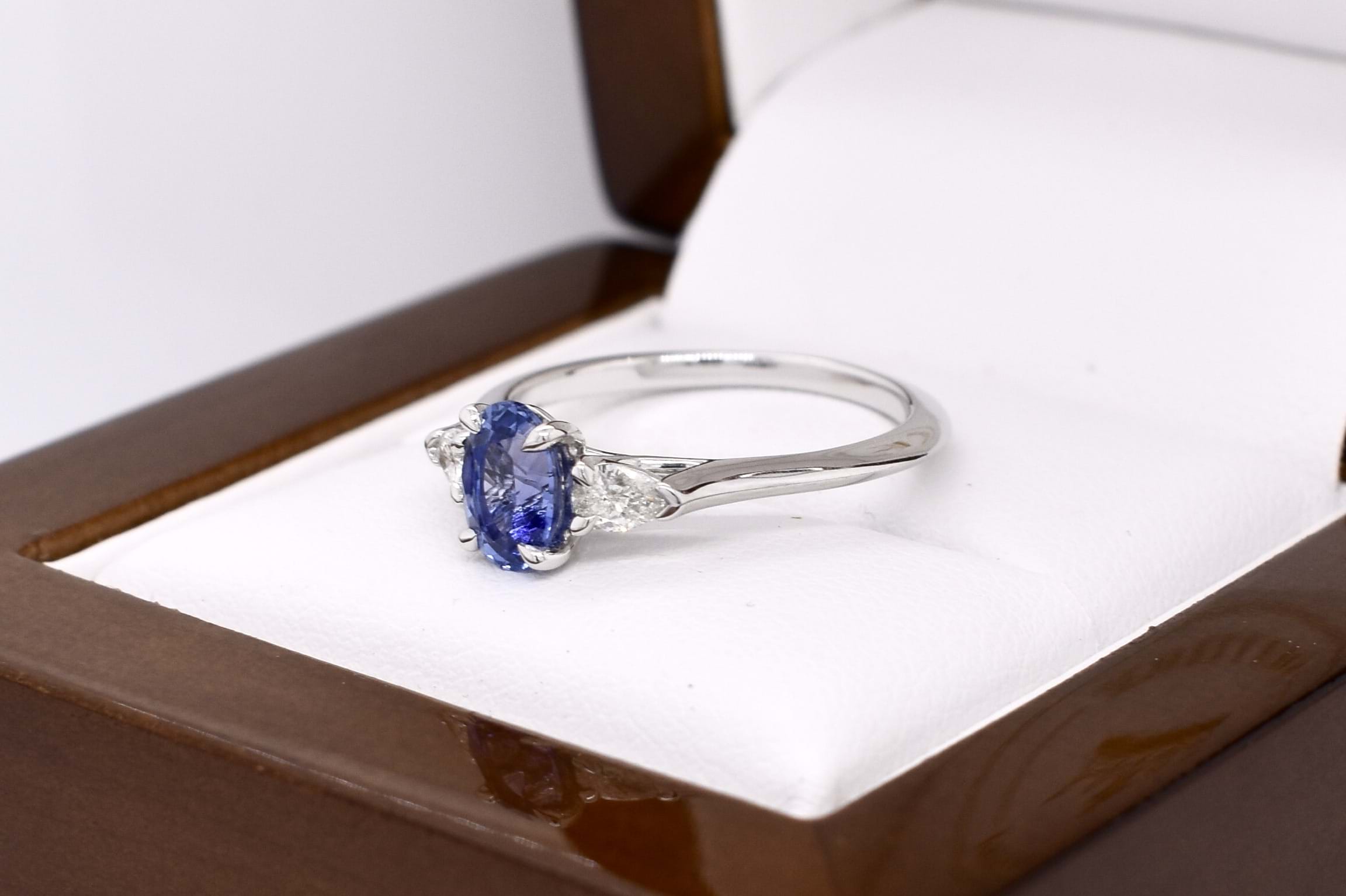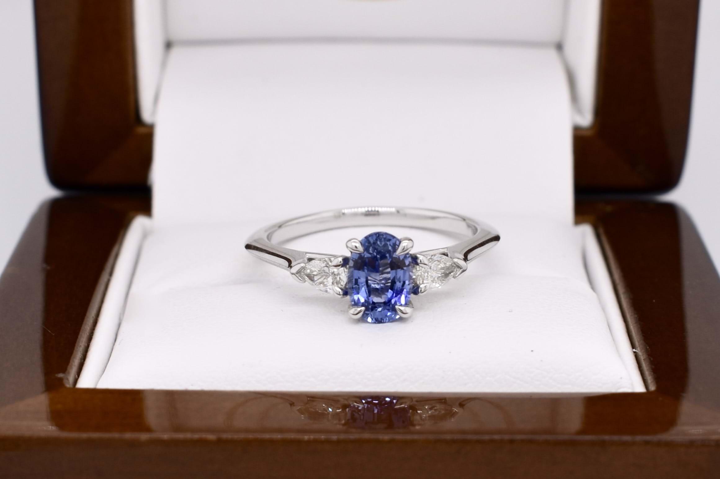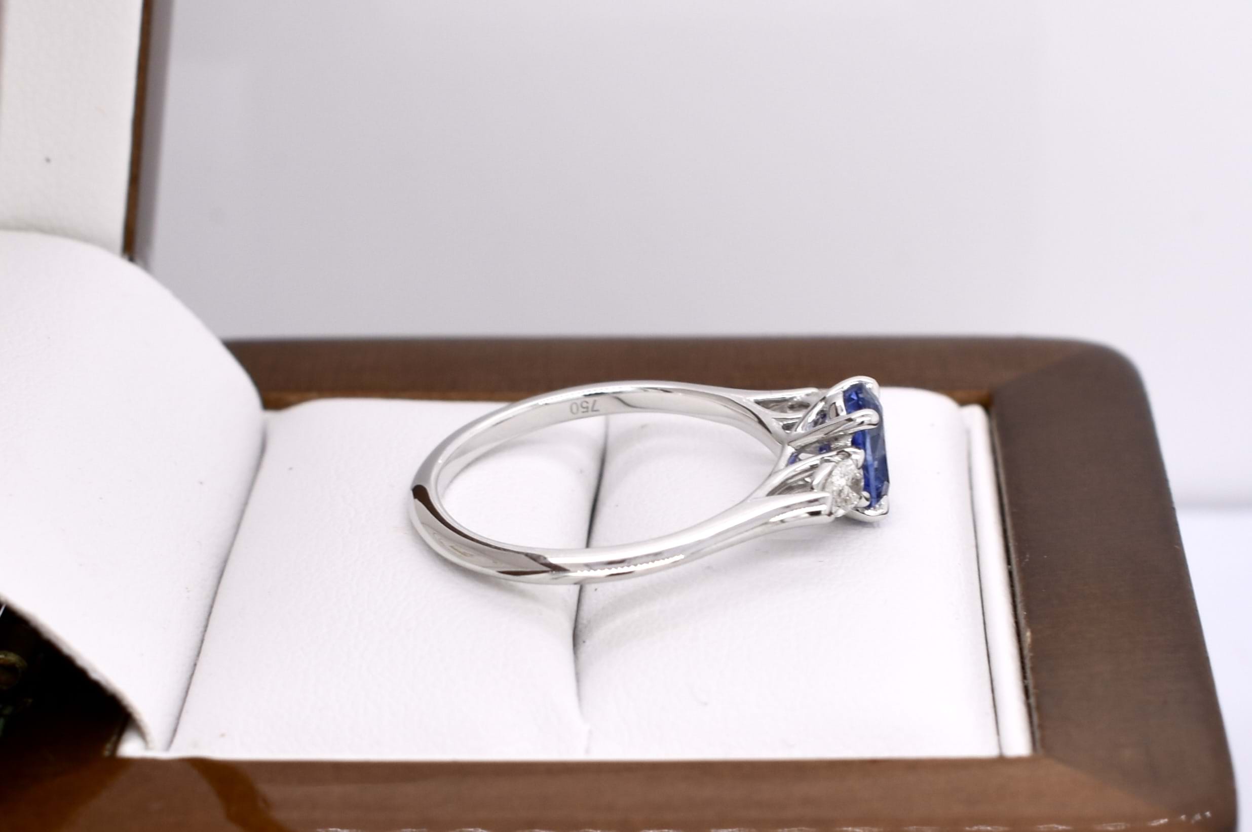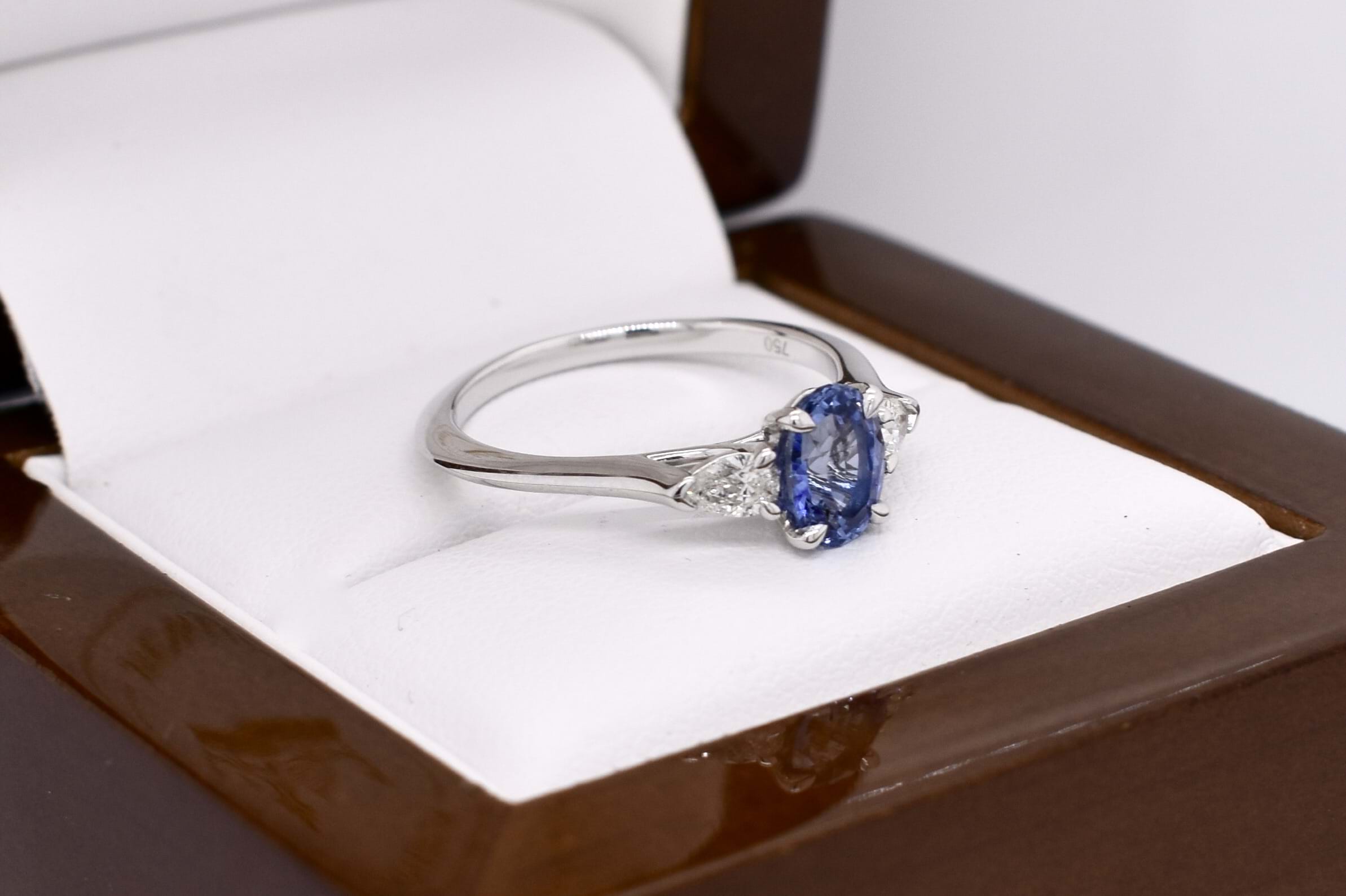 This elegant trilogy ring is crafted in 18ct white gold and features an oval Ceylon blue sapphire of 1.09ct, four claw set, with a pear shaped diamond either side. The two pear shaped diamonds total 0.24ct G VS1 and are two claw and end cap set. Completed on a plain gold band. Finger size M+. Independent Valuation available upon purchase.