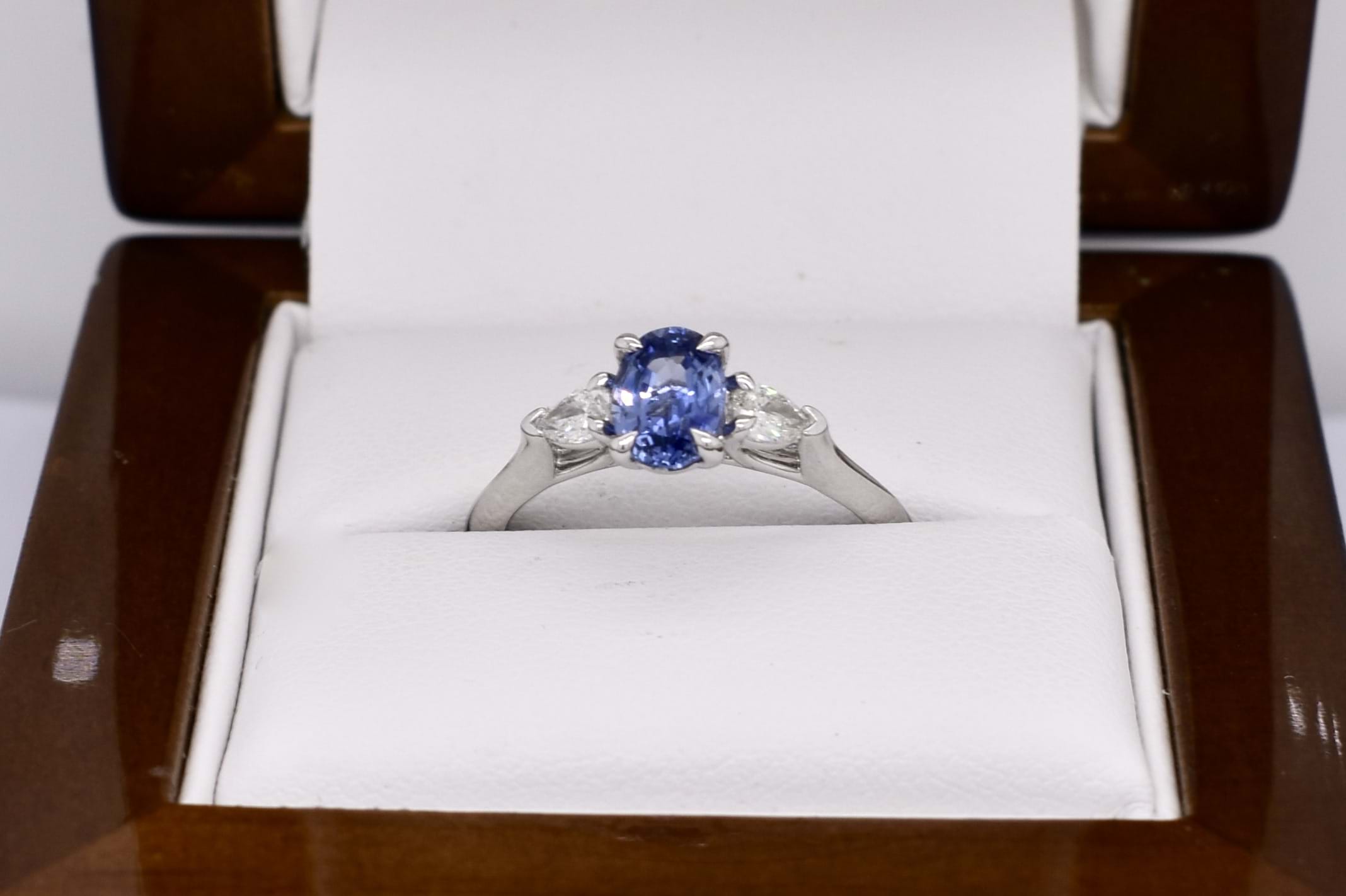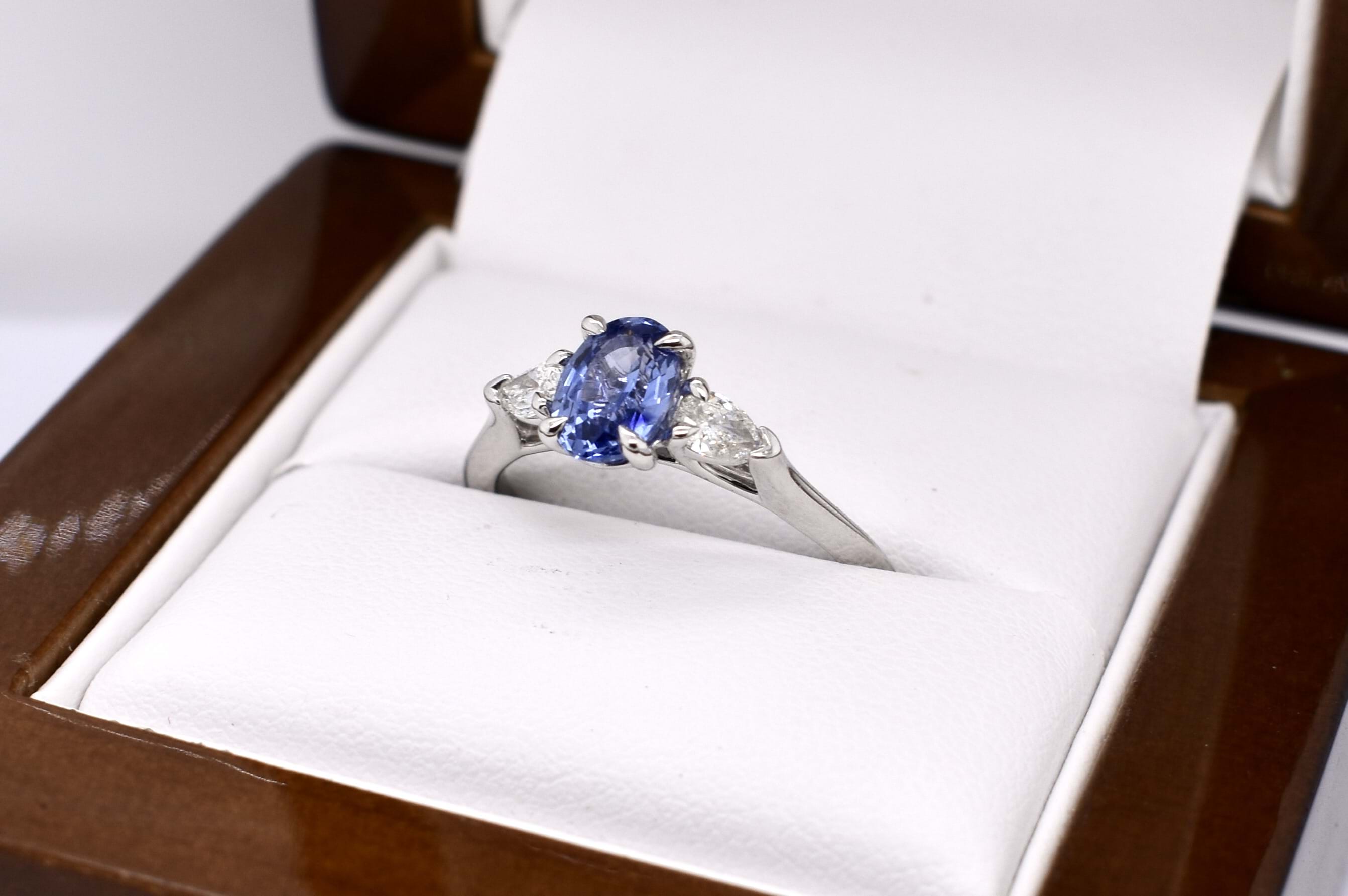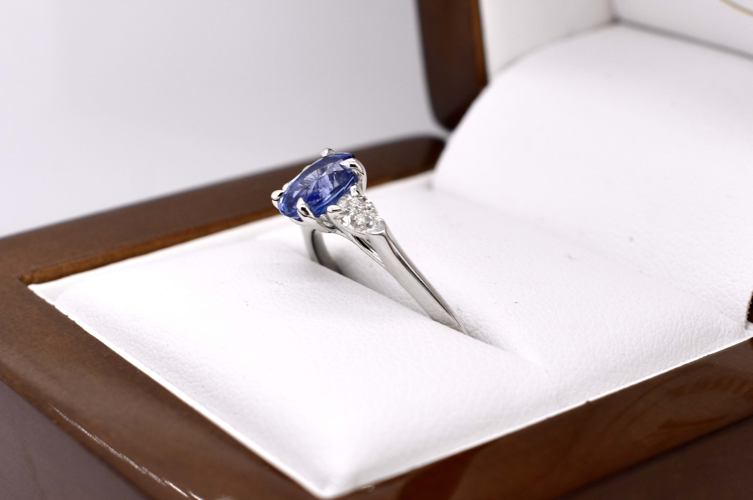 This elegant trilogy ring is crafted in 18ct white gold and features an oval Ceylon blue sapphire of 1.09ct, four claw set, with a pear shaped diamond either side. The two pear shaped diamonds total 0.24ct G VS1 and are two claw and end cap set. Completed on a plain gold band. Finger size M+. Independent Valuation available upon purchase.