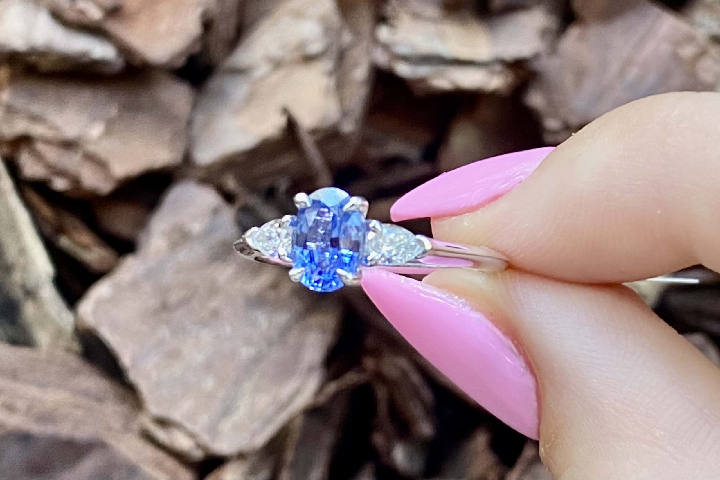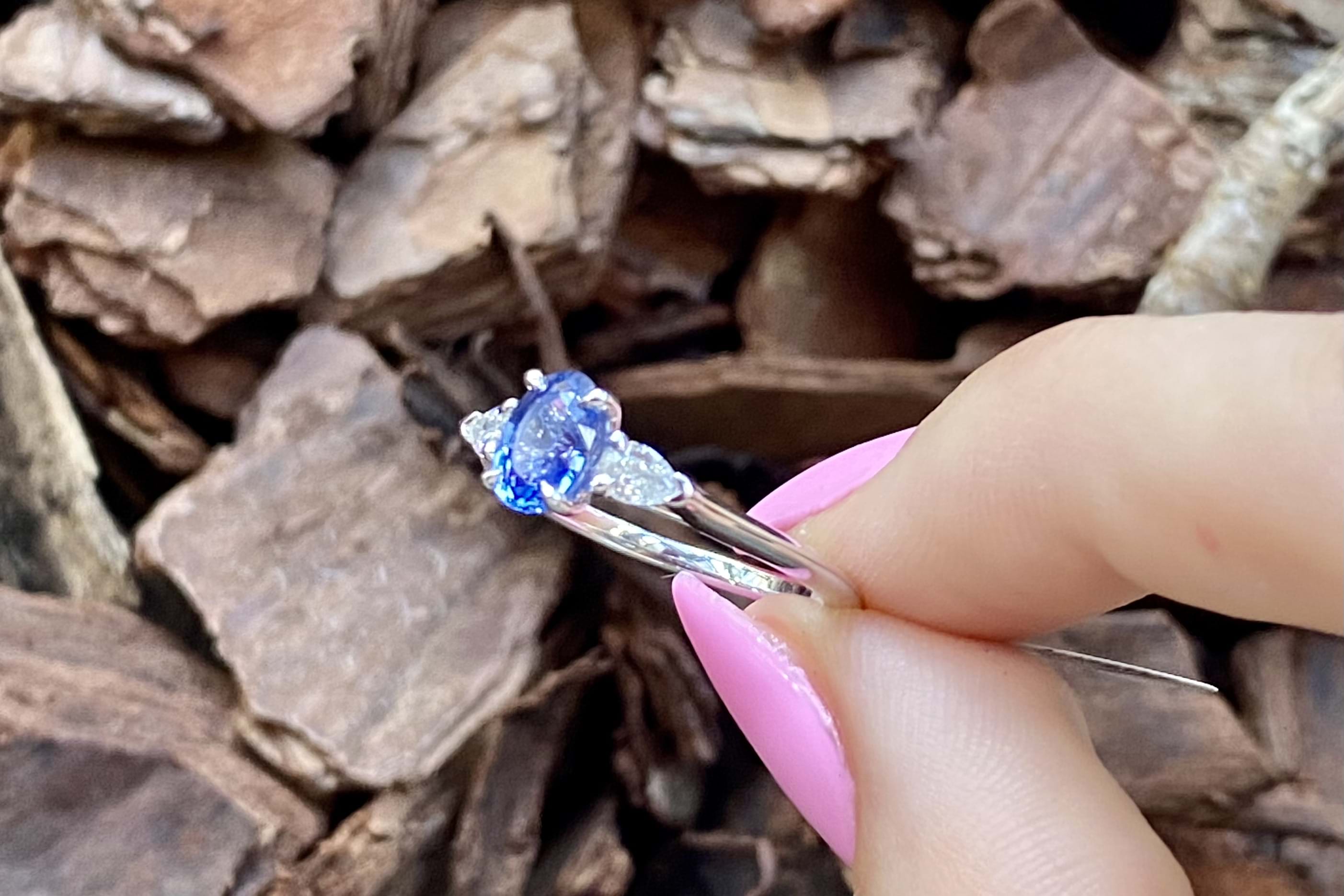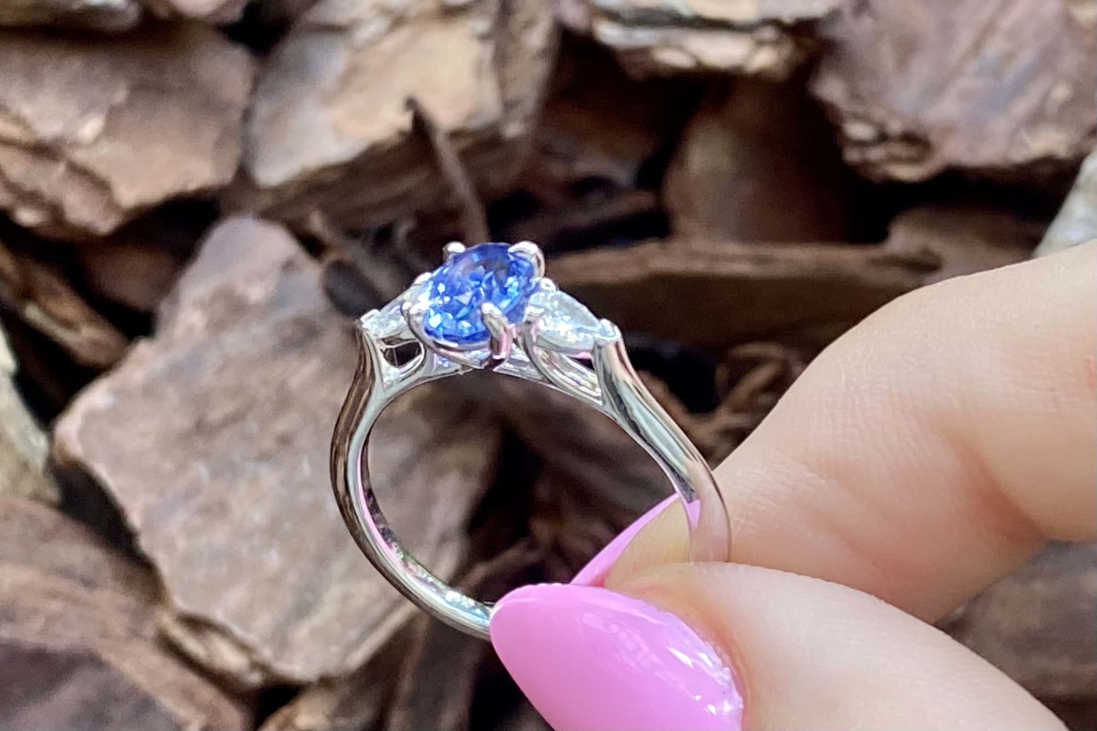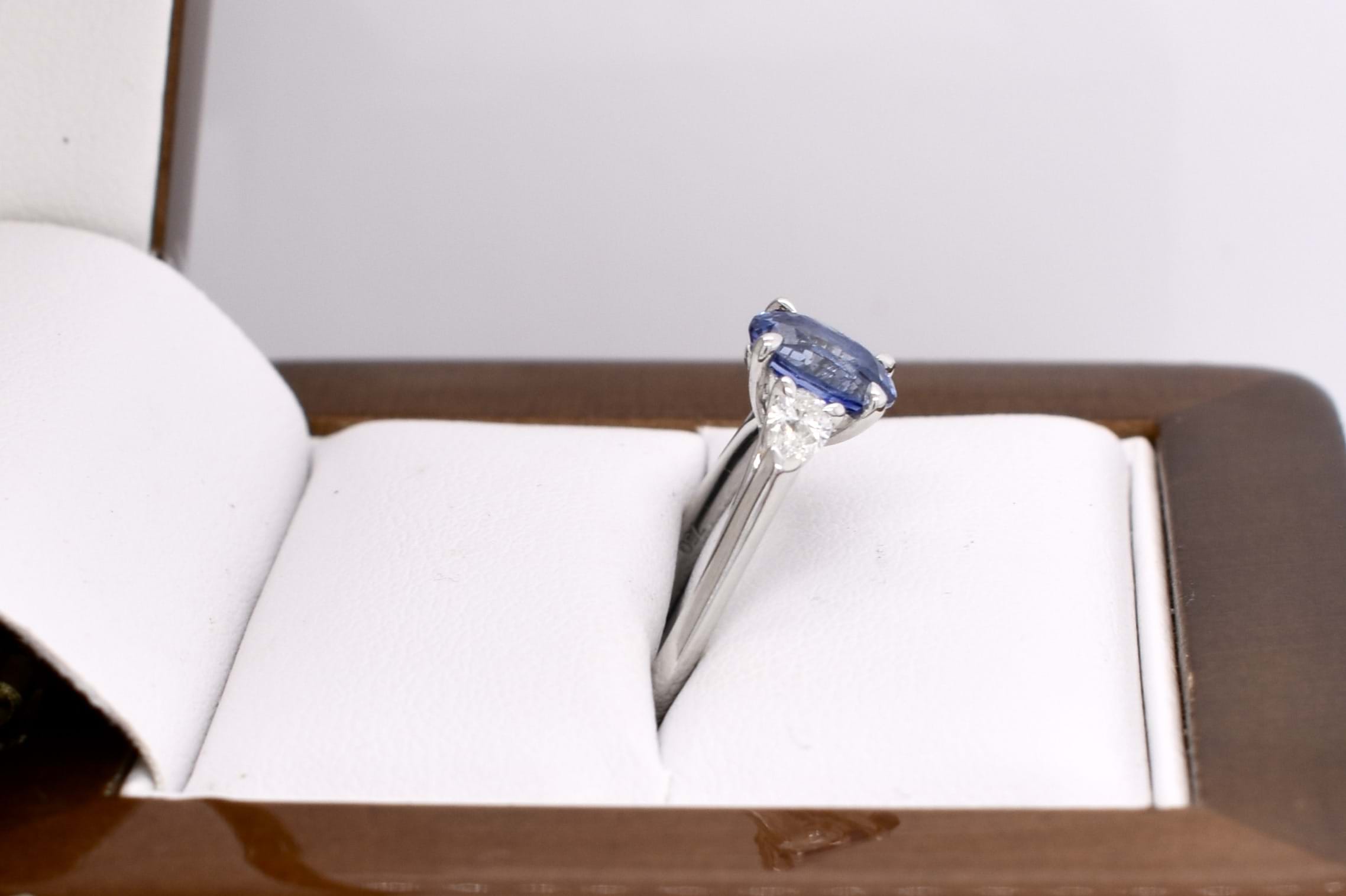 This elegant trilogy ring is crafted in 18ct white gold and features an oval Ceylon blue sapphire of 1.09ct, four claw set, with a pear shaped diamond either side. The two pear shaped diamonds total 0.24ct G VS1 and are two claw and end cap set. Completed on a plain gold band. Finger size M+. Independent Valuation available upon purchase.