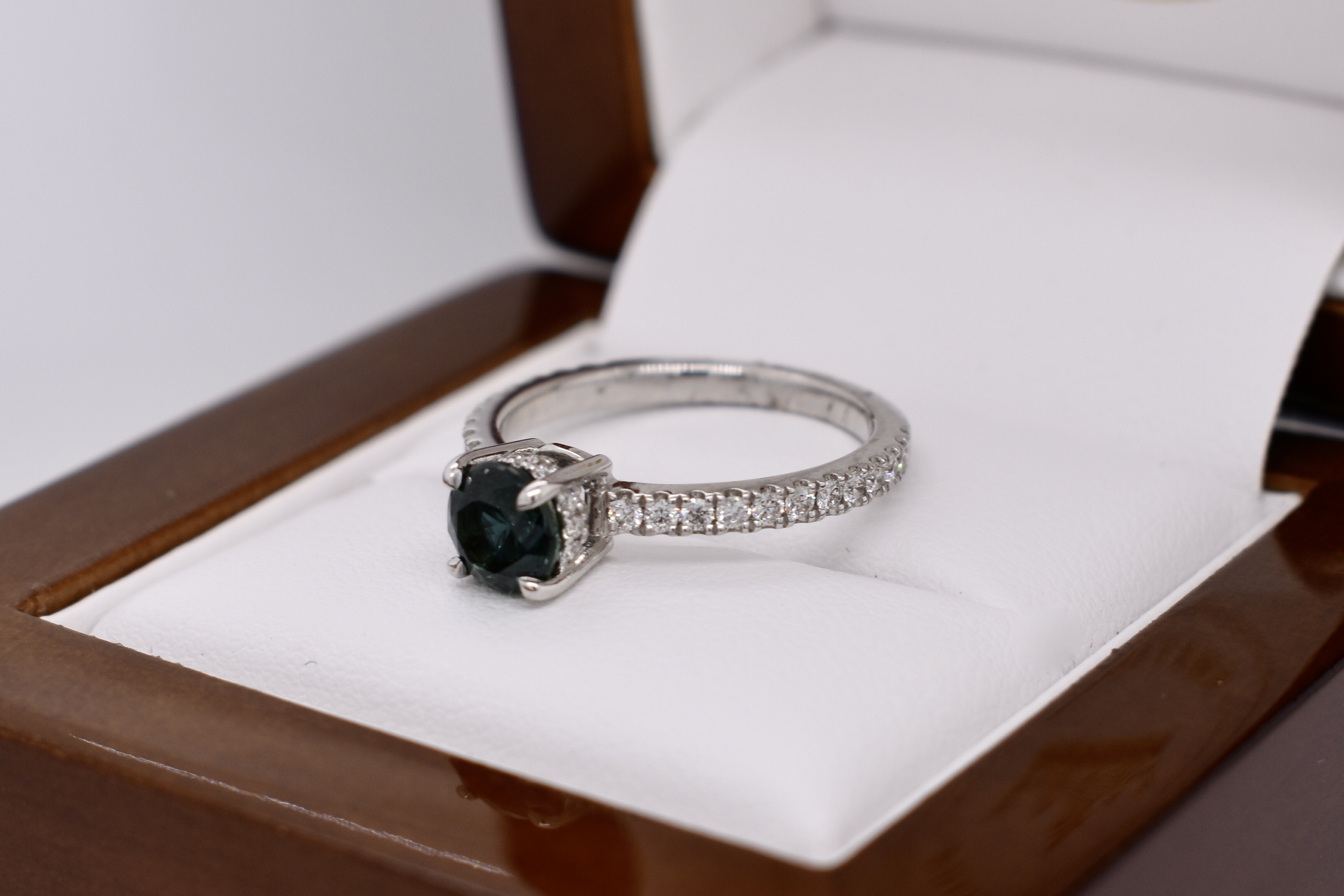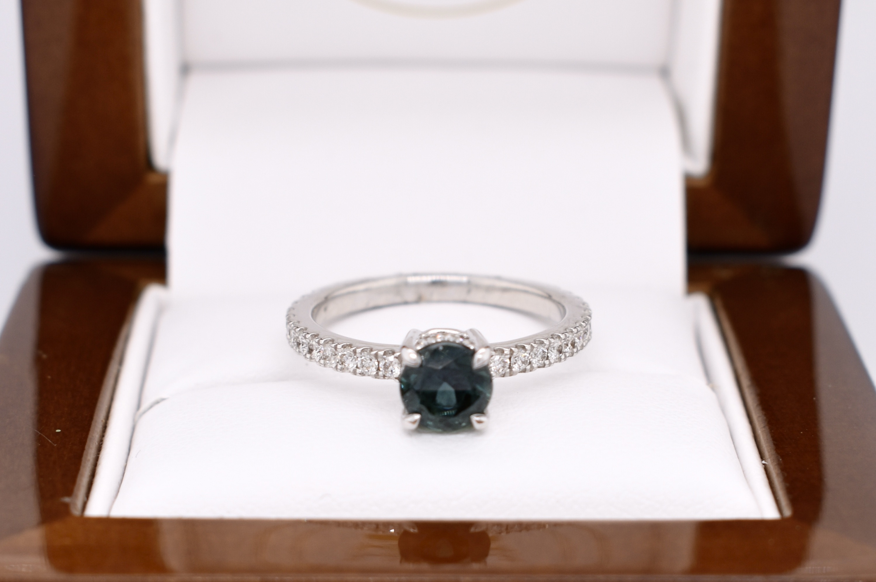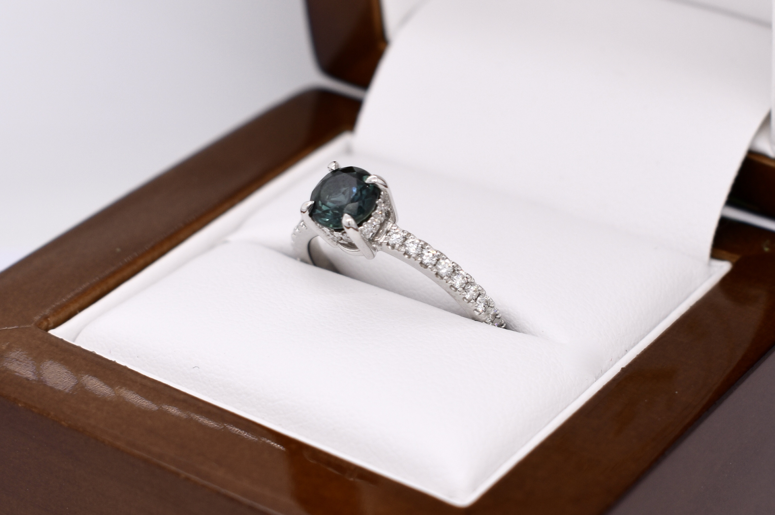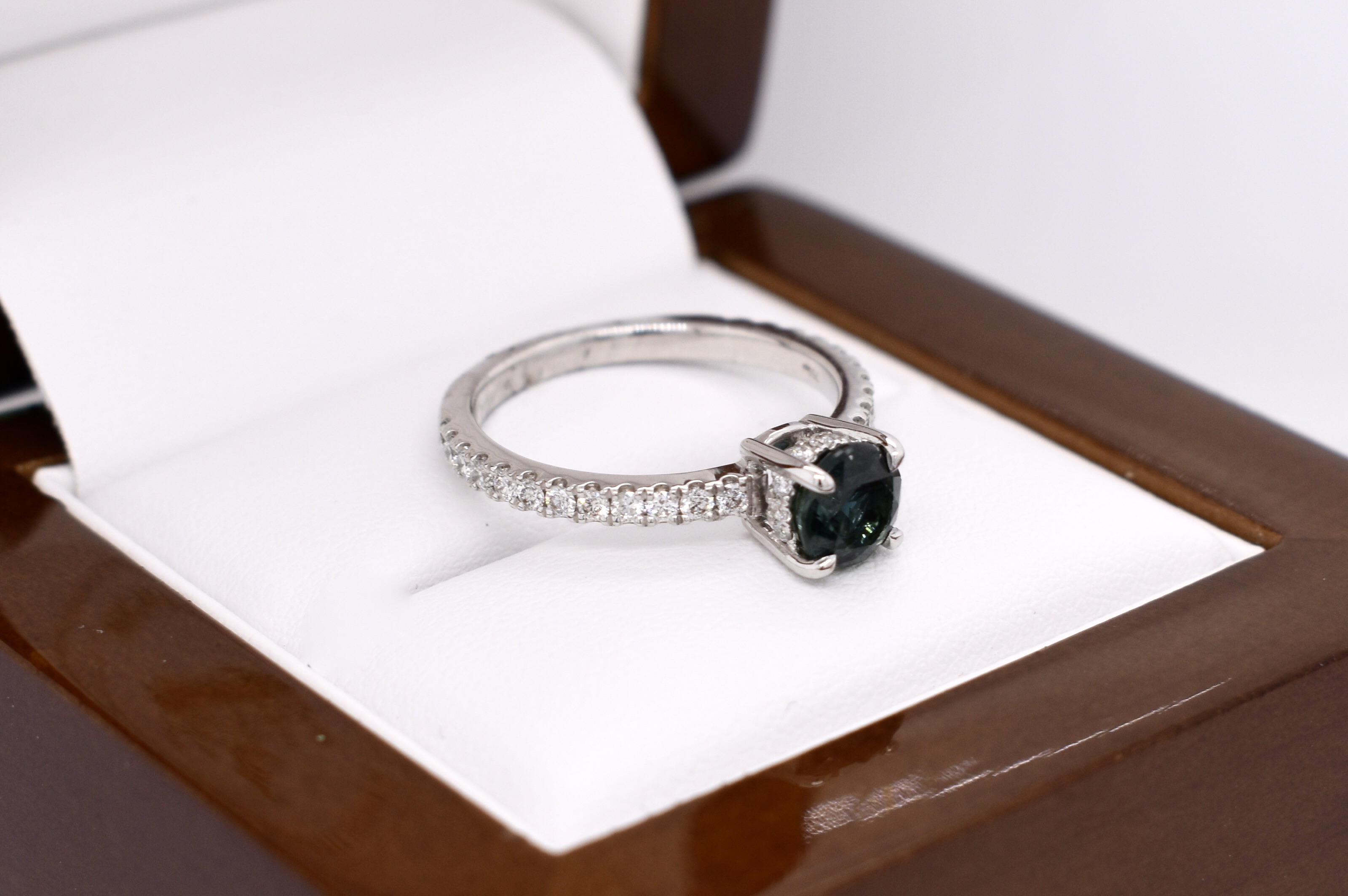 This beautiful 18ct white gold ring features a central round Australian teal sapphire of 1.12ct, four claw set. With round brilliant cut diamonds down the shoulders and also a shimmering hidden halo of diamonds set beneath the stone. A total of 36 diamonds weighing 0.37ct G SI total. Finger size M. Independent Valuation available upon purchase.