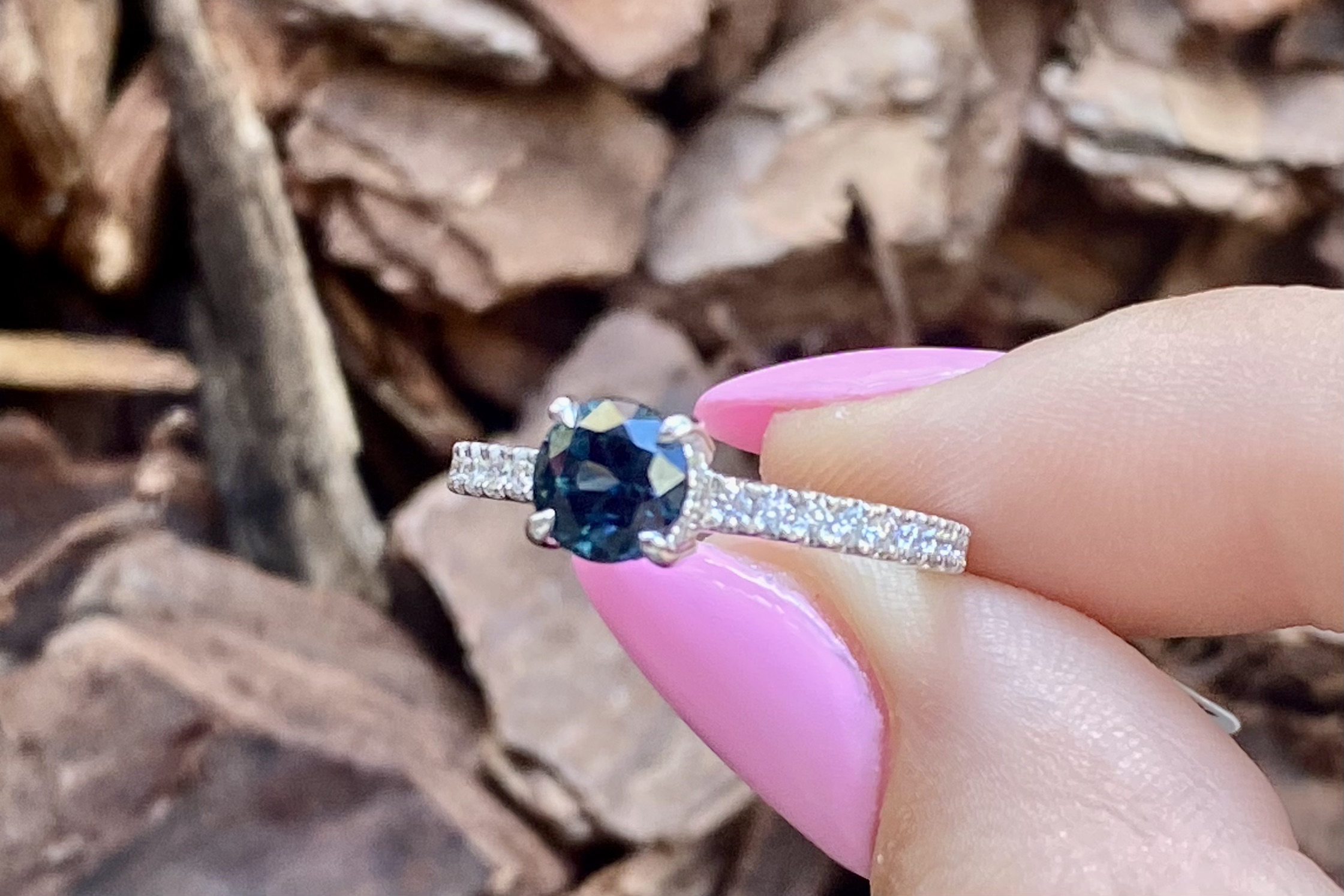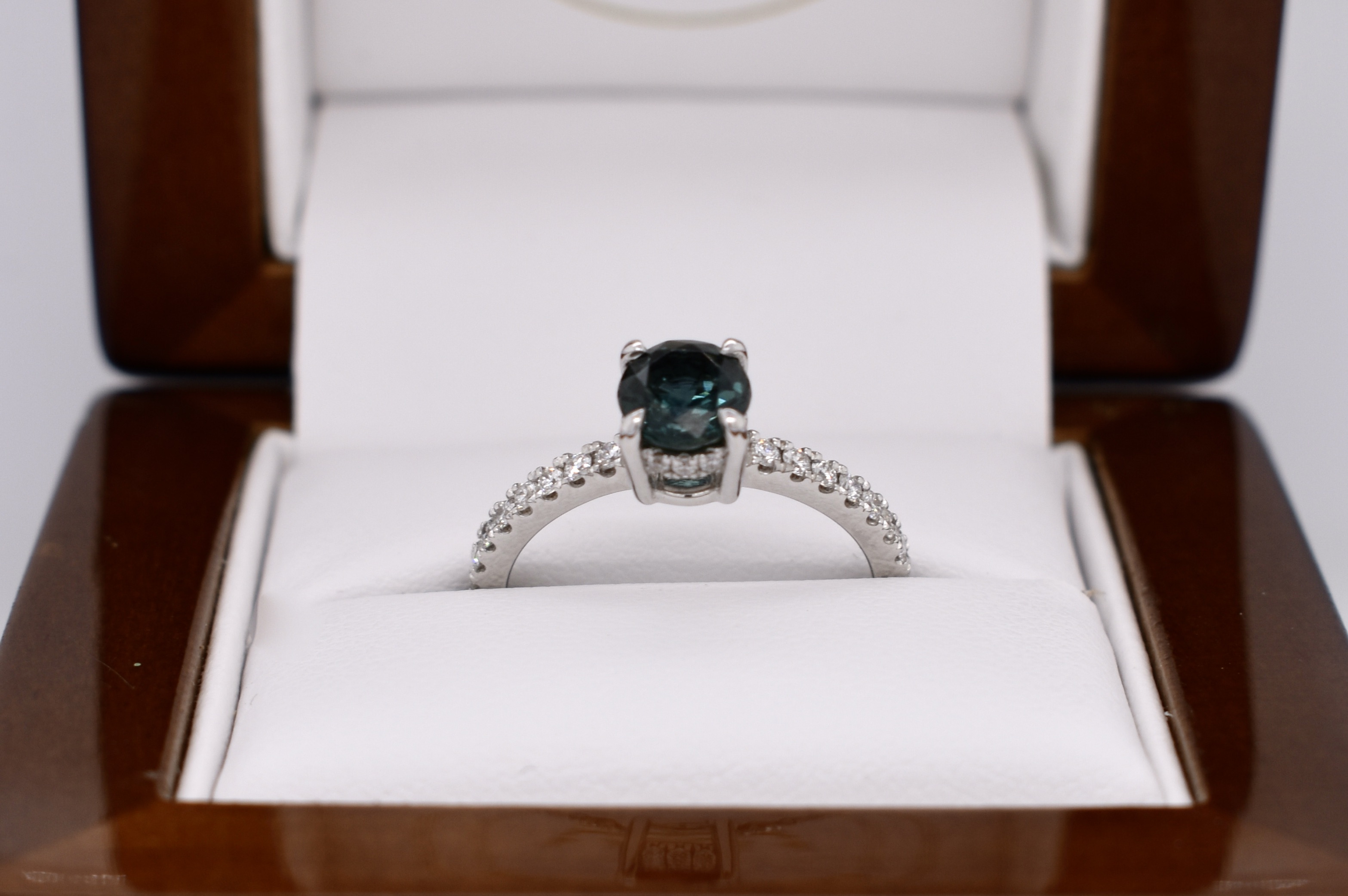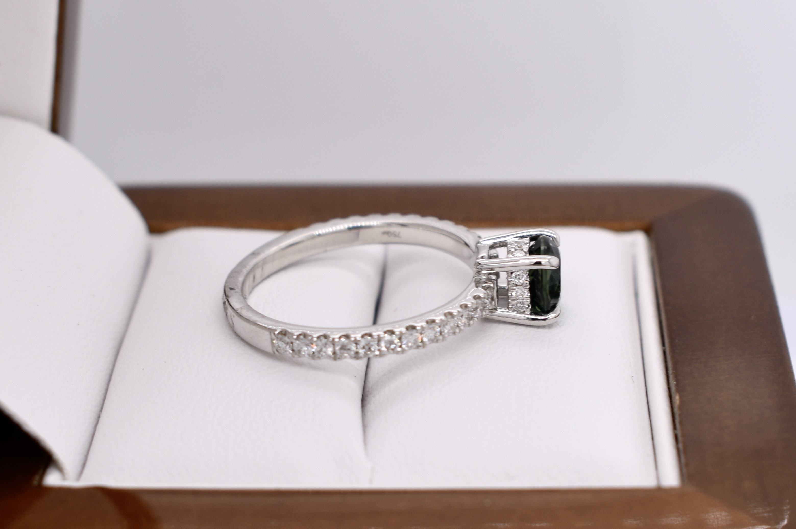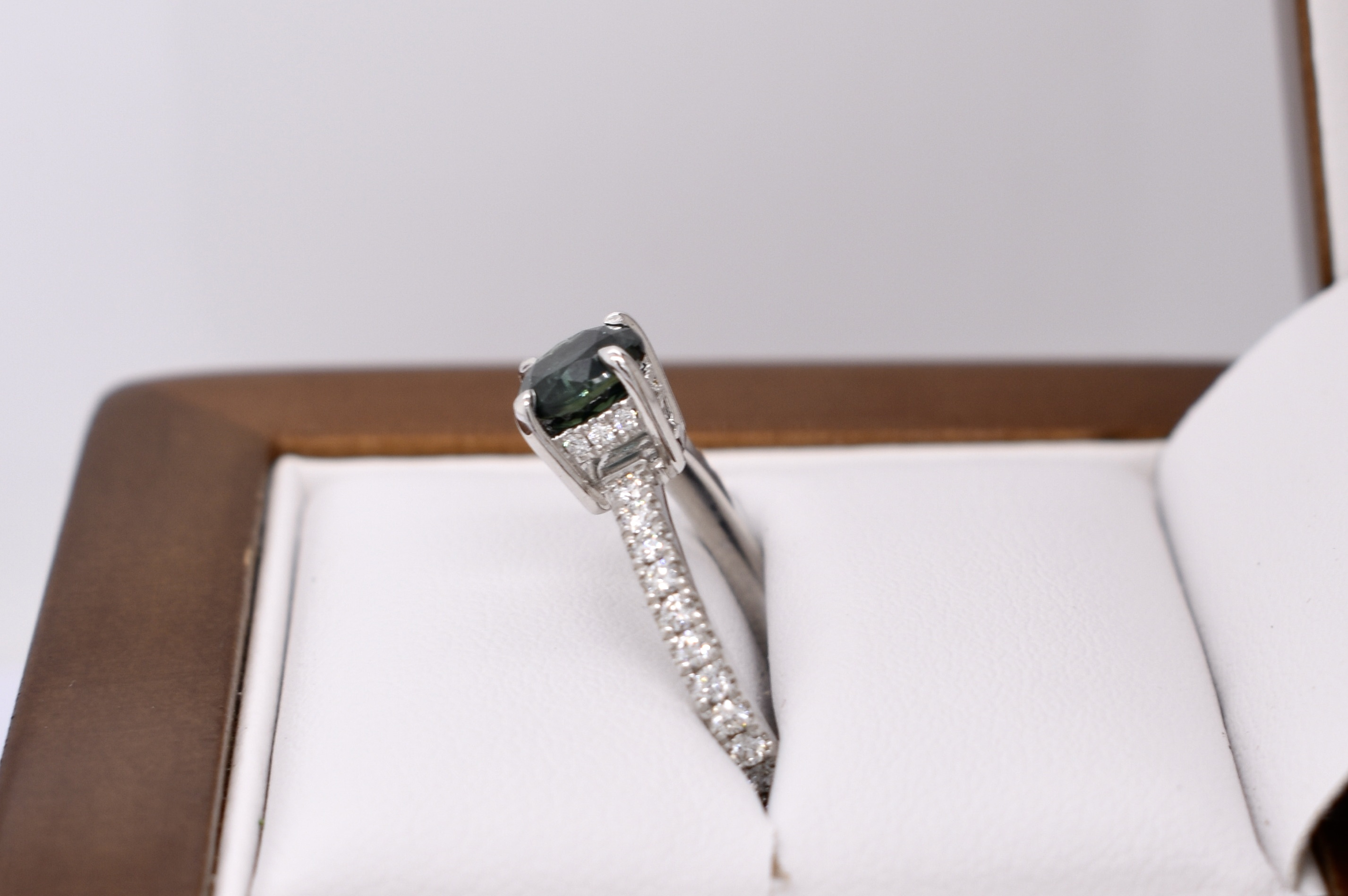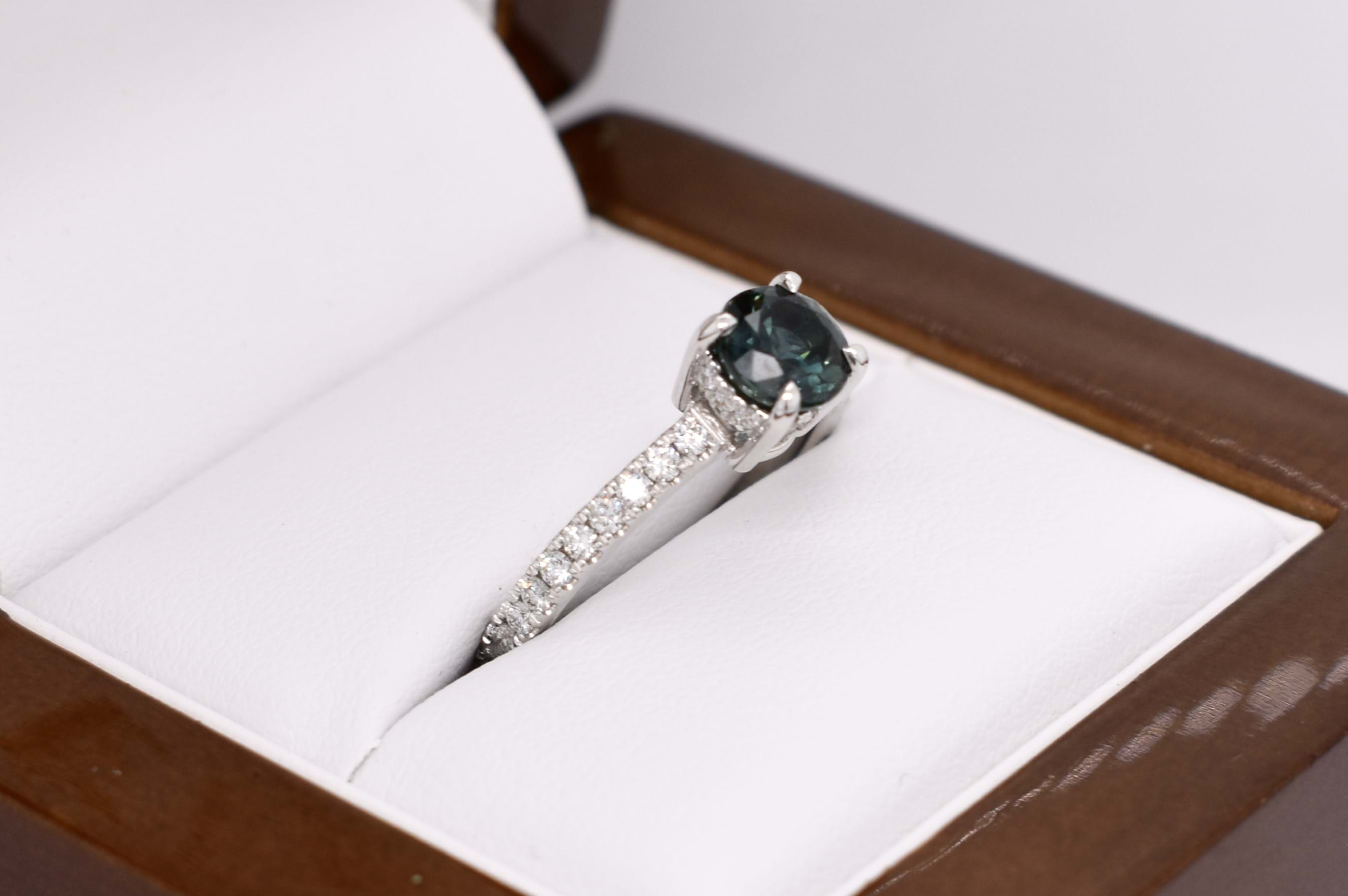 This beautiful 18ct white gold ring features a central round Australian teal sapphire of 1.12ct, four claw set. With round brilliant cut diamonds down the shoulders and also a shimmering hidden halo of diamonds set beneath the stone. A total of 36 diamonds weighing 0.37ct G SI total. Finger size M. Independent Valuation available upon purchase.
