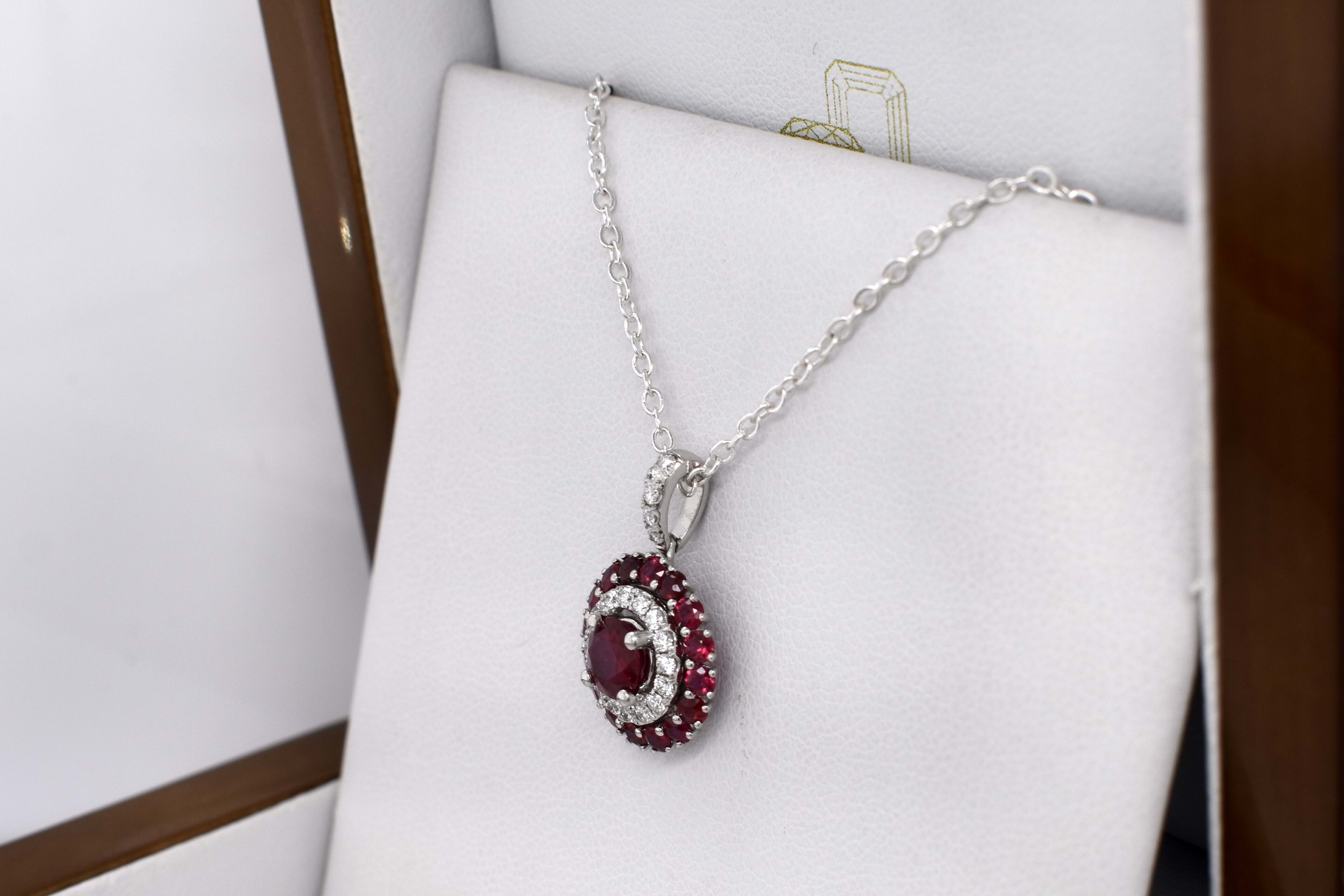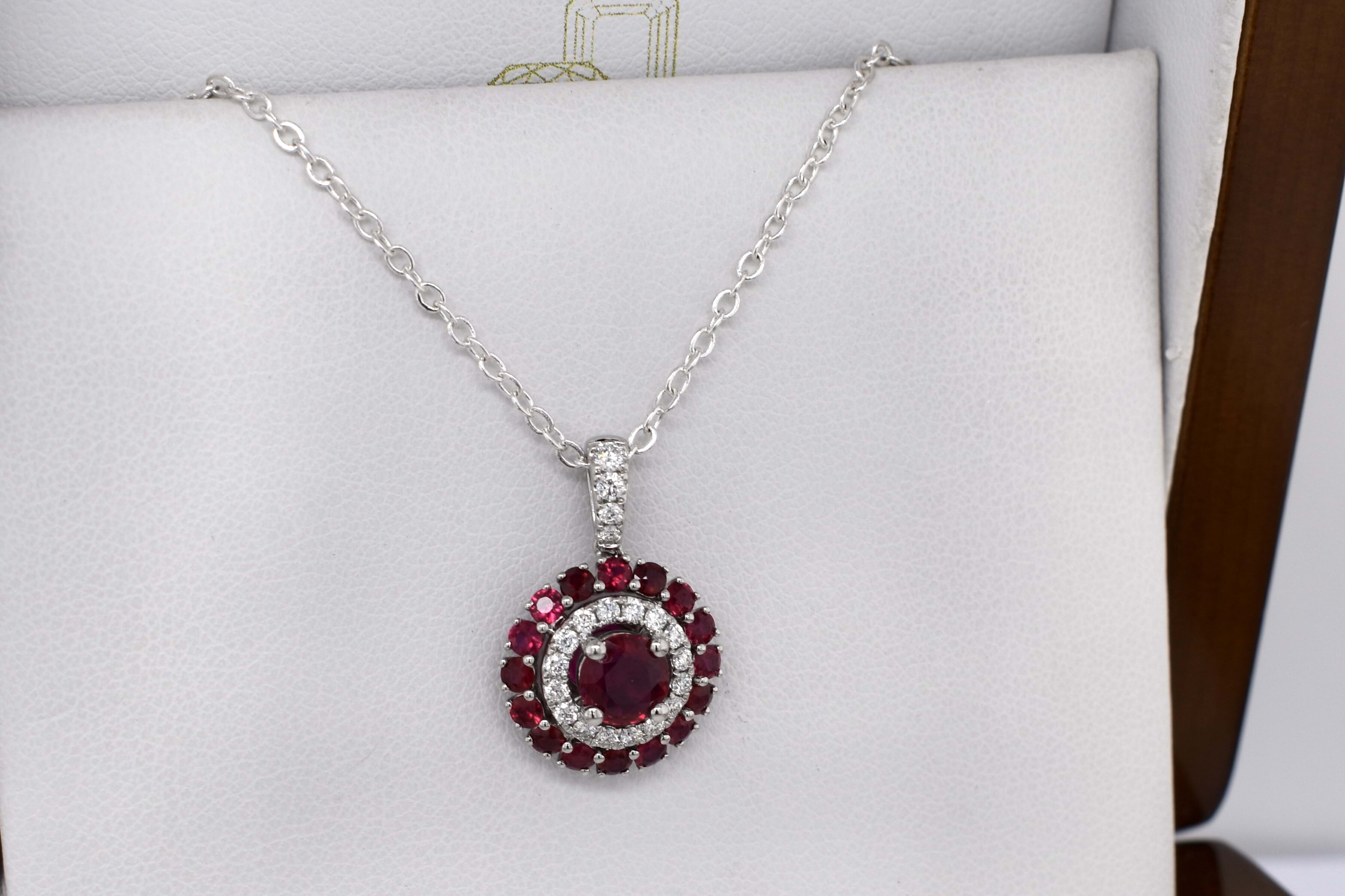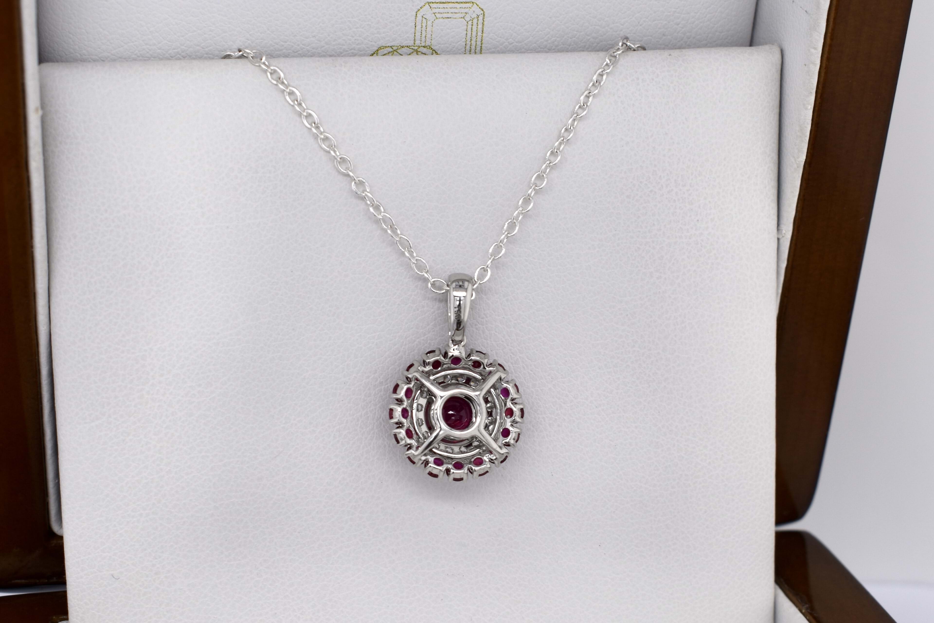 This beautiful 18ct white gold ruby and diamond cluster double halo pendant, consists of one centre ruby, measuring 5.60x2.45mm= 0.79ct bright mid-dark red. As well as an outter halo of rubies, sixteen 2.30mm totalling 0.83ct. Total rubies equalling 1.62ct. A dazzling halo of diamonds around the centre ruby, has twenty 1.90-1.30mm diamonds equalling 0.28ct G VS-SI. Finished with an articulated tapered loop. Chains available for separate purchase. Independent Valuation Supplied.