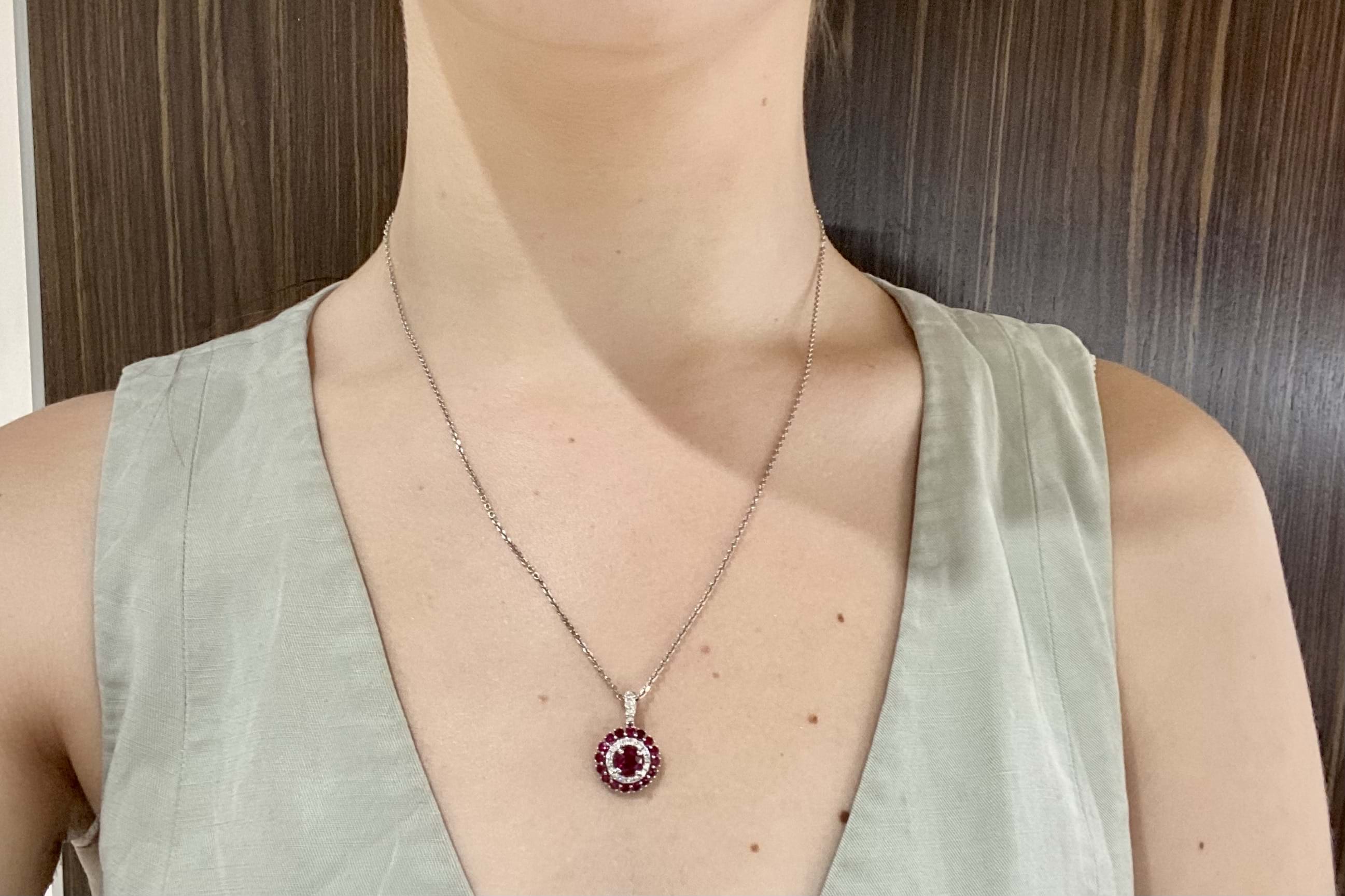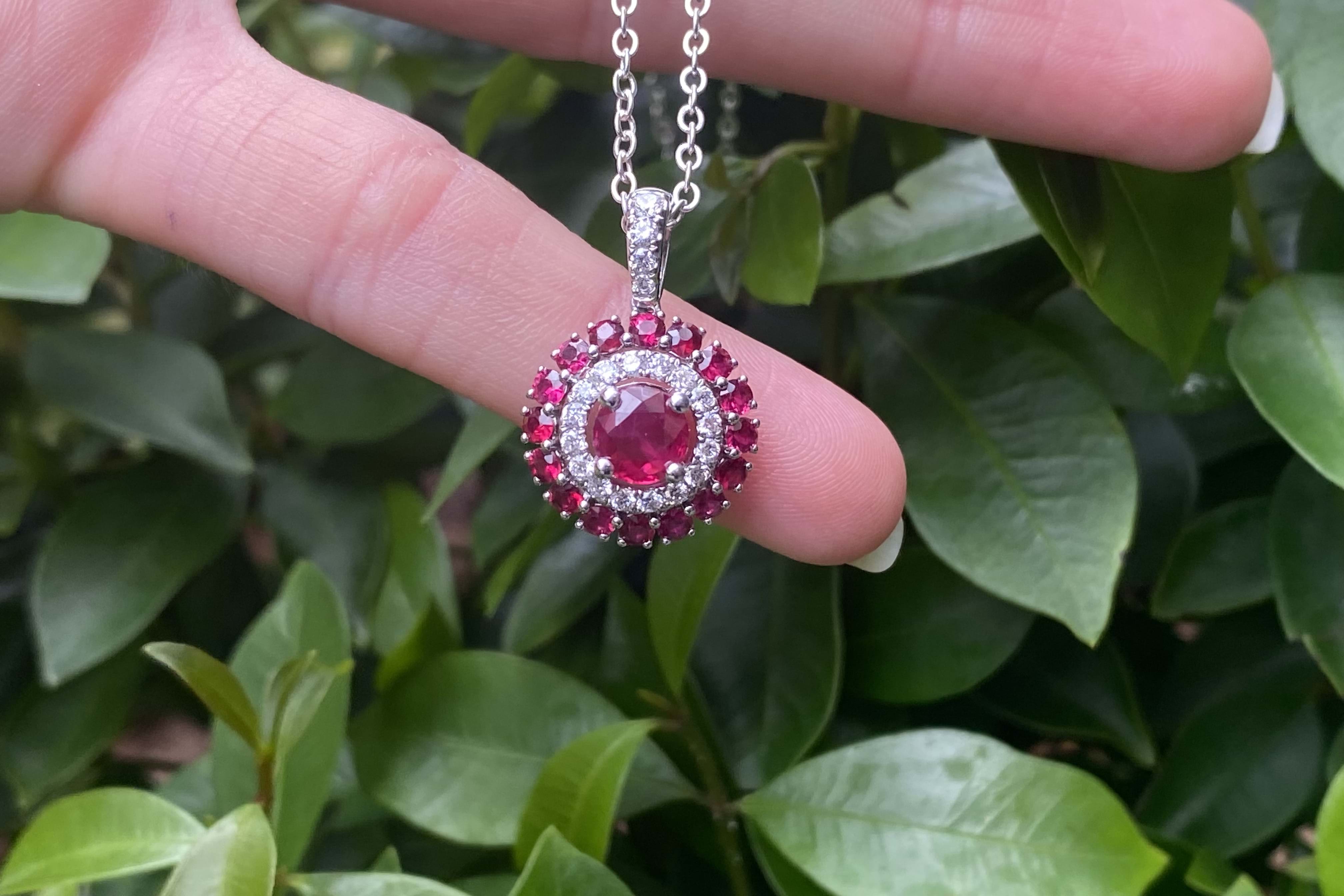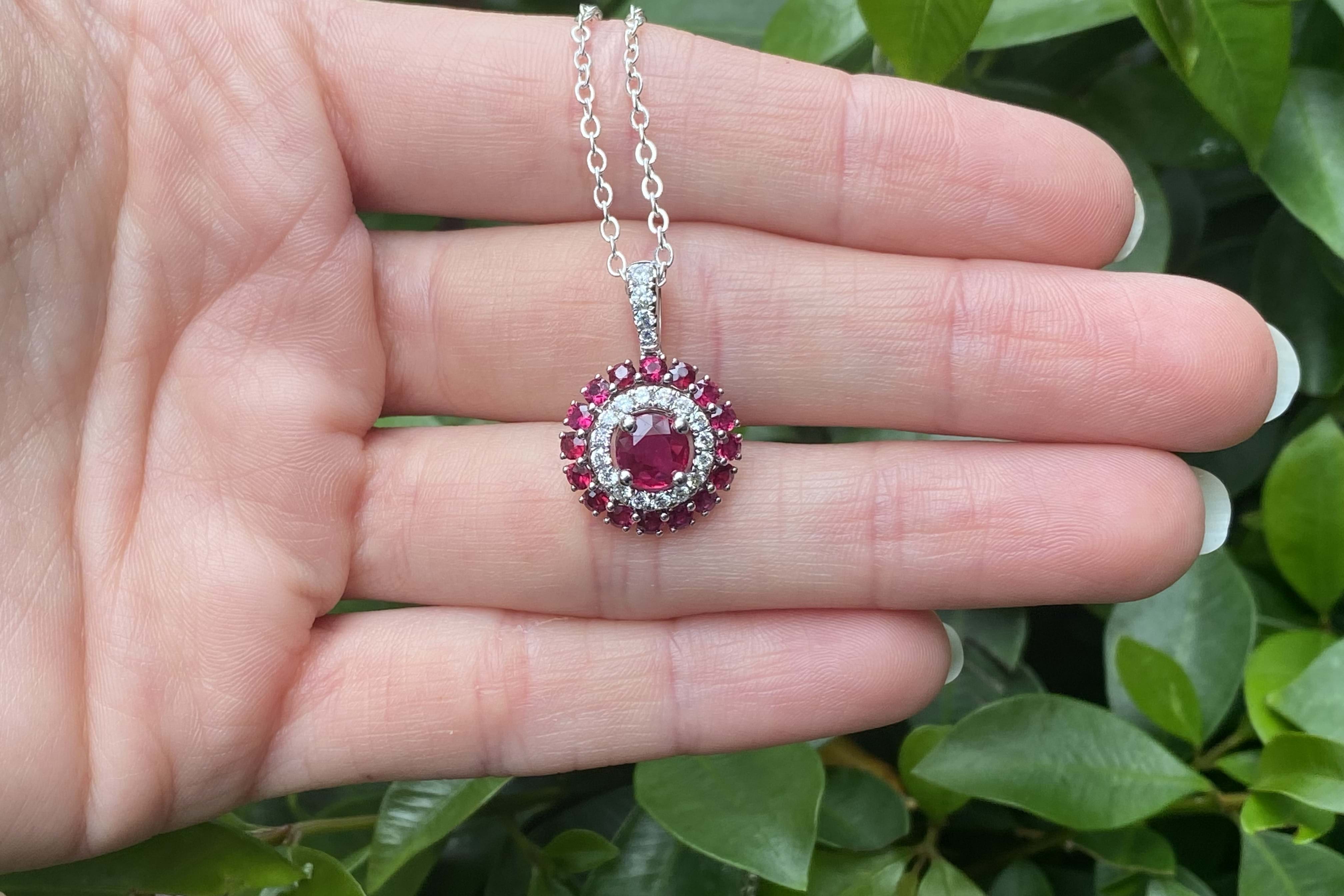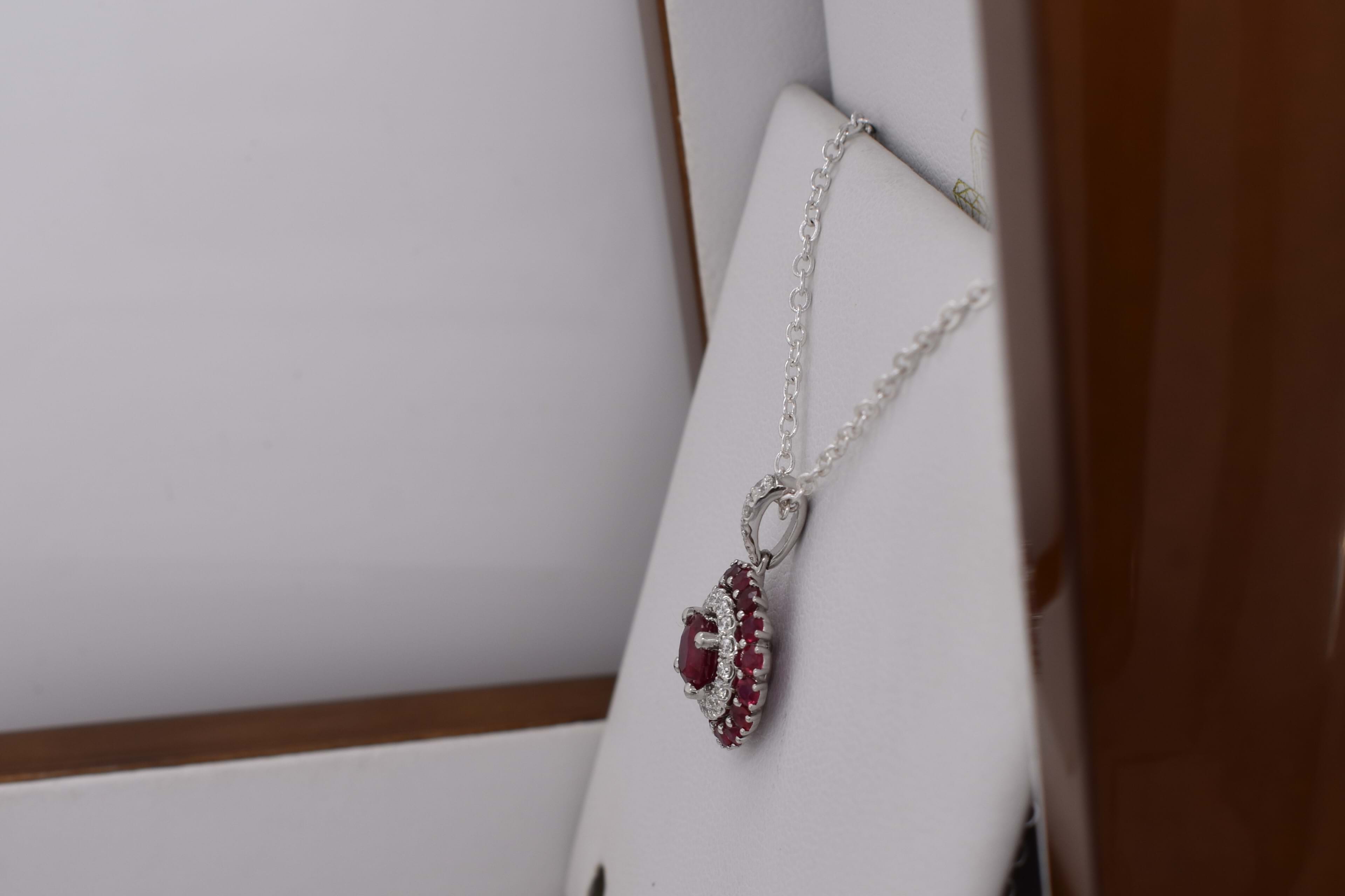 This beautiful 18ct white gold ruby and diamond cluster double halo pendant, consists of one centre ruby, measuring 5.60x2.45mm= 0.79ct bright mid-dark red. As well as an outter halo of rubies, sixteen 2.30mm totalling 0.83ct. Total rubies equalling 1.62ct. A dazzling halo of diamonds around the centre ruby, has twenty 1.90-1.30mm diamonds equalling 0.28ct G VS-SI. Finished with an articulated tapered loop. Chains available for separate purchase. Independent Valuation Supplied.