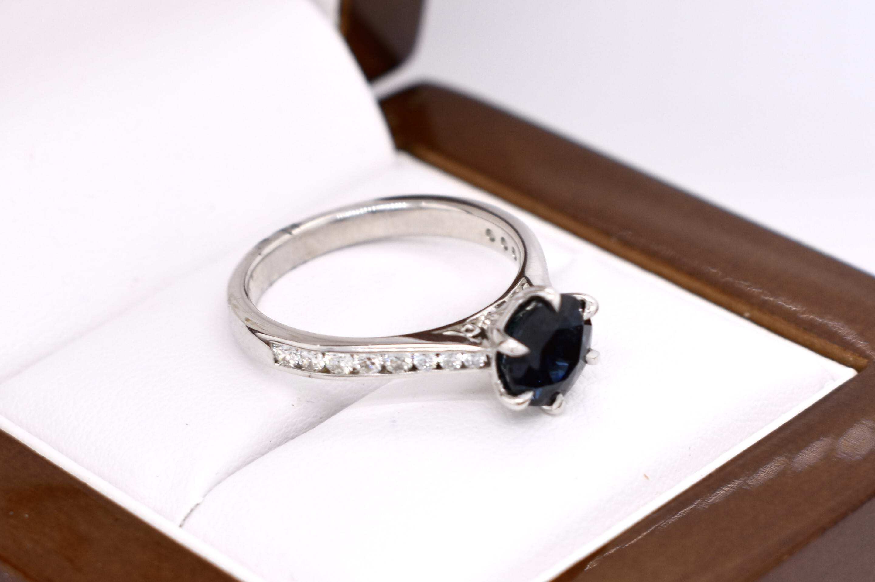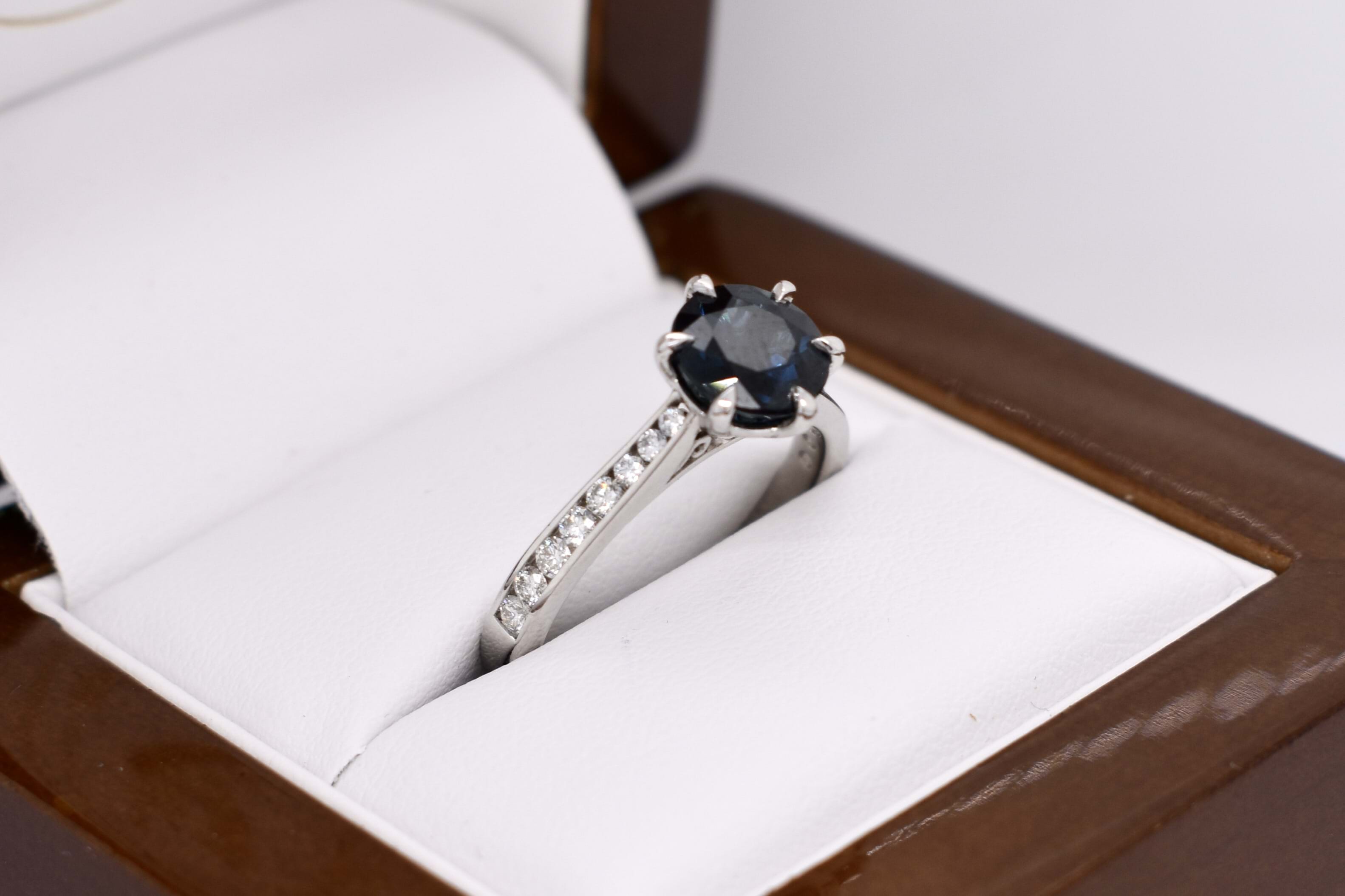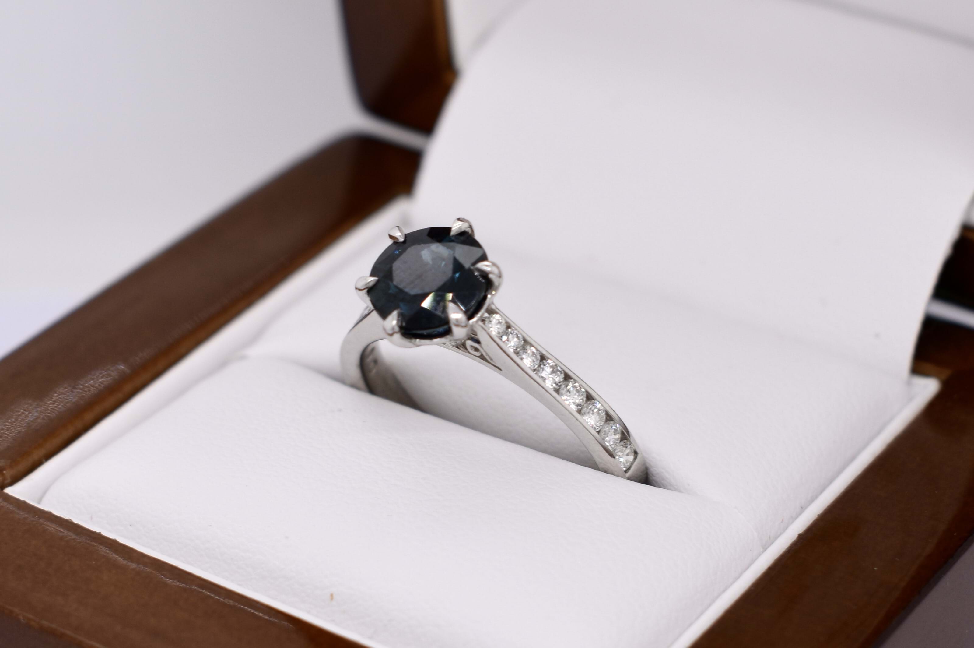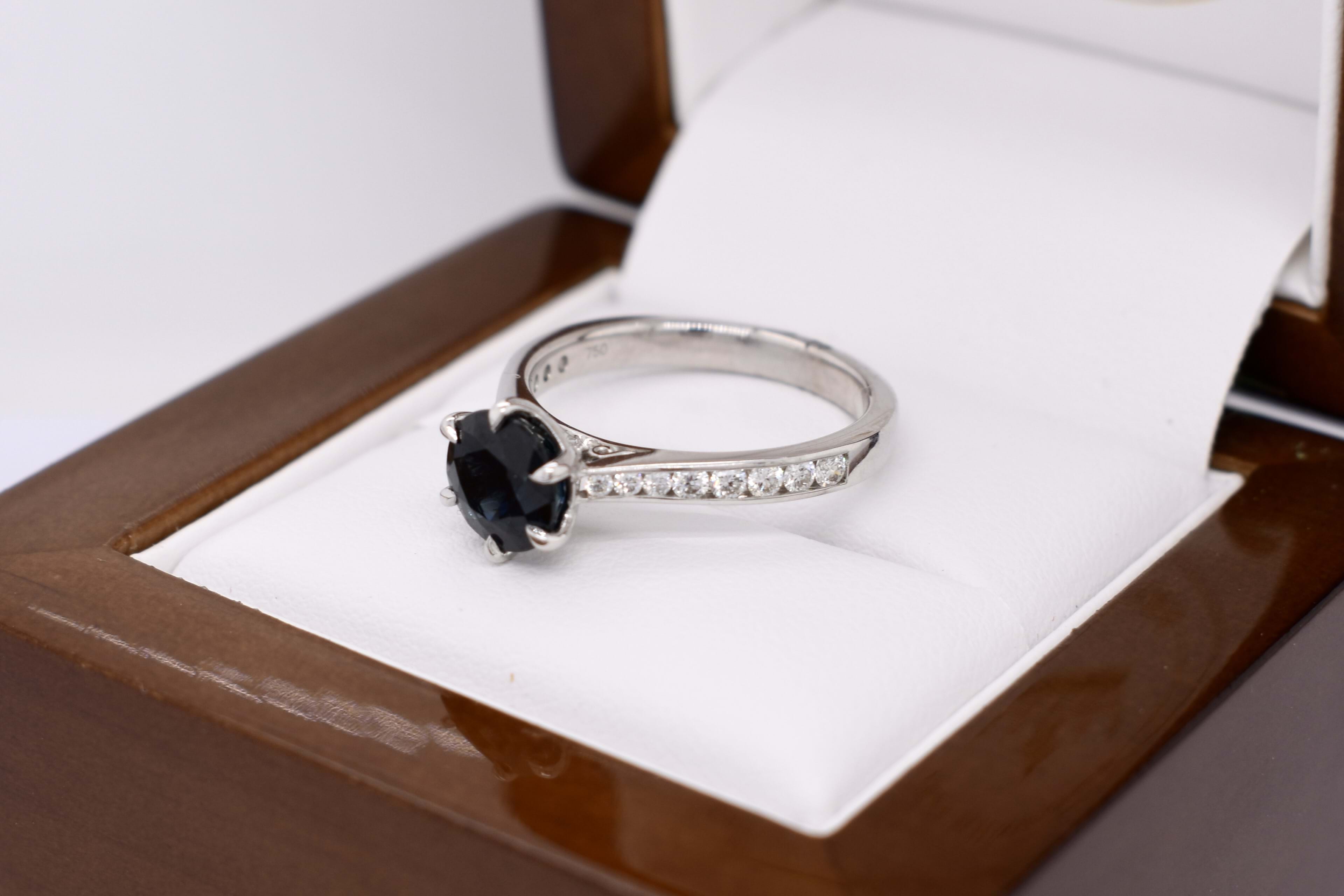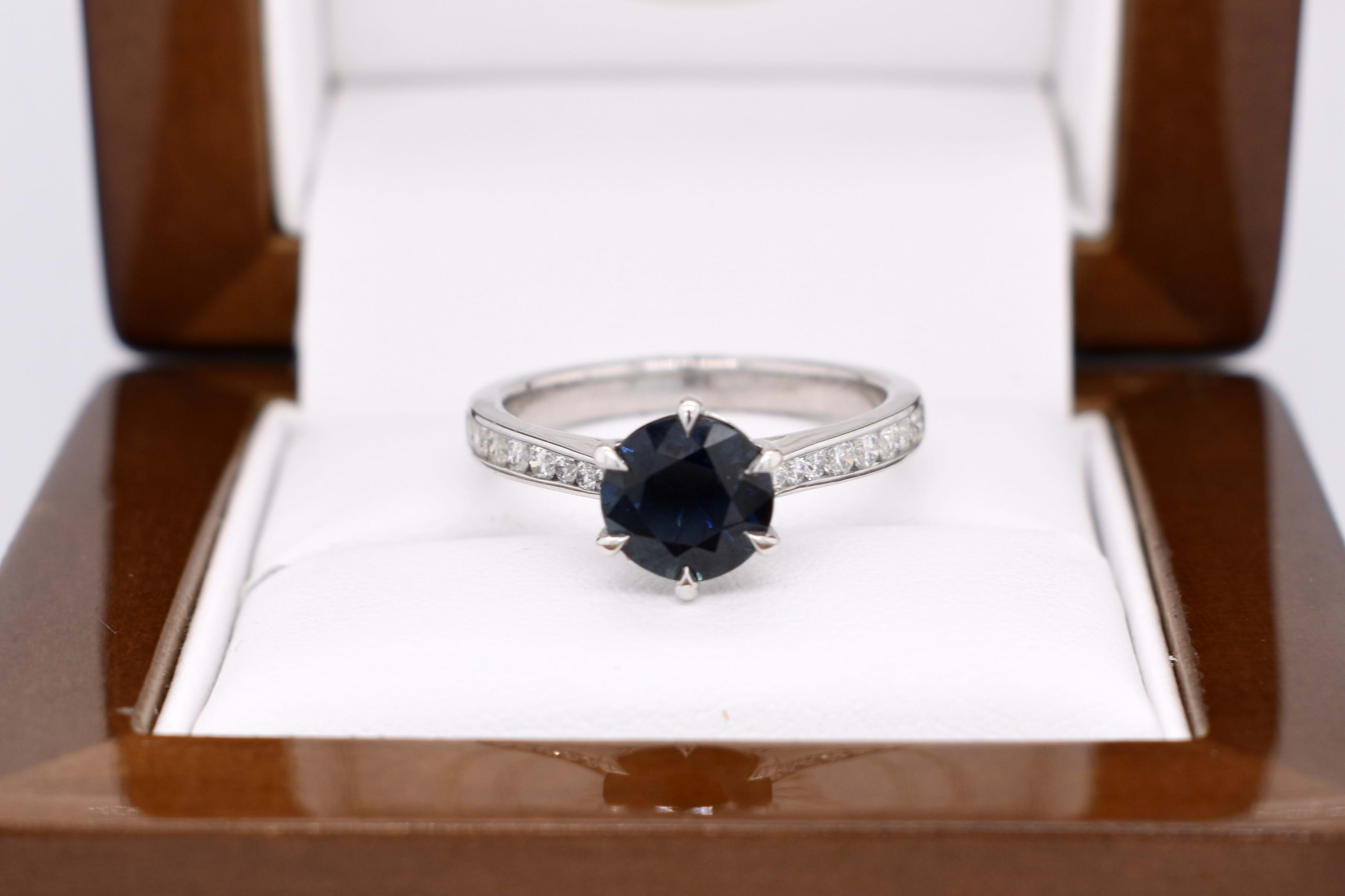 Crafted in 18ct white gold, this ring features a dark blue round Australian sapphire of 1.74ct, six claw set with sixteen round brilliant cut diamonds channel set down the shoulders. Total diamond weight of 0.33ct G SI. Finger size N. Independent Valuation available upon purchase.