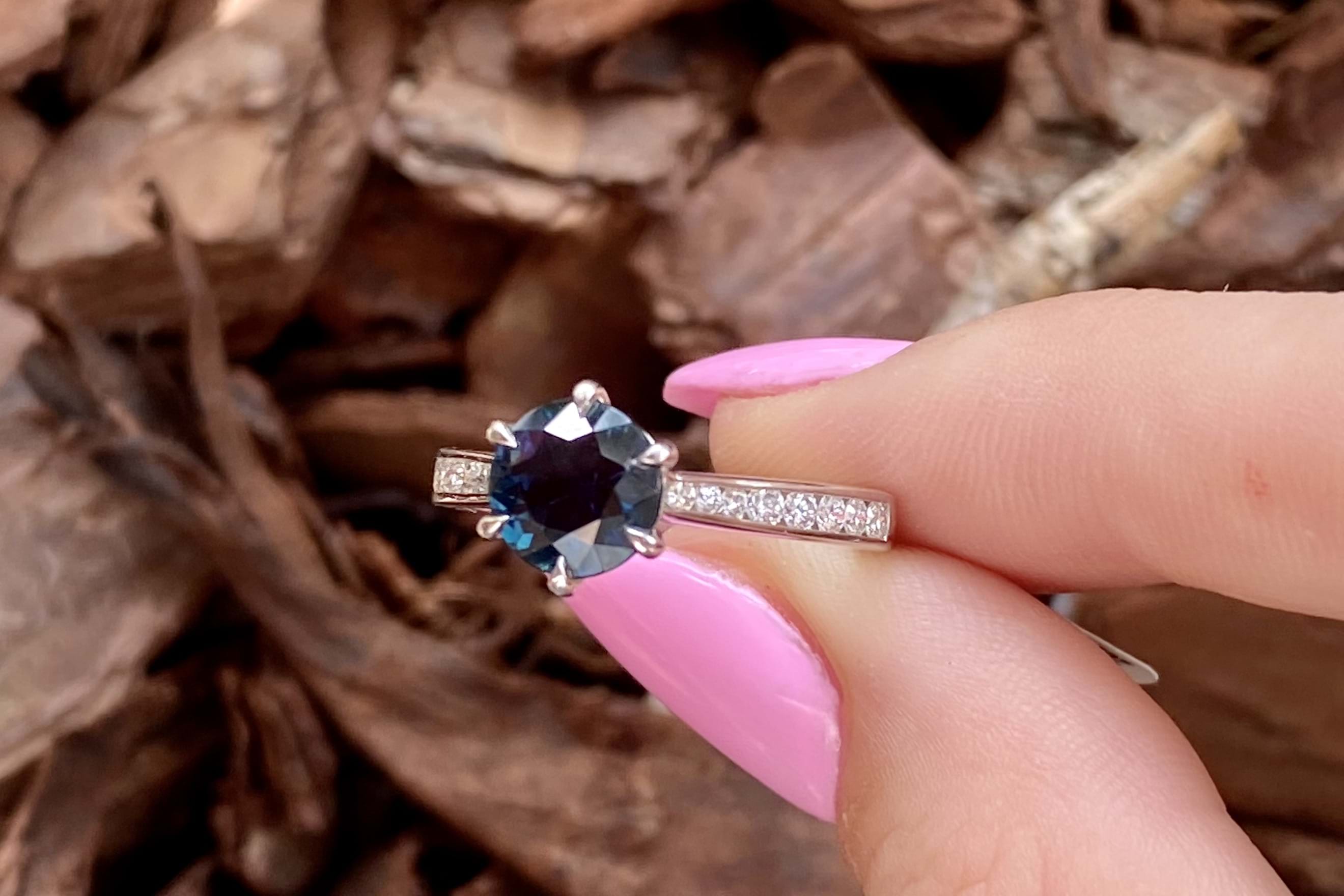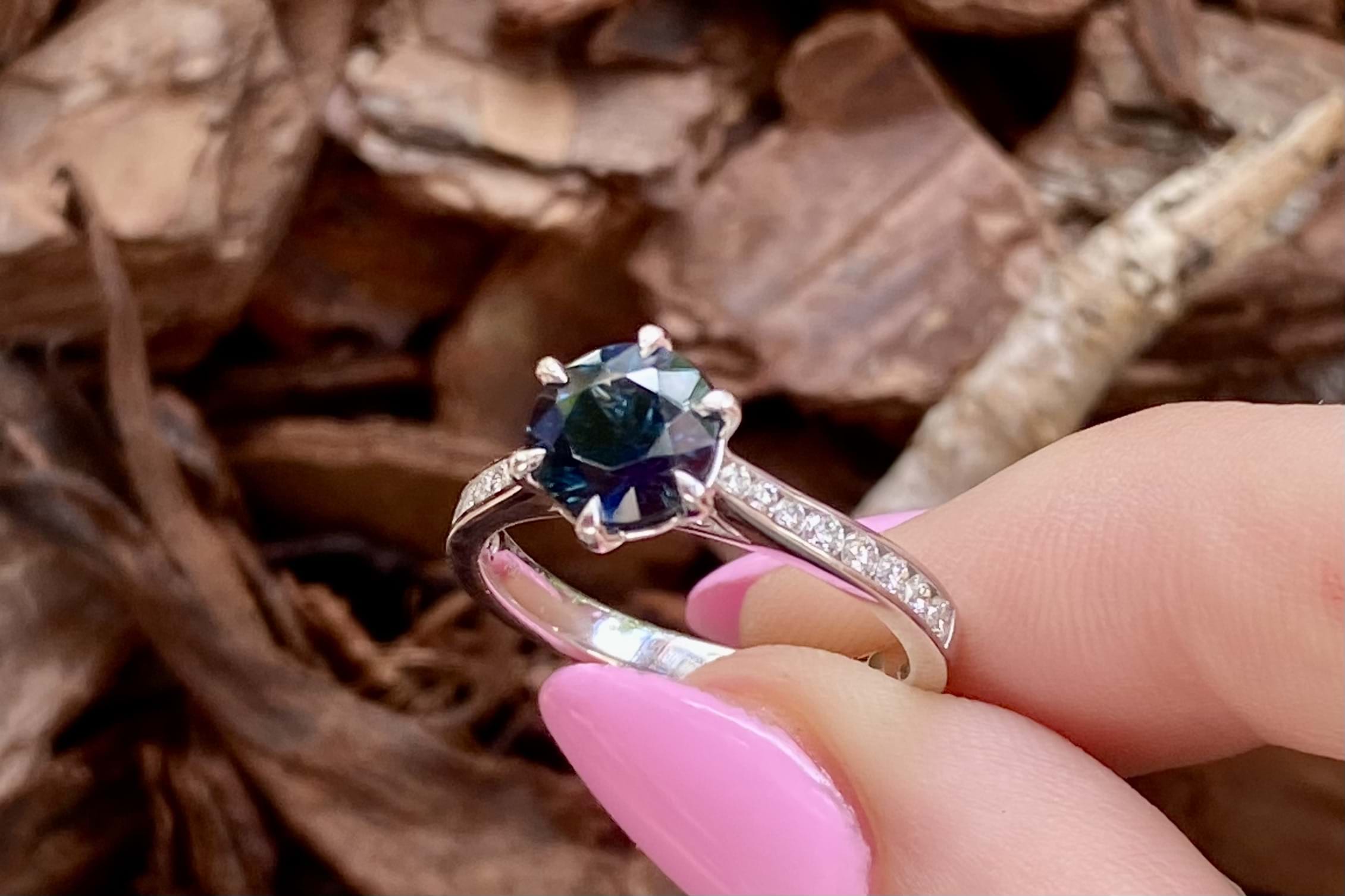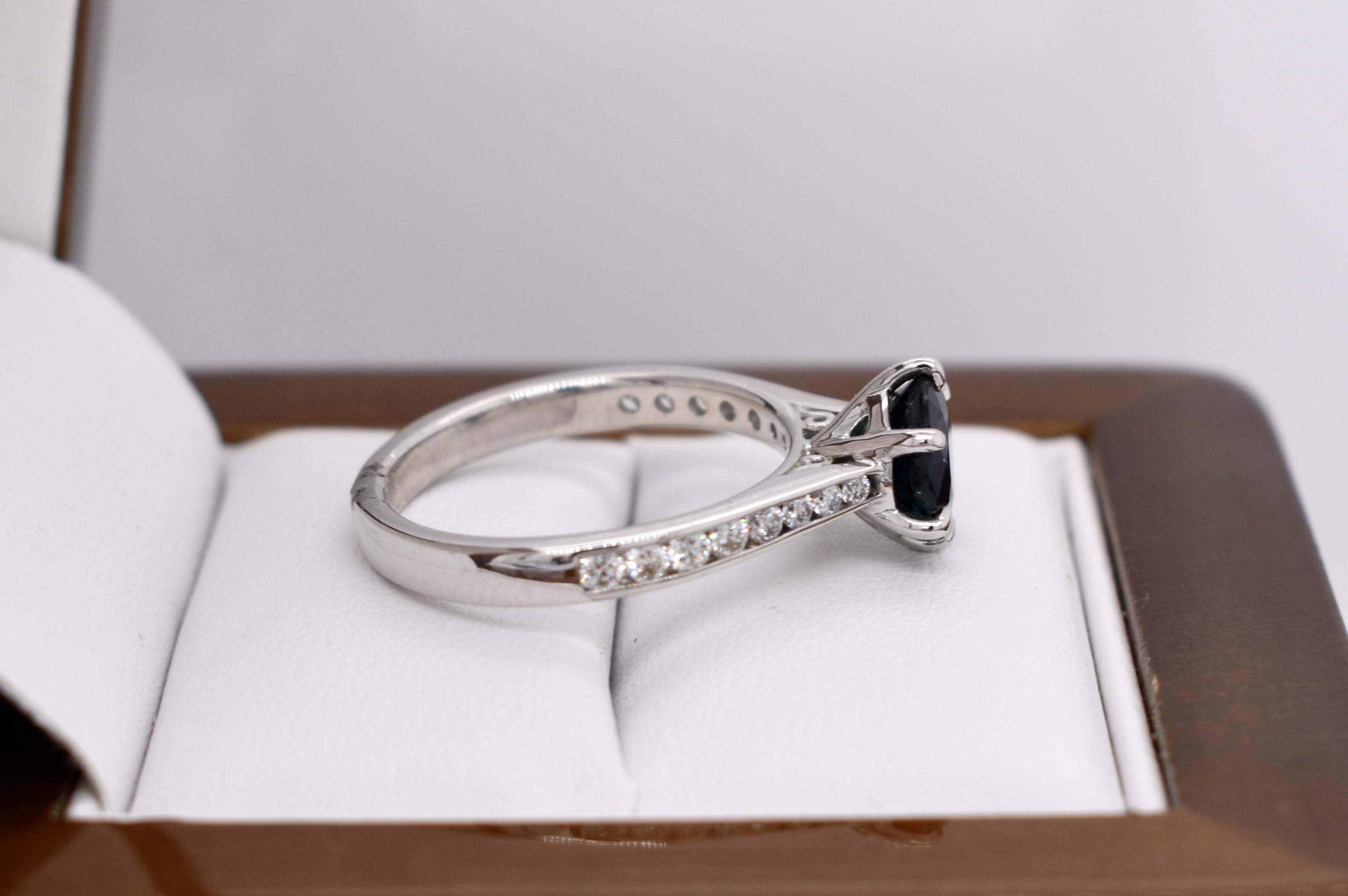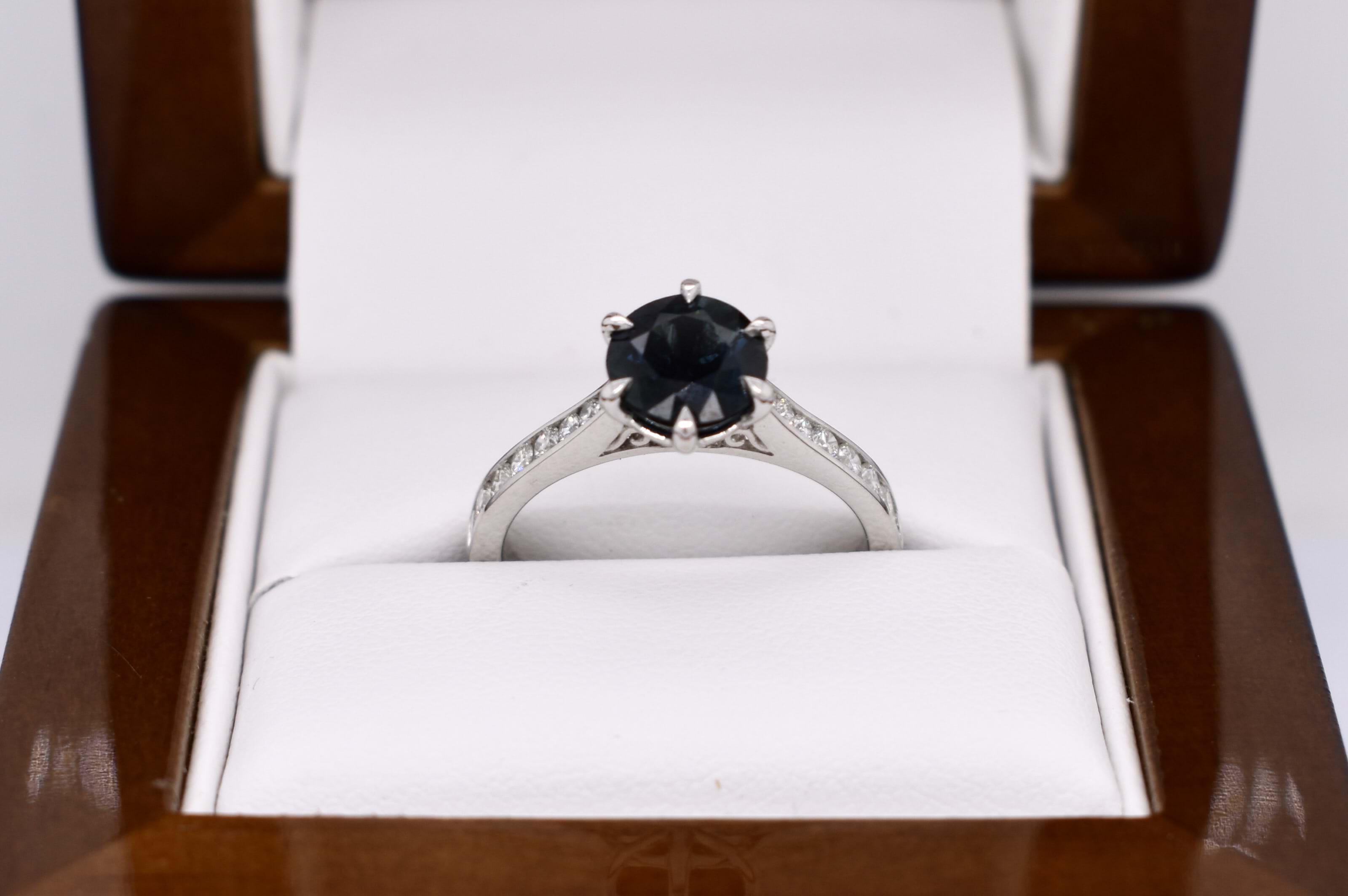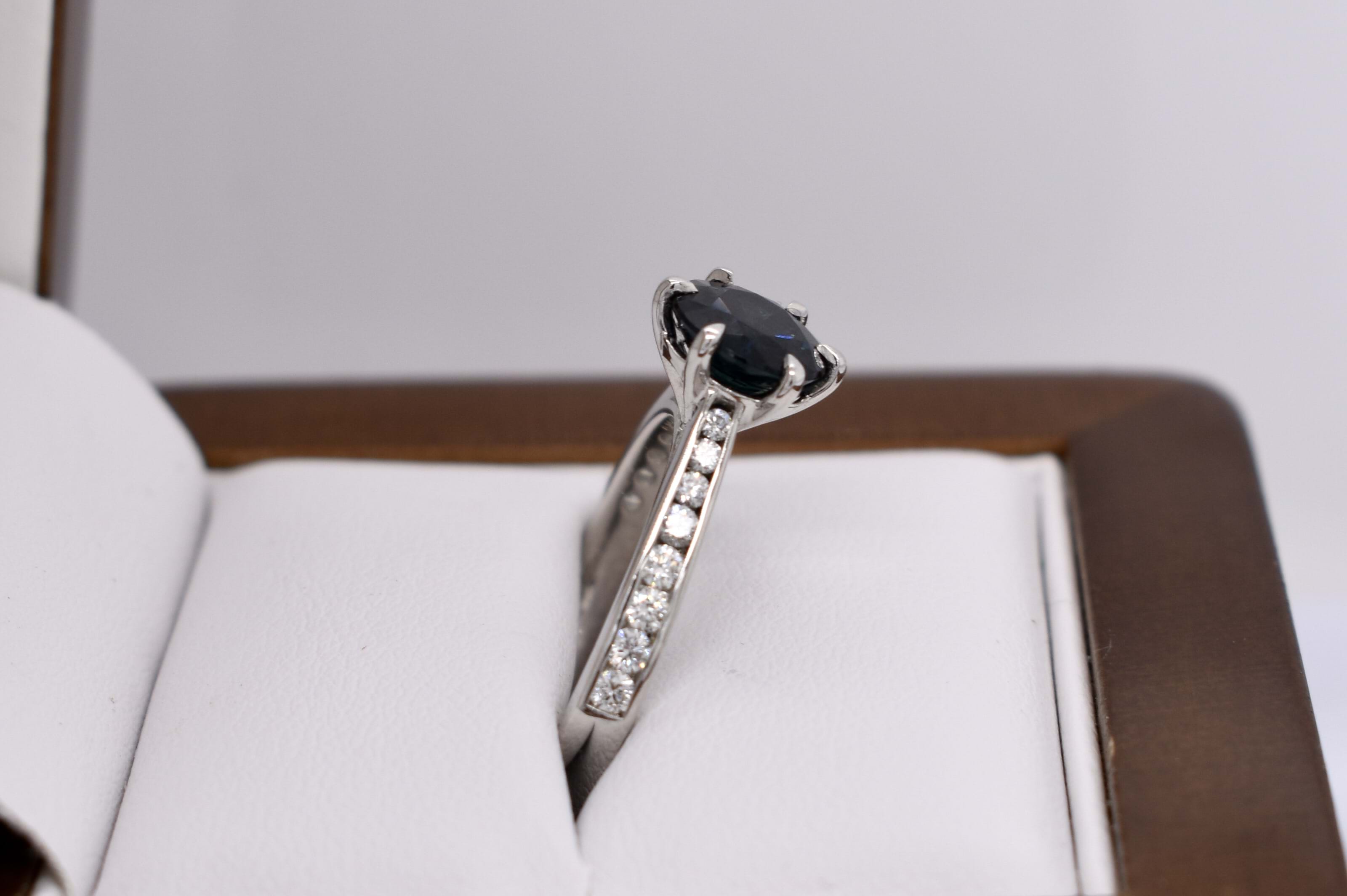 Crafted in 18ct white gold, this ring features a dark blue round Australian sapphire of 1.74ct, six claw set with sixteen round brilliant cut diamonds channel set down the shoulders. Total diamond weight of 0.33ct G SI. Finger size N. Independent Valuation available upon purchase.